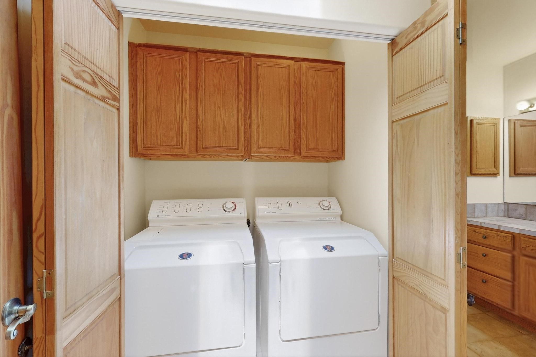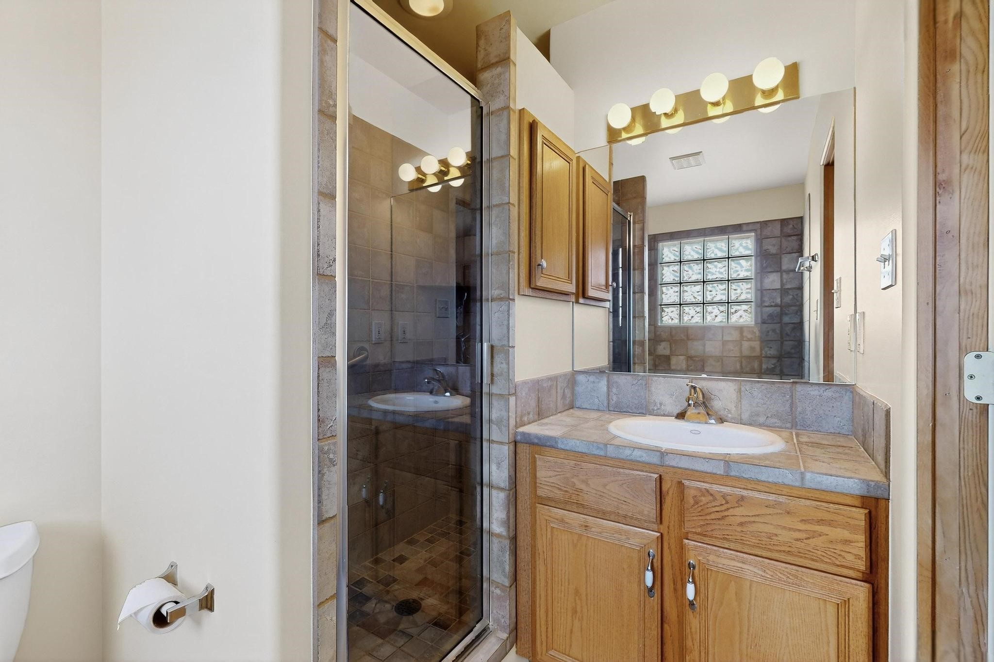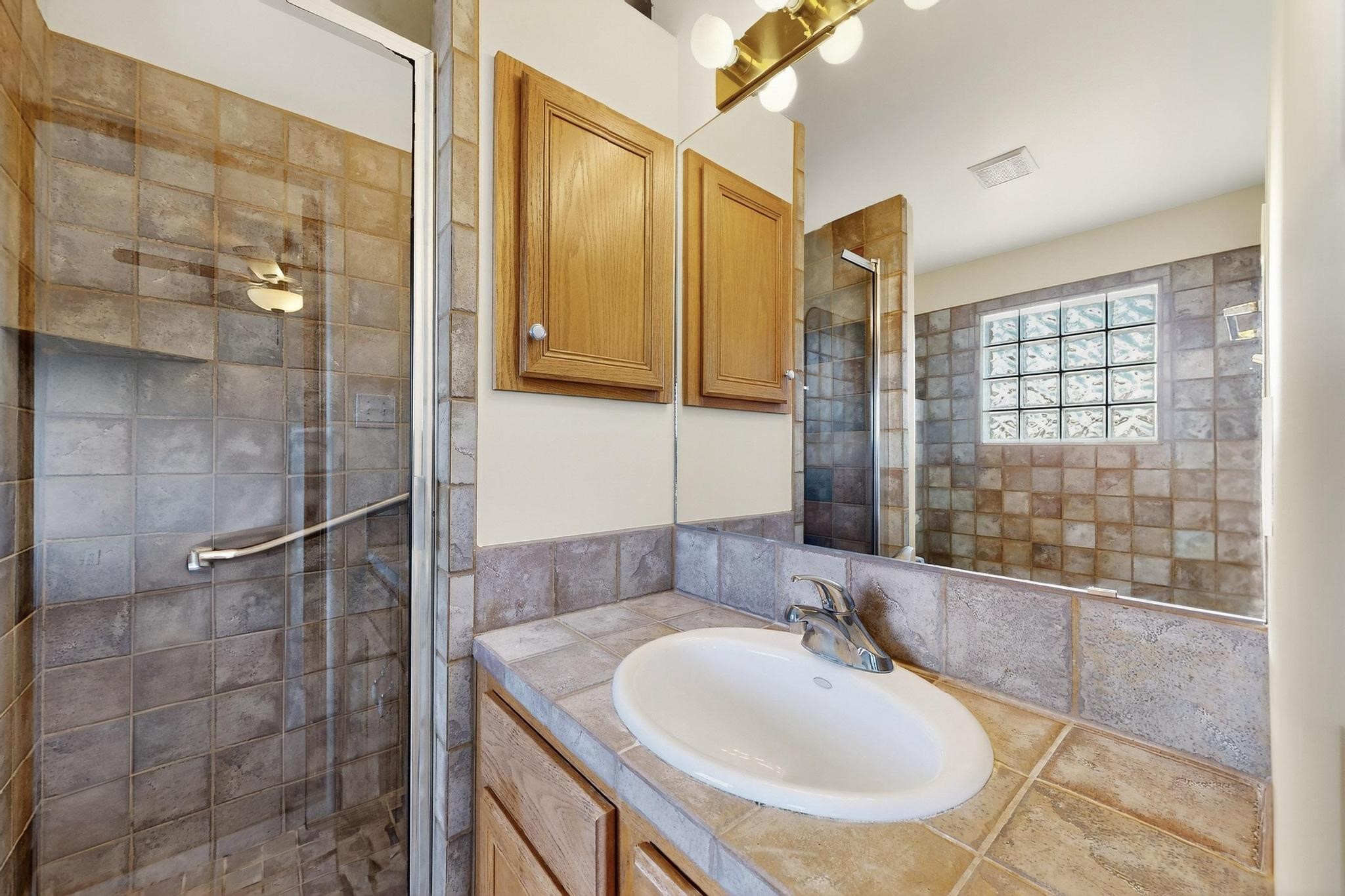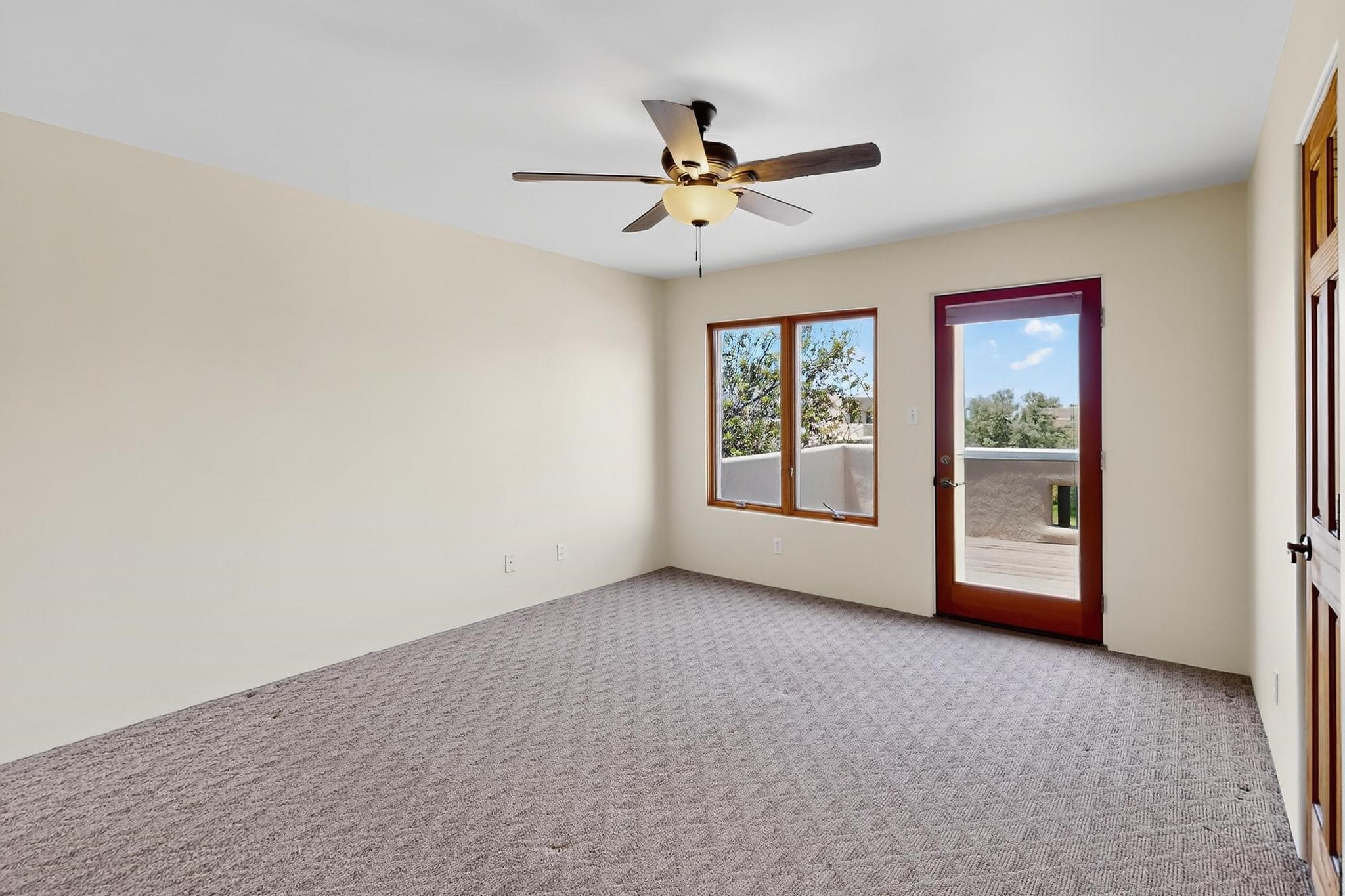 This charming Santa Fe home blends classic Southwestern character with thoughtful modern updates. A standout feature is the large room addition at the back, a true showpiece with traditional vigas, an elaborate built-in banco, oversized tile flooring, and a striking kiva fireplace. This spacious and versatile area can serve as a second living room, a creative studio, or an entertainment space. The home also boasts new kitchen appliances, radiant heat floors for cozy winter living, and two kiva fireplaces that add warmth and Southwestern charm. Two upstairs decks extend from each bedroom, providing private outdoor spaces perfect for relaxation. The interior has been freshly painted, giving the home a clean, move-in ready feel. The lush, colorful garden is complemented by a cistern system, offering an eco-friendly solution for watering. This home invites both comfort and functionality, with Santa Fe style at its core.
