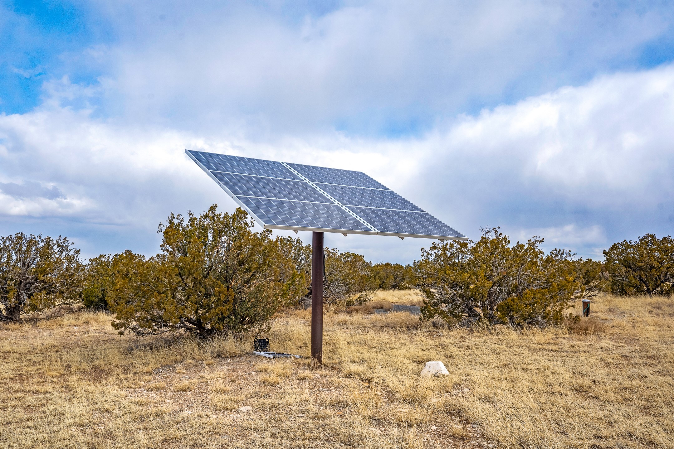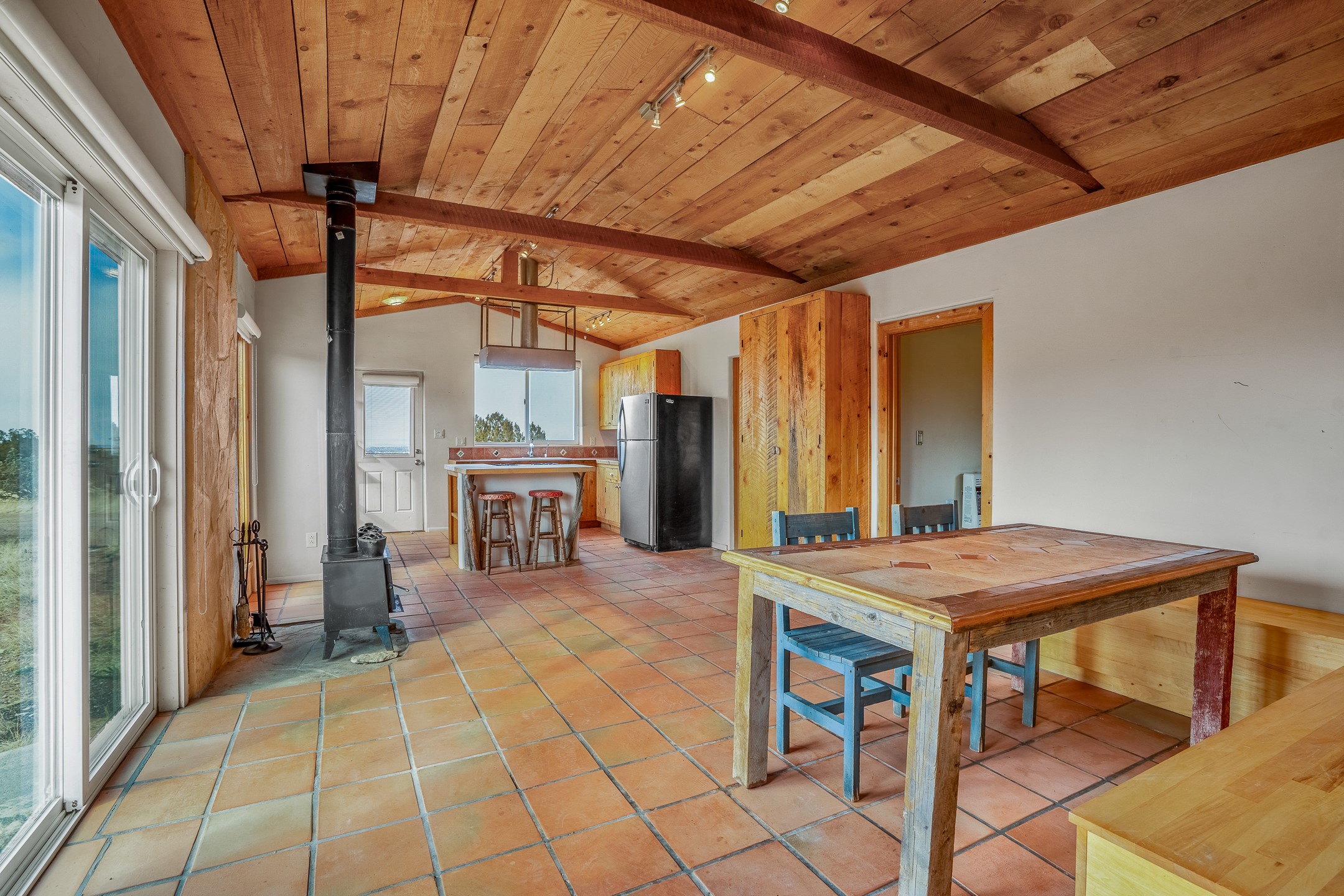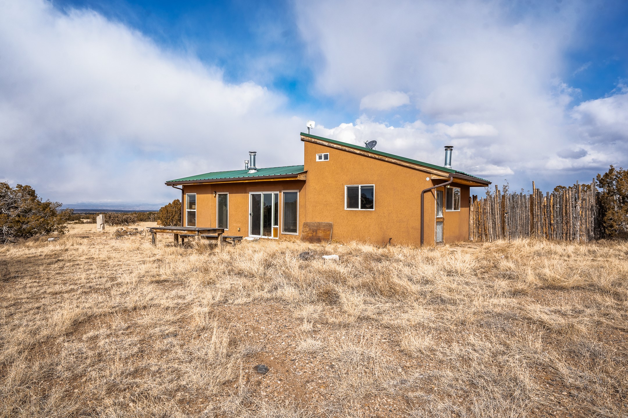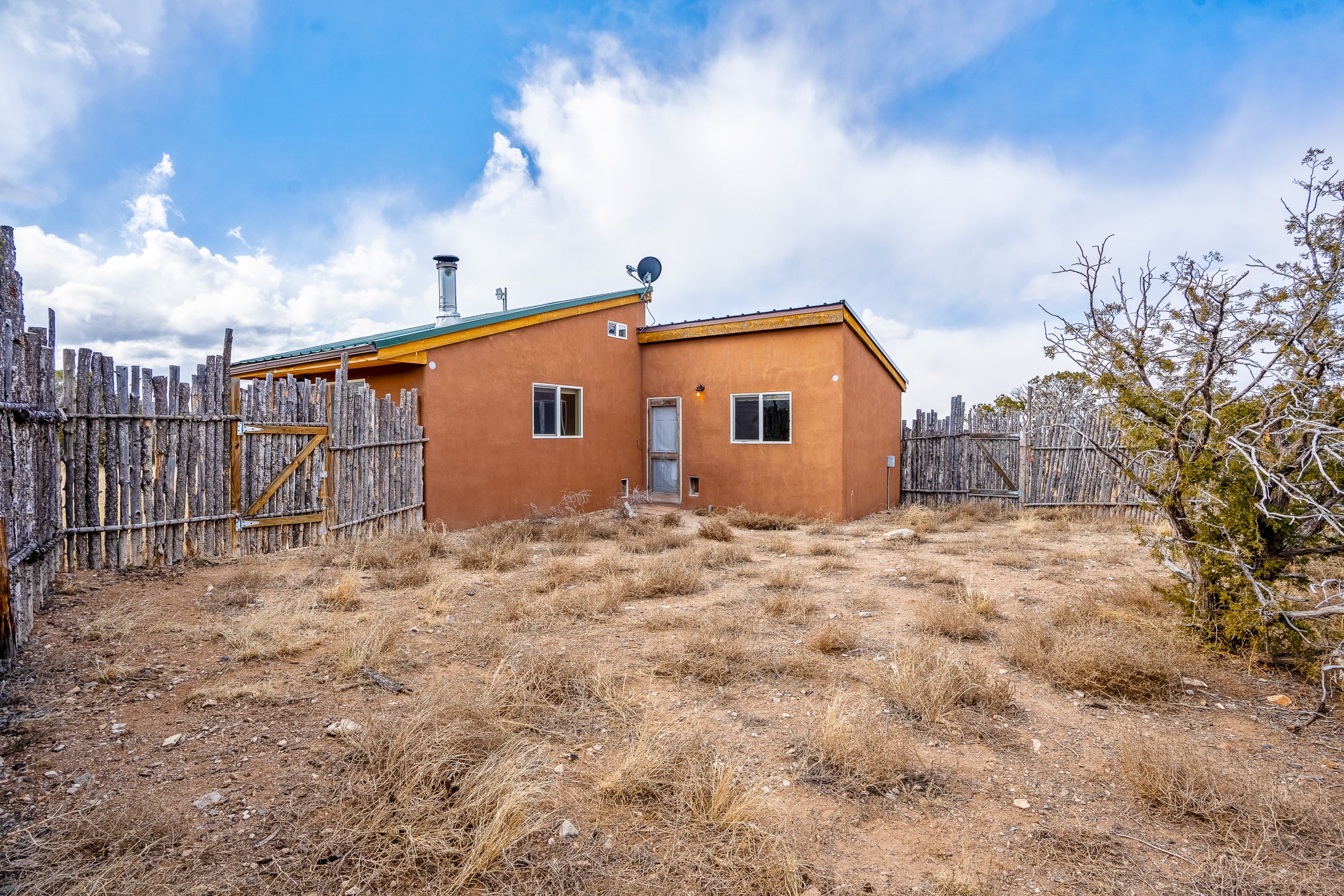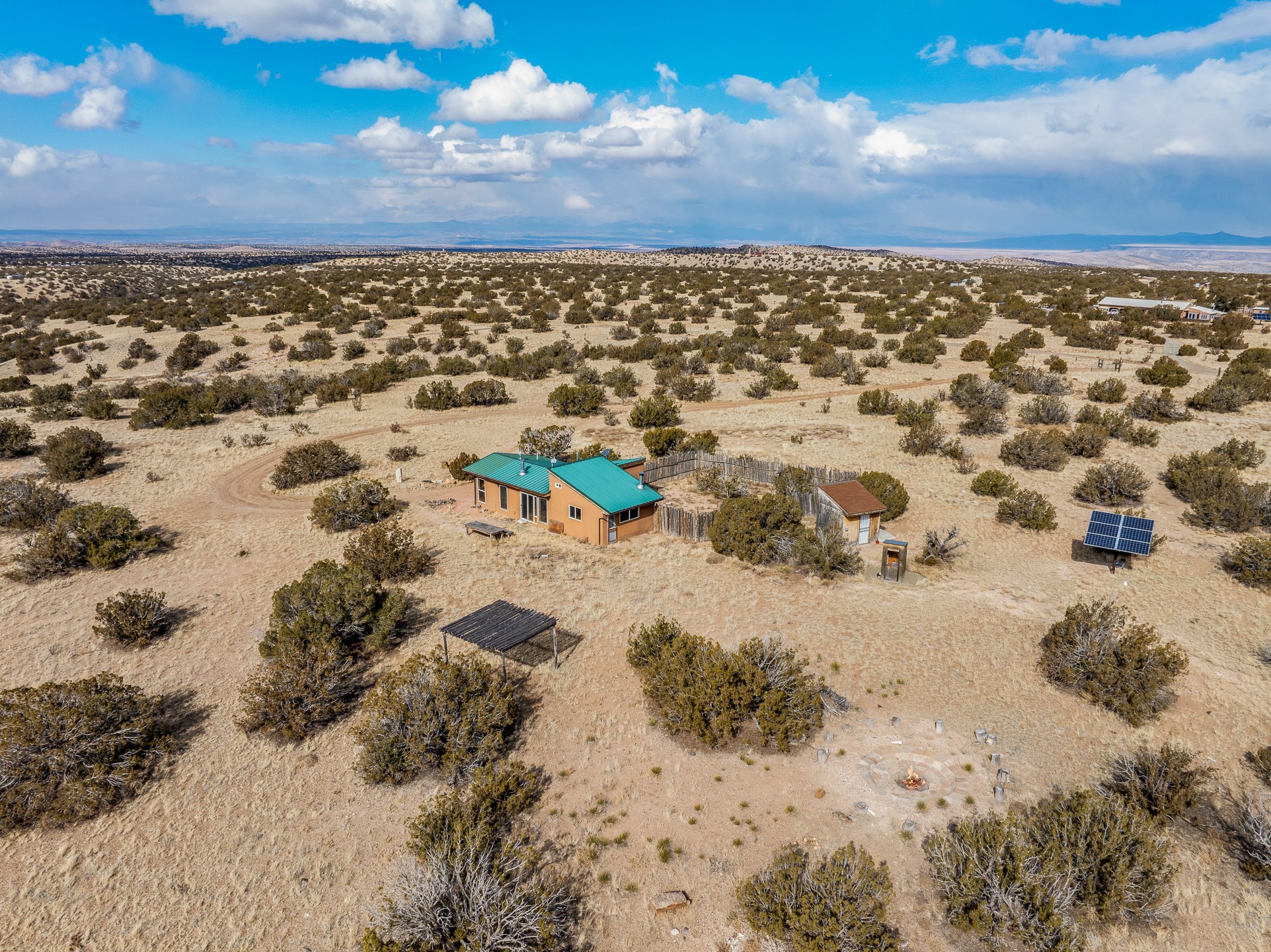 Find serenity and natural beauty at this high desert off-grid home on 30 acres. Hidden away from it all, 2.2 miles off of Highway 14, and 6 miles from Madrid, this home features two possible bedrooms, one bath. Sold with two separate lots, the property has plenty of flat outside space, a deep arroyo, and excellent views of the Ortiz and the Jemez mountains. The power is supplied with a top of the line solar photovoltaic system installed buy a local expert, along with a back up generator. A well supplies water, in addition, there is a 2500 gallon below ground water storage system connected to rain catchment and filter. With two wood stoves and additional propane heaters, you won't lack for creature comforts. Inside, the home opens to an open concept kitchen, living space, and has two additional rooms which could be bedrooms, home offices, etc, one with a sleeping loft. Saltillo floors, rustic wood cabinets and built-ins, and wood plank ceilings complete the look. A small patio area is fenced for pets. A large fire pit at the edge of the arroyo offers a setting for stargazing. Roads are primitive. Seller would like existing furniture to convey. Second lot creates diverse development opportunities. House is not easily visible from locked gate, please make an appointment to see. Seller has an assumable FHA loan at 2.75%, buyer would have to fund the difference between the purchase price and the loan.