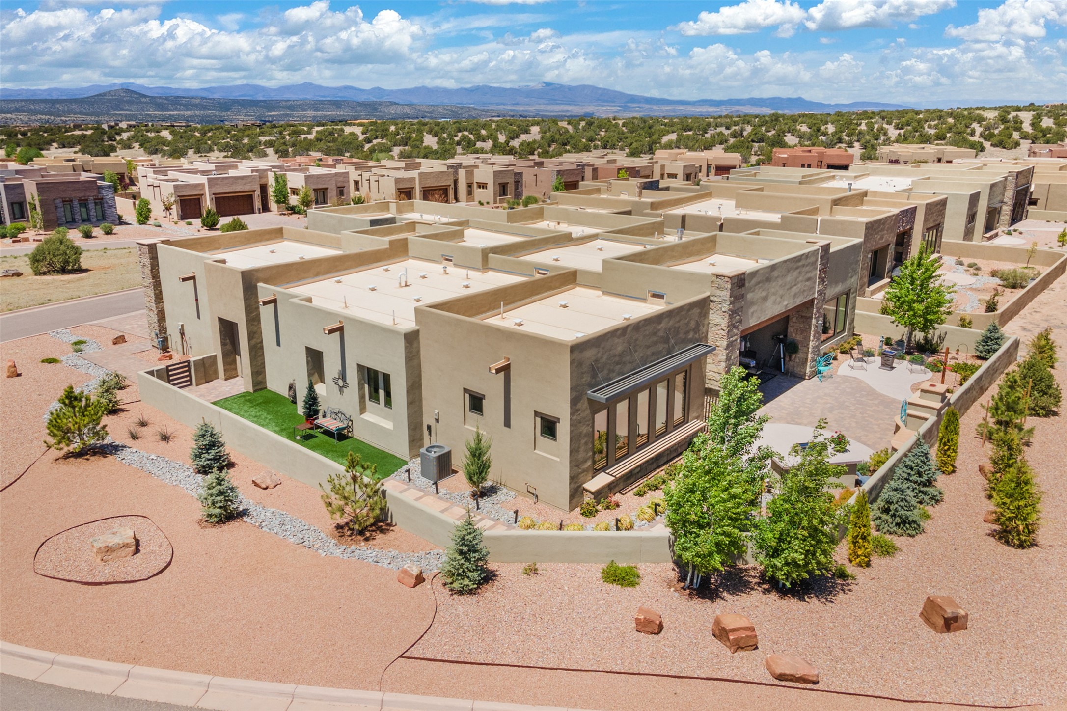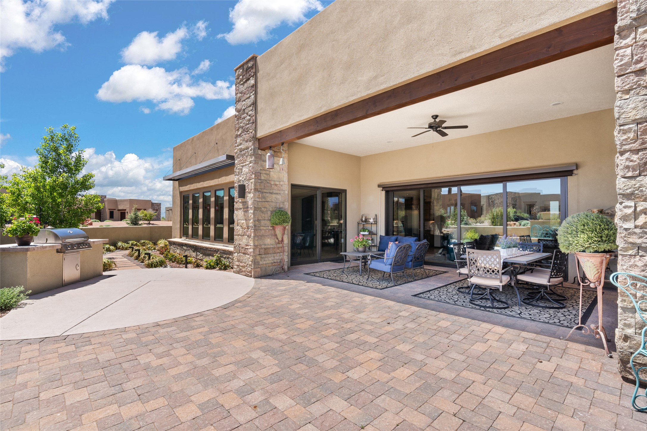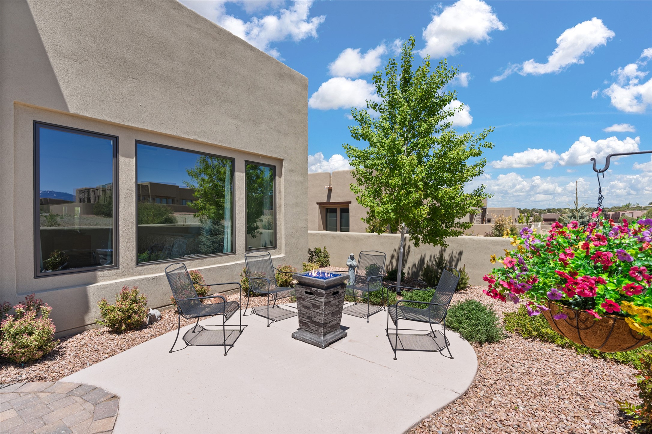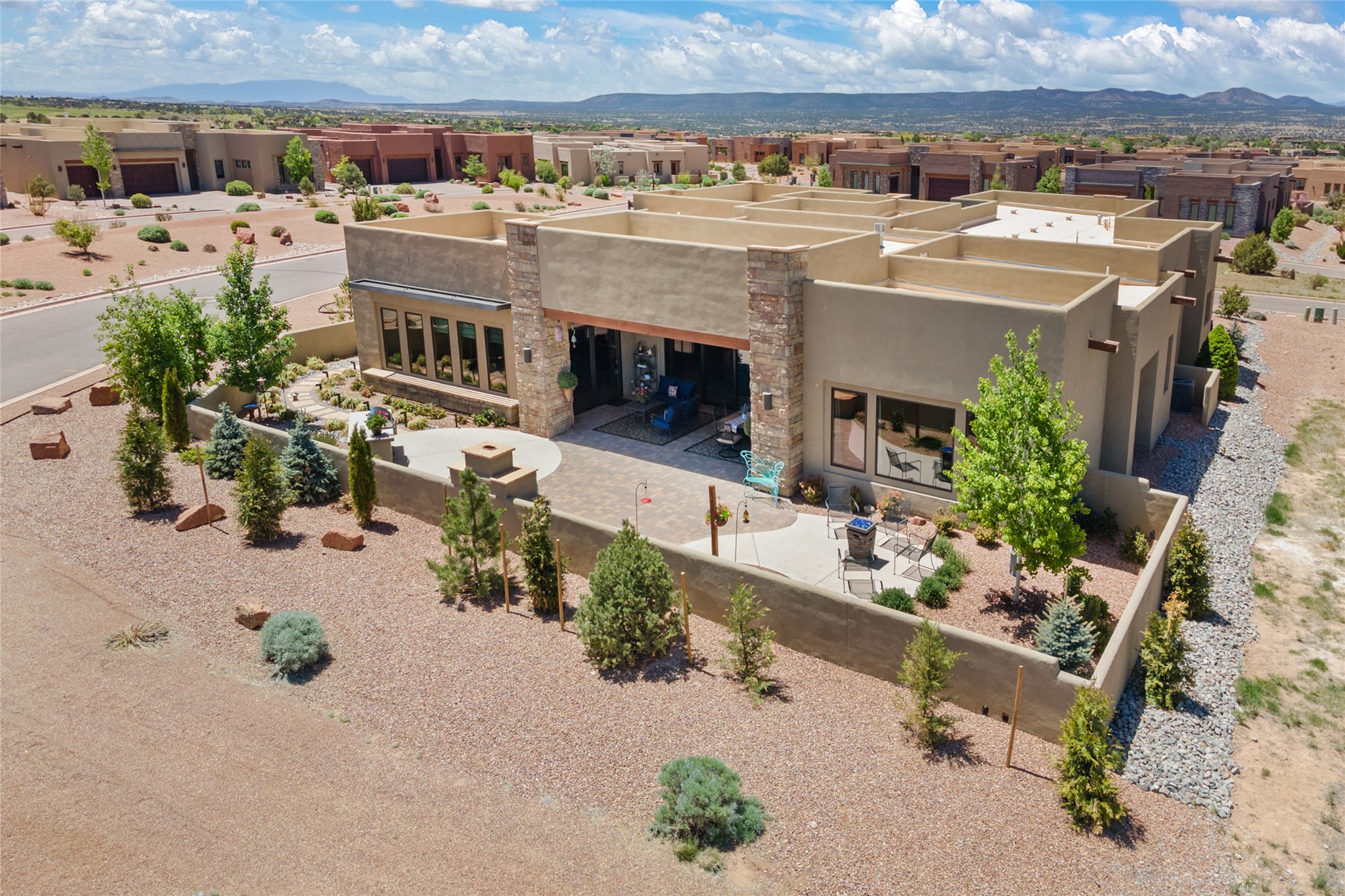 This immaculate, semi-custom Las Campanas home offers a wonderful blend of privacy, space, and mountain views. Set on a desirable corner lot, the outdoor living spaces are superb. Beautifully landscaped brick and stone areas flow from the interior for seamless al fresco living. Thoughtfully designed, this home balances traditional Santa Fe elements with a contemporary finish. A welcoming courtyard sets the tone and leads to a spacious floor plan ideal for relaxation, entertainment, or hosting out-of-town guests. The 5 bed/5 bath plan contains ample space for all aspects of life. Abundant light streams through the large east windows in the primary bedroom, great room, and sunroom. With smart-home functionality, stone walls, high arches, tray ceilings, and elegant finishes, this home stands apart. Extensive upgrades include a 5-foot linear gas fireplace with double wood mantels, a deep portal with kiva-inspired wood-burning fireplace and an integrated outdoor gas kitchen. The living room's 4 panel sliding doors enable fluid indoor-outdoor entertainment. Indulge culinary explorations in the Chef's kitchen with top-tier appliances,12x6 ft. granite island, wine cooler and walk-in pantry. The dining room easily seats 8-10 guests. The primary suite offers an oversized bedroom, spa-like soaking tub, extra-large walk-in shower, and double closet. 3 additional bedrooms surround a spacious hub perfect for hobbies, media, meditation, or workout. The casita offers flexibility as an office or serene guest quarters. 3 green belts surround the home and frame the Sangre de Cristo and Jemez mountains with sunrises and sunsets. Evergreens and xeriscaping provide year-round beauty and a forum for birdwatching in this Audubon Sanctuary neighborhood. Minutes from The Club at Las Campanas, enjoy convenient access to resort amenities in Santa Fe's only gated golf course community. *Seller has identified personal property available as a separate Bill-of-Sale for a move-in-ready transaction.