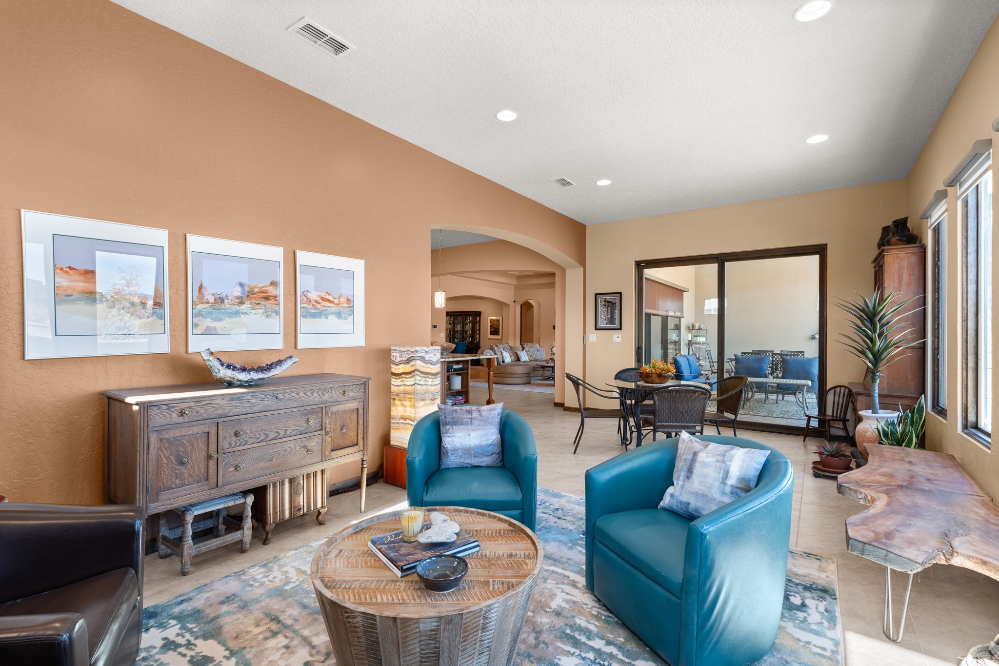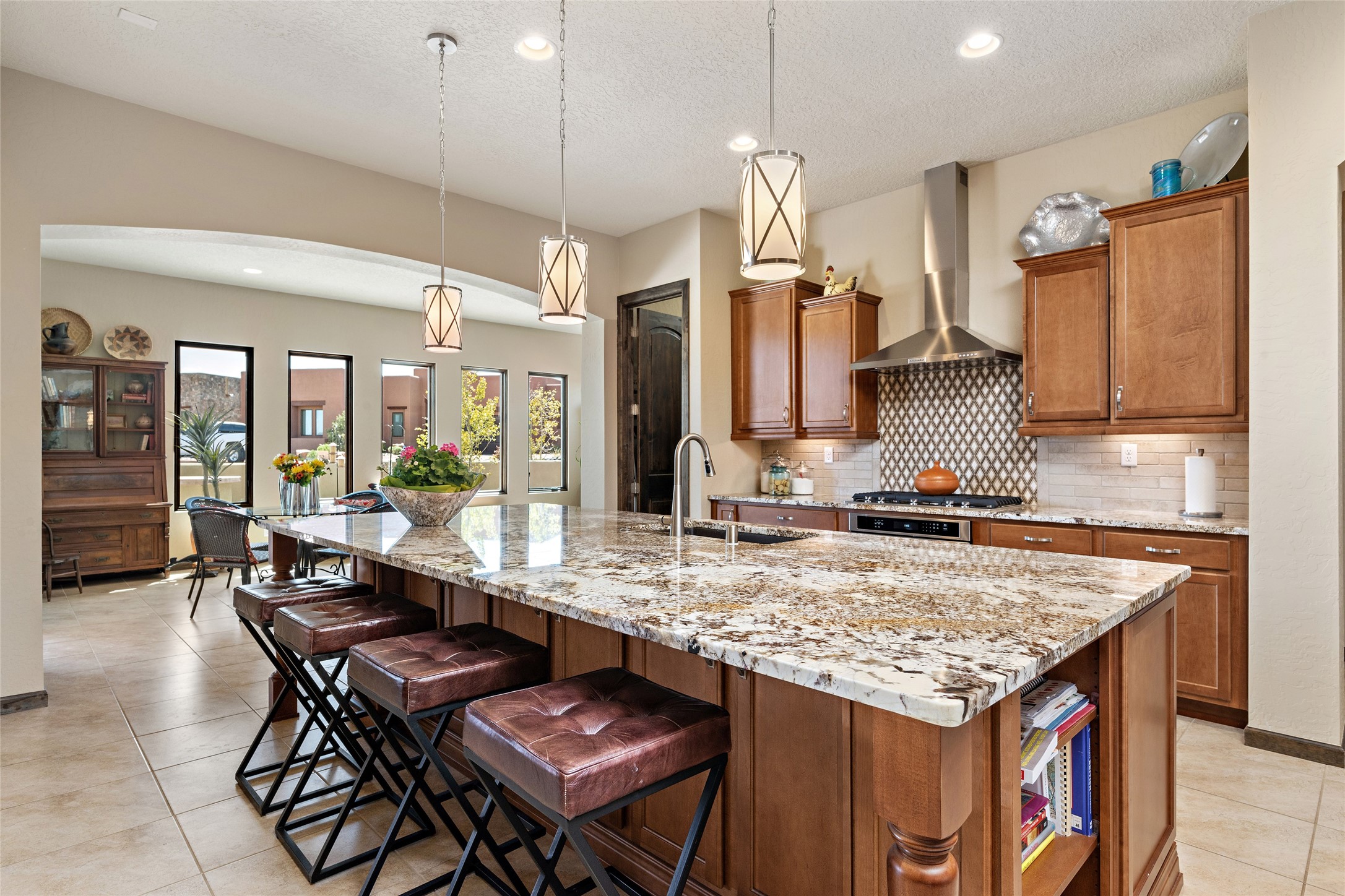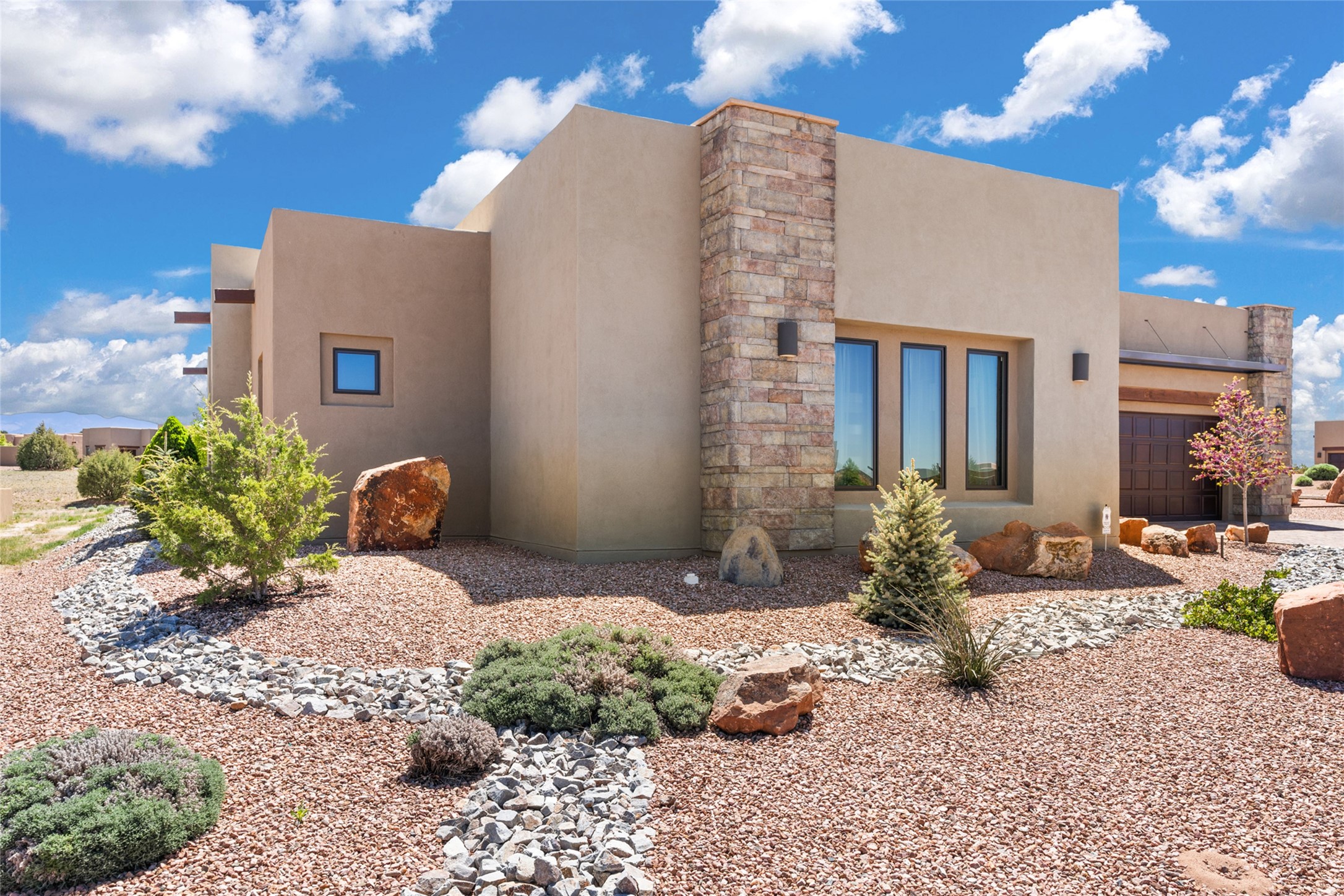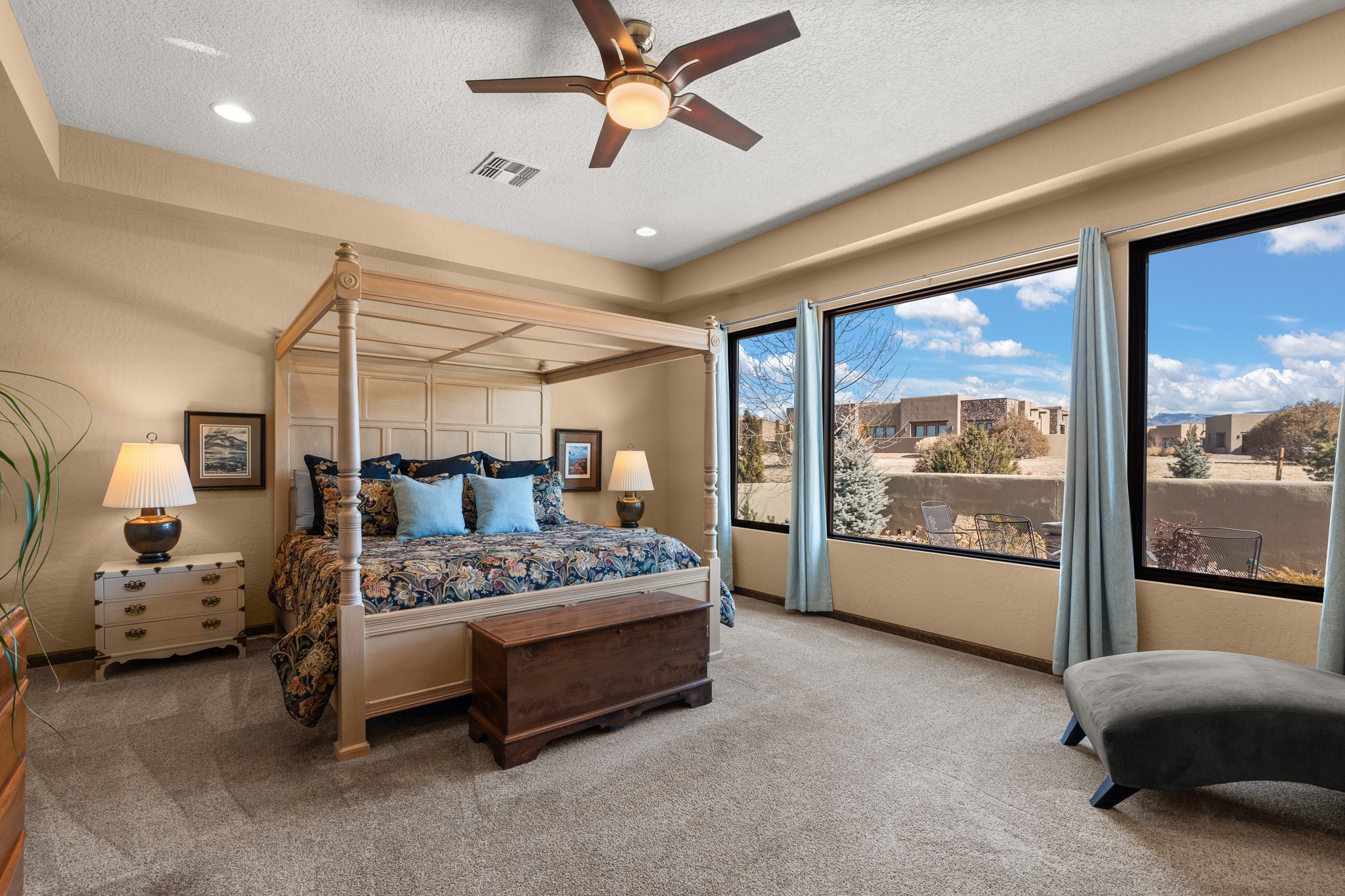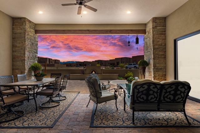 This immaculate, semi-custom Las Campanas home offers a wonderful blend of privacy, space, and mountain views. Set on a desirable corner lot, the outdoor living spaces are superb. Beautifully landscaped brick and stone areas flow from the interior for seamless al fresco living. Thoughtfully designed, this home balances traditional Santa Fe elements with a contemporary finish. A welcoming courtyard sets the tone and leads to a spacious floor plan ideal for relaxation, entertainment, or hosting out-of-town guests. The 5 bed/5 bath plan contains ample space for all aspects of life. Abundant light streams through the large east windows in the primary bedroom, great room, and sunroom. With smart-home functionality, stone walls, high arches, tray ceilings, and elegant finishes, this home stands apart. Extensive upgrades include a 5-foot linear gas fireplace with double wood mantels, a deep portal with kiva-inspired wood-burning fireplace and an integrated outdoor gas kitchen. The living room's 4 panel sliding doors enable fluid indoor-outdoor entertainment. Indulge culinary explorations in the Chef's kitchen with top-tier appliances,12x6 ft. granite island, wine cooler and walk-in pantry. The dining room easily seats 8-10 guests. The primary suite offers an oversized bedroom, spa-like soaking tub, extra-large walk-in shower, and double closet. 3 additional bedrooms surround a spacious hub perfect for hobbies, media, meditation, or workout. The casita offers flexibility as an office or serene guest quarters. 3 green belts surround the home and frame the Sangre de Cristo and Jemez mountains with sunrises and sunsets. Evergreens and xeriscaping provide year-round beauty and a forum for birdwatching in this Audubon Sanctuary neighborhood. Minutes from The Club at Las Campanas, enjoy convenient access to resort amenities in Santa Fe's only gated golf course community. *Seller has identified personal property available as a separate Bill-of-Sale for a move-in-ready transaction.