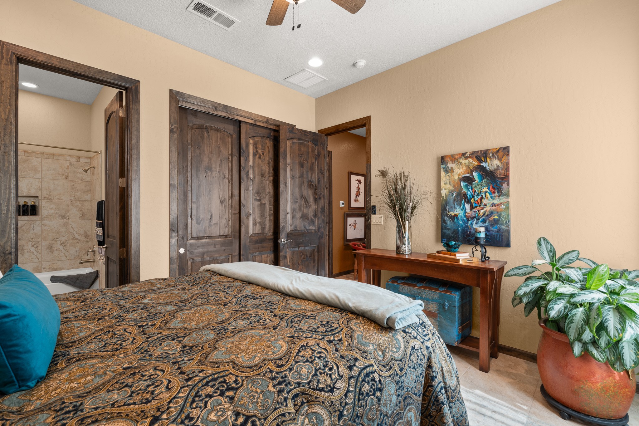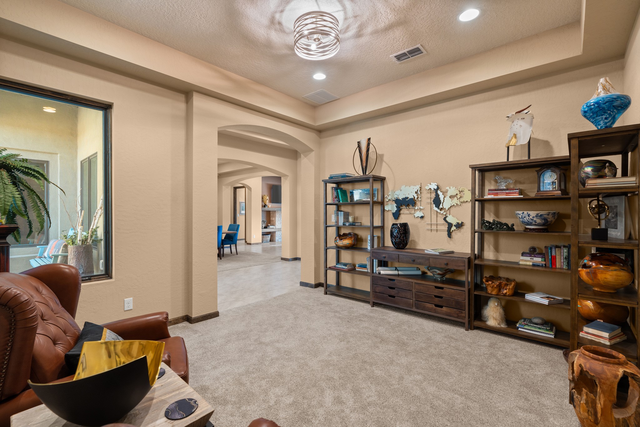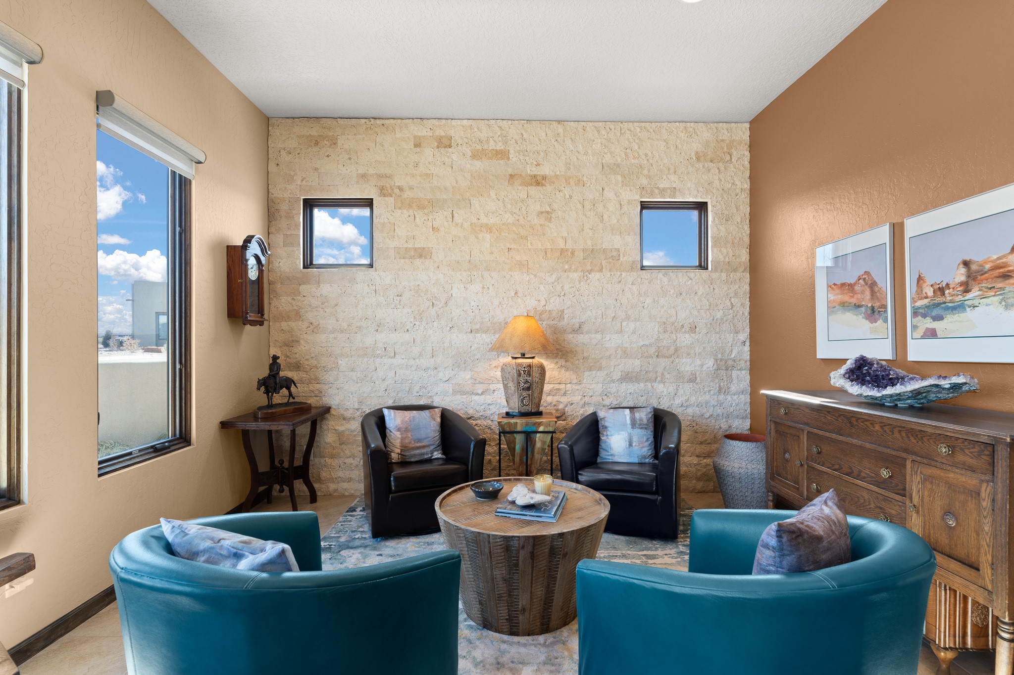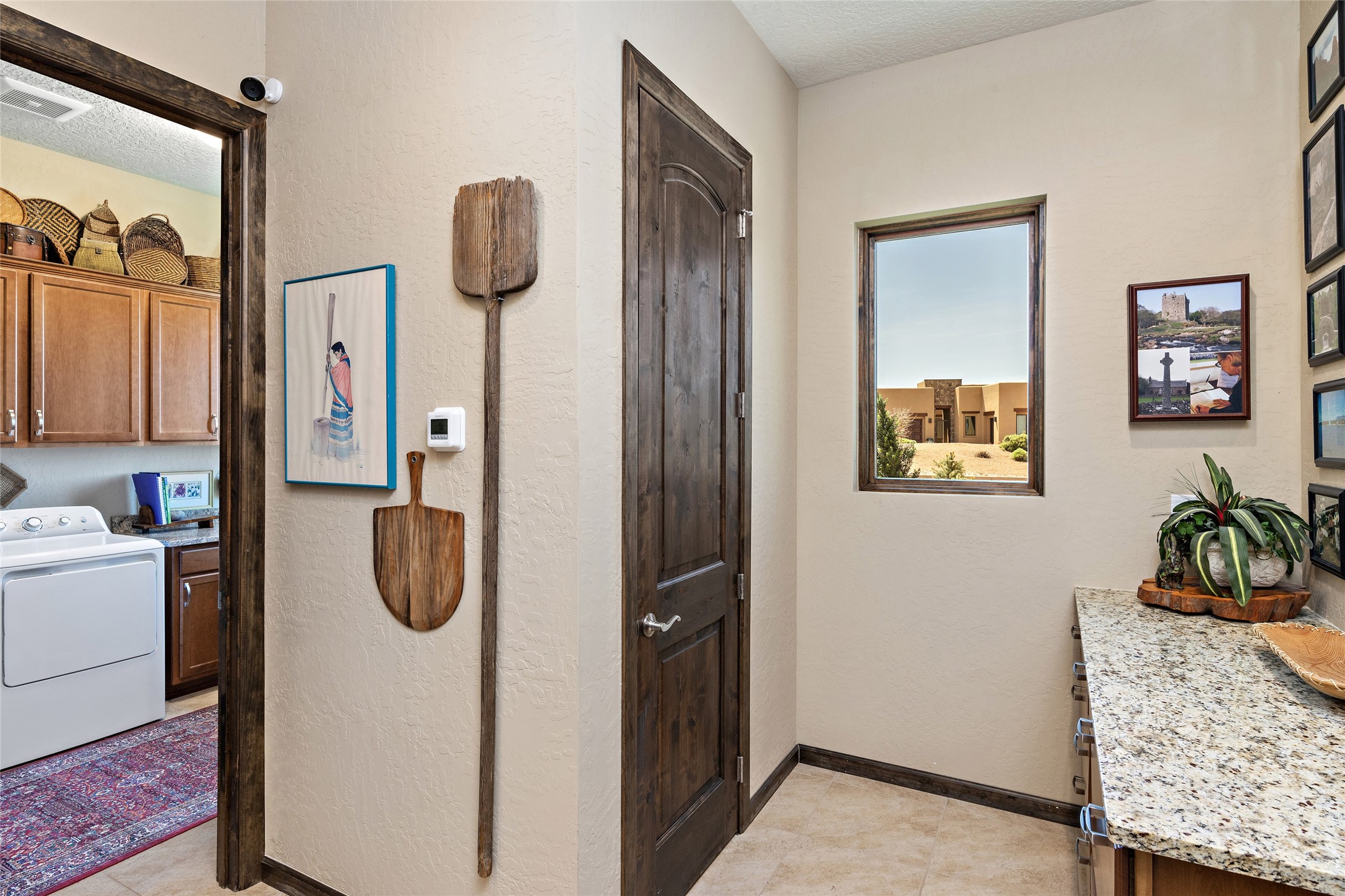 This immaculate, semi-custom Las Campanas home offers a wonderful blend of privacy, space, and mountain views. Set on a desirable corner lot, the outdoor living spaces are superb. Beautifully landscaped brick and stone areas flow from the interior for seamless al fresco living. Thoughtfully designed, this home balances traditional Santa Fe elements with a contemporary finish. A welcoming courtyard sets the tone and leads to a spacious floor plan ideal for relaxation, entertainment, or hosting out-of-town guests. The 5 bed/5 bath plan contains ample space for all aspects of life. Abundant light streams through the large east windows in the primary bedroom, great room, and sunroom. With smart-home functionality, stone walls, high arches, tray ceilings, and elegant finishes, this home stands apart. Extensive upgrades include a 5-foot linear gas fireplace with double wood mantels, a deep portal with kiva-inspired wood-burning fireplace and an integrated outdoor gas kitchen. The living room's 4 panel sliding doors enable fluid indoor-outdoor entertainment. Indulge culinary explorations in the Chef's kitchen with top-tier appliances,12x6 ft. granite island, wine cooler and walk-in pantry. The dining room easily seats 8-10 guests. The primary suite offers an oversized bedroom, spa-like soaking tub, extra-large walk-in shower, and double closet. 3 additional bedrooms surround a spacious hub perfect for hobbies, media, meditation, or workout. The casita offers flexibility as an office or serene guest quarters. 3 green belts surround the home and frame the Sangre de Cristo and Jemez mountains with sunrises and sunsets. Evergreens and xeriscaping provide year-round beauty and a forum for birdwatching in this Audubon Sanctuary neighborhood. Minutes from The Club at Las Campanas, enjoy convenient access to resort amenities in Santa Fe's only gated golf course community. *Seller has identified personal property available as a separate Bill-of-Sale for a move-in-ready transaction.