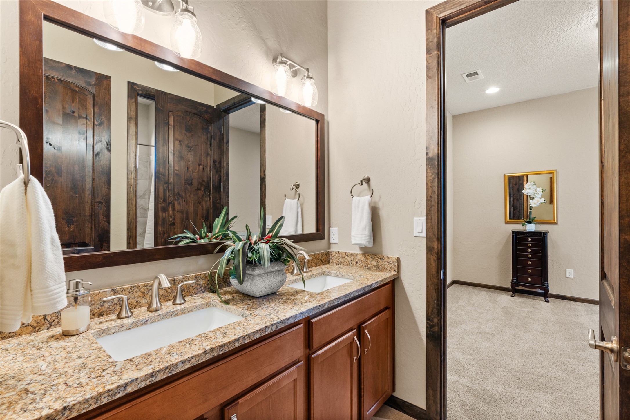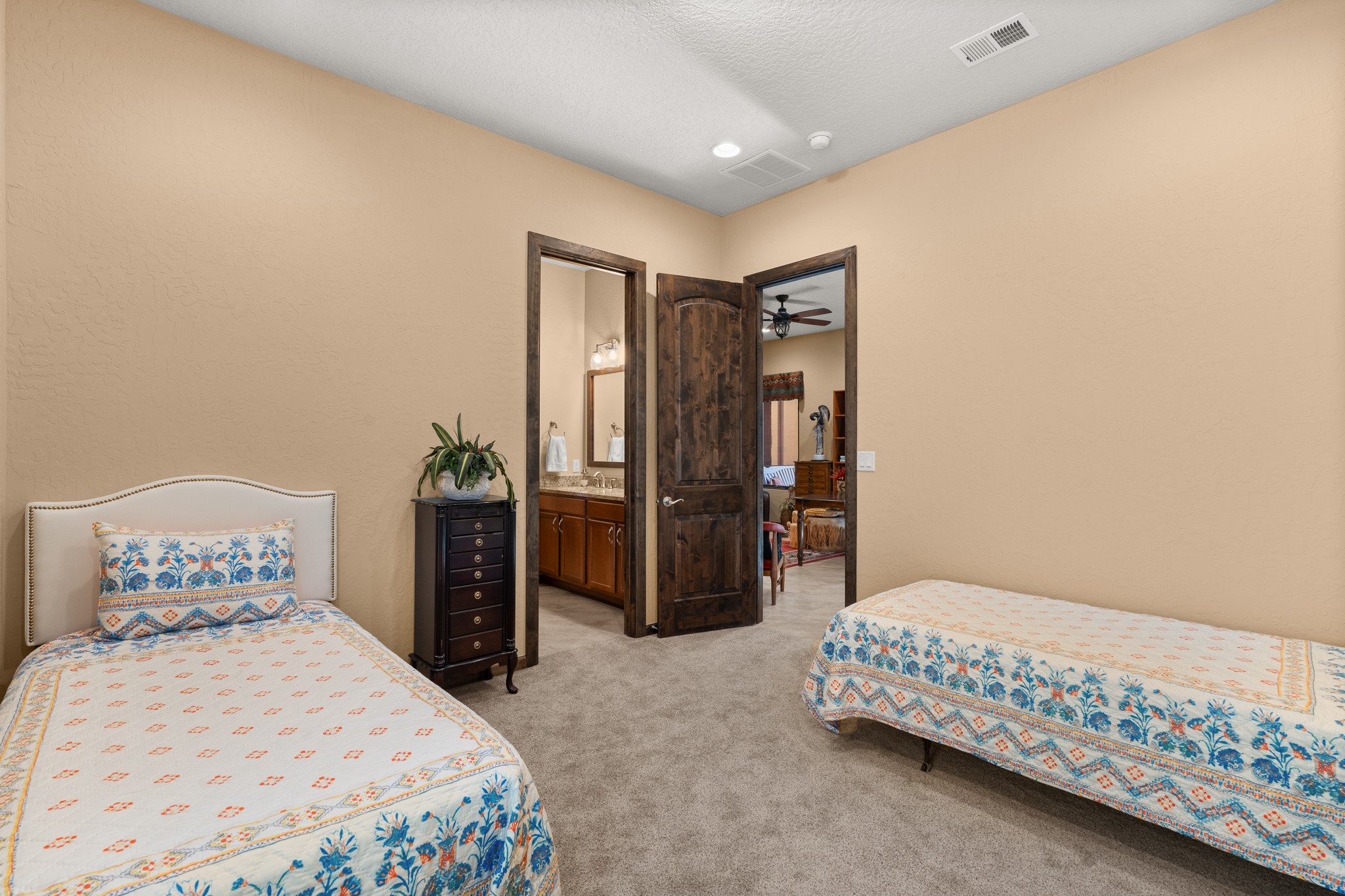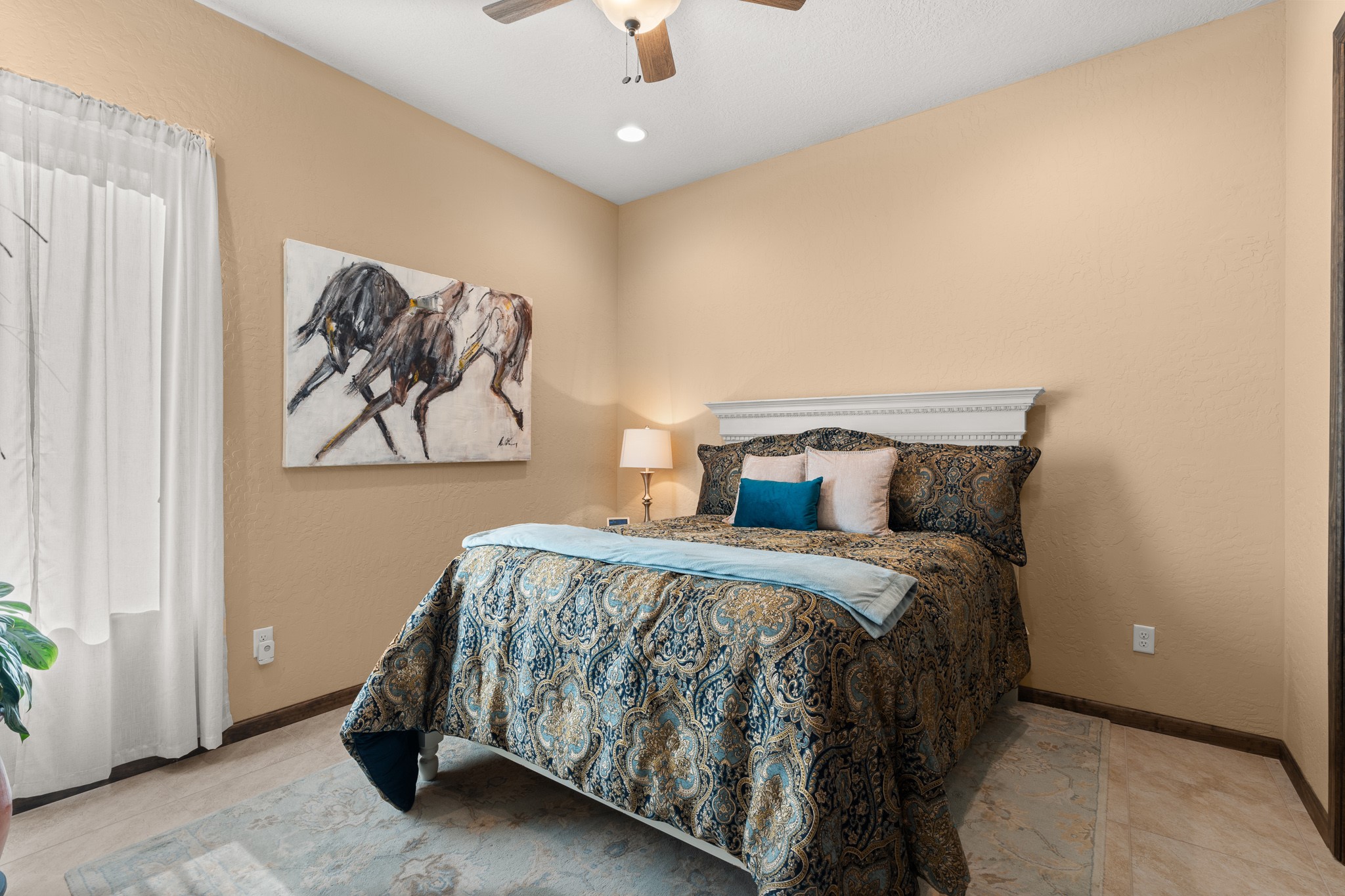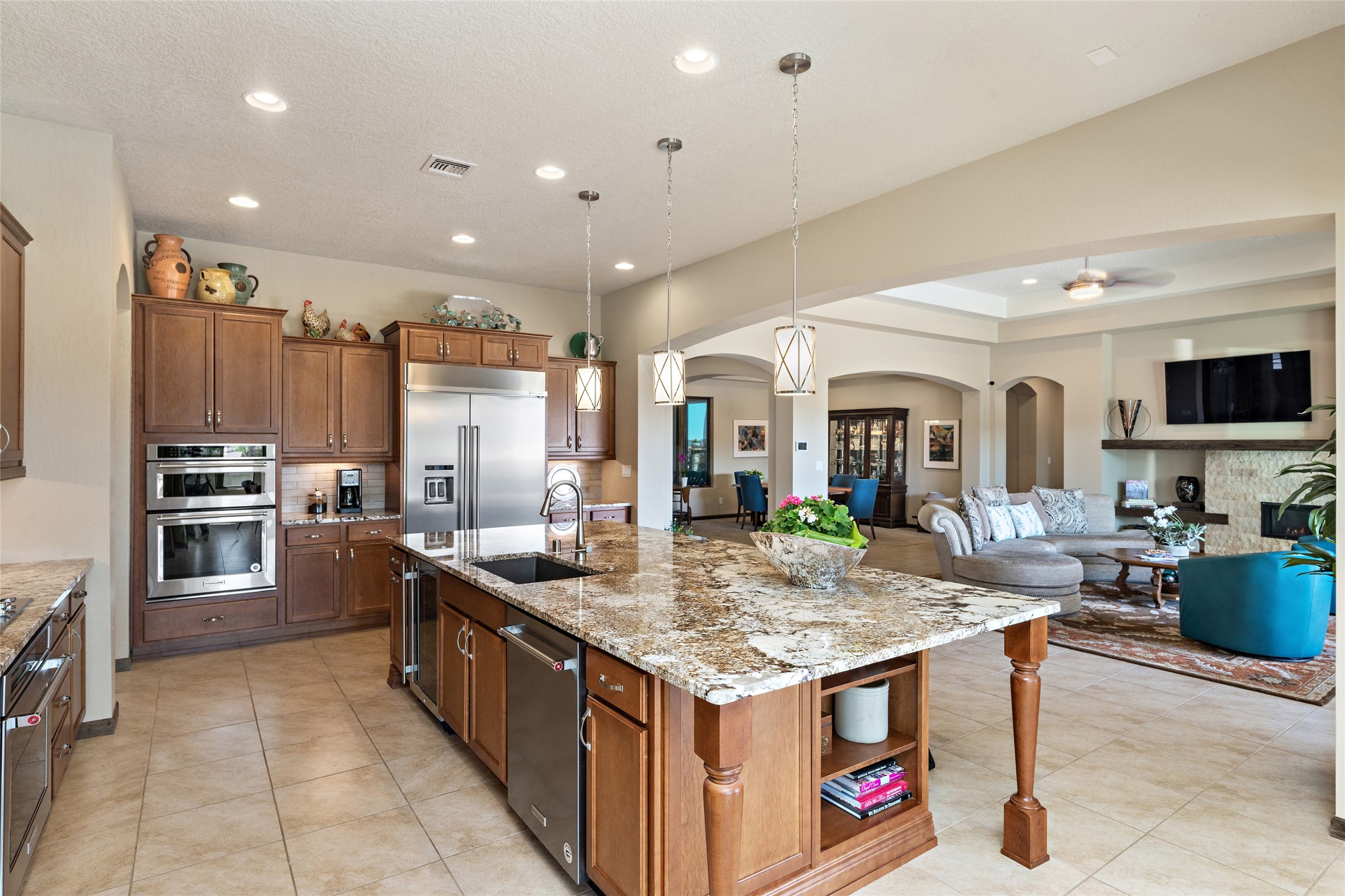 This immaculate, semi-custom Las Campanas home offers a wonderful blend of privacy, space, and mountain views. Set on a desirable corner lot, the outdoor living spaces are superb. Beautifully landscaped brick and stone areas flow from the interior for seamless al fresco living. Thoughtfully designed, this home balances traditional Santa Fe elements with a contemporary finish. A welcoming courtyard sets the tone and leads to a spacious floor plan ideal for relaxation, entertainment, or hosting out-of-town guests. The 5 bed/5 bath plan contains ample space for all aspects of life. Abundant light streams through the large east windows in the primary bedroom, great room, and sunroom. With smart-home functionality, stone walls, high arches, tray ceilings, and elegant finishes, this home stands apart. Extensive upgrades include a 5-foot linear gas fireplace with double wood mantels, a deep portal with kiva-inspired wood-burning fireplace and an integrated outdoor gas kitchen. The living room's 4 panel sliding doors enable fluid indoor-outdoor entertainment. Indulge culinary explorations in the Chef's kitchen with top-tier appliances,12x6 ft. granite island, wine cooler and walk-in pantry. The dining room easily seats 8-10 guests. The primary suite offers an oversized bedroom, spa-like soaking tub, extra-large walk-in shower, and double closet. 3 additional bedrooms surround a spacious hub perfect for hobbies, media, meditation, or workout. The casita offers flexibility as an office or serene guest quarters. 3 green belts surround the home and frame the Sangre de Cristo and Jemez mountains with sunrises and sunsets. Evergreens and xeriscaping provide year-round beauty and a forum for birdwatching in this Audubon Sanctuary neighborhood. Minutes from The Club at Las Campanas, enjoy convenient access to resort amenities in Santa Fe's only gated golf course community. *Seller has identified personal property available as a separate Bill-of-Sale for a move-in-ready transaction.