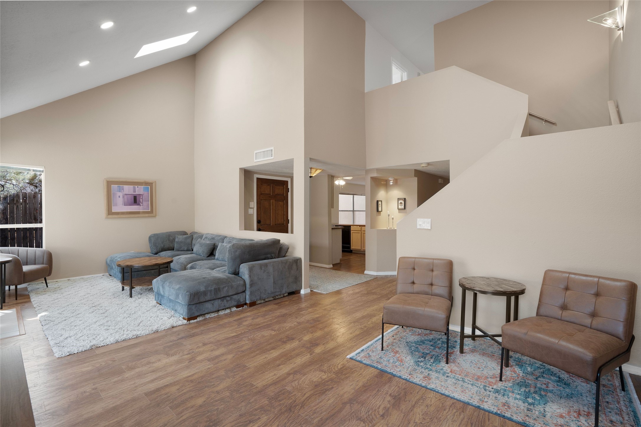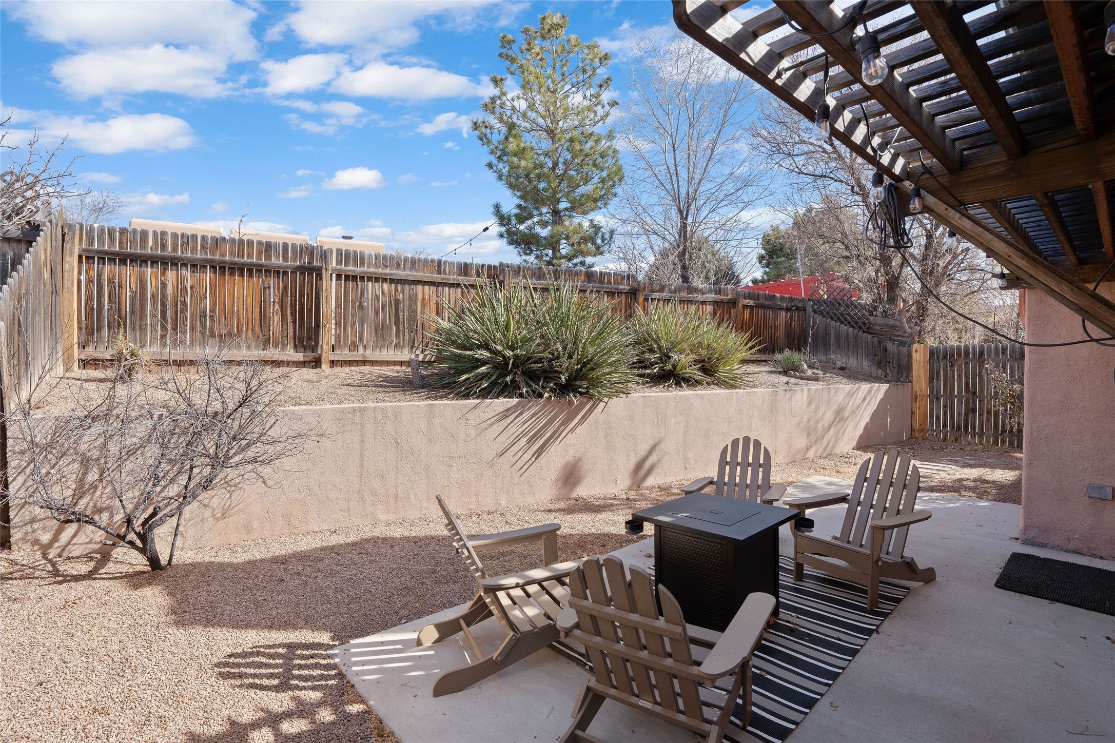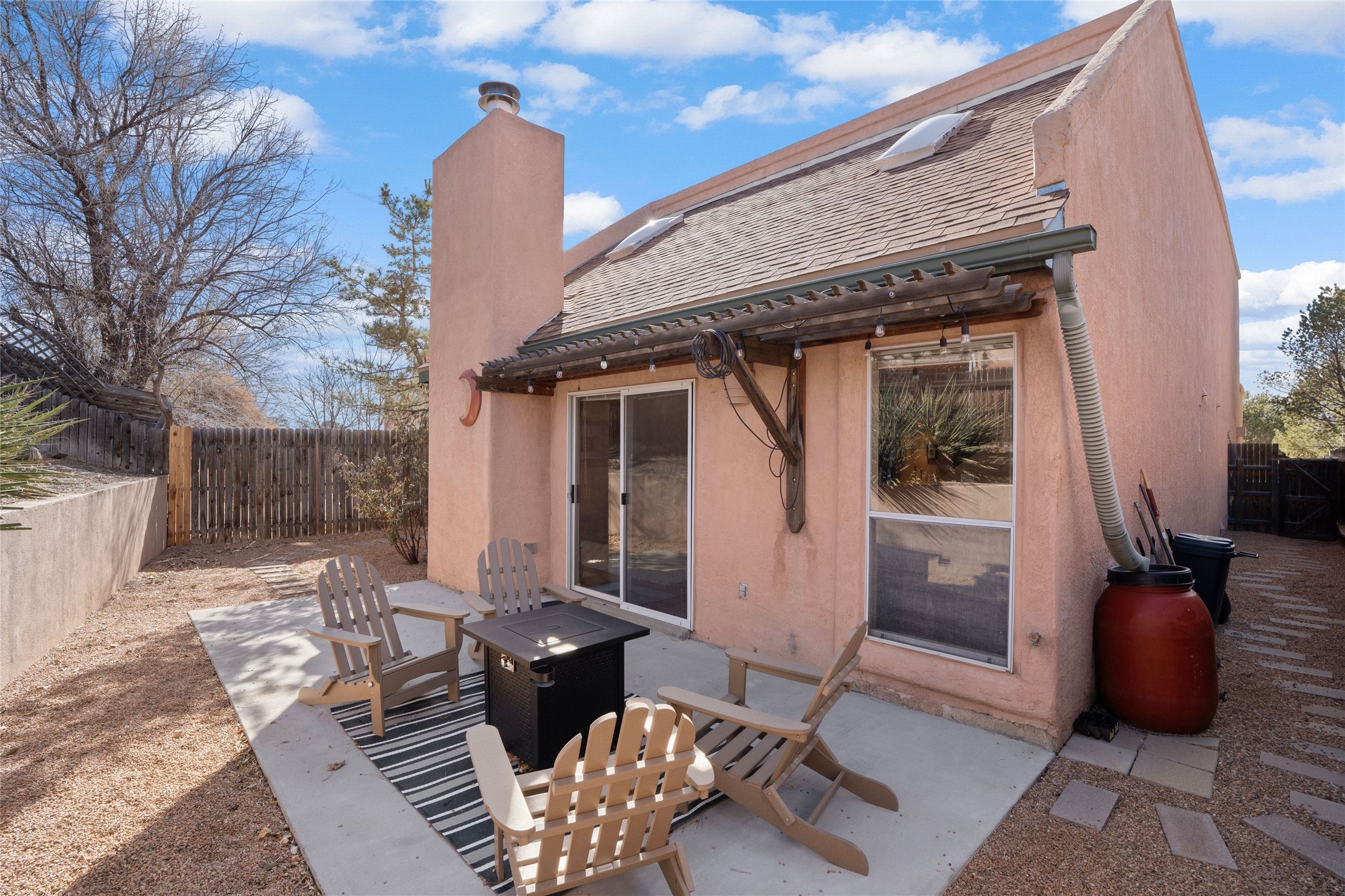 Located in the desirable Via Caballero III subdivision, this approximately 2,000 square foot home offers a blend of comfort and style, featuring three bedrooms and two and a half bathrooms. The primary bedroom features an expansive closet and sunset views. Open living spaces create an inviting atmosphere, perfect for entertaining and everday living. The heart of the home is the living room, featuring a lovely wood-burning fireplace and bathed in natural light from recently installed skylights. The space flows seamlessly to the private, fenced backyard, extending your living space outdoors. Enjoy the expansive new back patio perfect for outdoor gatherings, and the professionally updated landscaping. A new custom copper and metal Zia gate, along with new solar path lights, welcomes you at the front entrance. A thoughtful conversion of the family room provides a spacious third bedroom. Additional recent updates include a new TPO roof (with a 5 year transferable warranty), a new furnace and water heater, fresh interior paint, and a new irrigation/drainage system to expertly handle New Mexico's monsoons. This desirable home is ready for you to create lasting memories!
