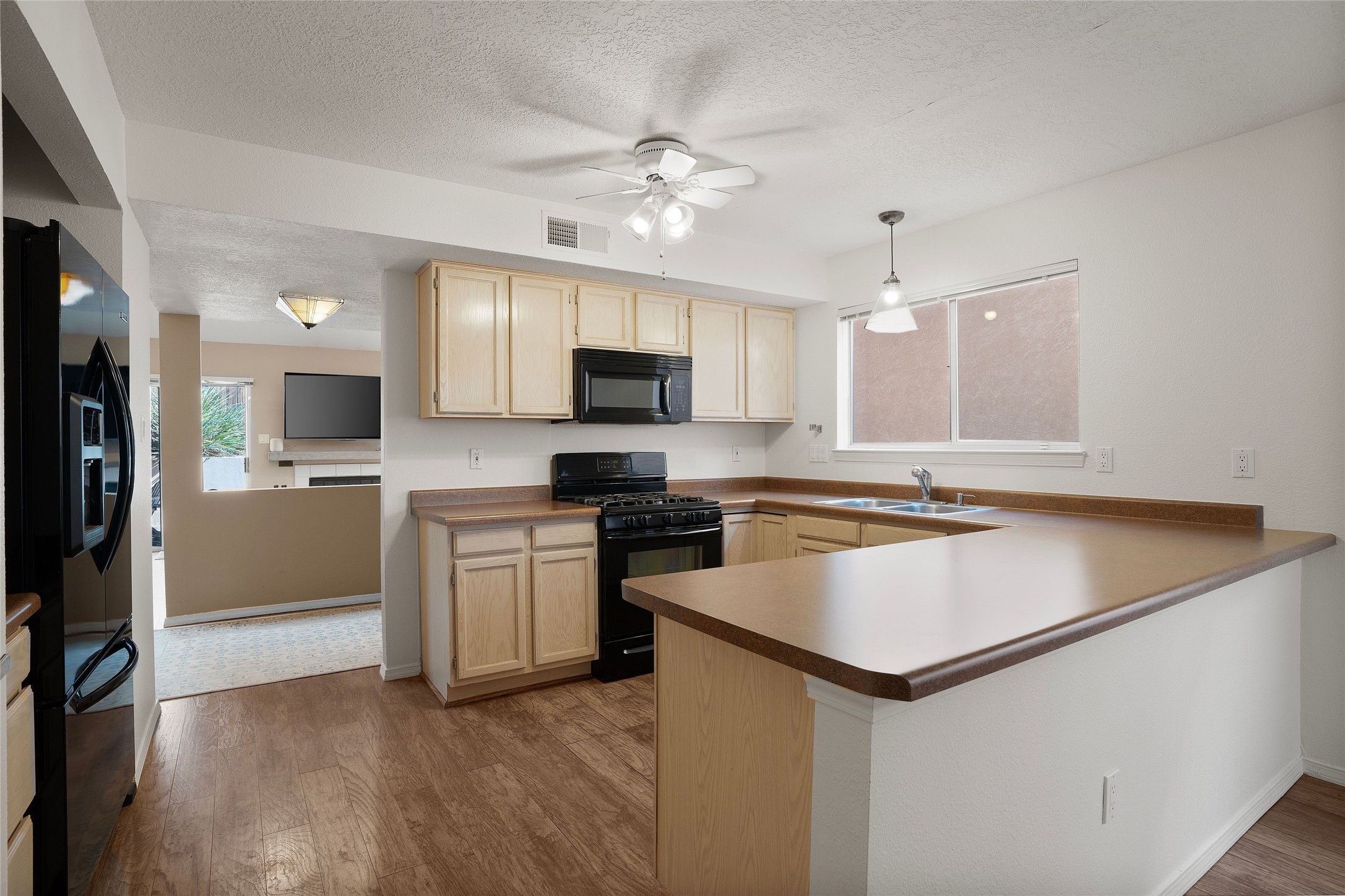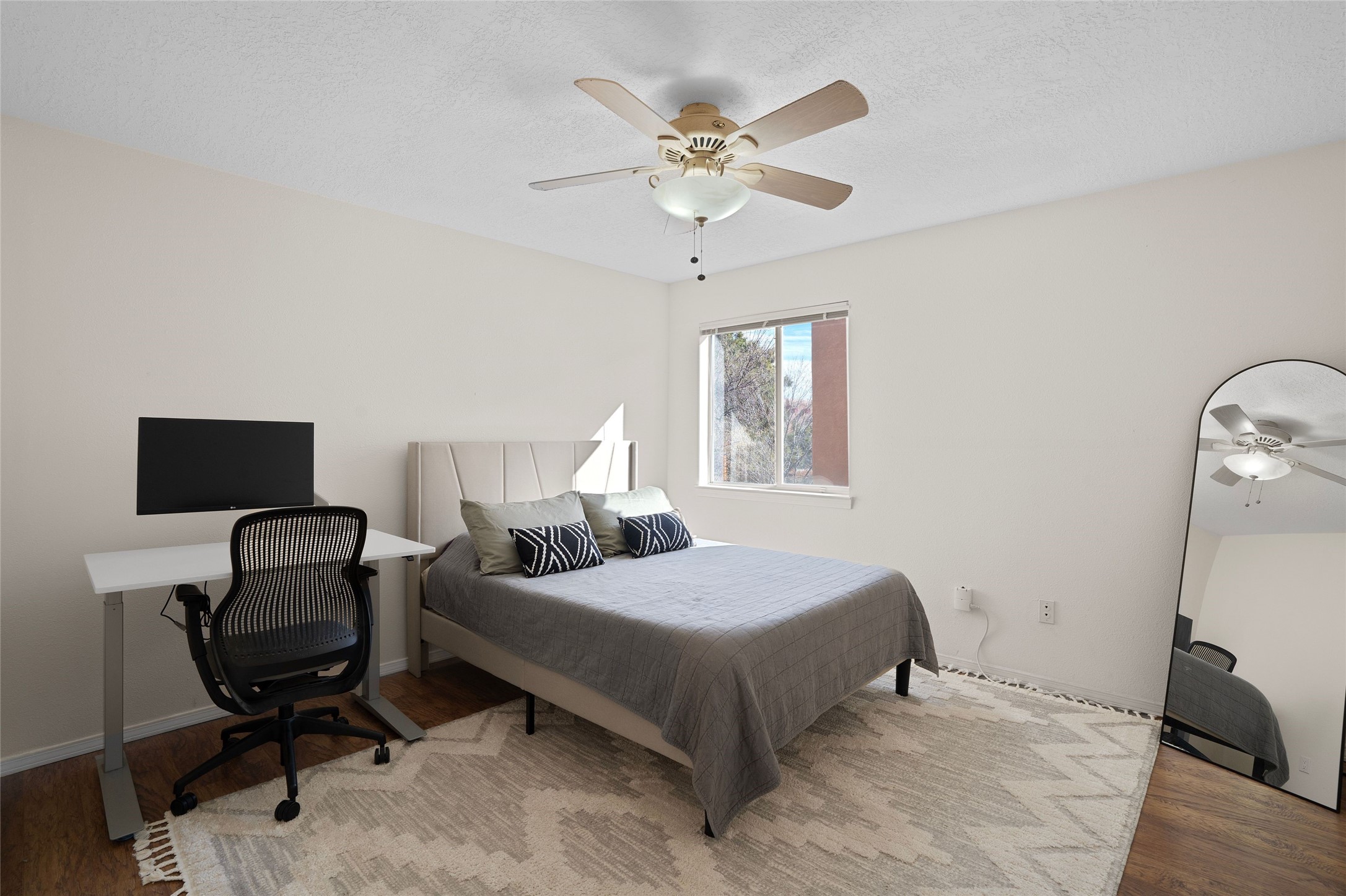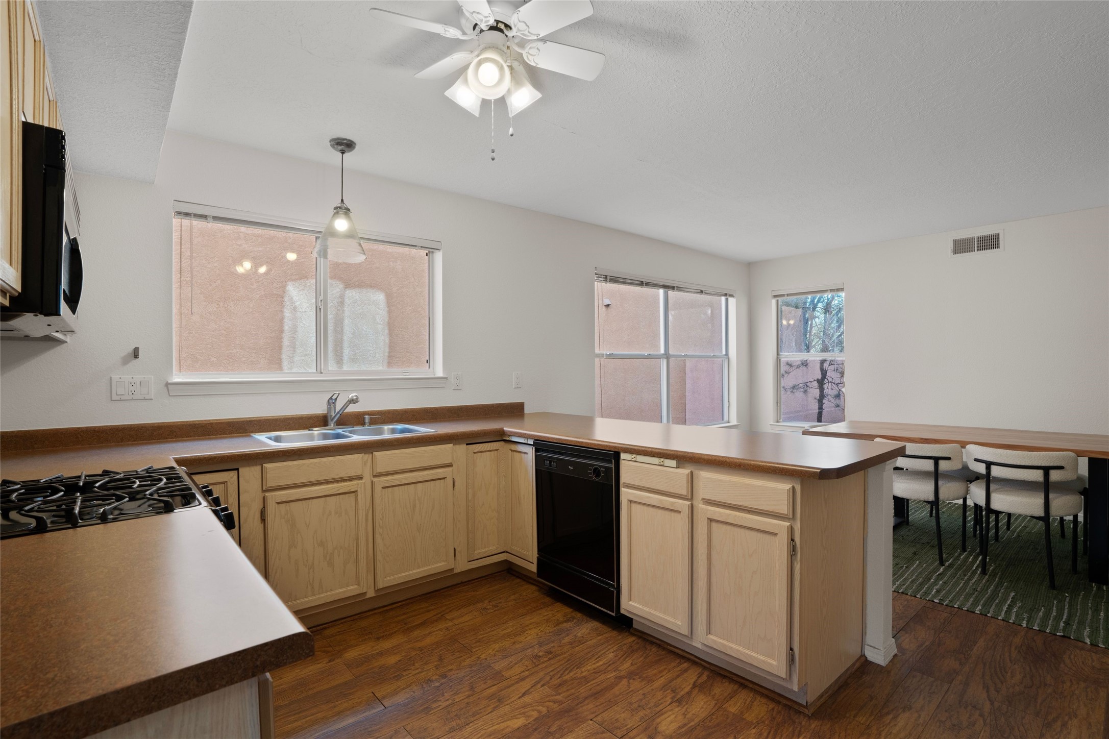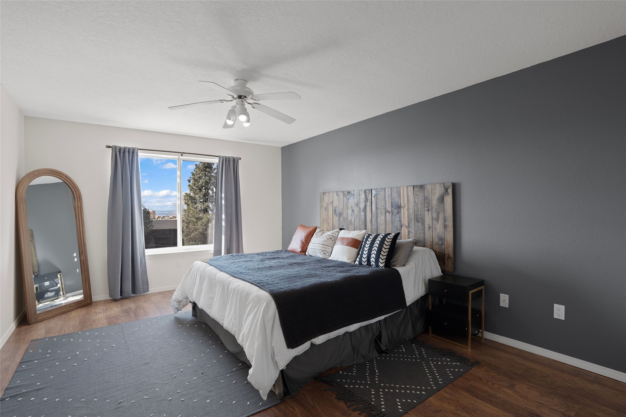 Located in the desirable Via Caballero III subdivision, this approximately 2,000 square foot home offers a blend of comfort and style, featuring three bedrooms and two and a half bathrooms. The primary bedroom features an expansive closet and sunset views. Open living spaces create an inviting atmosphere, perfect for entertaining and everday living. The heart of the home is the living room, featuring a lovely wood-burning fireplace and bathed in natural light from recently installed skylights. The space flows seamlessly to the private, fenced backyard, extending your living space outdoors. Enjoy the expansive new back patio perfect for outdoor gatherings, and the professionally updated landscaping. A new custom copper and metal Zia gate, along with new solar path lights, welcomes you at the front entrance. A thoughtful conversion of the family room provides a spacious third bedroom. Additional recent updates include a new TPO roof (with a 5 year transferable warranty), a new furnace and water heater, fresh interior paint, and a new irrigation/drainage system to expertly handle New Mexico's monsoons. This desirable home is ready for you to create lasting memories!