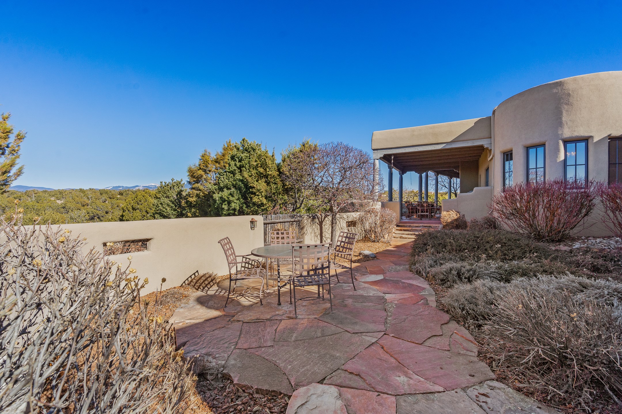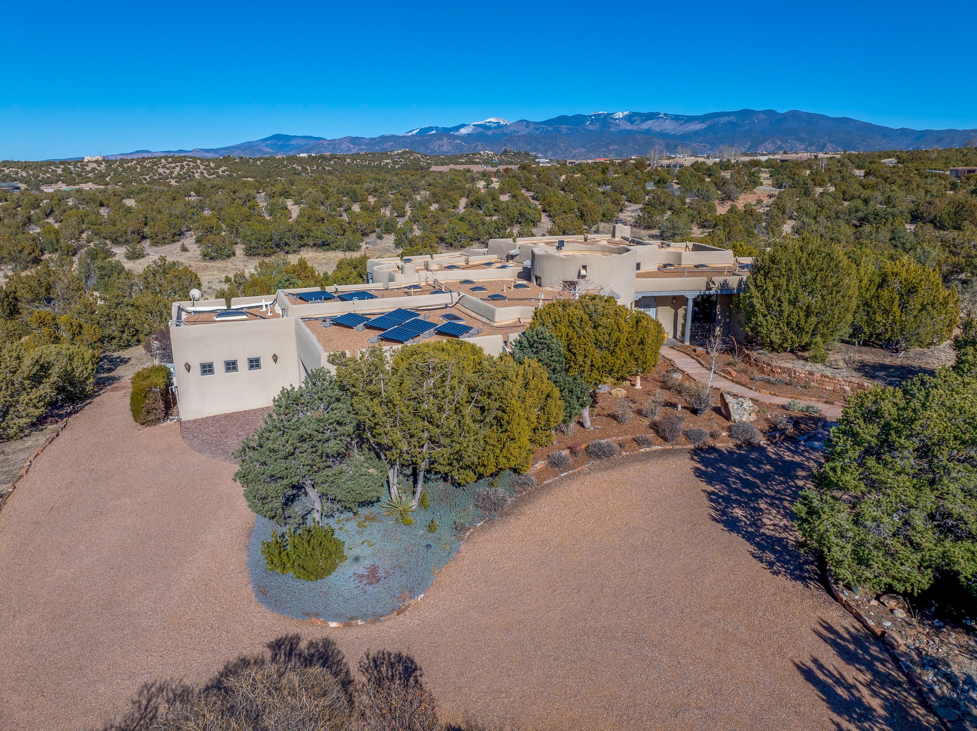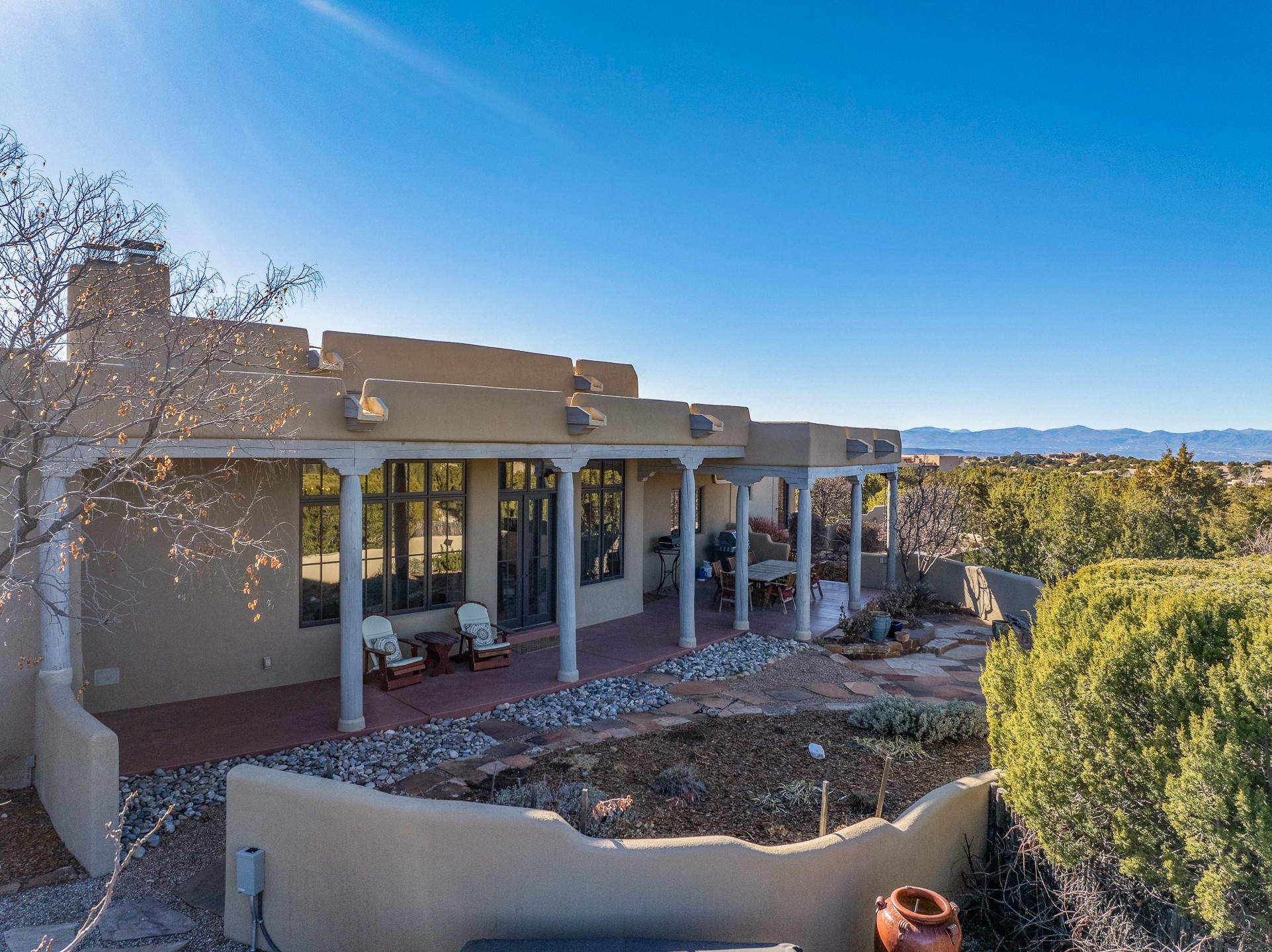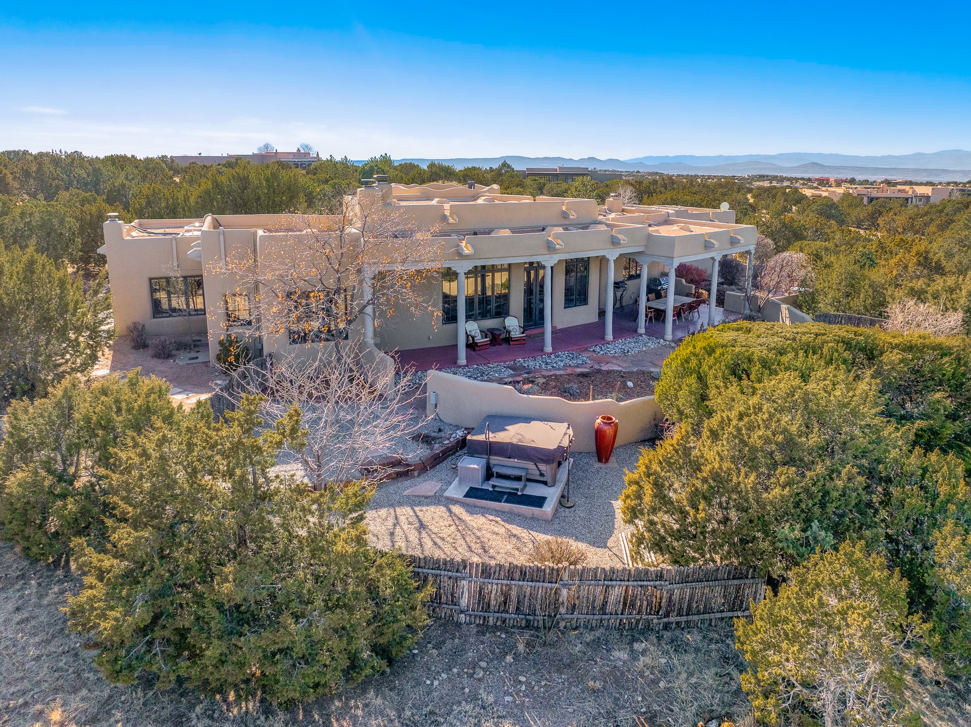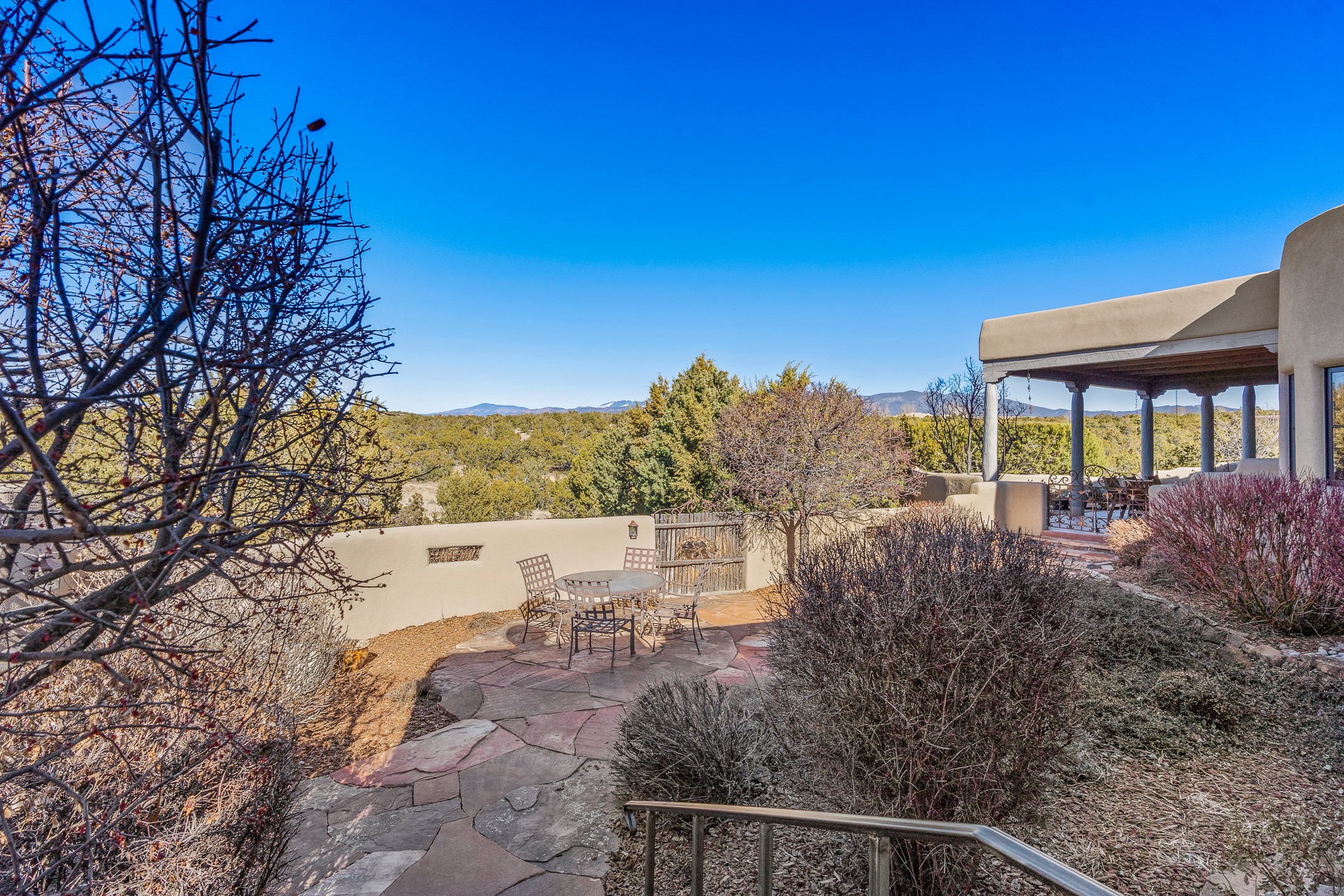 Sundance Estates Beauty! This immaculate single-level home with 3750 +/- sqft is situated on 2.5 acres, boasting views of the Sangre de Cristo and Jemez Mountains. The main house features 3 bedrooms, an office, 4 bathrooms, & an appx 700-square-foot 2 car garage and solar panels. An attached studio/guest quarters of 305 +/- sqft with plaster walls, a full bath, mini-split, separate entrance, & an enclosed yard provides flexibility for guests or creative space. Upon entering, you'll be captivated by the stunning living room with soaring ceiling, vigas, fireplace with doors that open to an expansive covered portal. The walled courtyard with flagstone walkways, multiple seating areas, and a hot tub, offers an ideal setting for entertaining or simply admiring the magnificent views. The cook's kitchen is a dream & features granite countertops, large butcher block island/breakfast bar, Sub-Zero refrigerator, Wolf 6-burner stove with grill, double ovens, trash compactor, two sinks (including one copper), abundant cabinet space, eat-in kitchen nook with a fireplace, built-in hutch, & a spacious walk-in pantry. On one side of the home, you'll find an office & the luxurious primary suite, complete with sitting area, vigas, fireplace, and a stunning ensuite bathroom. The bath includes granite countertops, a fireplace, power blinds, double vanities, a jetted tub, a separate shower, a mini split & two walk-in closets w/ built-ins. On the opposite side, there are 2 additional bedrooms, each w/ ensuite bathrooms, plus a convenient half-bath for guests. Wonderful amenities and features Include: Radiant in floor heating-7 mini splits (heating and cooling)-Plaster walls-Travertine tile floors-Wood doors-Wet bar-Nichos-Bancos-Ceiling fans-Skylights-Laundry room with sink, cabinets, counter space/closet-Formal dining room with wood beam ceiling-Built-ins. This exceptional property blends luxury, comfort, and functionality in a stunning setting. Please read agent only remarks.