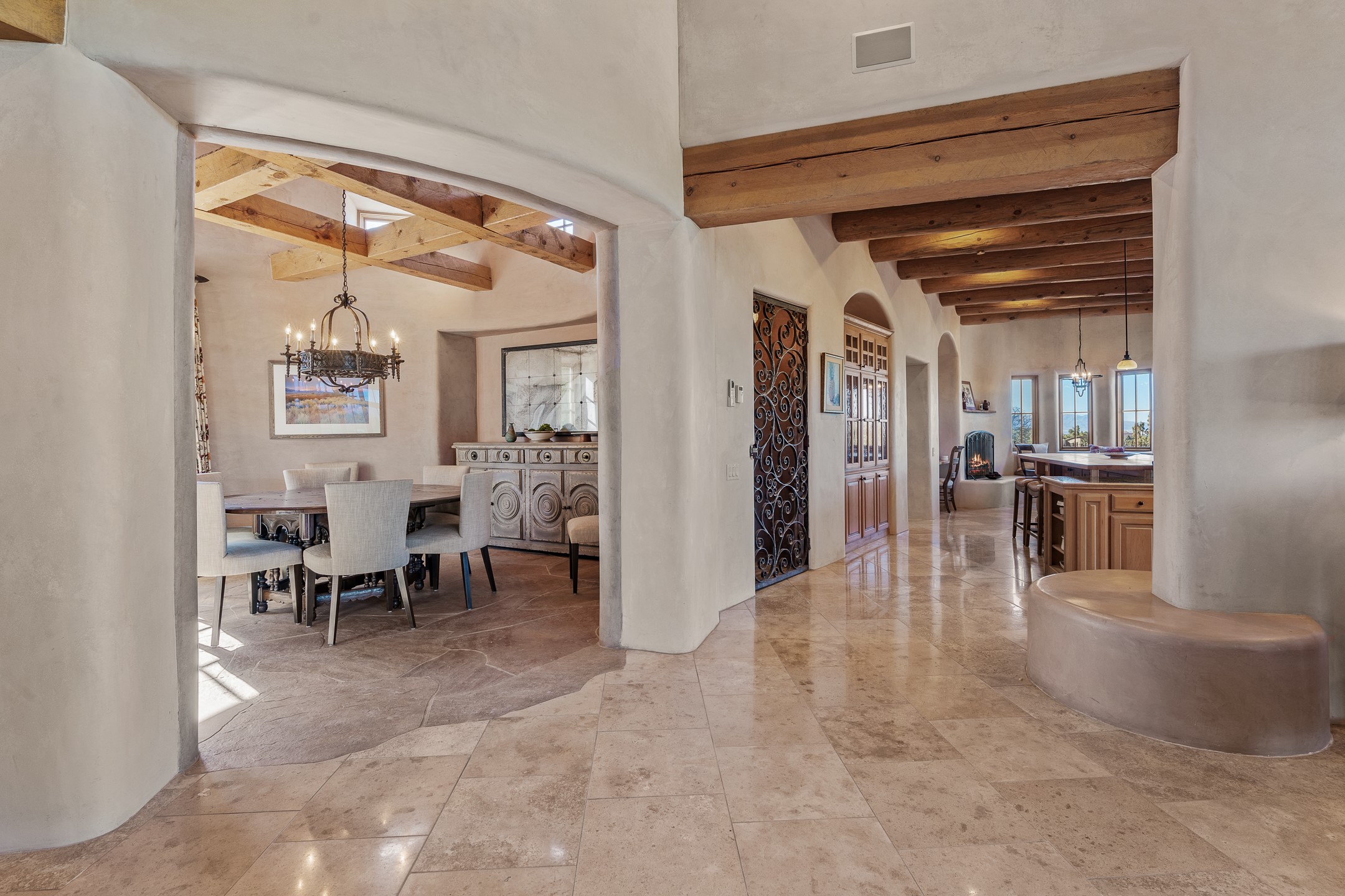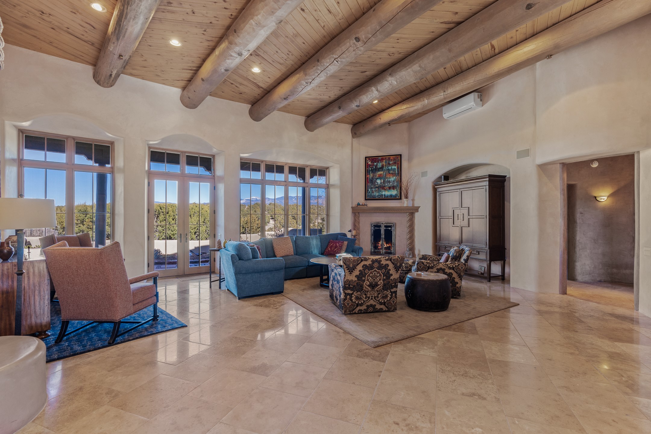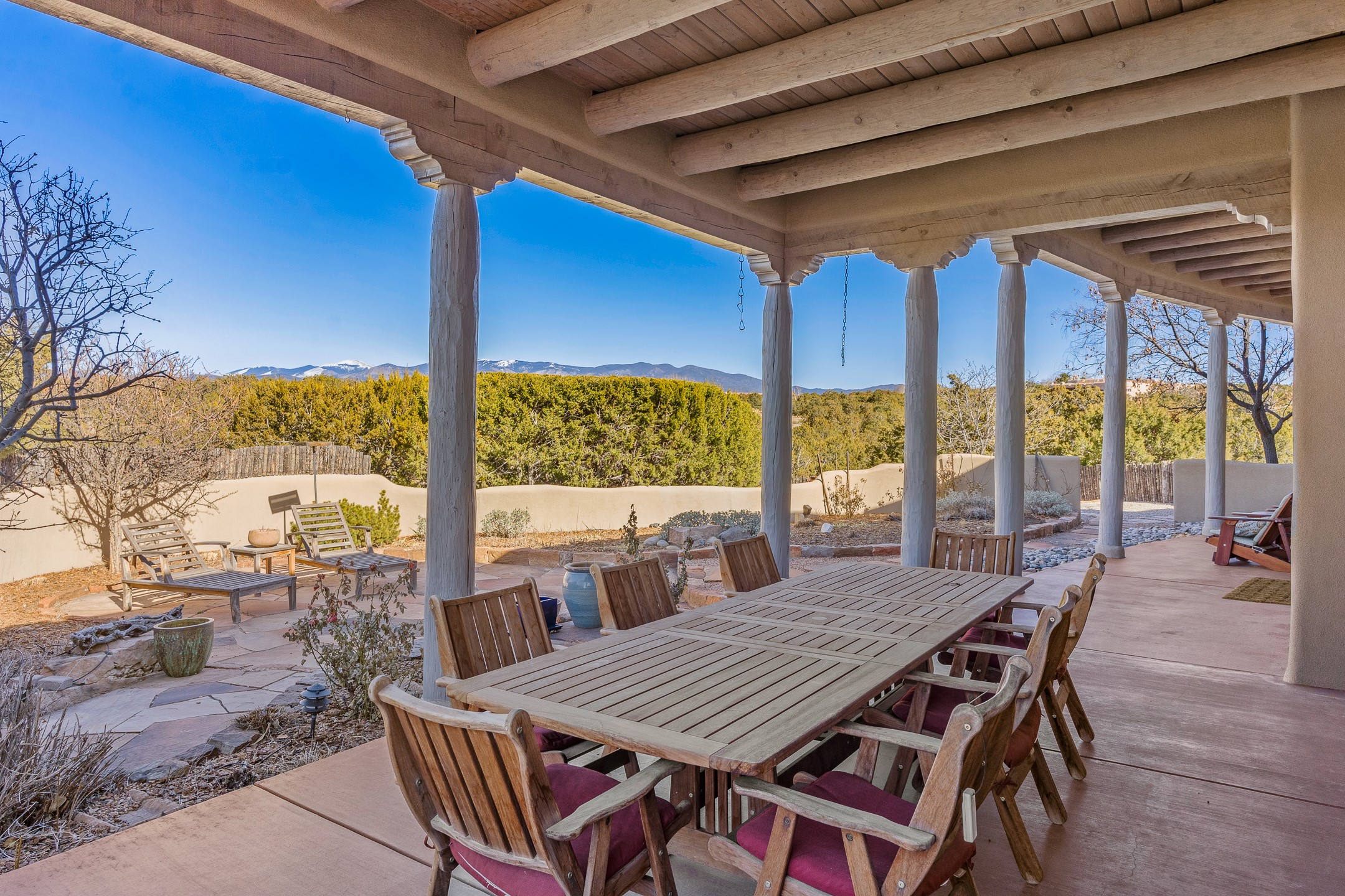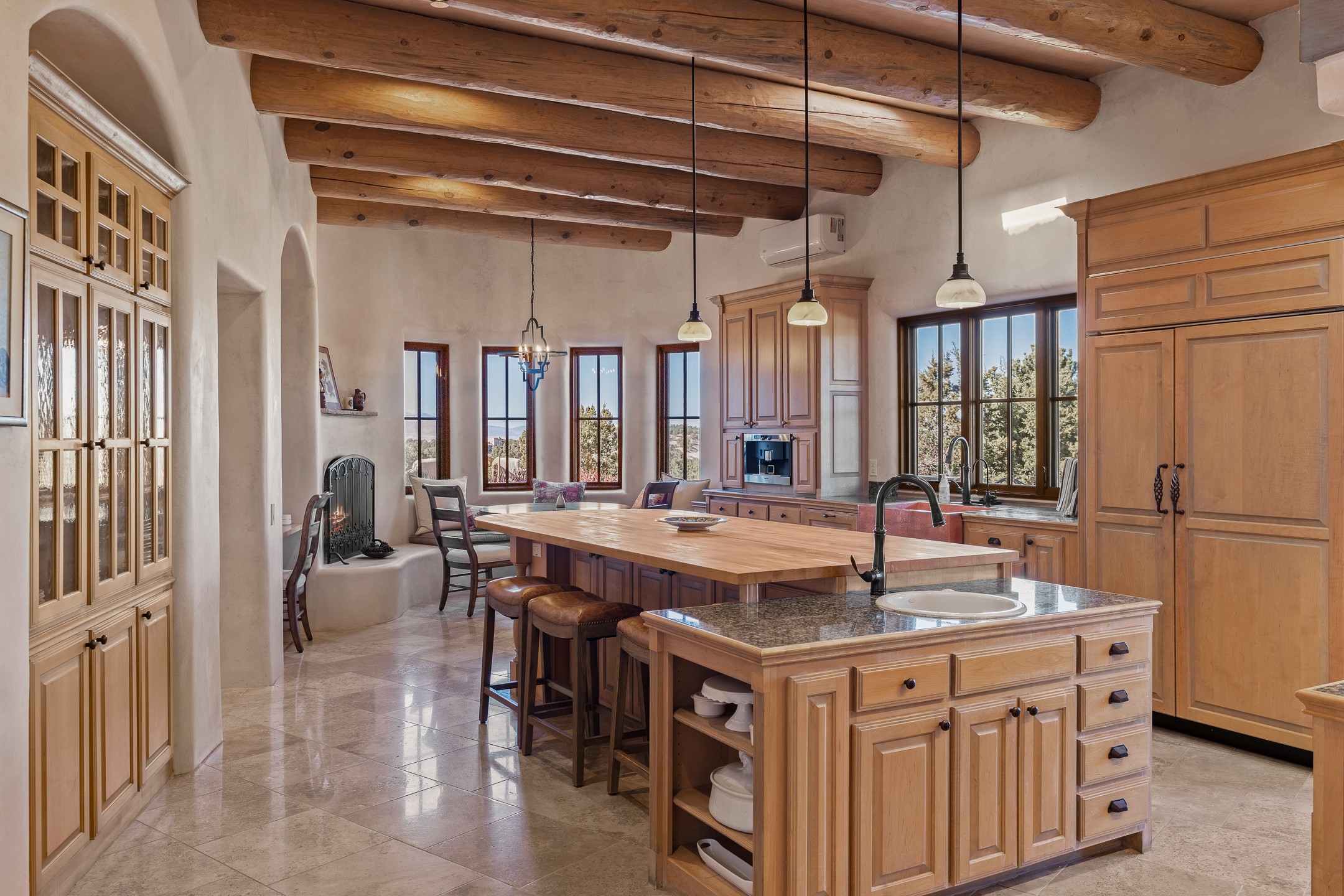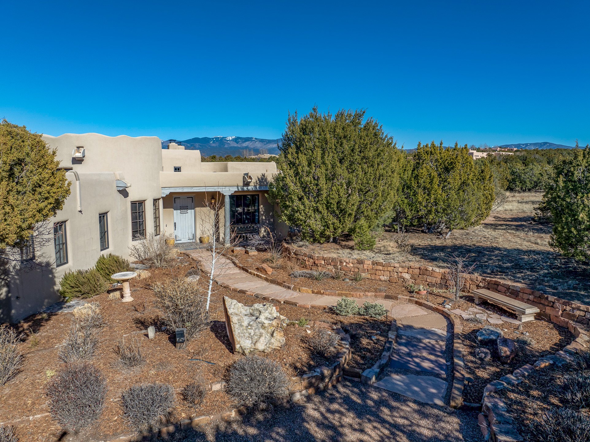 Sundance Estates Beauty! This immaculate single-level home with 3750 +/- sqft is situated on 2.5 acres, boasting views of the Sangre de Cristo and Jemez Mountains. The main house features 3 bedrooms, an office, 4 bathrooms, & an appx 700-square-foot 2 car garage and solar panels. An attached studio/guest quarters of 305 +/- sqft with plaster walls, a full bath, mini-split, separate entrance, & an enclosed yard provides flexibility for guests or creative space. Upon entering, you'll be captivated by the stunning living room with soaring ceiling, vigas, fireplace with doors that open to an expansive covered portal. The walled courtyard with flagstone walkways, multiple seating areas, and a hot tub, offers an ideal setting for entertaining or simply admiring the magnificent views. The cook's kitchen is a dream & features granite countertops, large butcher block island/breakfast bar, Sub-Zero refrigerator, Wolf 6-burner stove with grill, double ovens, trash compactor, two sinks (including one copper), abundant cabinet space, eat-in kitchen nook with a fireplace, built-in hutch, & a spacious walk-in pantry. On one side of the home, you'll find an office & the luxurious primary suite, complete with sitting area, vigas, fireplace, and a stunning ensuite bathroom. The bath includes granite countertops, a fireplace, power blinds, double vanities, a jetted tub, a separate shower, a mini split & two walk-in closets w/ built-ins. On the opposite side, there are 2 additional bedrooms, each w/ ensuite bathrooms, plus a convenient half-bath for guests. Wonderful amenities and features Include: Radiant in floor heating-7 mini splits (heating and cooling)-Plaster walls-Travertine tile floors-Wood doors-Wet bar-Nichos-Bancos-Ceiling fans-Skylights-Laundry room with sink, cabinets, counter space/closet-Formal dining room with wood beam ceiling-Built-ins. This exceptional property blends luxury, comfort, and functionality in a stunning setting. Please read agent only remarks.