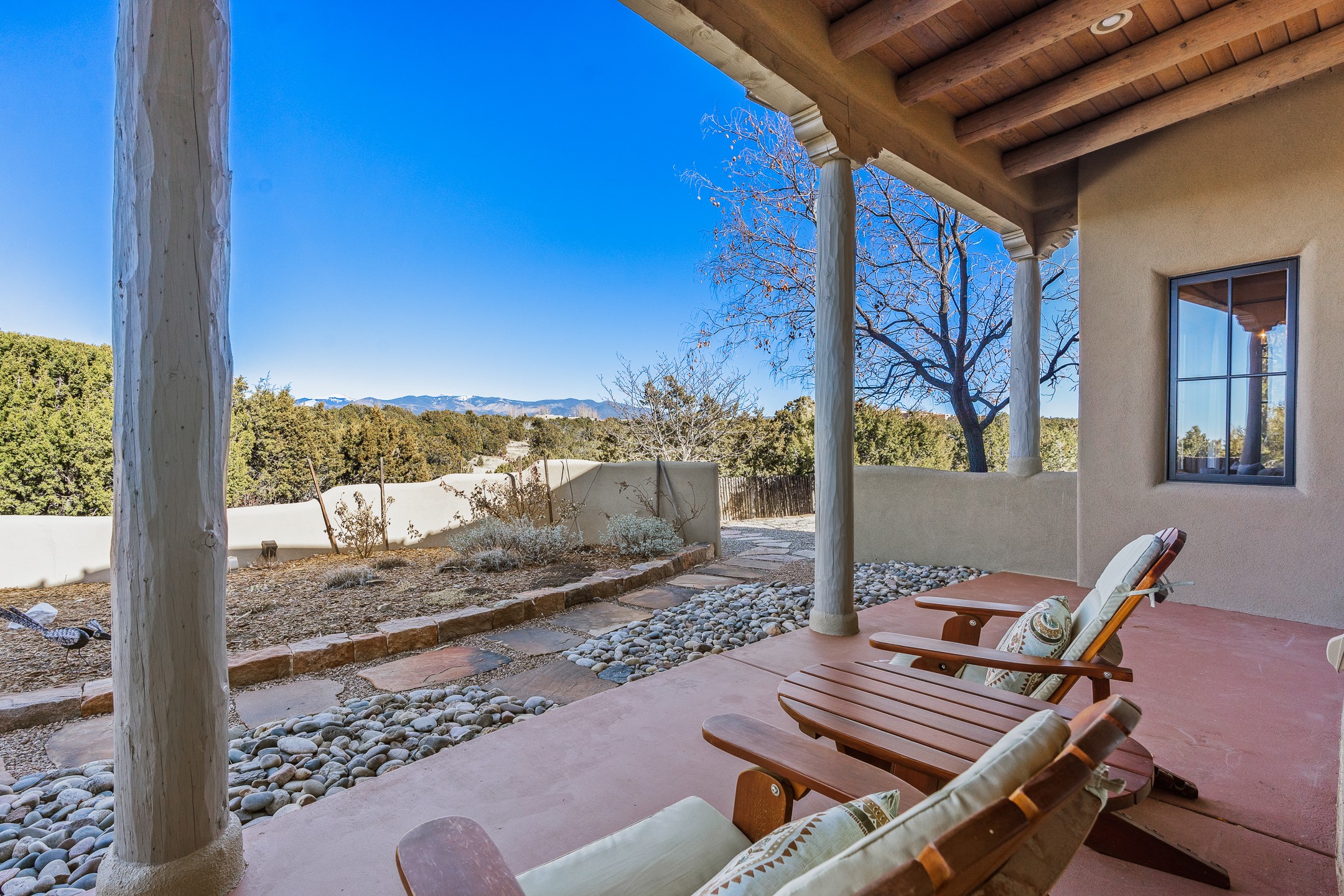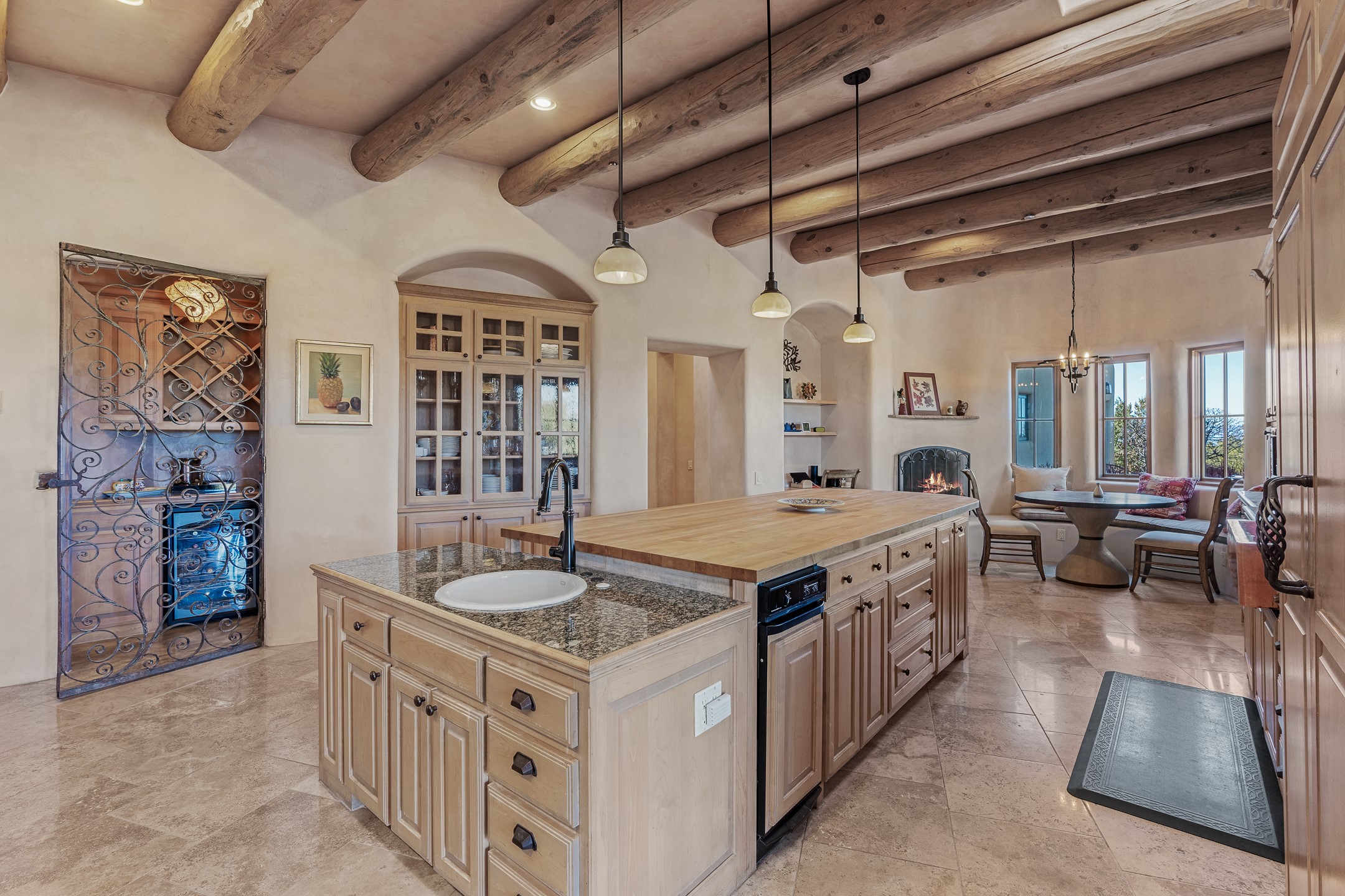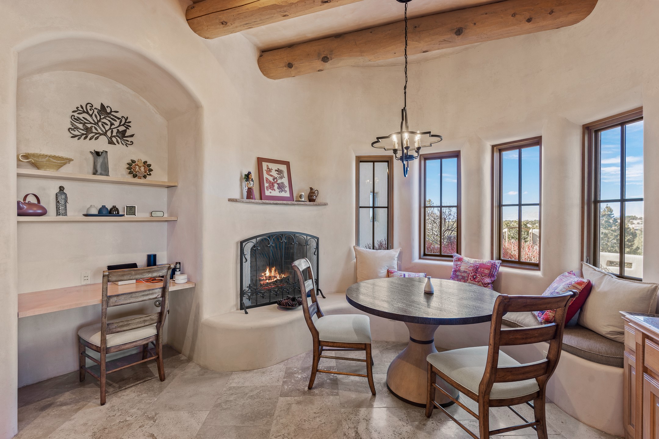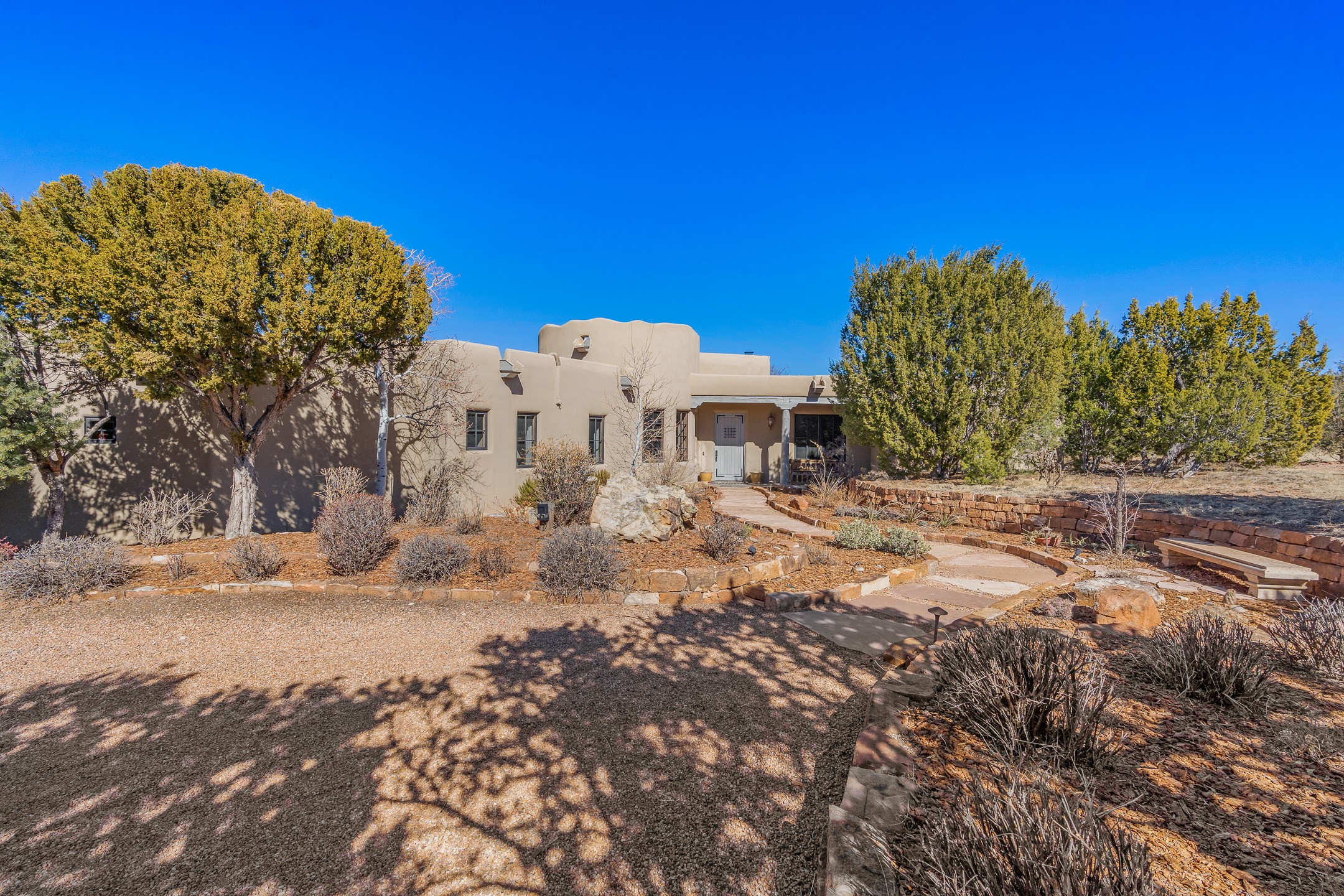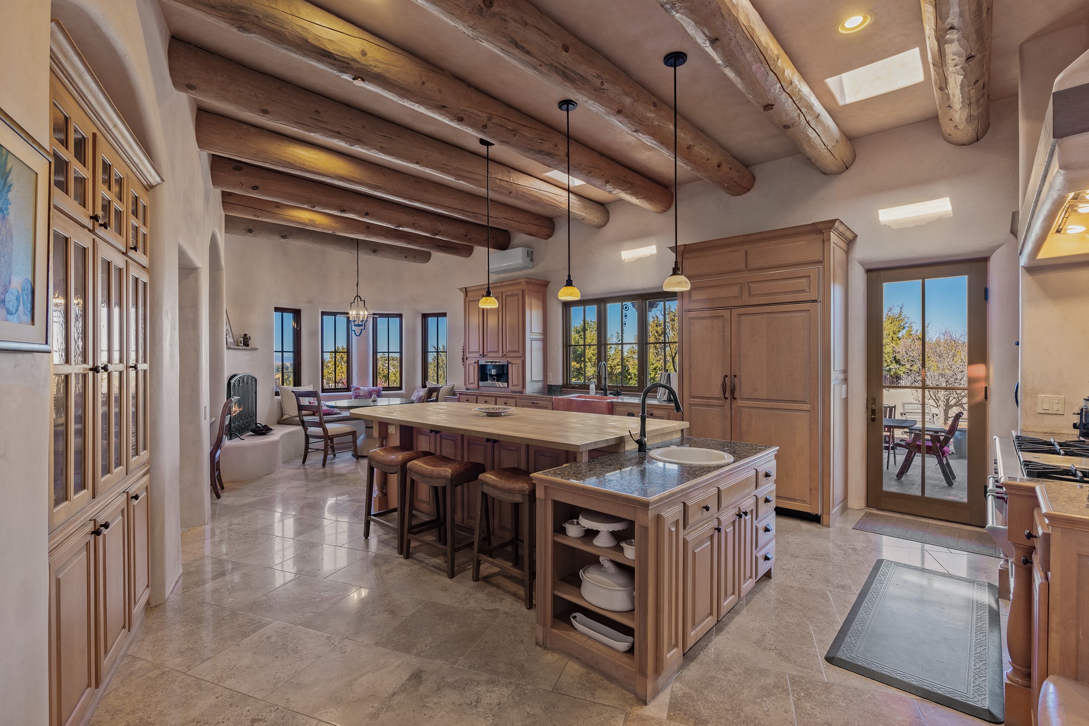 Sundance Estates Beauty! This immaculate single-level home with 3750 +/- sqft is situated on 2.5 acres, boasting views of the Sangre de Cristo and Jemez Mountains. The main house features 3 bedrooms, an office, 4 bathrooms, & an appx 700-square-foot 2 car garage and solar panels. An attached studio/guest quarters of 305 +/- sqft with plaster walls, a full bath, mini-split, separate entrance, & an enclosed yard provides flexibility for guests or creative space. Upon entering, you'll be captivated by the stunning living room with soaring ceiling, vigas, fireplace with doors that open to an expansive covered portal. The walled courtyard with flagstone walkways, multiple seating areas, and a hot tub, offers an ideal setting for entertaining or simply admiring the magnificent views. The cook's kitchen is a dream & features granite countertops, large butcher block island/breakfast bar, Sub-Zero refrigerator, Wolf 6-burner stove with grill, double ovens, trash compactor, two sinks (including one copper), abundant cabinet space, eat-in kitchen nook with a fireplace, built-in hutch, & a spacious walk-in pantry. On one side of the home, you'll find an office & the luxurious primary suite, complete with sitting area, vigas, fireplace, and a stunning ensuite bathroom. The bath includes granite countertops, a fireplace, power blinds, double vanities, a jetted tub, a separate shower, a mini split & two walk-in closets w/ built-ins. On the opposite side, there are 2 additional bedrooms, each w/ ensuite bathrooms, plus a convenient half-bath for guests. Wonderful amenities and features Include: Radiant in floor heating-7 mini splits (heating and cooling)-Plaster walls-Travertine tile floors-Wood doors-Wet bar-Nichos-Bancos-Ceiling fans-Skylights-Laundry room with sink, cabinets, counter space/closet-Formal dining room with wood beam ceiling-Built-ins. This exceptional property blends luxury, comfort, and functionality in a stunning setting. Please read agent only remarks.