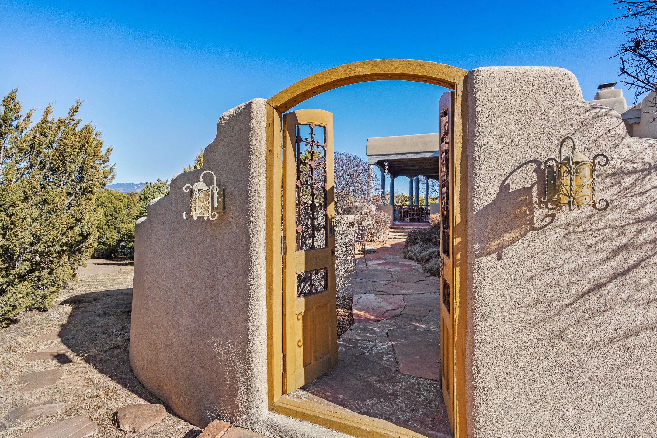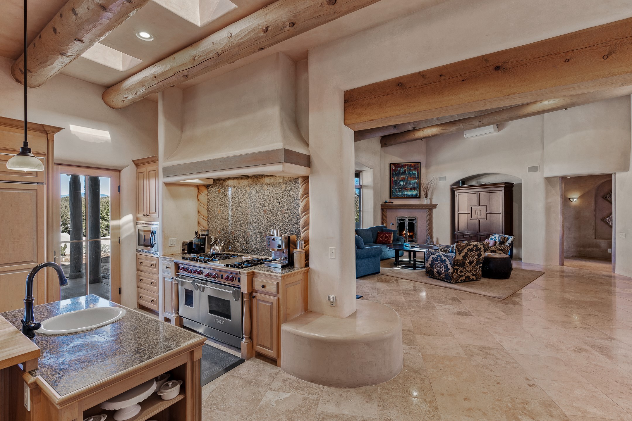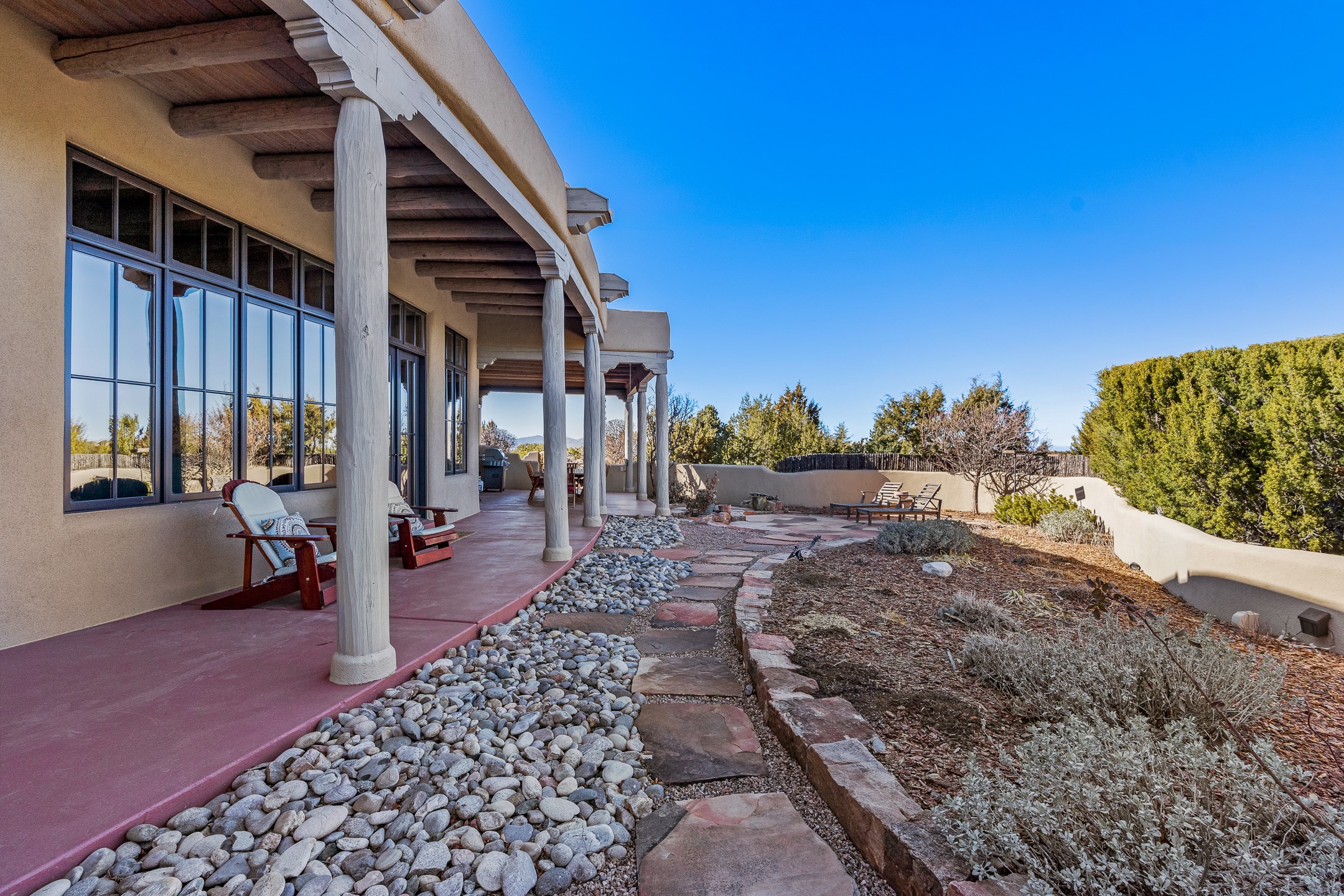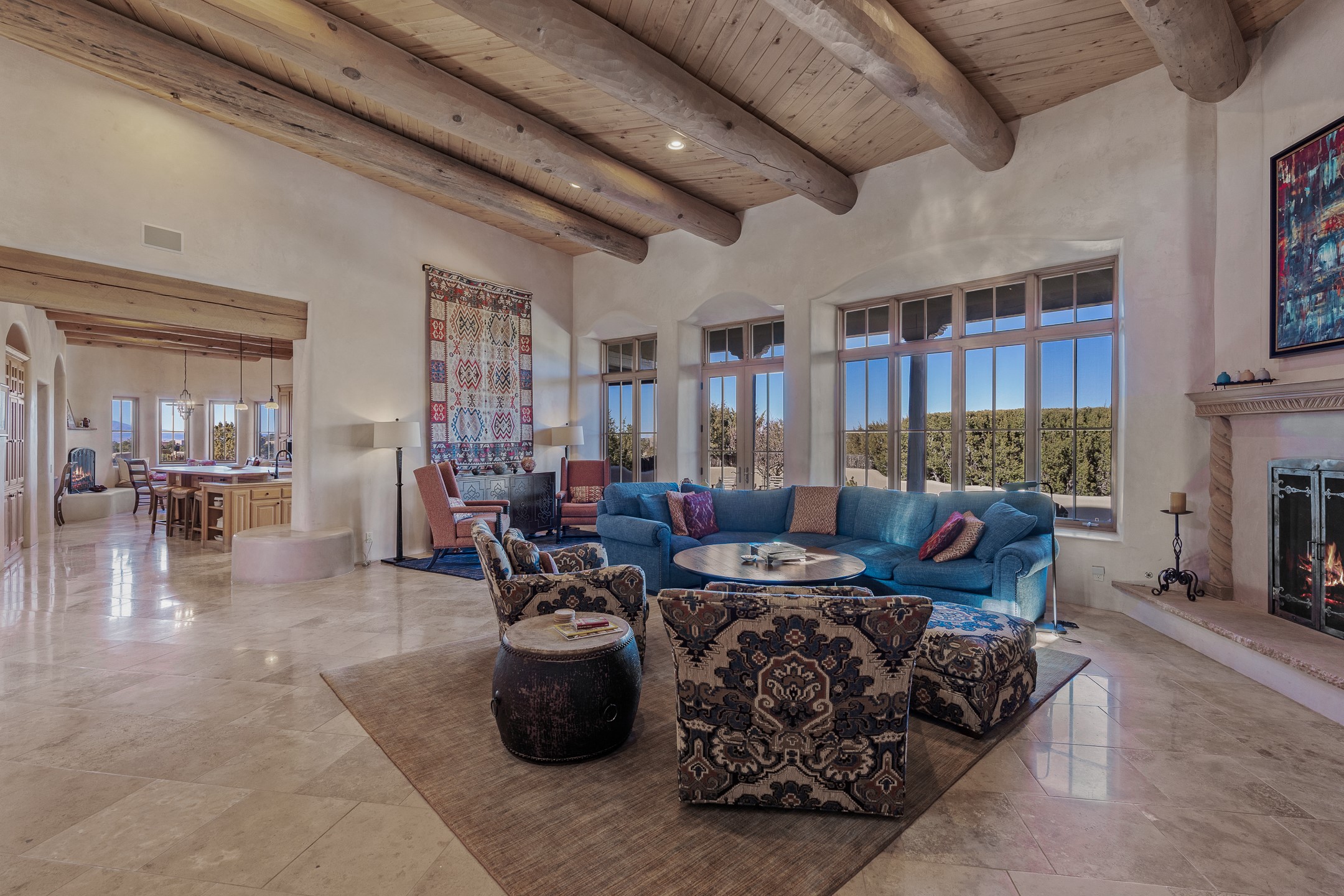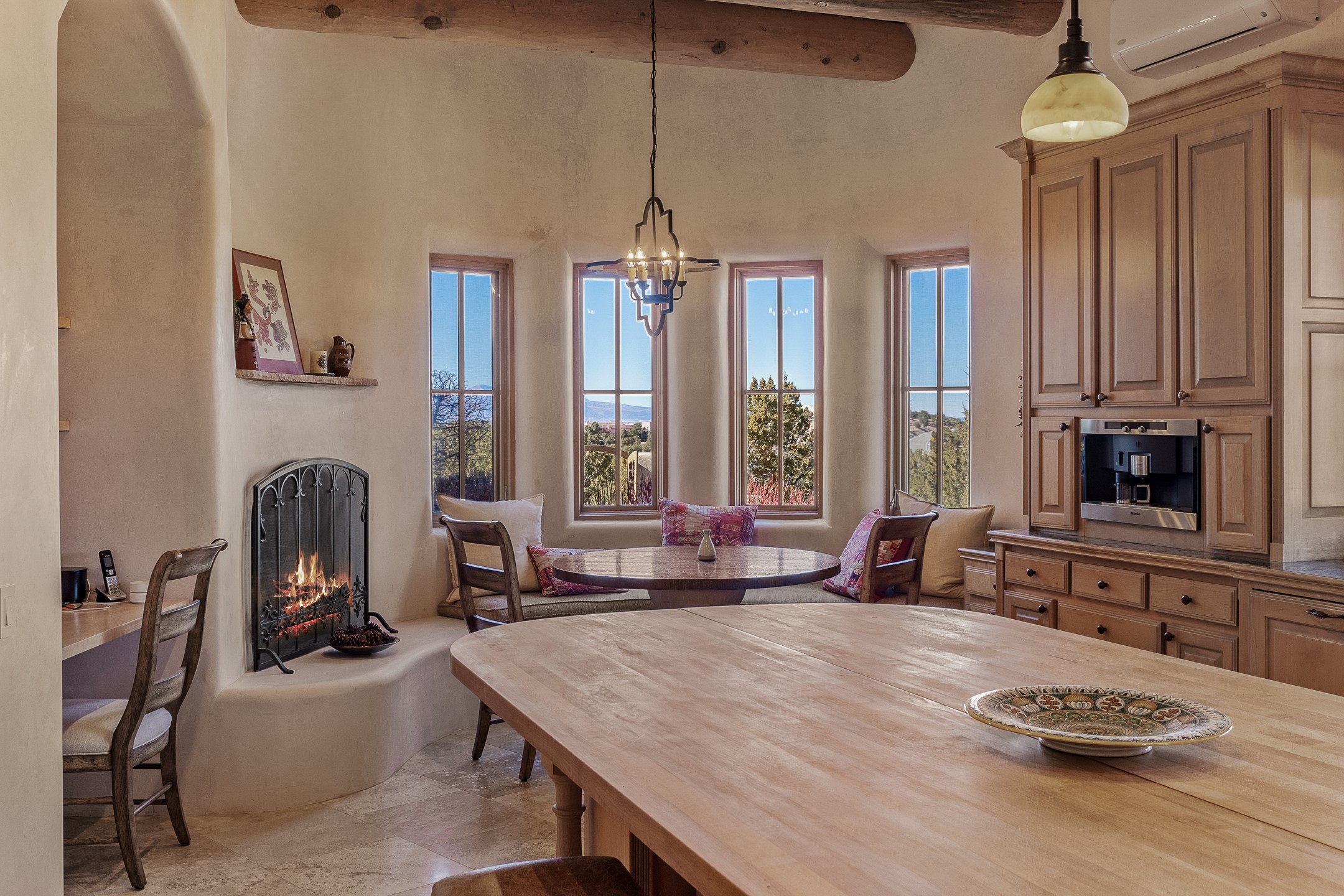 Sundance Estates Beauty! This immaculate single-level home with 3750 +/- sqft is situated on 2.5 acres, boasting views of the Sangre de Cristo and Jemez Mountains. The main house features 3 bedrooms, an office, 4 bathrooms, & an appx 700-square-foot 2 car garage and solar panels. An attached studio/guest quarters of 305 +/- sqft with plaster walls, a full bath, mini-split, separate entrance, & an enclosed yard provides flexibility for guests or creative space. Upon entering, you'll be captivated by the stunning living room with soaring ceiling, vigas, fireplace with doors that open to an expansive covered portal. The walled courtyard with flagstone walkways, multiple seating areas, and a hot tub, offers an ideal setting for entertaining or simply admiring the magnificent views. The cook's kitchen is a dream & features granite countertops, large butcher block island/breakfast bar, Sub-Zero refrigerator, Wolf 6-burner stove with grill, double ovens, trash compactor, two sinks (including one copper), abundant cabinet space, eat-in kitchen nook with a fireplace, built-in hutch, & a spacious walk-in pantry. On one side of the home, you'll find an office & the luxurious primary suite, complete with sitting area, vigas, fireplace, and a stunning ensuite bathroom. The bath includes granite countertops, a fireplace, power blinds, double vanities, a jetted tub, a separate shower, a mini split & two walk-in closets w/ built-ins. On the opposite side, there are 2 additional bedrooms, each w/ ensuite bathrooms, plus a convenient half-bath for guests. Wonderful amenities and features Include: Radiant in floor heating-7 mini splits (heating and cooling)-Plaster walls-Travertine tile floors-Wood doors-Wet bar-Nichos-Bancos-Ceiling fans-Skylights-Laundry room with sink, cabinets, counter space/closet-Formal dining room with wood beam ceiling-Built-ins. This exceptional property blends luxury, comfort, and functionality in a stunning setting. Please read agent only remarks.