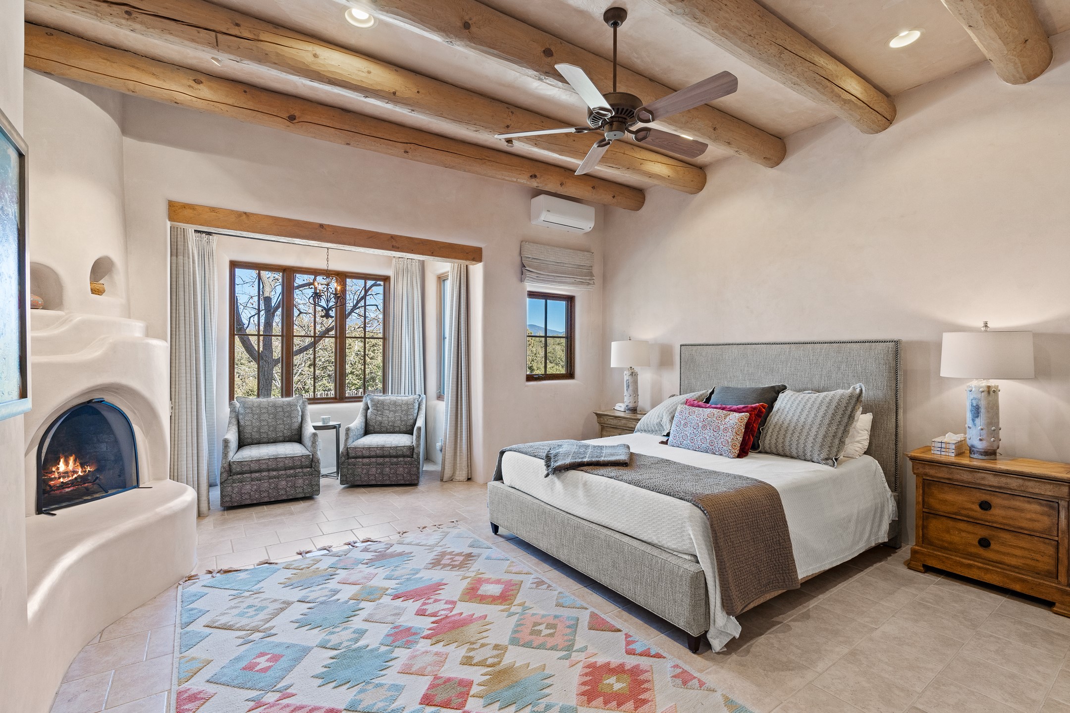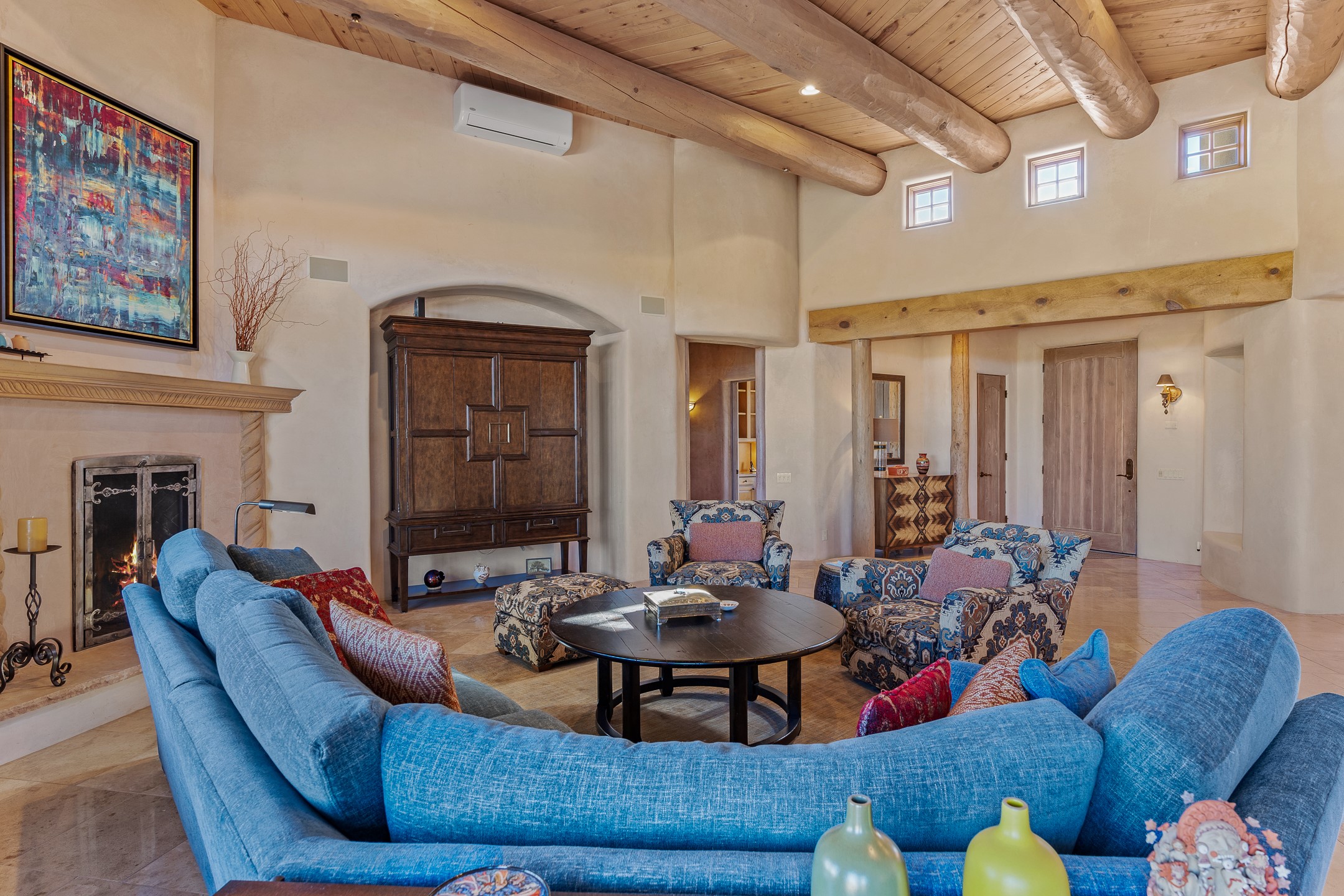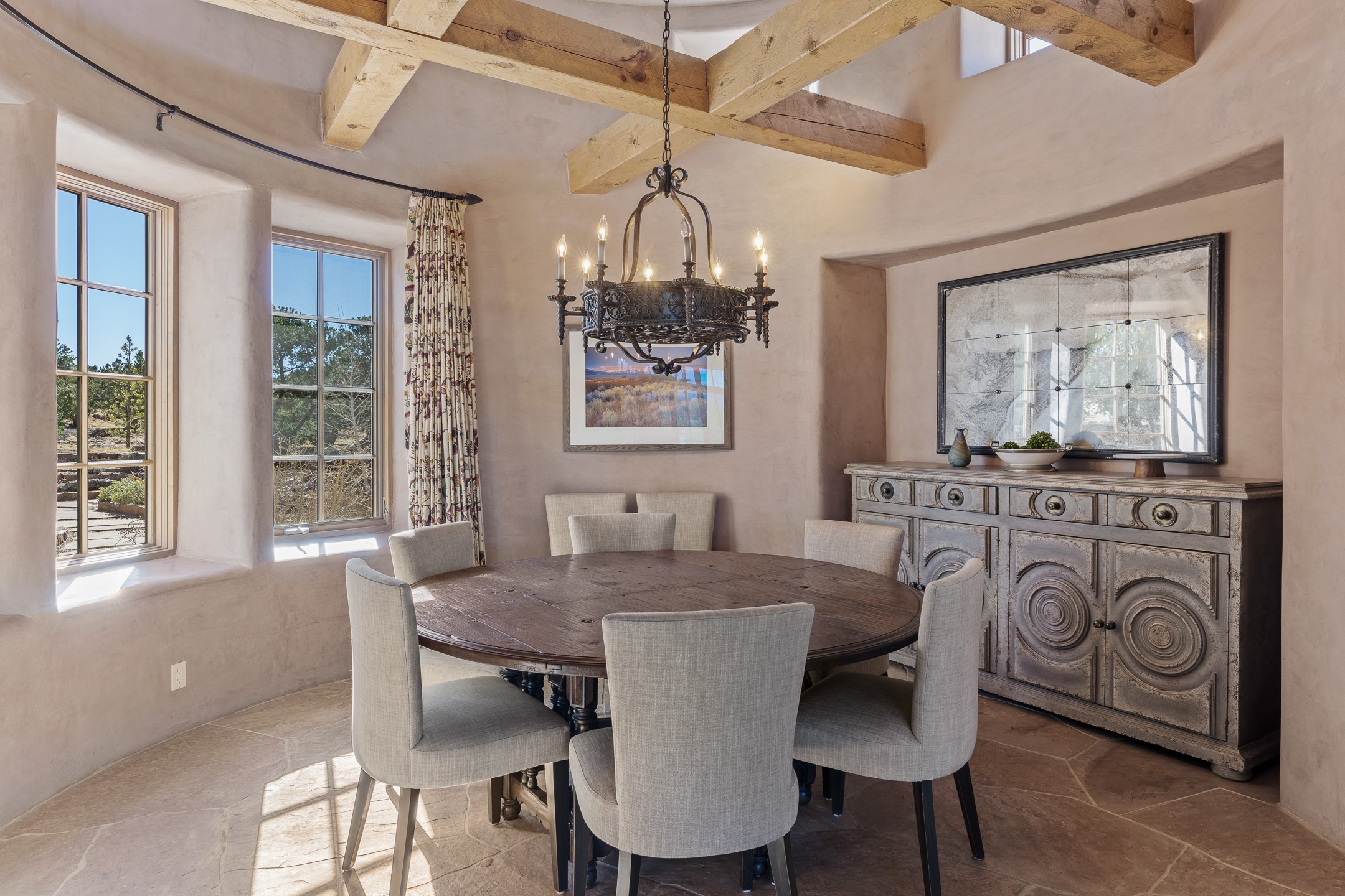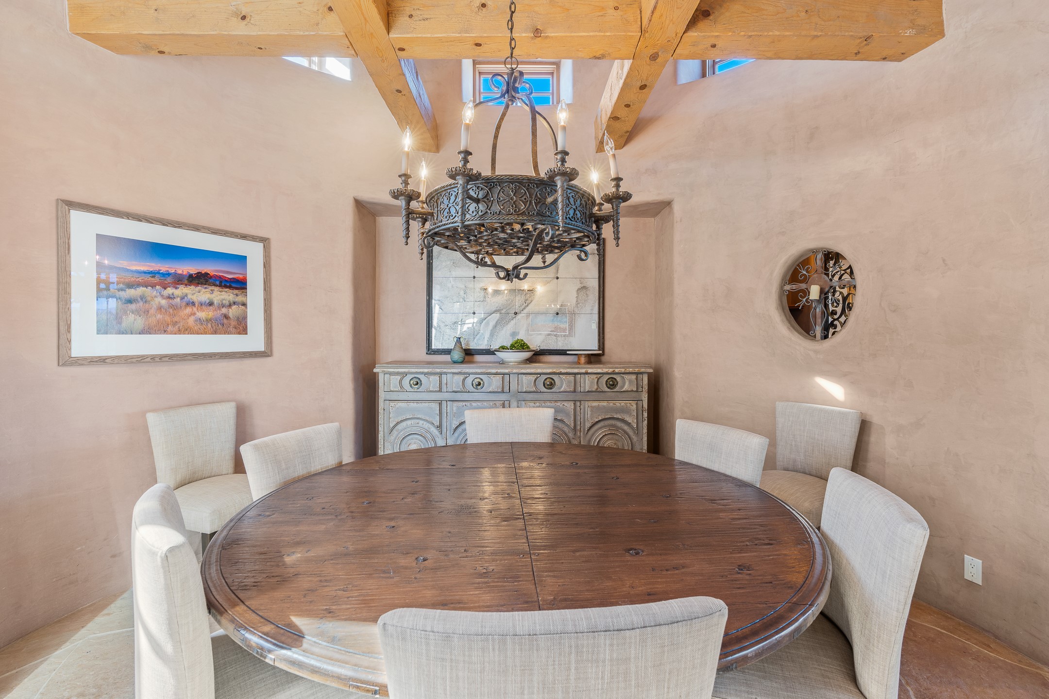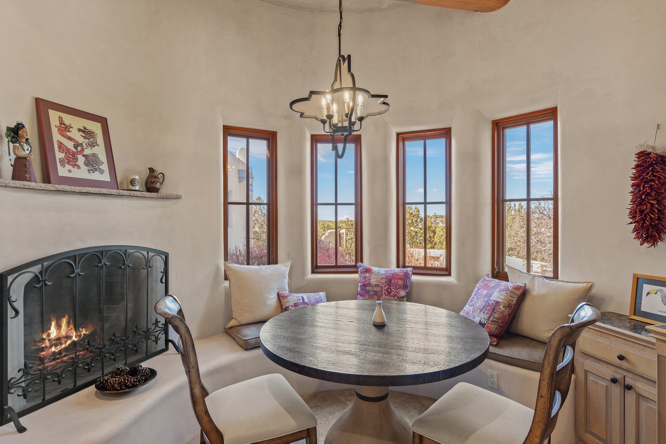 Sundance Estates Beauty! This immaculate single-level home with 3750 +/- sqft is situated on 2.5 acres, boasting views of the Sangre de Cristo and Jemez Mountains. The main house features 3 bedrooms, an office, 4 bathrooms, & an appx 700-square-foot 2 car garage and solar panels. An attached studio/guest quarters of 305 +/- sqft with plaster walls, a full bath, mini-split, separate entrance, & an enclosed yard provides flexibility for guests or creative space. Upon entering, you'll be captivated by the stunning living room with soaring ceiling, vigas, fireplace with doors that open to an expansive covered portal. The walled courtyard with flagstone walkways, multiple seating areas, and a hot tub, offers an ideal setting for entertaining or simply admiring the magnificent views. The cook's kitchen is a dream & features granite countertops, large butcher block island/breakfast bar, Sub-Zero refrigerator, Wolf 6-burner stove with grill, double ovens, trash compactor, two sinks (including one copper), abundant cabinet space, eat-in kitchen nook with a fireplace, built-in hutch, & a spacious walk-in pantry. On one side of the home, you'll find an office & the luxurious primary suite, complete with sitting area, vigas, fireplace, and a stunning ensuite bathroom. The bath includes granite countertops, a fireplace, power blinds, double vanities, a jetted tub, a separate shower, a mini split & two walk-in closets w/ built-ins. On the opposite side, there are 2 additional bedrooms, each w/ ensuite bathrooms, plus a convenient half-bath for guests. Wonderful amenities and features Include: Radiant in floor heating-7 mini splits (heating and cooling)-Plaster walls-Travertine tile floors-Wood doors-Wet bar-Nichos-Bancos-Ceiling fans-Skylights-Laundry room with sink, cabinets, counter space/closet-Formal dining room with wood beam ceiling-Built-ins. This exceptional property blends luxury, comfort, and functionality in a stunning setting. Please read agent only remarks.