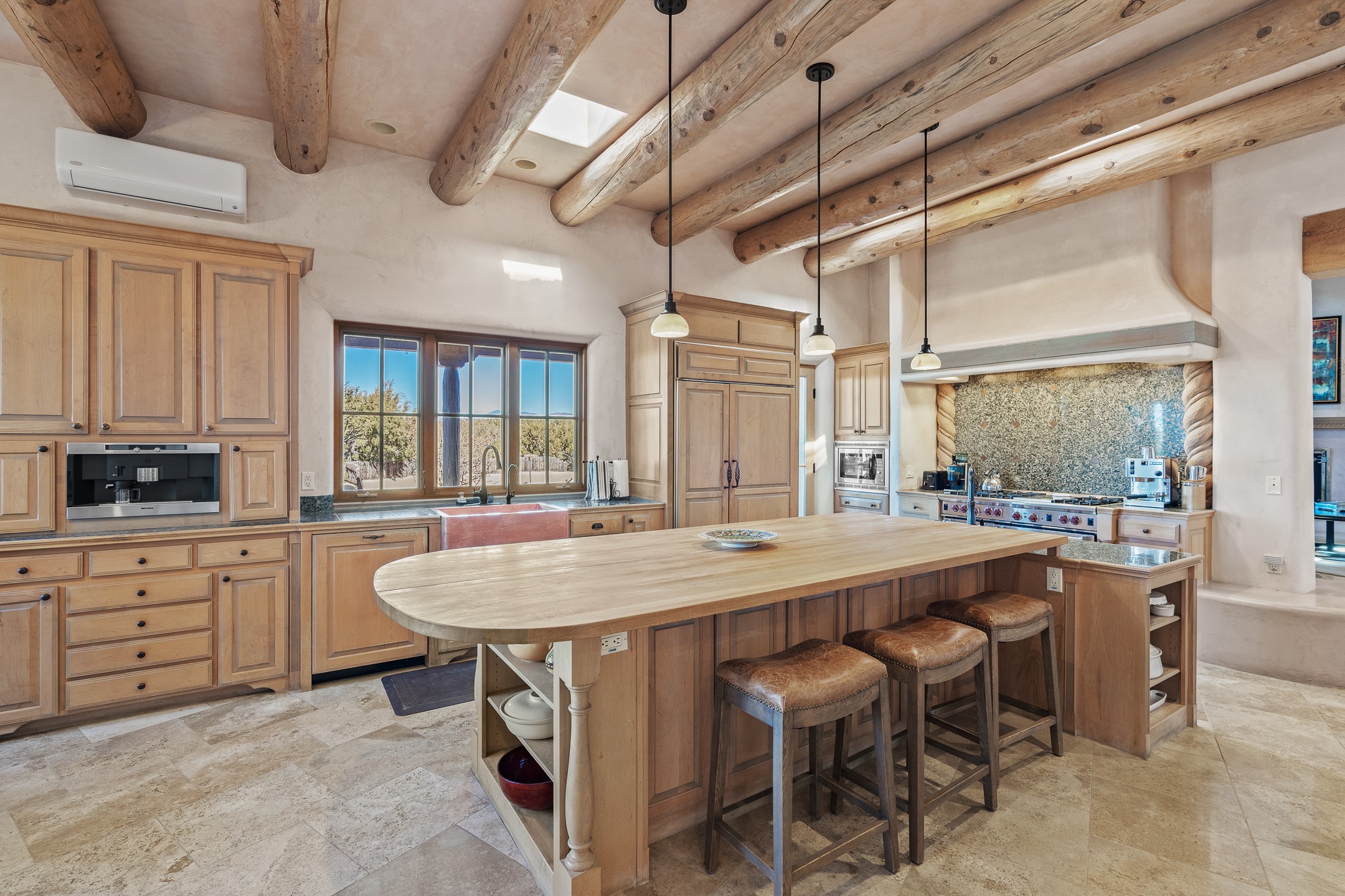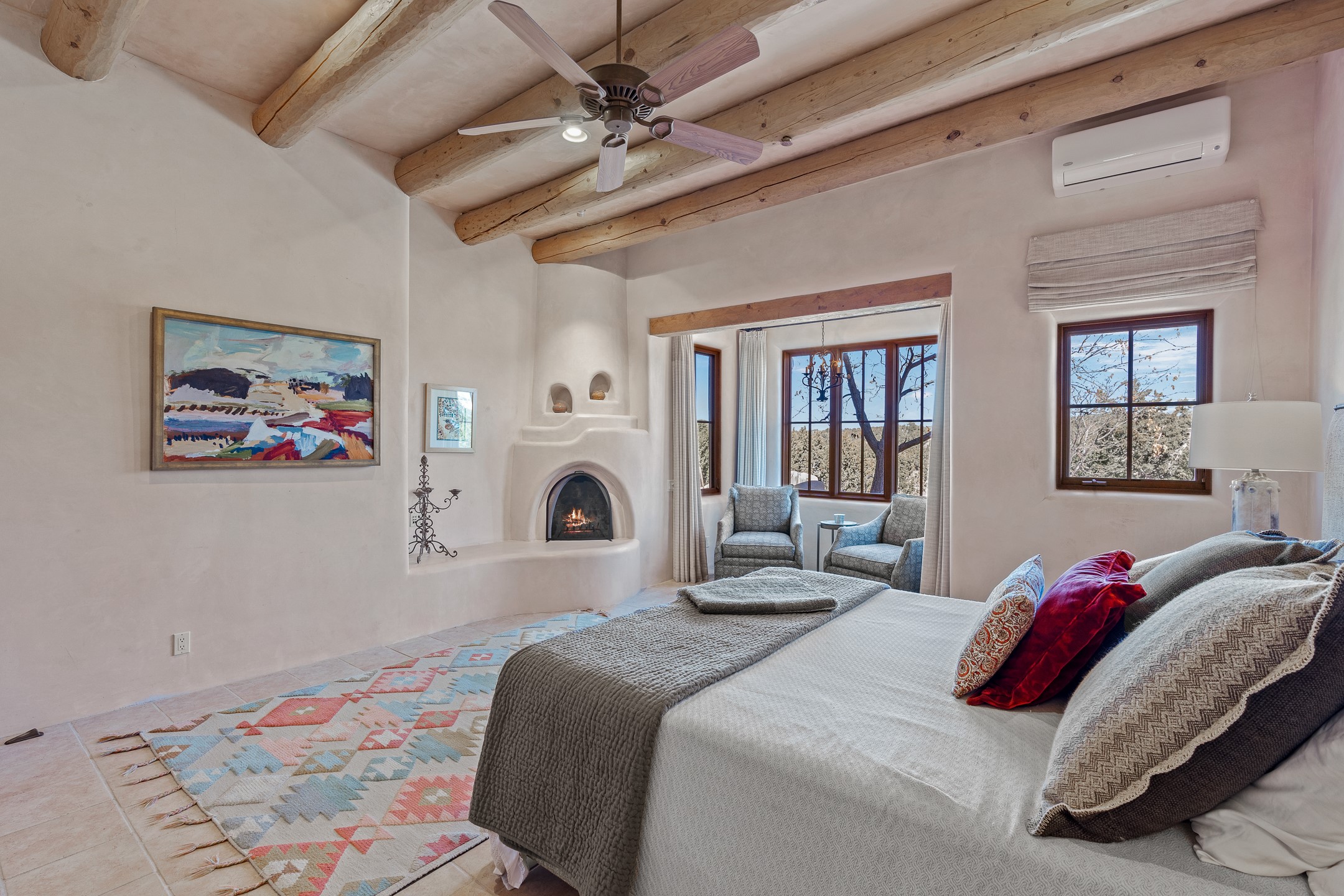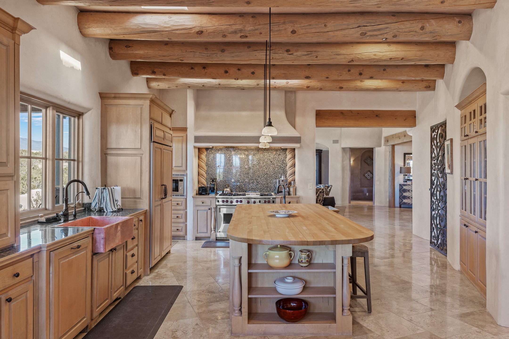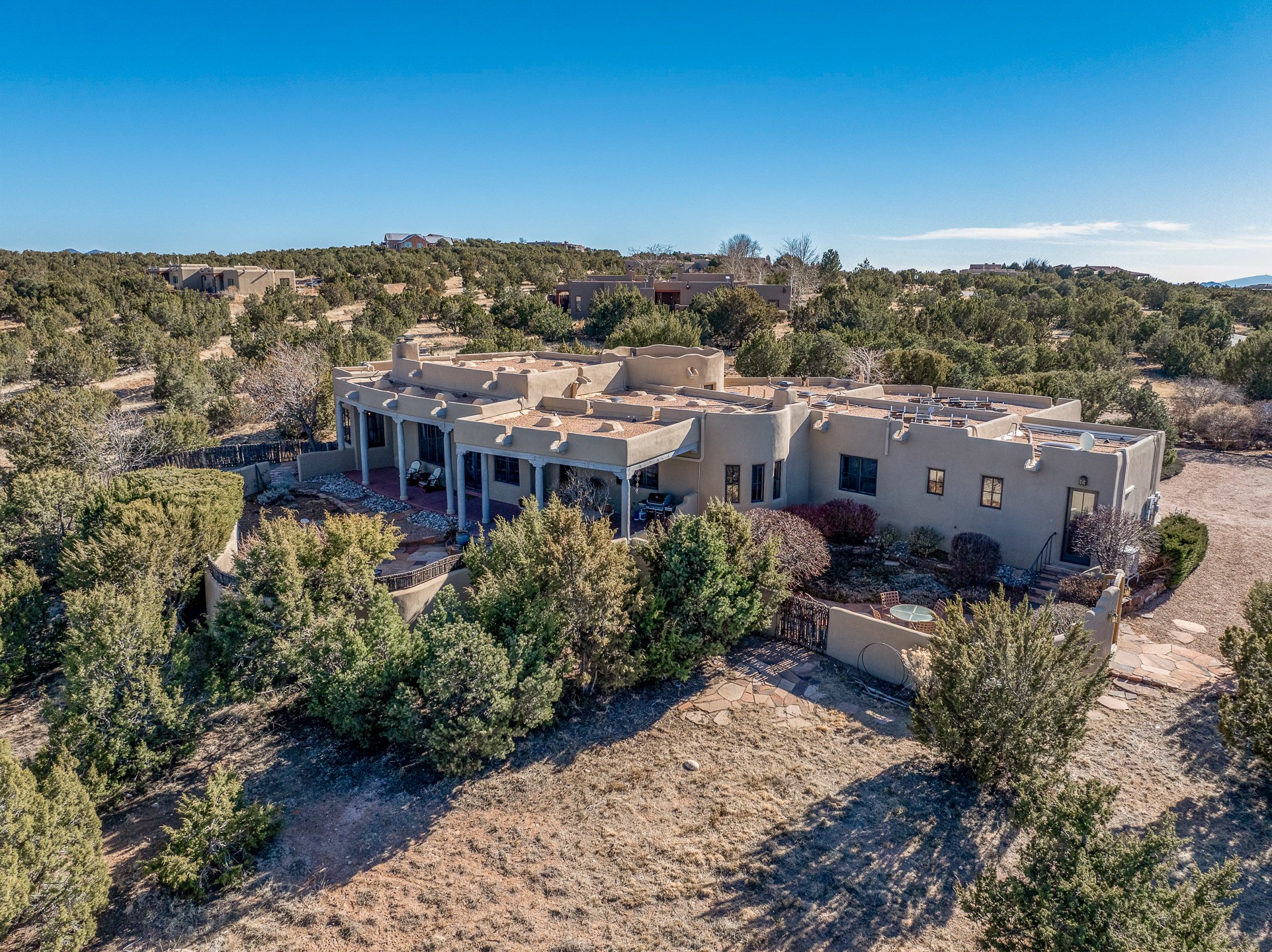 Sundance Estates Beauty! This immaculate single-level home with 3750 +/- sqft is situated on 2.5 acres, boasting views of the Sangre de Cristo and Jemez Mountains. The main house features 3 bedrooms, an office, 4 bathrooms, & an appx 700-square-foot 2 car garage and solar panels. An attached studio/guest quarters of 305 +/- sqft with plaster walls, a full bath, mini-split, separate entrance, & an enclosed yard provides flexibility for guests or creative space. Upon entering, you'll be captivated by the stunning living room with soaring ceiling, vigas, fireplace with doors that open to an expansive covered portal. The walled courtyard with flagstone walkways, multiple seating areas, and a hot tub, offers an ideal setting for entertaining or simply admiring the magnificent views. The cook's kitchen is a dream & features granite countertops, large butcher block island/breakfast bar, Sub-Zero refrigerator, Wolf 6-burner stove with grill, double ovens, trash compactor, two sinks (including one copper), abundant cabinet space, eat-in kitchen nook with a fireplace, built-in hutch, & a spacious walk-in pantry. On one side of the home, you'll find an office & the luxurious primary suite, complete with sitting area, vigas, fireplace, and a stunning ensuite bathroom. The bath includes granite countertops, a fireplace, power blinds, double vanities, a jetted tub, a separate shower, a mini split & two walk-in closets w/ built-ins. On the opposite side, there are 2 additional bedrooms, each w/ ensuite bathrooms, plus a convenient half-bath for guests. Wonderful amenities and features Include: Radiant in floor heating-7 mini splits (heating and cooling)-Plaster walls-Travertine tile floors-Wood doors-Wet bar-Nichos-Bancos-Ceiling fans-Skylights-Laundry room with sink, cabinets, counter space/closet-Formal dining room with wood beam ceiling-Built-ins. This exceptional property blends luxury, comfort, and functionality in a stunning setting. Please read agent only remarks.