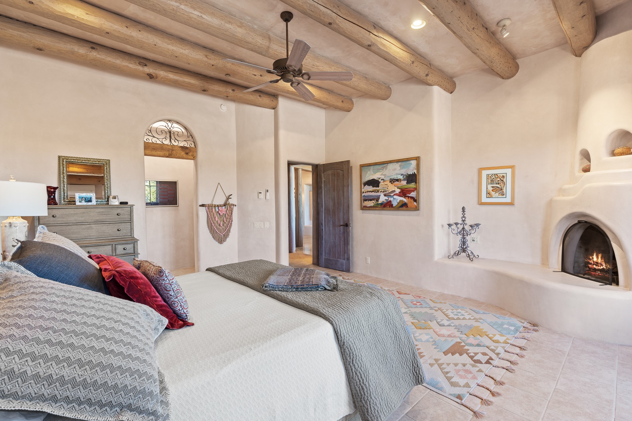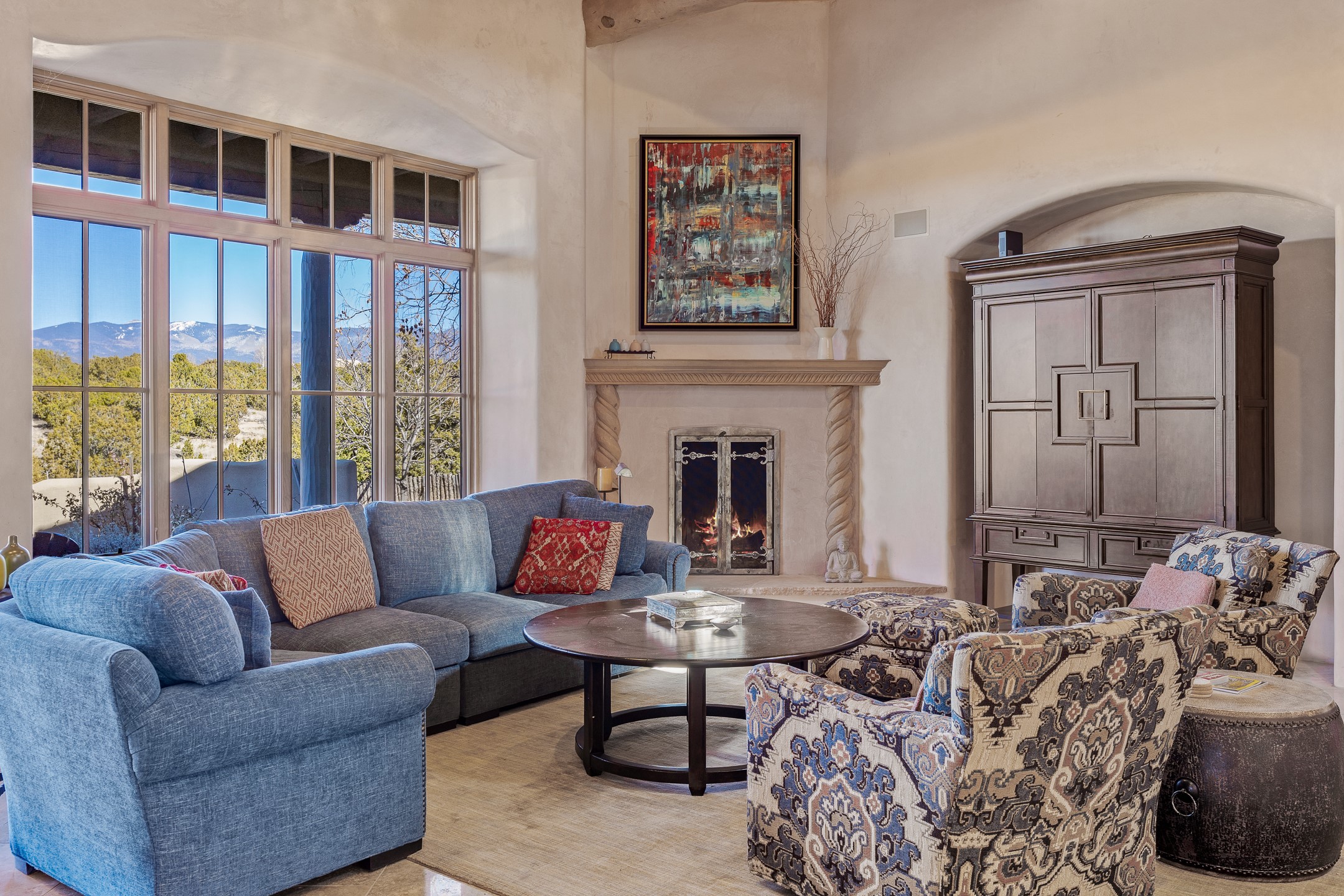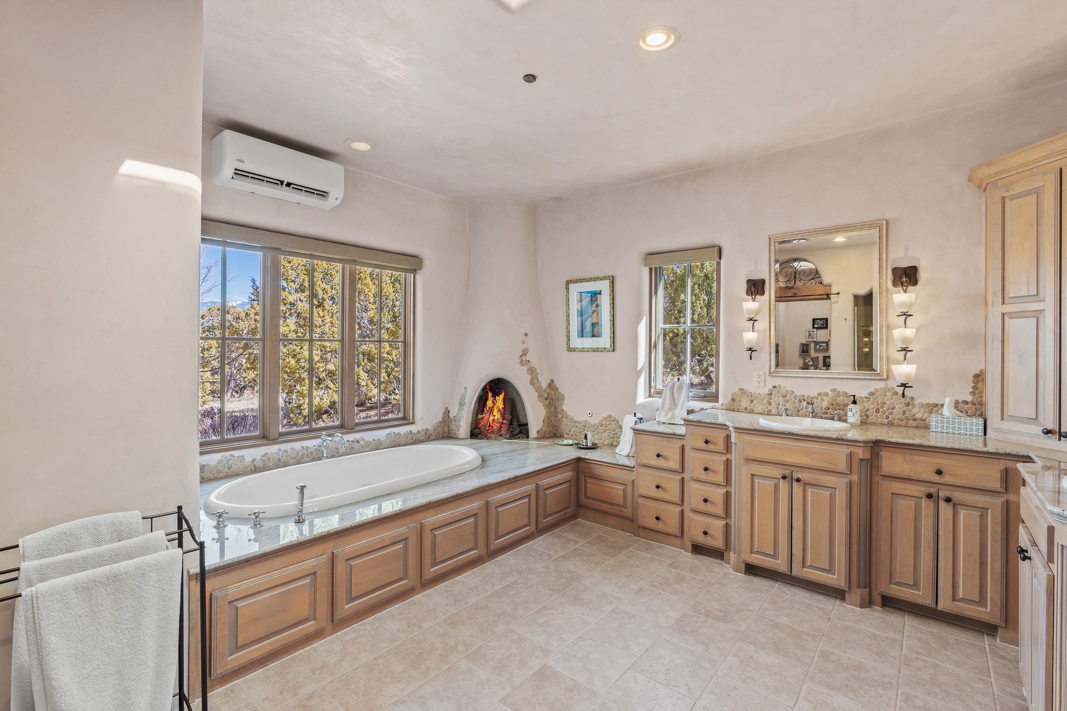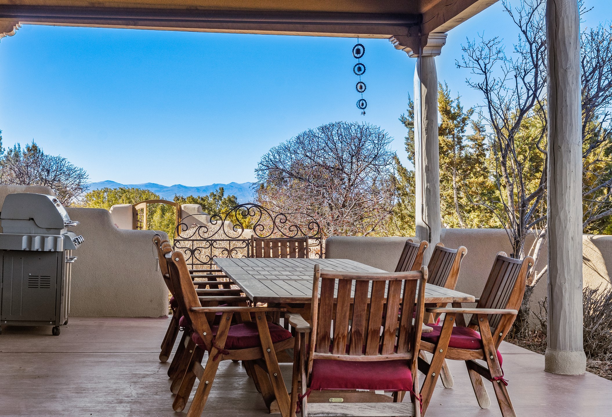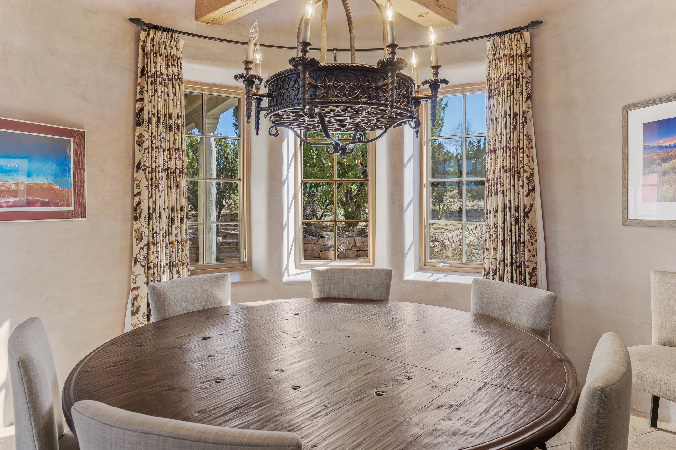 Sundance Estates Beauty! This immaculate single-level home with 3750 +/- sqft is situated on 2.5 acres, boasting views of the Sangre de Cristo and Jemez Mountains. The main house features 3 bedrooms, an office, 4 bathrooms, & an appx 700-square-foot 2 car garage and solar panels. An attached studio/guest quarters of 305 +/- sqft with plaster walls, a full bath, mini-split, separate entrance, & an enclosed yard provides flexibility for guests or creative space. Upon entering, you'll be captivated by the stunning living room with soaring ceiling, vigas, fireplace with doors that open to an expansive covered portal. The walled courtyard with flagstone walkways, multiple seating areas, and a hot tub, offers an ideal setting for entertaining or simply admiring the magnificent views. The cook's kitchen is a dream & features granite countertops, large butcher block island/breakfast bar, Sub-Zero refrigerator, Wolf 6-burner stove with grill, double ovens, trash compactor, two sinks (including one copper), abundant cabinet space, eat-in kitchen nook with a fireplace, built-in hutch, & a spacious walk-in pantry. On one side of the home, you'll find an office & the luxurious primary suite, complete with sitting area, vigas, fireplace, and a stunning ensuite bathroom. The bath includes granite countertops, a fireplace, power blinds, double vanities, a jetted tub, a separate shower, a mini split & two walk-in closets w/ built-ins. On the opposite side, there are 2 additional bedrooms, each w/ ensuite bathrooms, plus a convenient half-bath for guests. Wonderful amenities and features Include: Radiant in floor heating-7 mini splits (heating and cooling)-Plaster walls-Travertine tile floors-Wood doors-Wet bar-Nichos-Bancos-Ceiling fans-Skylights-Laundry room with sink, cabinets, counter space/closet-Formal dining room with wood beam ceiling-Built-ins. This exceptional property blends luxury, comfort, and functionality in a stunning setting. Please read agent only remarks.