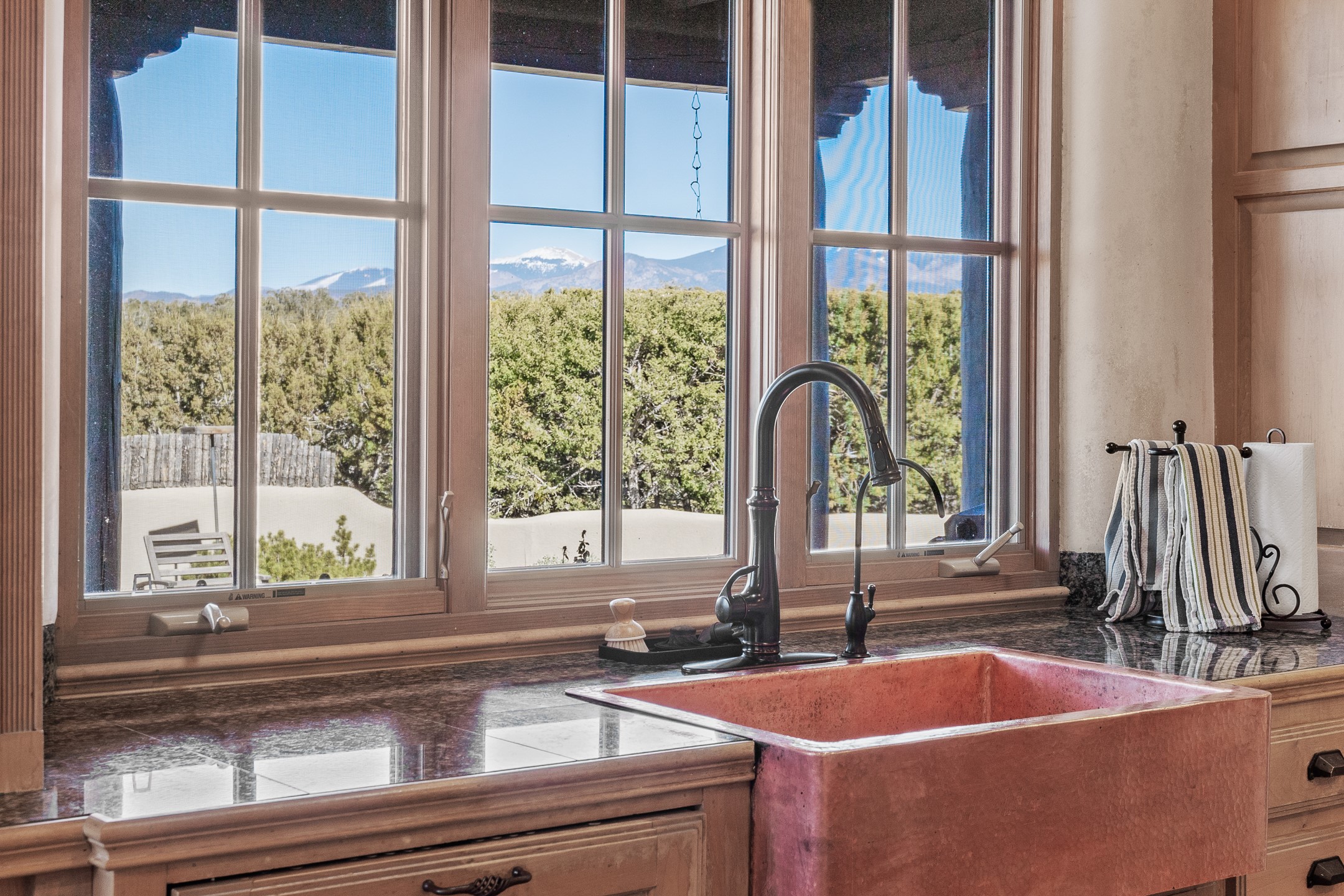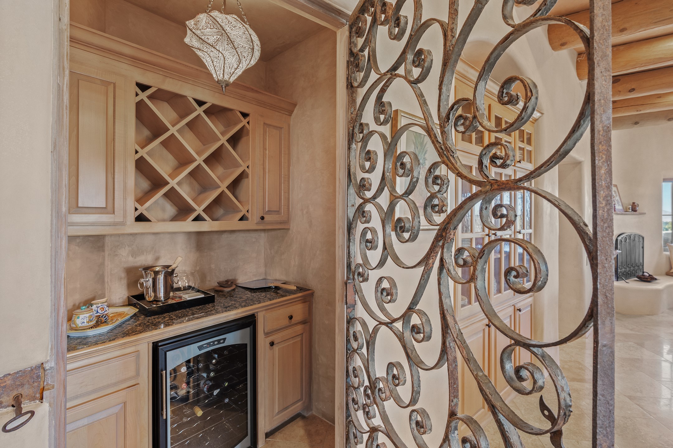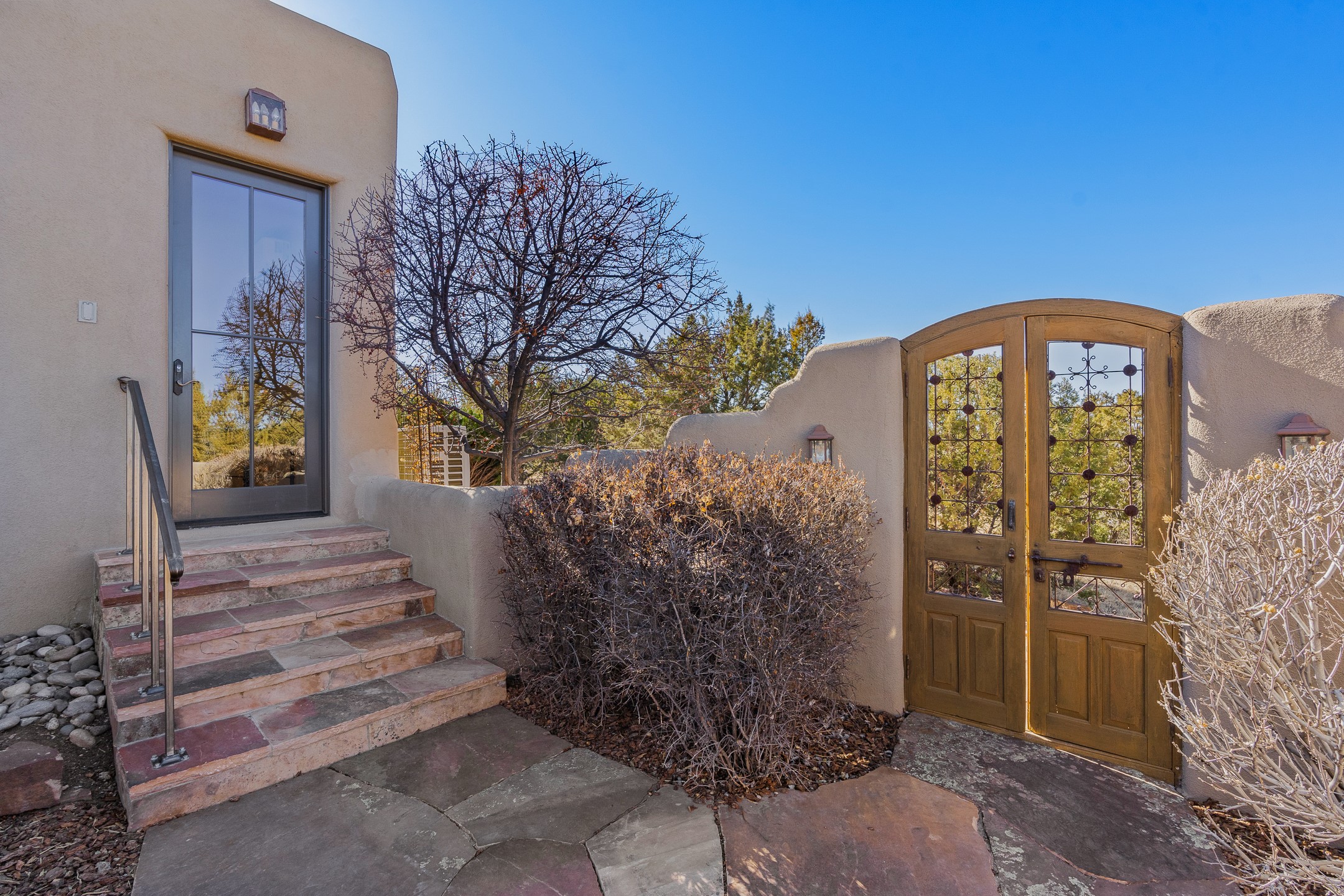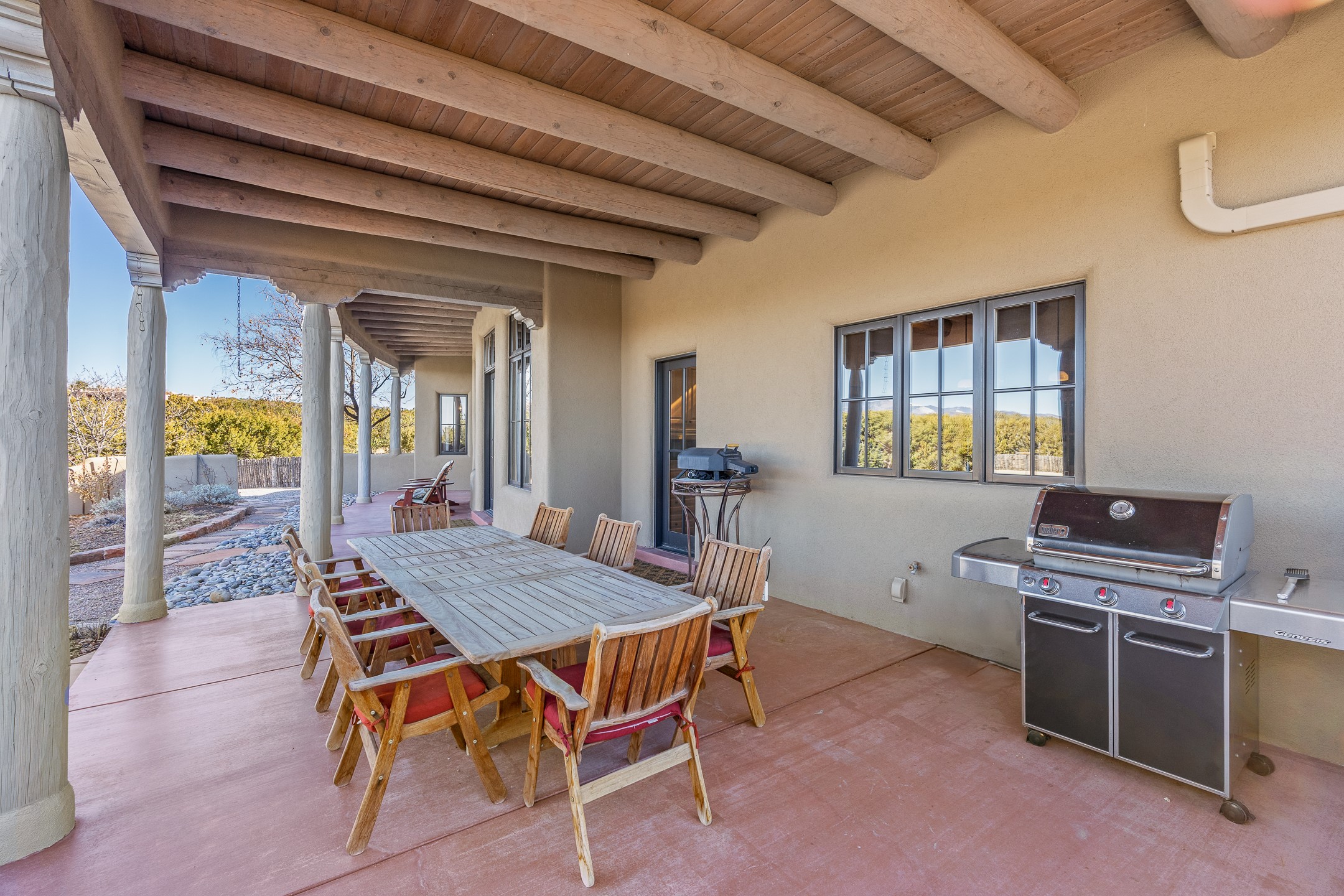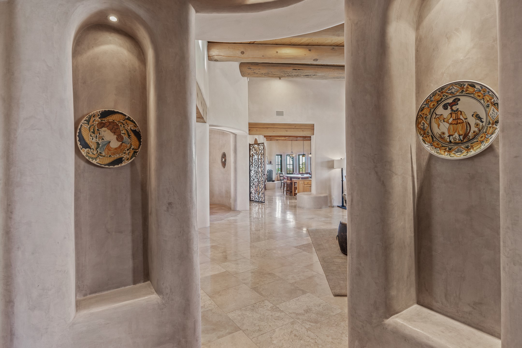 Sundance Estates Beauty! This immaculate single-level home with 3750 +/- sqft is situated on 2.5 acres, boasting views of the Sangre de Cristo and Jemez Mountains. The main house features 3 bedrooms, an office, 4 bathrooms, & an appx 700-square-foot 2 car garage and solar panels. An attached studio/guest quarters of 305 +/- sqft with plaster walls, a full bath, mini-split, separate entrance, & an enclosed yard provides flexibility for guests or creative space. Upon entering, you'll be captivated by the stunning living room with soaring ceiling, vigas, fireplace with doors that open to an expansive covered portal. The walled courtyard with flagstone walkways, multiple seating areas, and a hot tub, offers an ideal setting for entertaining or simply admiring the magnificent views. The cook's kitchen is a dream & features granite countertops, large butcher block island/breakfast bar, Sub-Zero refrigerator, Wolf 6-burner stove with grill, double ovens, trash compactor, two sinks (including one copper), abundant cabinet space, eat-in kitchen nook with a fireplace, built-in hutch, & a spacious walk-in pantry. On one side of the home, you'll find an office & the luxurious primary suite, complete with sitting area, vigas, fireplace, and a stunning ensuite bathroom. The bath includes granite countertops, a fireplace, power blinds, double vanities, a jetted tub, a separate shower, a mini split & two walk-in closets w/ built-ins. On the opposite side, there are 2 additional bedrooms, each w/ ensuite bathrooms, plus a convenient half-bath for guests. Wonderful amenities and features Include: Radiant in floor heating-7 mini splits (heating and cooling)-Plaster walls-Travertine tile floors-Wood doors-Wet bar-Nichos-Bancos-Ceiling fans-Skylights-Laundry room with sink, cabinets, counter space/closet-Formal dining room with wood beam ceiling-Built-ins. This exceptional property blends luxury, comfort, and functionality in a stunning setting. Please read agent only remarks.