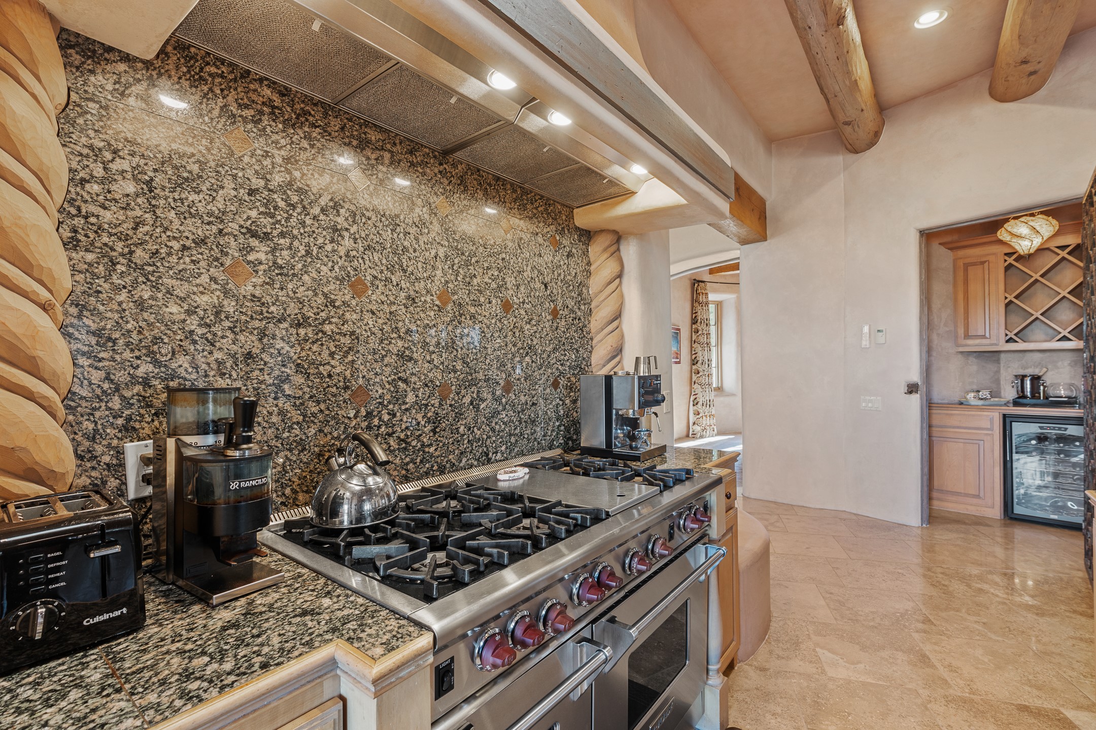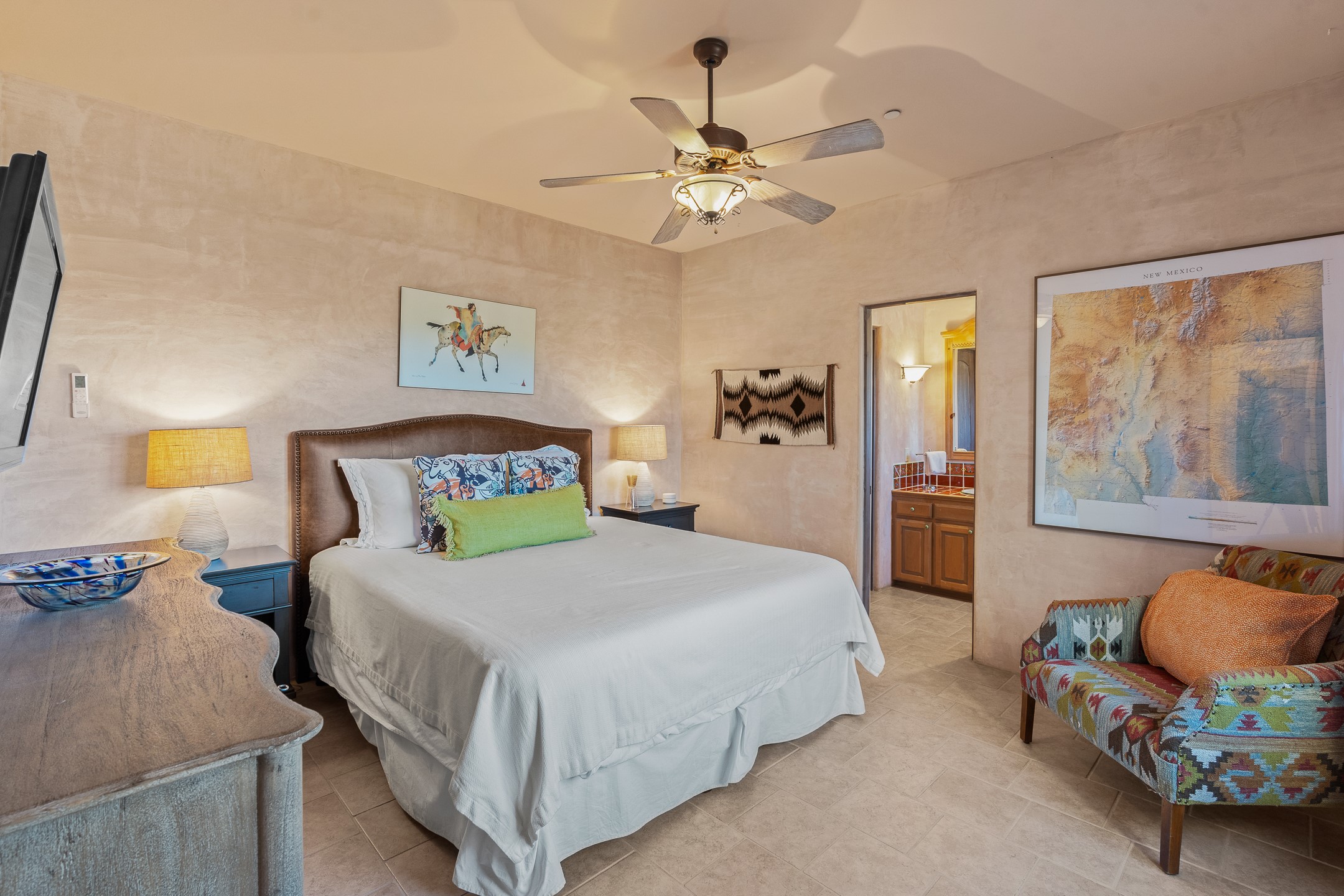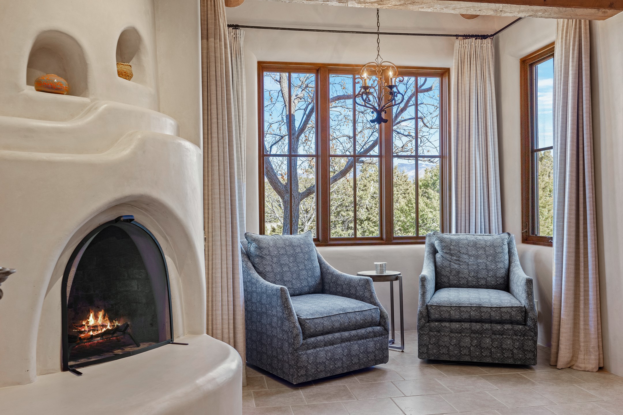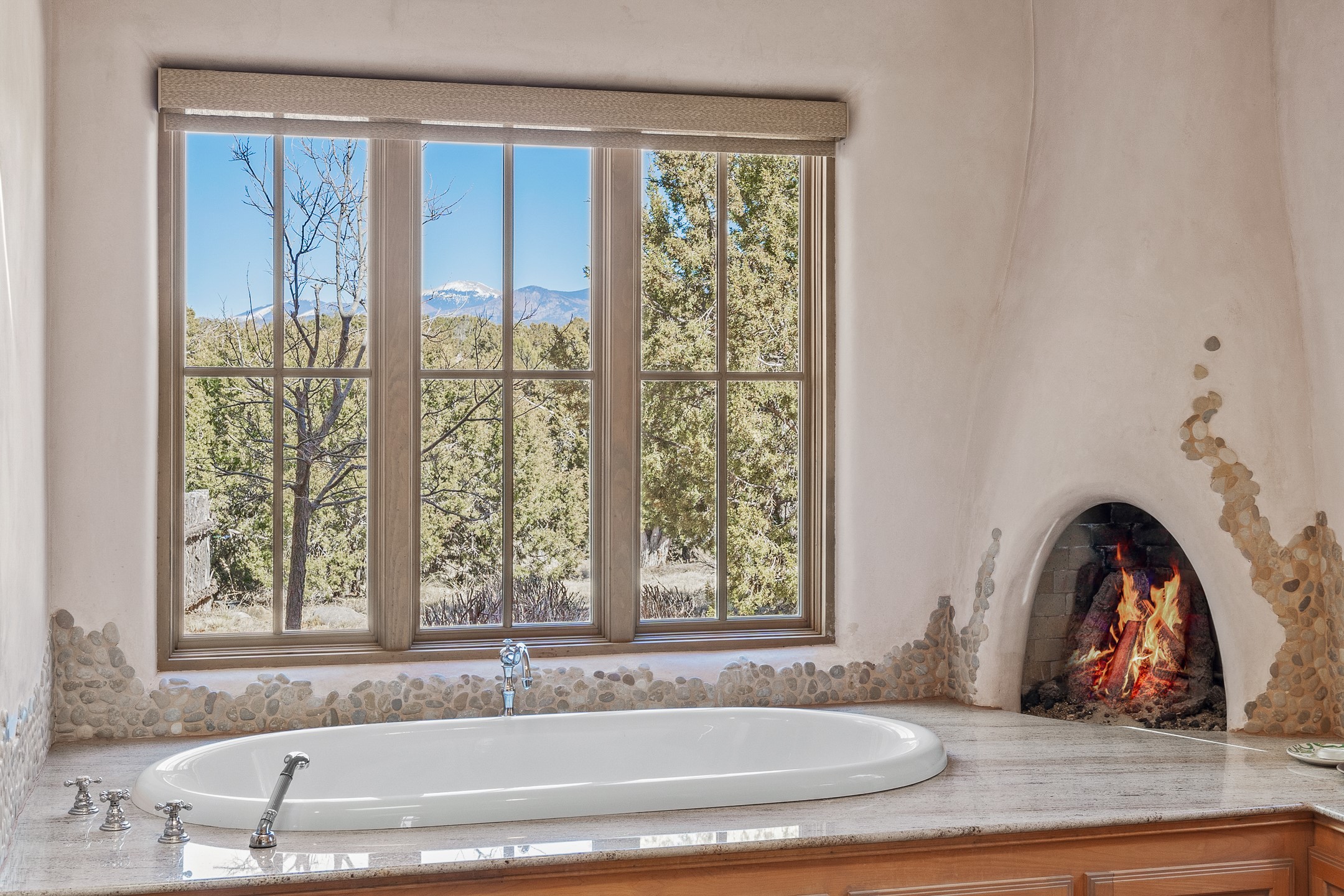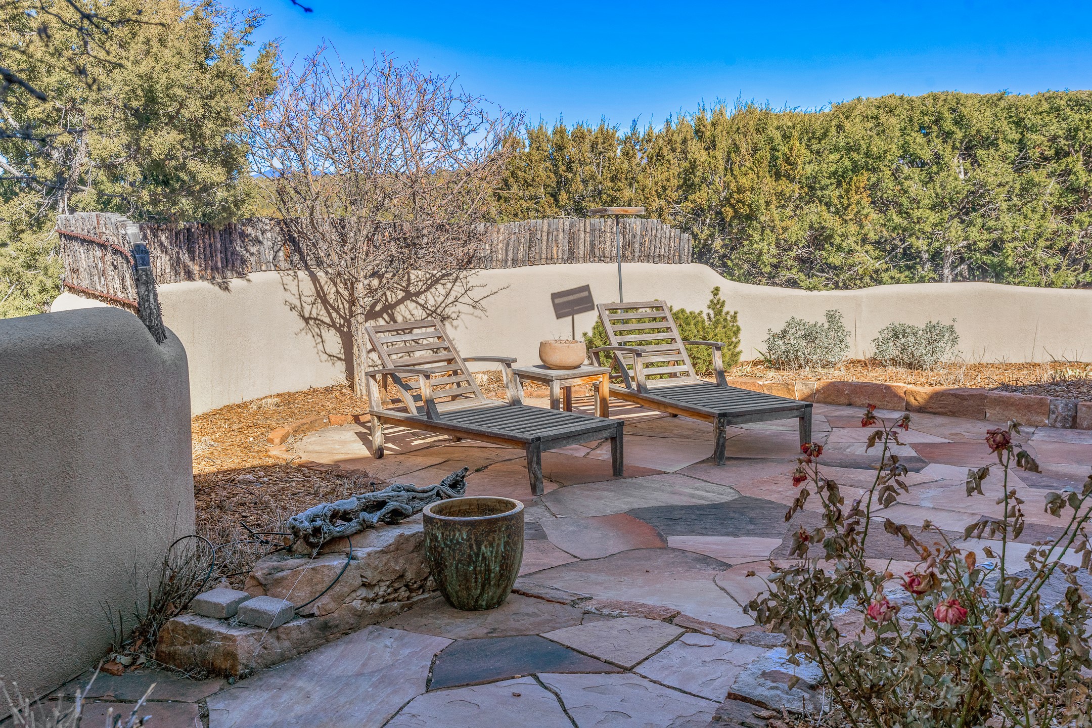 Sundance Estates Beauty! This immaculate single-level home with 3750 +/- sqft is situated on 2.5 acres, boasting views of the Sangre de Cristo and Jemez Mountains. The main house features 3 bedrooms, an office, 4 bathrooms, & an appx 700-square-foot 2 car garage and solar panels. An attached studio/guest quarters of 305 +/- sqft with plaster walls, a full bath, mini-split, separate entrance, & an enclosed yard provides flexibility for guests or creative space. Upon entering, you'll be captivated by the stunning living room with soaring ceiling, vigas, fireplace with doors that open to an expansive covered portal. The walled courtyard with flagstone walkways, multiple seating areas, and a hot tub, offers an ideal setting for entertaining or simply admiring the magnificent views. The cook's kitchen is a dream & features granite countertops, large butcher block island/breakfast bar, Sub-Zero refrigerator, Wolf 6-burner stove with grill, double ovens, trash compactor, two sinks (including one copper), abundant cabinet space, eat-in kitchen nook with a fireplace, built-in hutch, & a spacious walk-in pantry. On one side of the home, you'll find an office & the luxurious primary suite, complete with sitting area, vigas, fireplace, and a stunning ensuite bathroom. The bath includes granite countertops, a fireplace, power blinds, double vanities, a jetted tub, a separate shower, a mini split & two walk-in closets w/ built-ins. On the opposite side, there are 2 additional bedrooms, each w/ ensuite bathrooms, plus a convenient half-bath for guests. Wonderful amenities and features Include: Radiant in floor heating-7 mini splits (heating and cooling)-Plaster walls-Travertine tile floors-Wood doors-Wet bar-Nichos-Bancos-Ceiling fans-Skylights-Laundry room with sink, cabinets, counter space/closet-Formal dining room with wood beam ceiling-Built-ins. This exceptional property blends luxury, comfort, and functionality in a stunning setting. Please read agent only remarks.