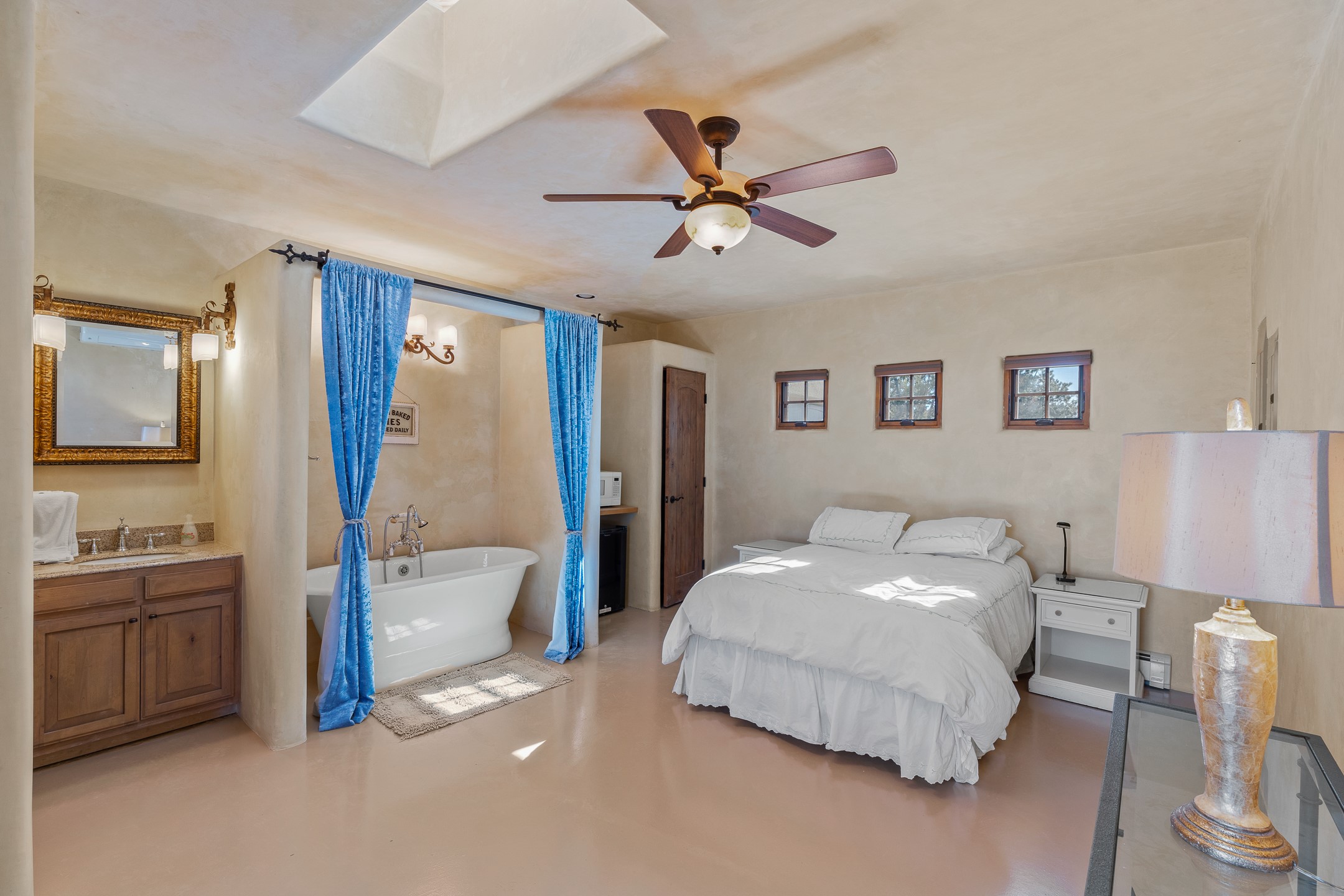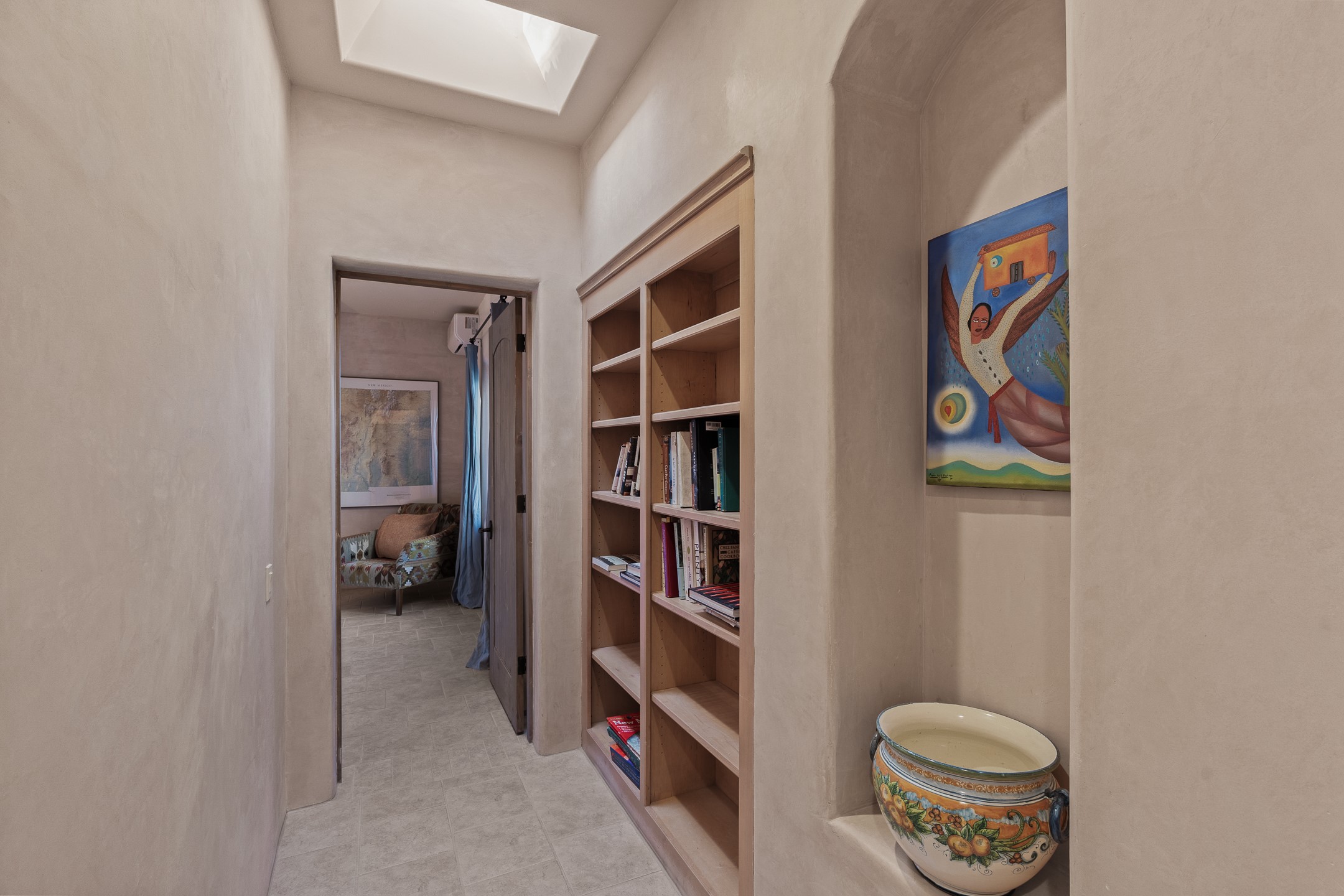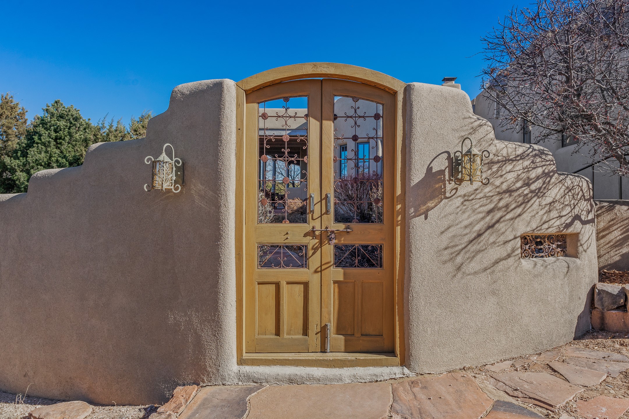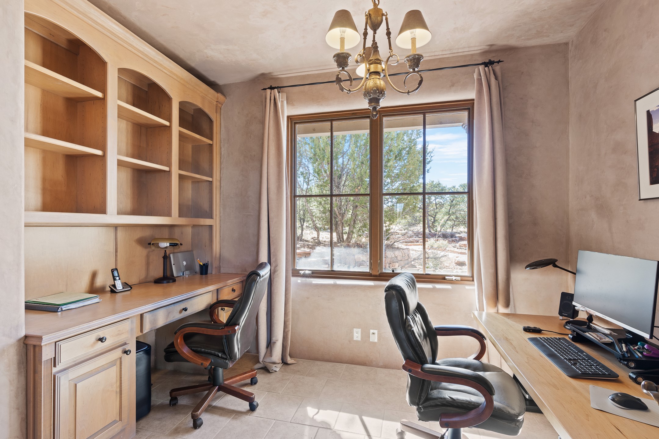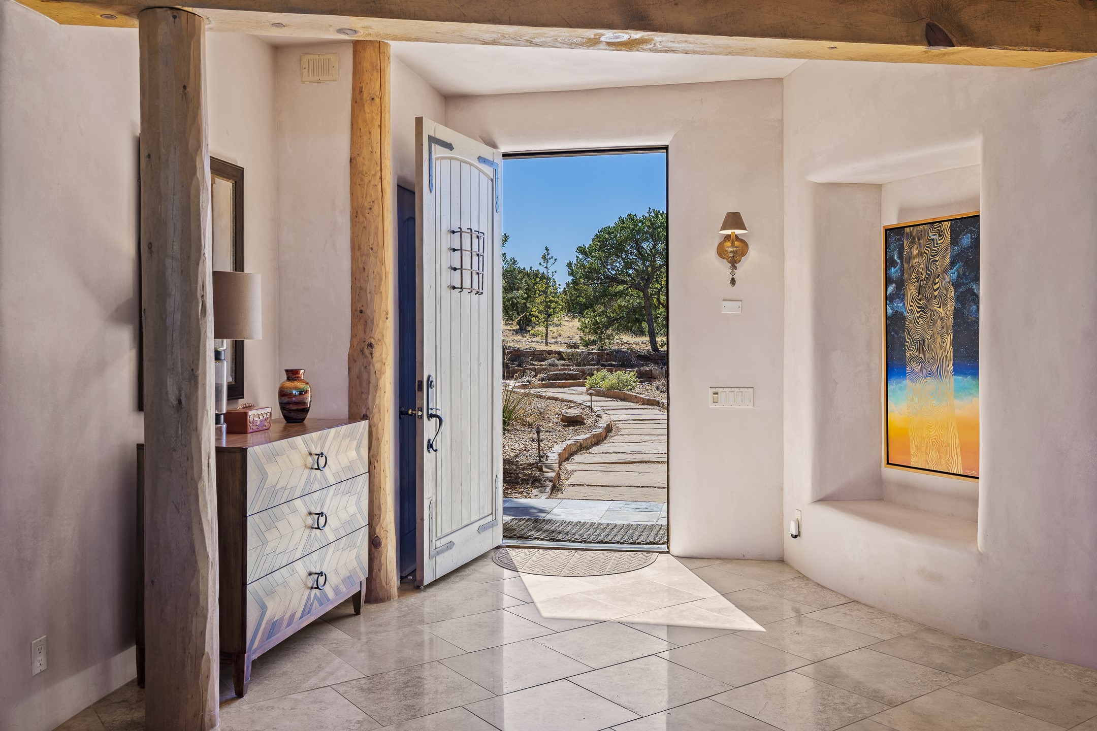 Sundance Estates Beauty! This immaculate single-level home with 3750 +/- sqft is situated on 2.5 acres, boasting views of the Sangre de Cristo and Jemez Mountains. The main house features 3 bedrooms, an office, 4 bathrooms, & an appx 700-square-foot 2 car garage and solar panels. An attached studio/guest quarters of 305 +/- sqft with plaster walls, a full bath, mini-split, separate entrance, & an enclosed yard provides flexibility for guests or creative space. Upon entering, you'll be captivated by the stunning living room with soaring ceiling, vigas, fireplace with doors that open to an expansive covered portal. The walled courtyard with flagstone walkways, multiple seating areas, and a hot tub, offers an ideal setting for entertaining or simply admiring the magnificent views. The cook's kitchen is a dream & features granite countertops, large butcher block island/breakfast bar, Sub-Zero refrigerator, Wolf 6-burner stove with grill, double ovens, trash compactor, two sinks (including one copper), abundant cabinet space, eat-in kitchen nook with a fireplace, built-in hutch, & a spacious walk-in pantry. On one side of the home, you'll find an office & the luxurious primary suite, complete with sitting area, vigas, fireplace, and a stunning ensuite bathroom. The bath includes granite countertops, a fireplace, power blinds, double vanities, a jetted tub, a separate shower, a mini split & two walk-in closets w/ built-ins. On the opposite side, there are 2 additional bedrooms, each w/ ensuite bathrooms, plus a convenient half-bath for guests. Wonderful amenities and features Include: Radiant in floor heating-7 mini splits (heating and cooling)-Plaster walls-Travertine tile floors-Wood doors-Wet bar-Nichos-Bancos-Ceiling fans-Skylights-Laundry room with sink, cabinets, counter space/closet-Formal dining room with wood beam ceiling-Built-ins. This exceptional property blends luxury, comfort, and functionality in a stunning setting. Please read agent only remarks.