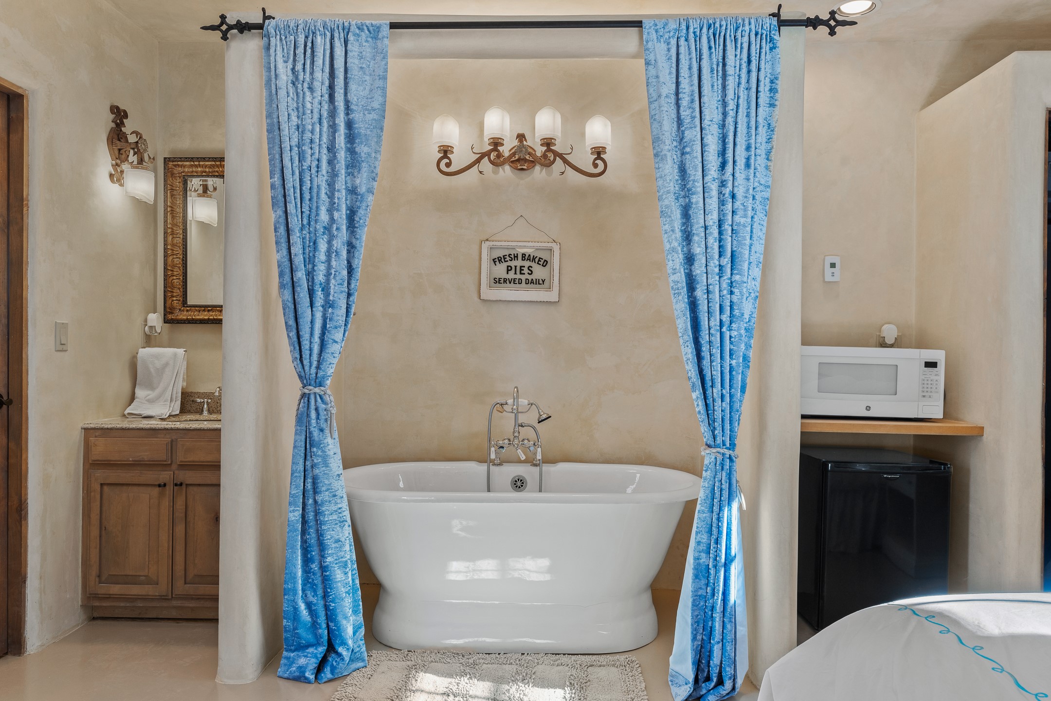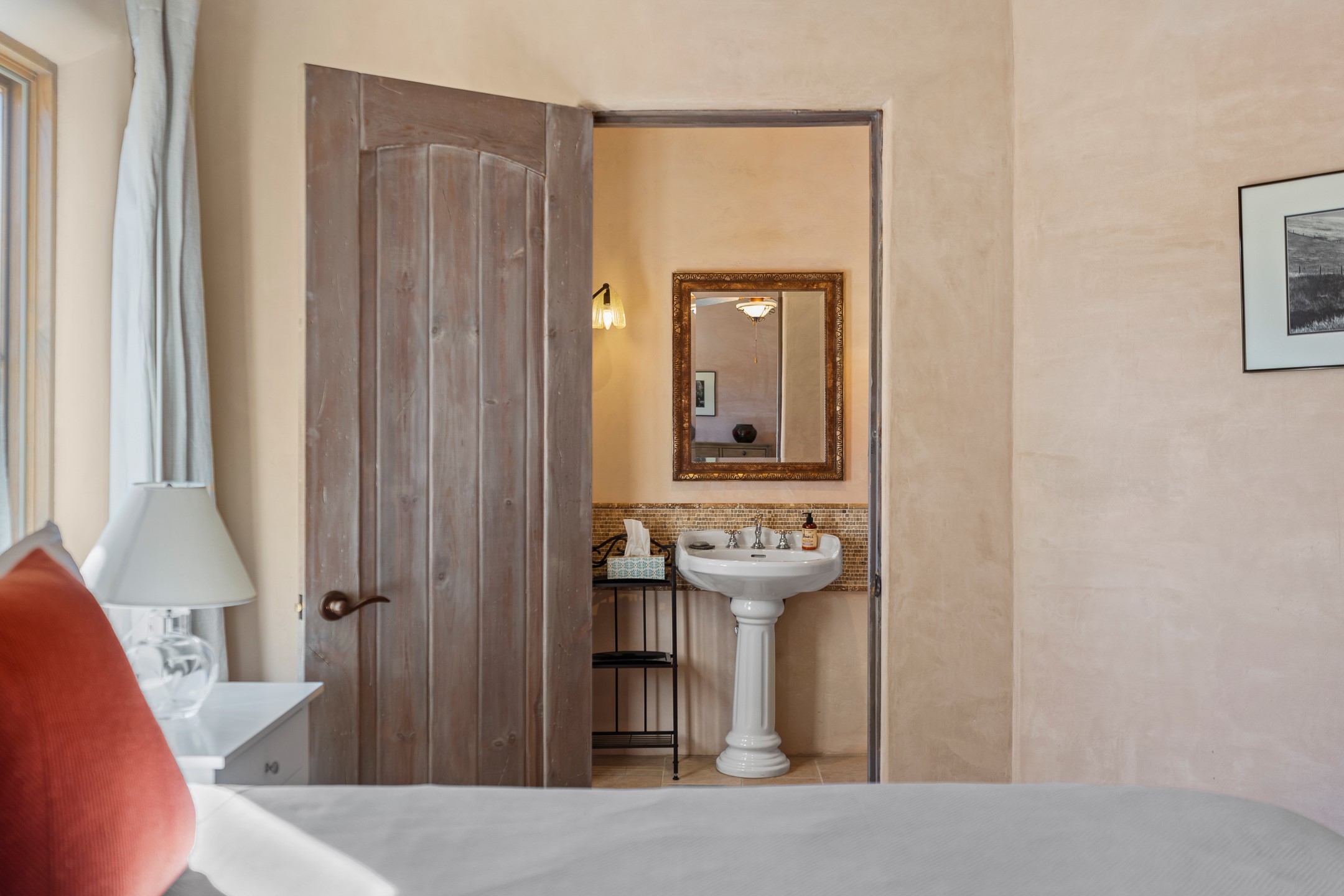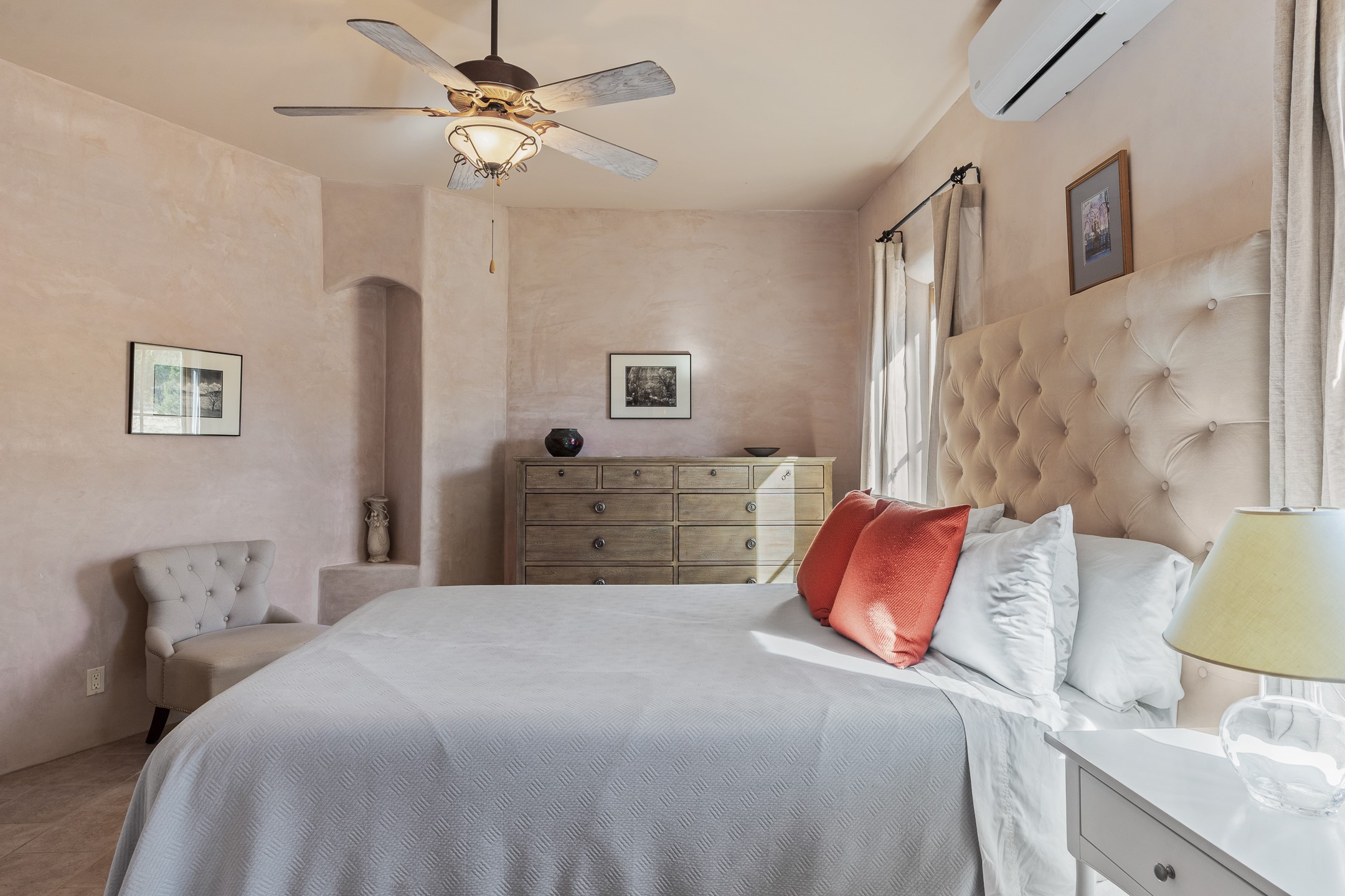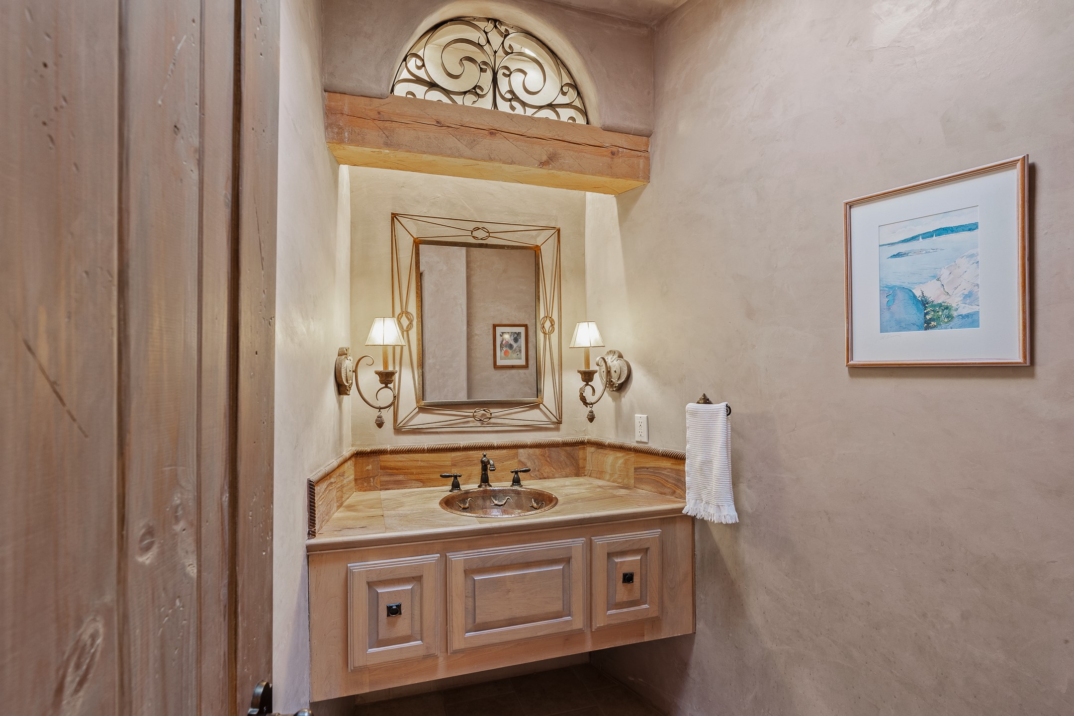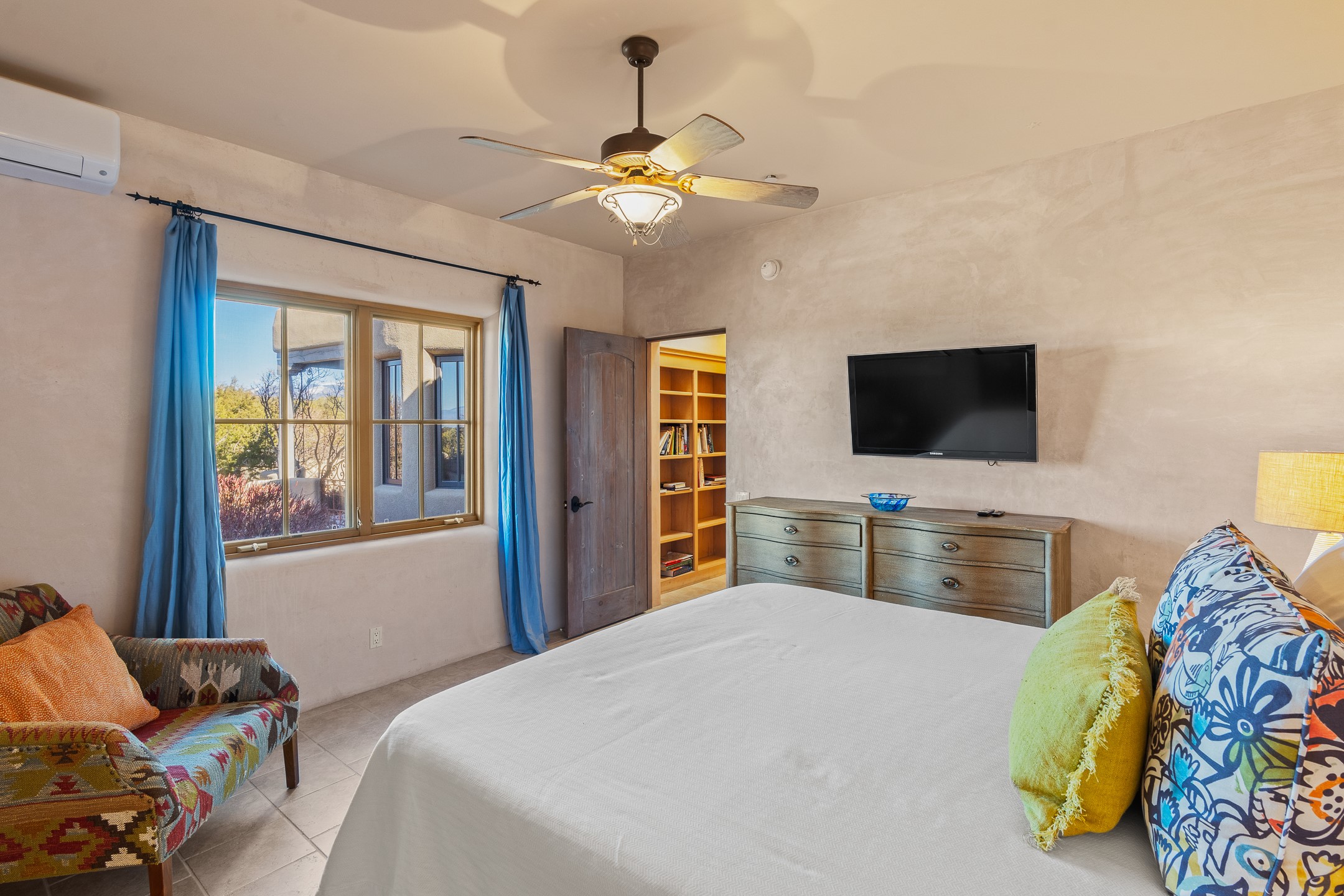 Sundance Estates Beauty! This immaculate single-level home with 3750 +/- sqft is situated on 2.5 acres, boasting views of the Sangre de Cristo and Jemez Mountains. The main house features 3 bedrooms, an office, 4 bathrooms, & an appx 700-square-foot 2 car garage and solar panels. An attached studio/guest quarters of 305 +/- sqft with plaster walls, a full bath, mini-split, separate entrance, & an enclosed yard provides flexibility for guests or creative space. Upon entering, you'll be captivated by the stunning living room with soaring ceiling, vigas, fireplace with doors that open to an expansive covered portal. The walled courtyard with flagstone walkways, multiple seating areas, and a hot tub, offers an ideal setting for entertaining or simply admiring the magnificent views. The cook's kitchen is a dream & features granite countertops, large butcher block island/breakfast bar, Sub-Zero refrigerator, Wolf 6-burner stove with grill, double ovens, trash compactor, two sinks (including one copper), abundant cabinet space, eat-in kitchen nook with a fireplace, built-in hutch, & a spacious walk-in pantry. On one side of the home, you'll find an office & the luxurious primary suite, complete with sitting area, vigas, fireplace, and a stunning ensuite bathroom. The bath includes granite countertops, a fireplace, power blinds, double vanities, a jetted tub, a separate shower, a mini split & two walk-in closets w/ built-ins. On the opposite side, there are 2 additional bedrooms, each w/ ensuite bathrooms, plus a convenient half-bath for guests. Wonderful amenities and features Include: Radiant in floor heating-7 mini splits (heating and cooling)-Plaster walls-Travertine tile floors-Wood doors-Wet bar-Nichos-Bancos-Ceiling fans-Skylights-Laundry room with sink, cabinets, counter space/closet-Formal dining room with wood beam ceiling-Built-ins. This exceptional property blends luxury, comfort, and functionality in a stunning setting. Please read agent only remarks.