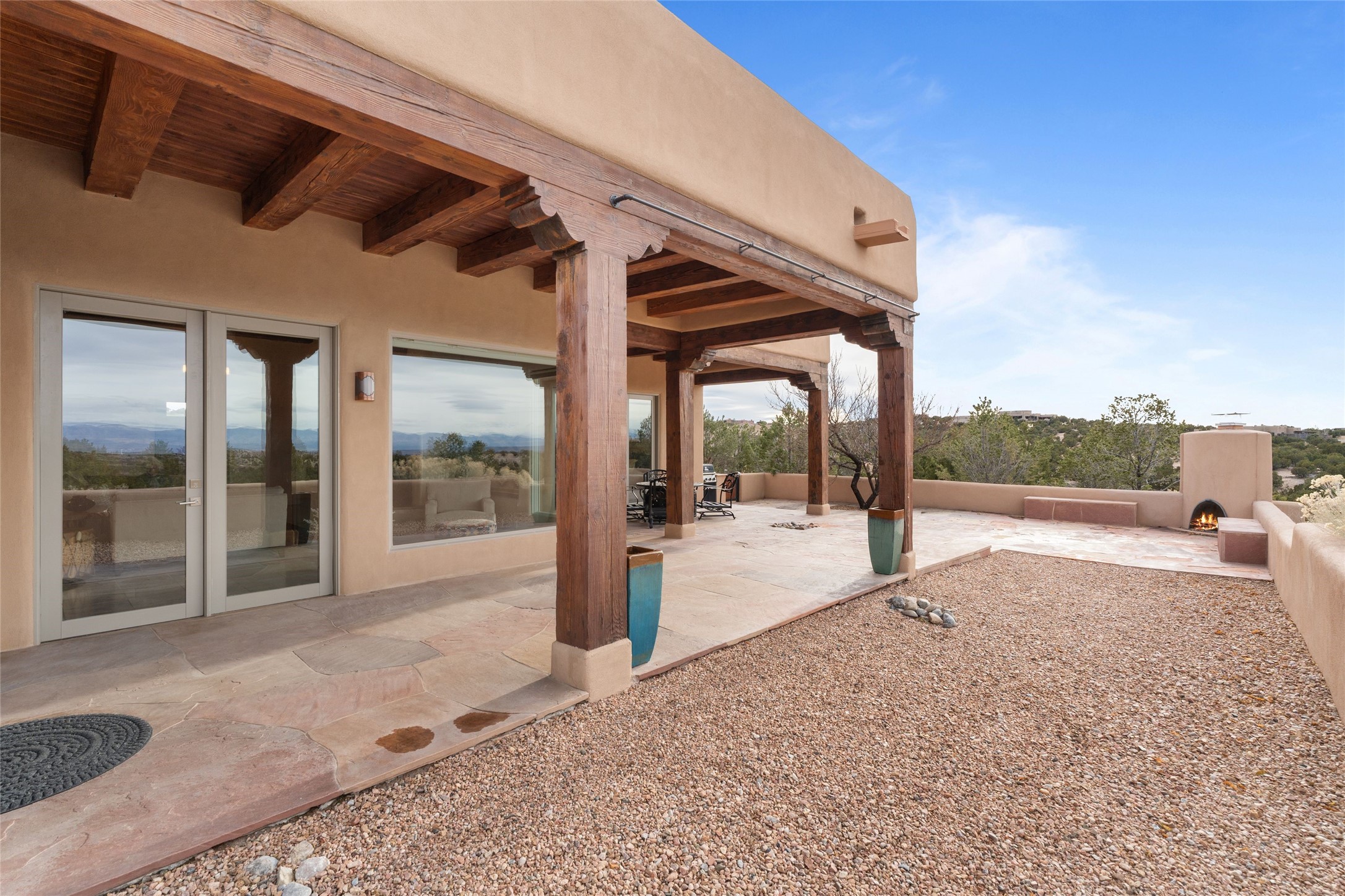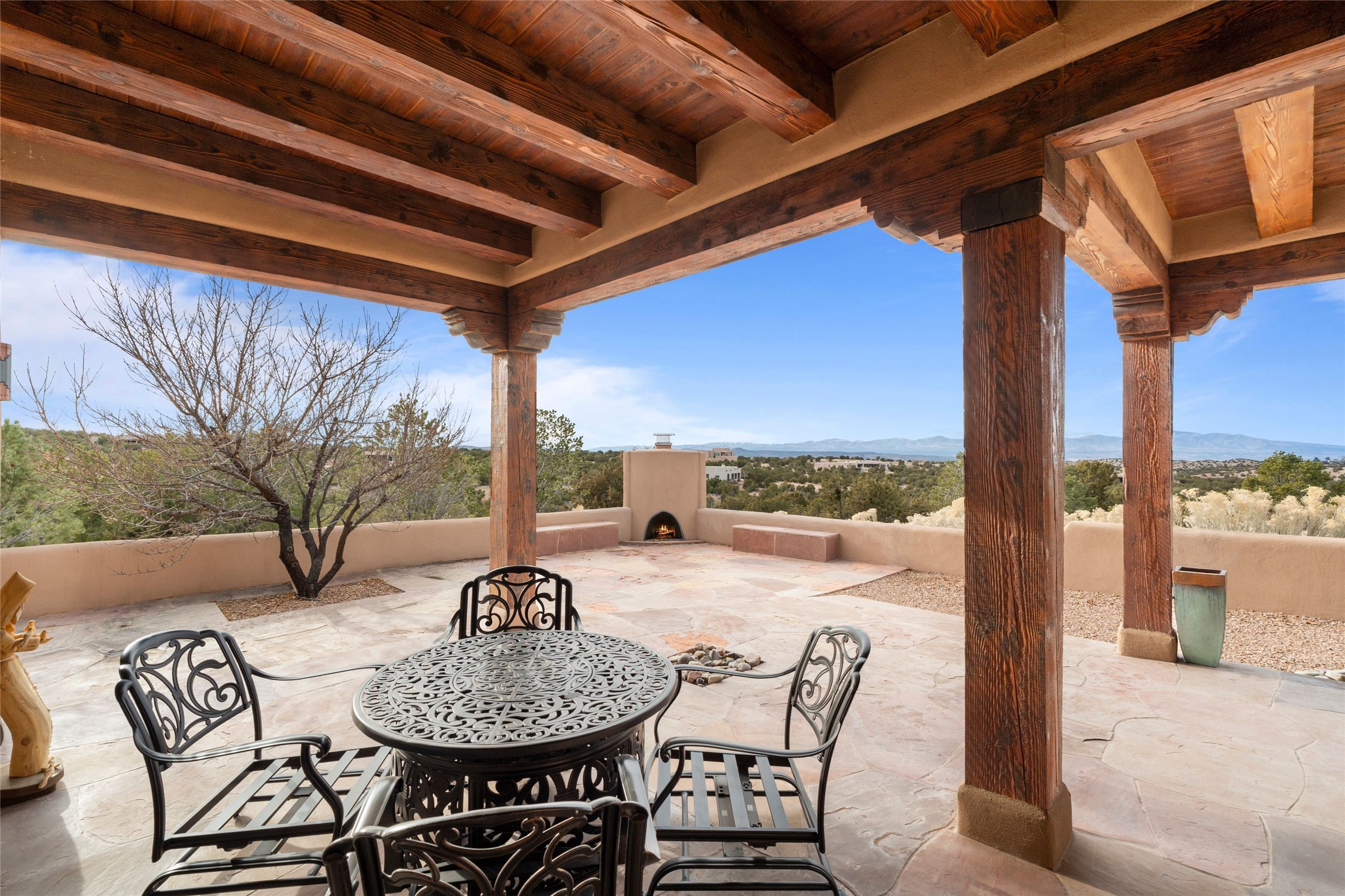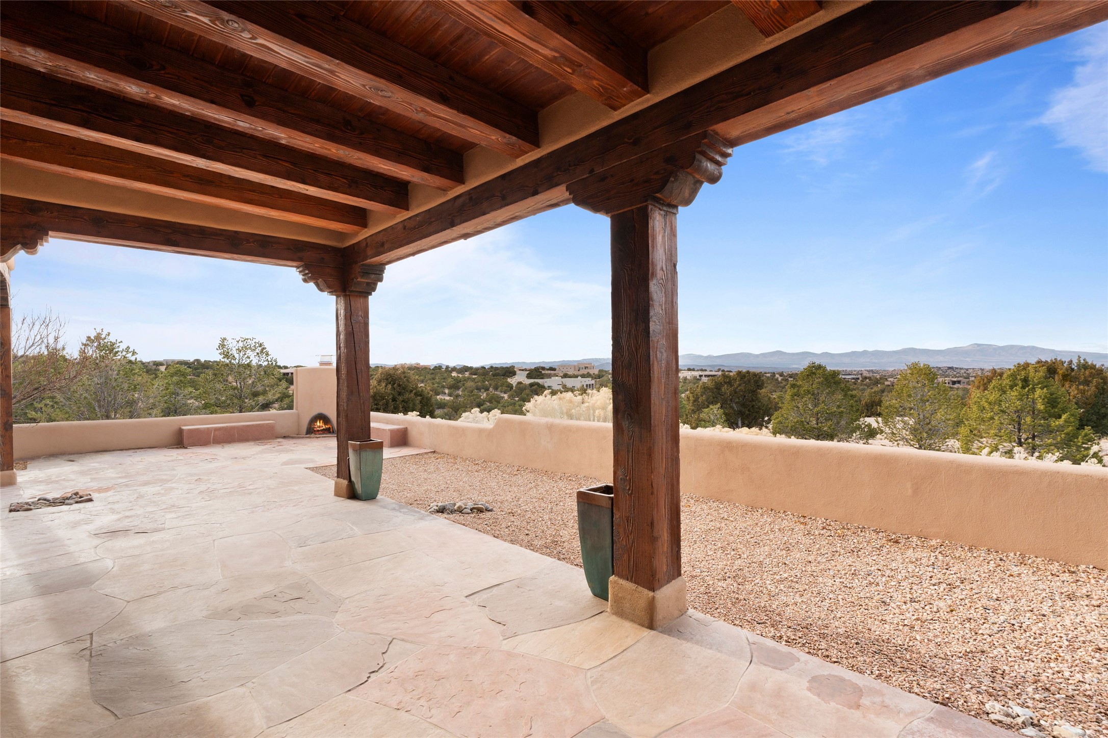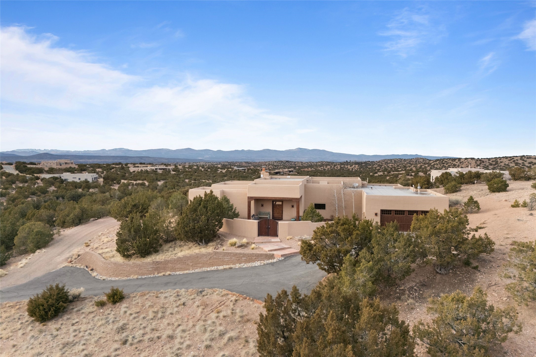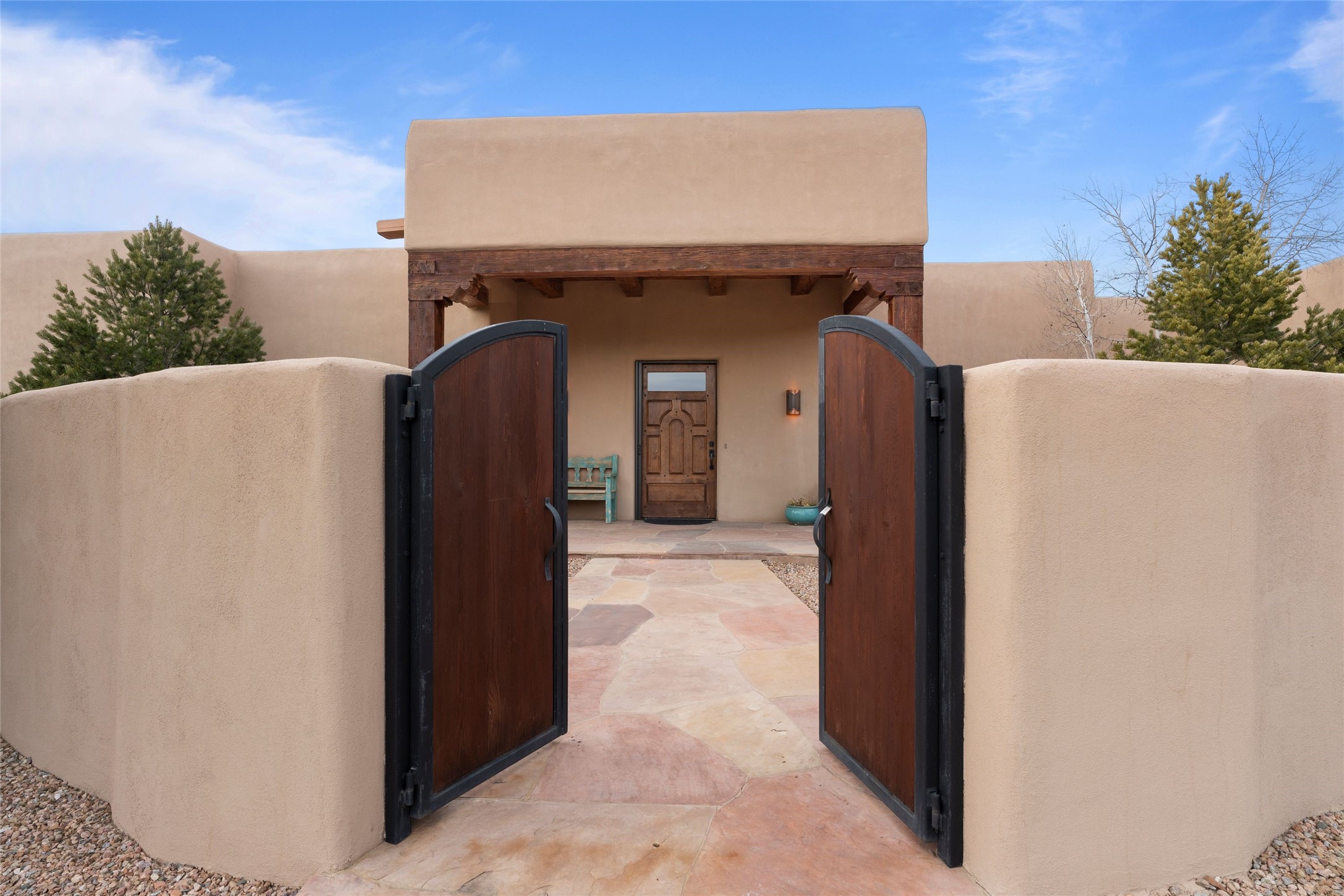 Striking home single-level 3-bedroom 3 bath home on 2.5+ acres with panoramic mountain views that create a breathtaking backdrop for your everyday living. Upon entering, you're greeted by soaring raised ceilings embellished with beautiful wood beams. The diamond finish plaster walls and custom wood doors enhance the sophisticated aesthetic, while the travertine floors provide a seamless blend of elegance and practicality. The living area serves as an inviting space with an elegant kiva fireplace as its centerpiece, perfect for cozy gatherings and relaxation. Culinary enthusiasts will appreciate the chef's kitchen, which is equipped with two Bosch ovens, a Bosch cooktop, and a commercial-grade Kitchen Aid fridge. The spacious island, complete with a wet bar, offers ample room for meal preparation and entertaining. The primary bedroom spotlights its own fireplace and direct access to an outdoor patio, creating a personal retreat. The ensuite bath is designed for relaxation, featuring a large soaking tub and a walk-in shower. Step outside to discover a deep portal with a fireplace and a Baron King grill, making it an ideal setting for outdoor dining and entertaining. The expansive covered deck, complete with an outdoor kiva fireplace, invites you to enjoy the beauty of New Mexico's landscapes in comfort and style. Water feature with a celebrated artist Doug Hyde life-size limestone sculpture conveys. Peaceful setting minutes from downtown Santa Fe with its vibrant art and culinary scene and year-round festivals.