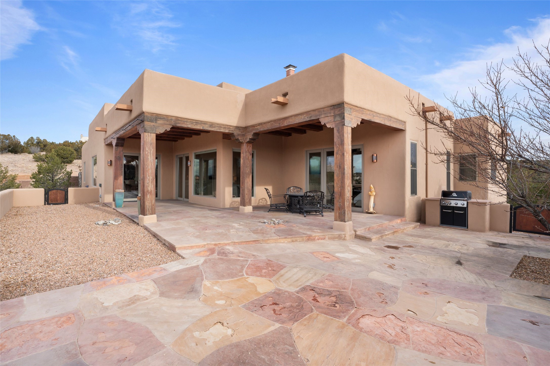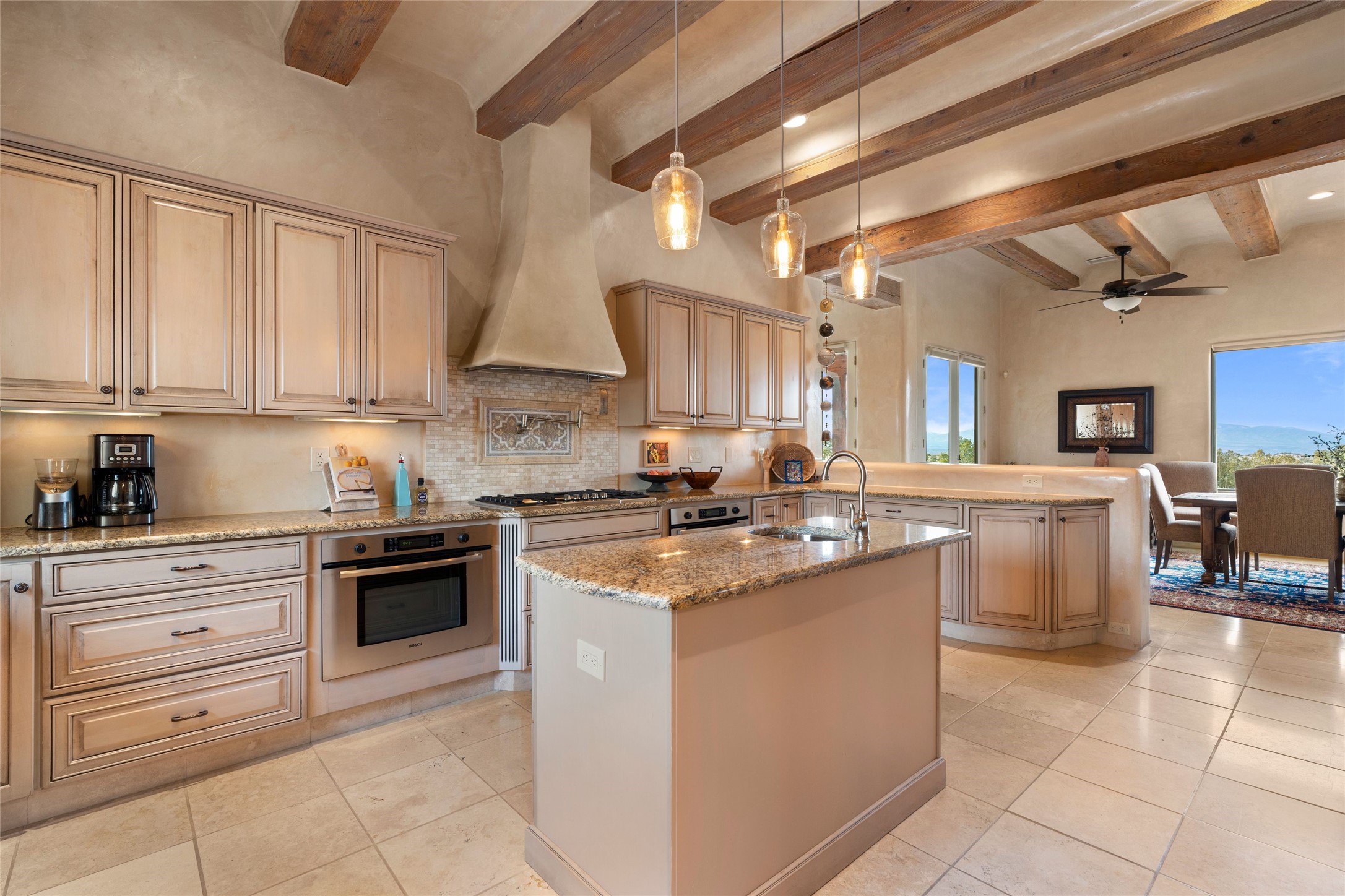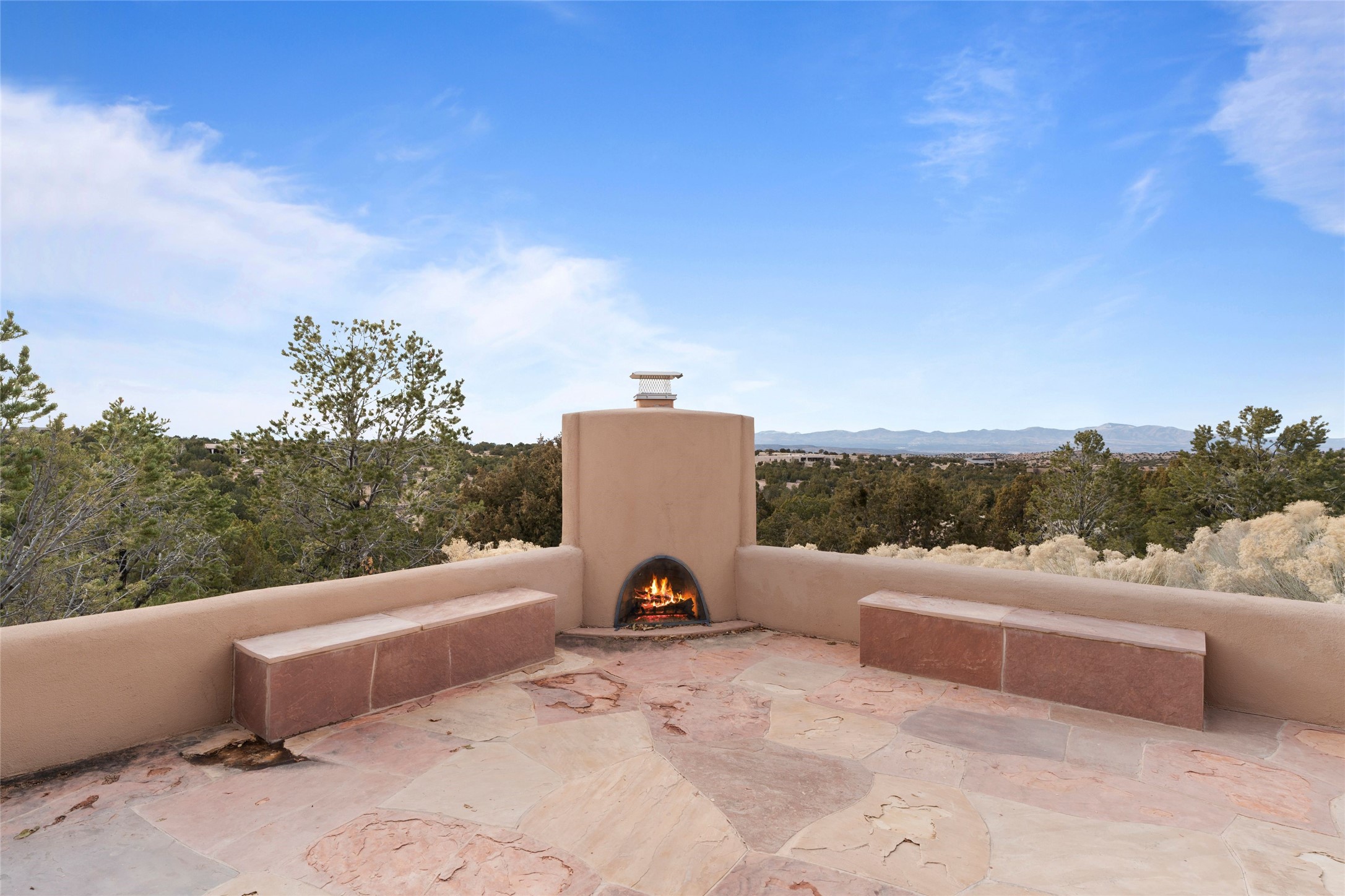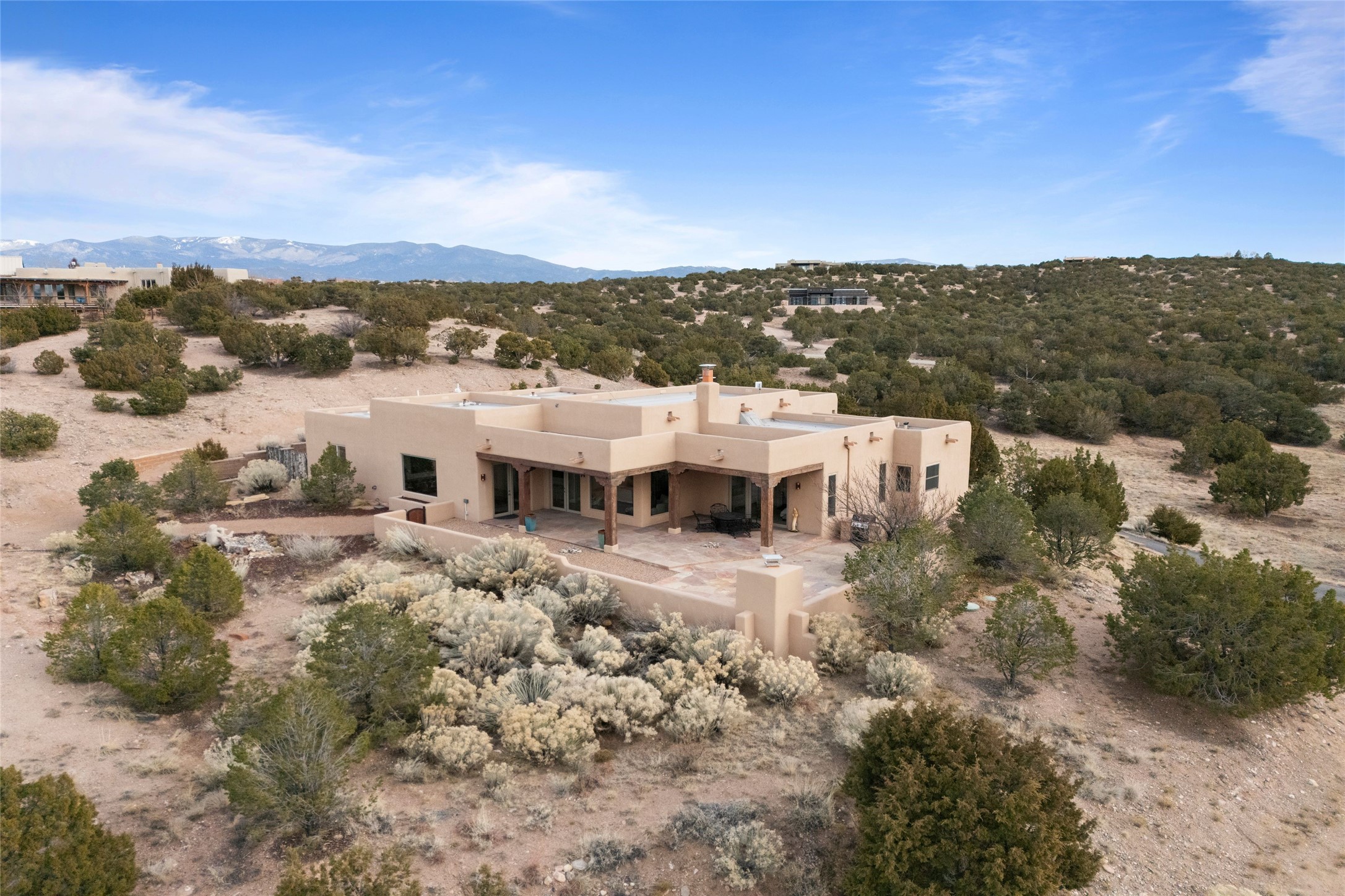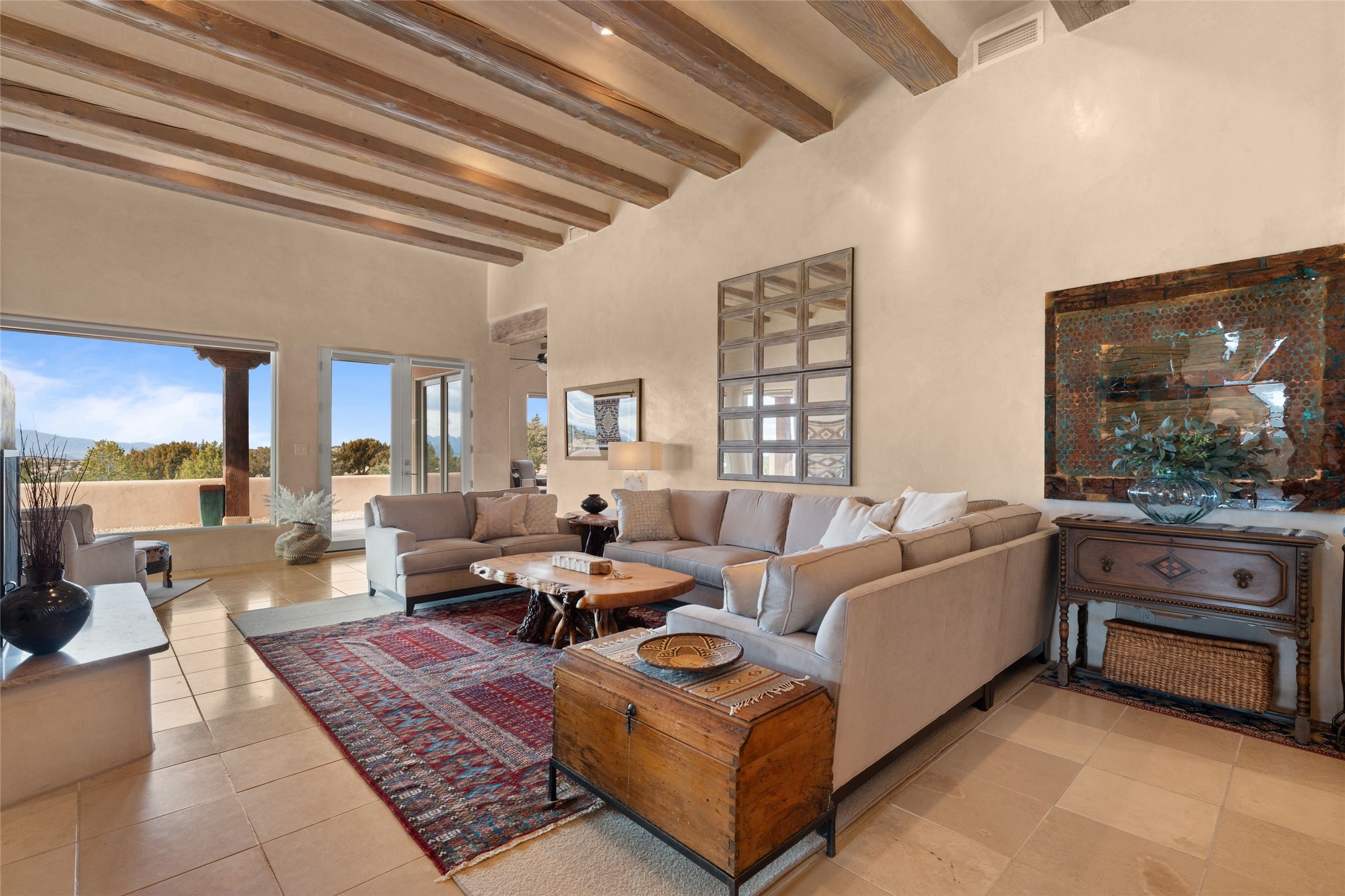 Striking home single-level 3-bedroom 3 bath home on 2.5+ acres with panoramic mountain views that create a breathtaking backdrop for your everyday living. Upon entering, you're greeted by soaring raised ceilings embellished with beautiful wood beams. The diamond finish plaster walls and custom wood doors enhance the sophisticated aesthetic, while the travertine floors provide a seamless blend of elegance and practicality. The living area serves as an inviting space with an elegant kiva fireplace as its centerpiece, perfect for cozy gatherings and relaxation. Culinary enthusiasts will appreciate the chef's kitchen, which is equipped with two Bosch ovens, a Bosch cooktop, and a commercial-grade Kitchen Aid fridge. The spacious island, complete with a wet bar, offers ample room for meal preparation and entertaining. The primary bedroom spotlights its own fireplace and direct access to an outdoor patio, creating a personal retreat. The ensuite bath is designed for relaxation, featuring a large soaking tub and a walk-in shower. Step outside to discover a deep portal with a fireplace and a Baron King grill, making it an ideal setting for outdoor dining and entertaining. The expansive covered deck, complete with an outdoor kiva fireplace, invites you to enjoy the beauty of New Mexico's landscapes in comfort and style. Water feature with a celebrated artist Doug Hyde life-size limestone sculpture conveys. Peaceful setting minutes from downtown Santa Fe with its vibrant art and culinary scene and year-round festivals.