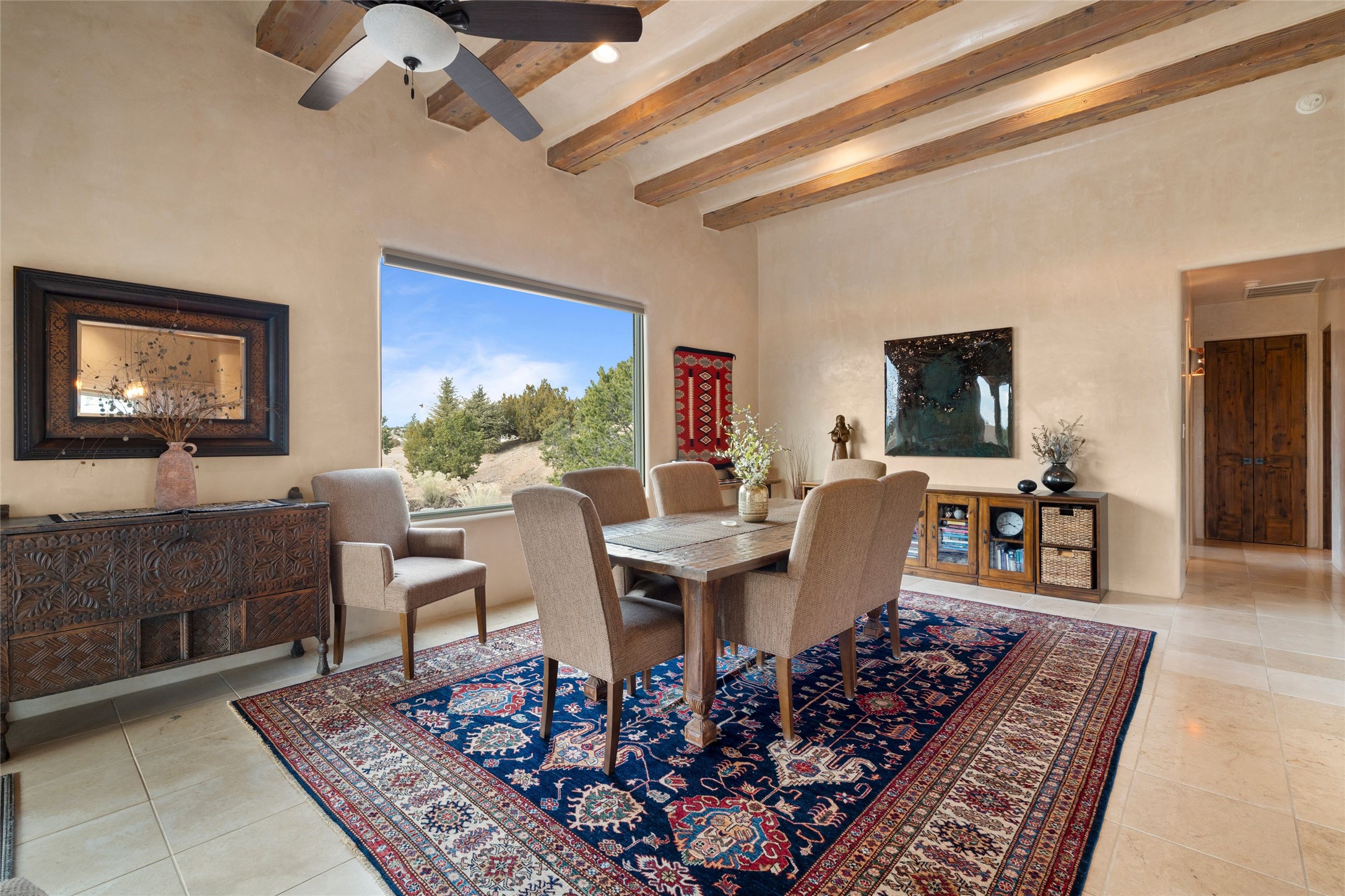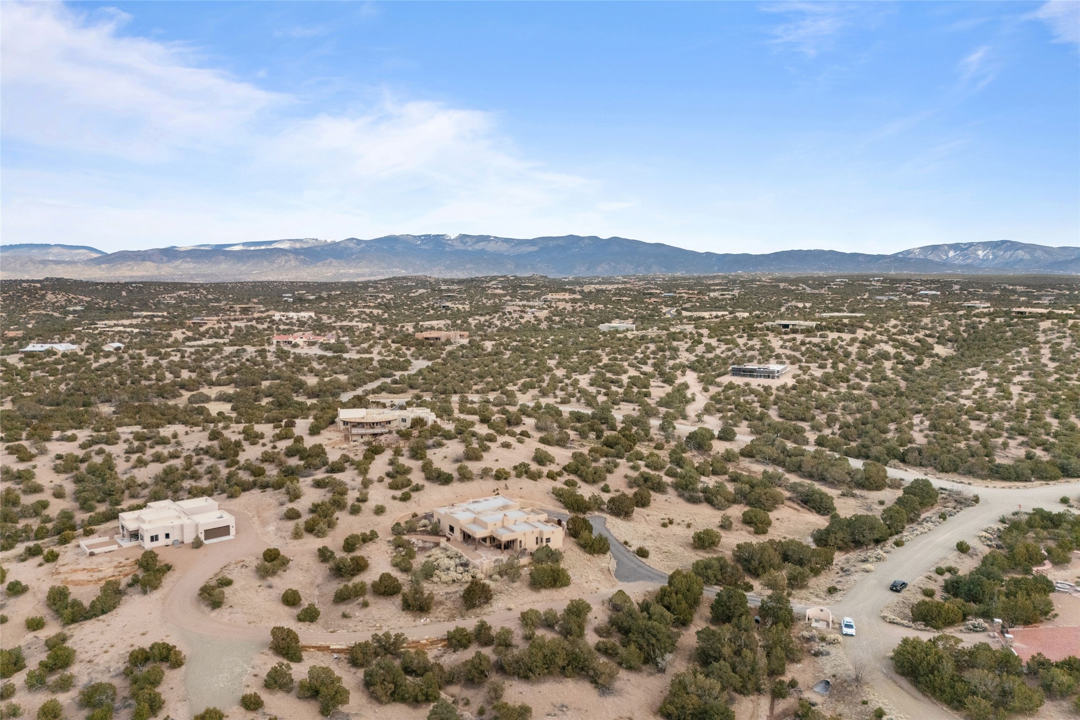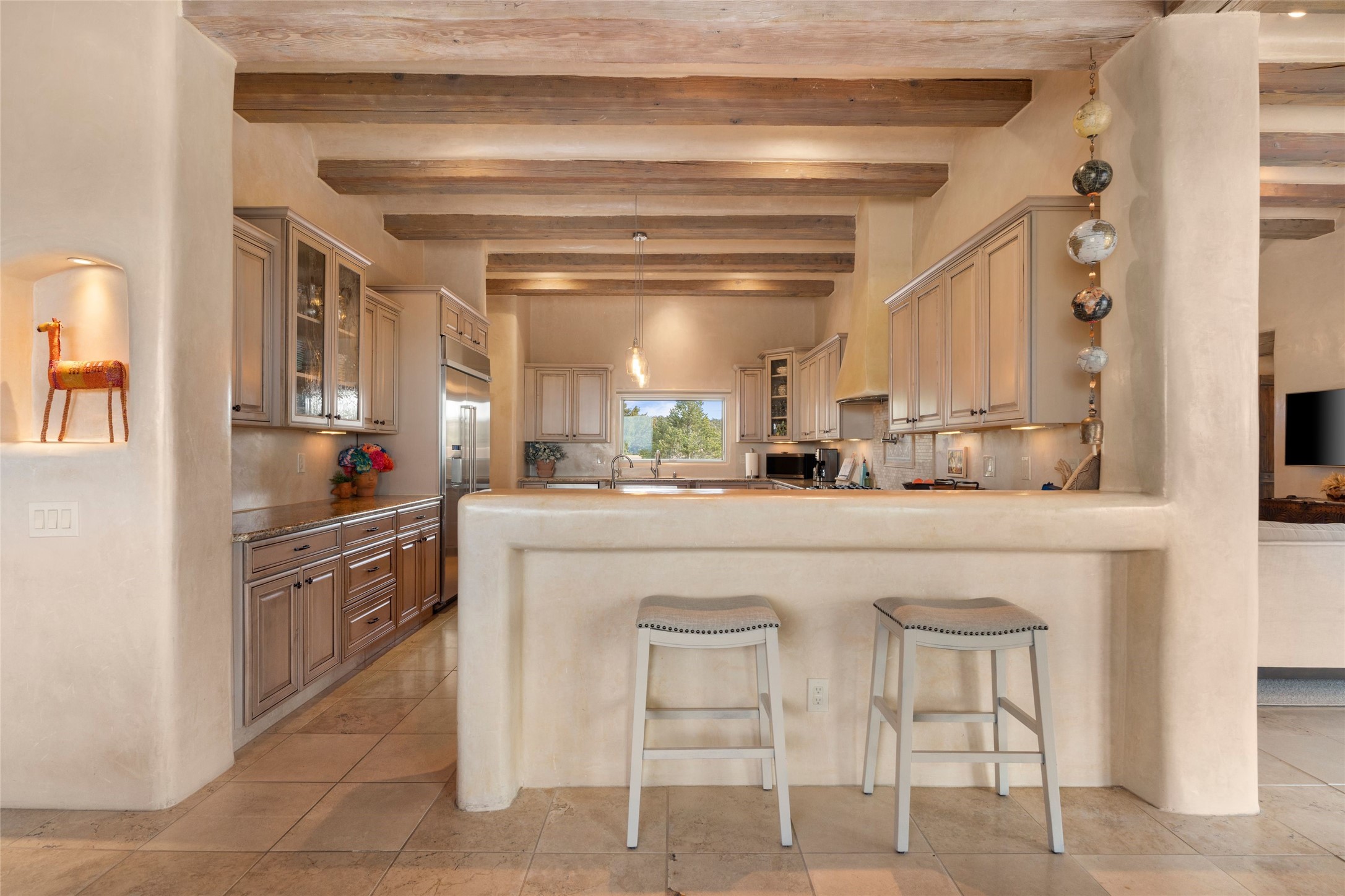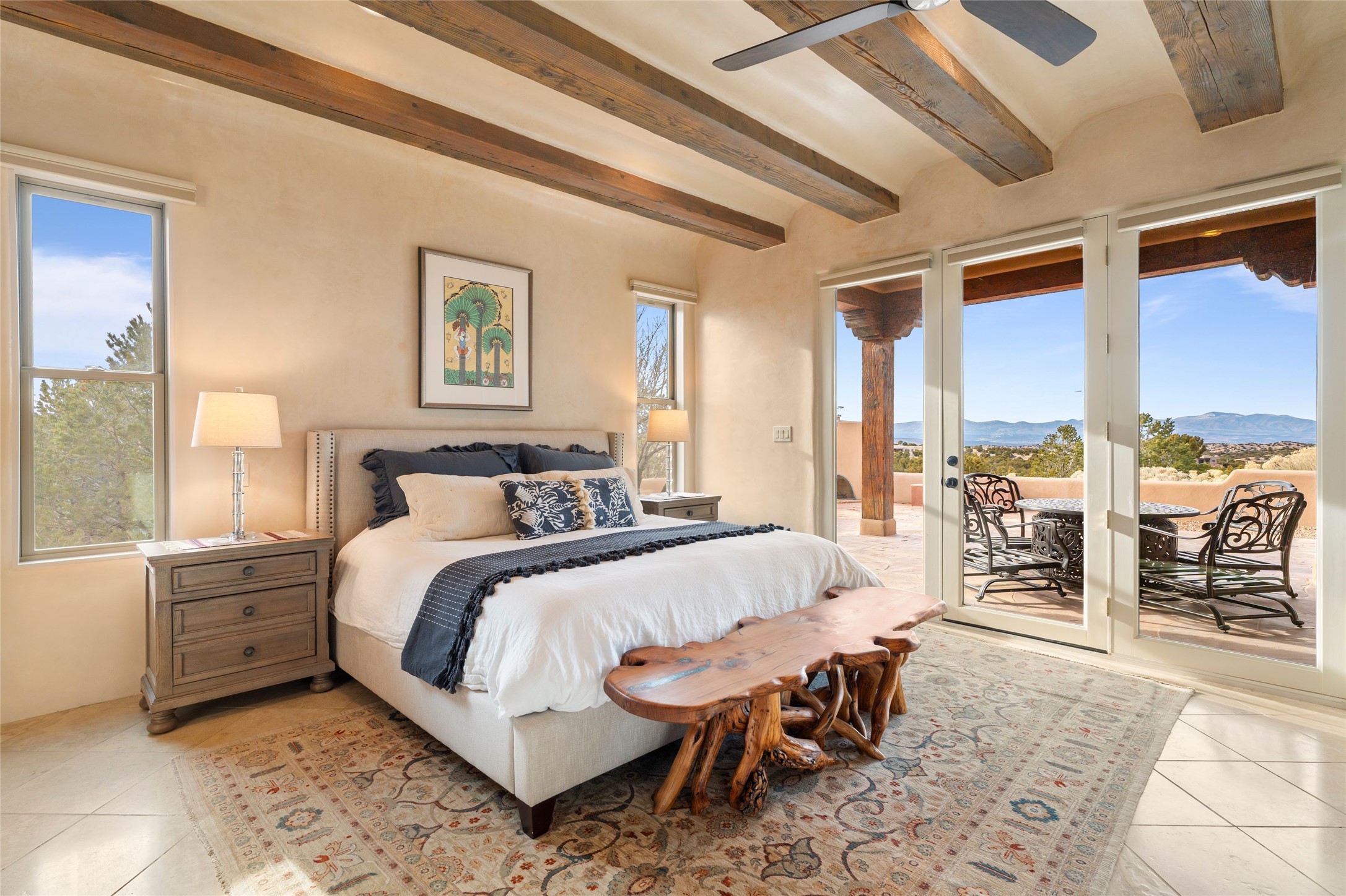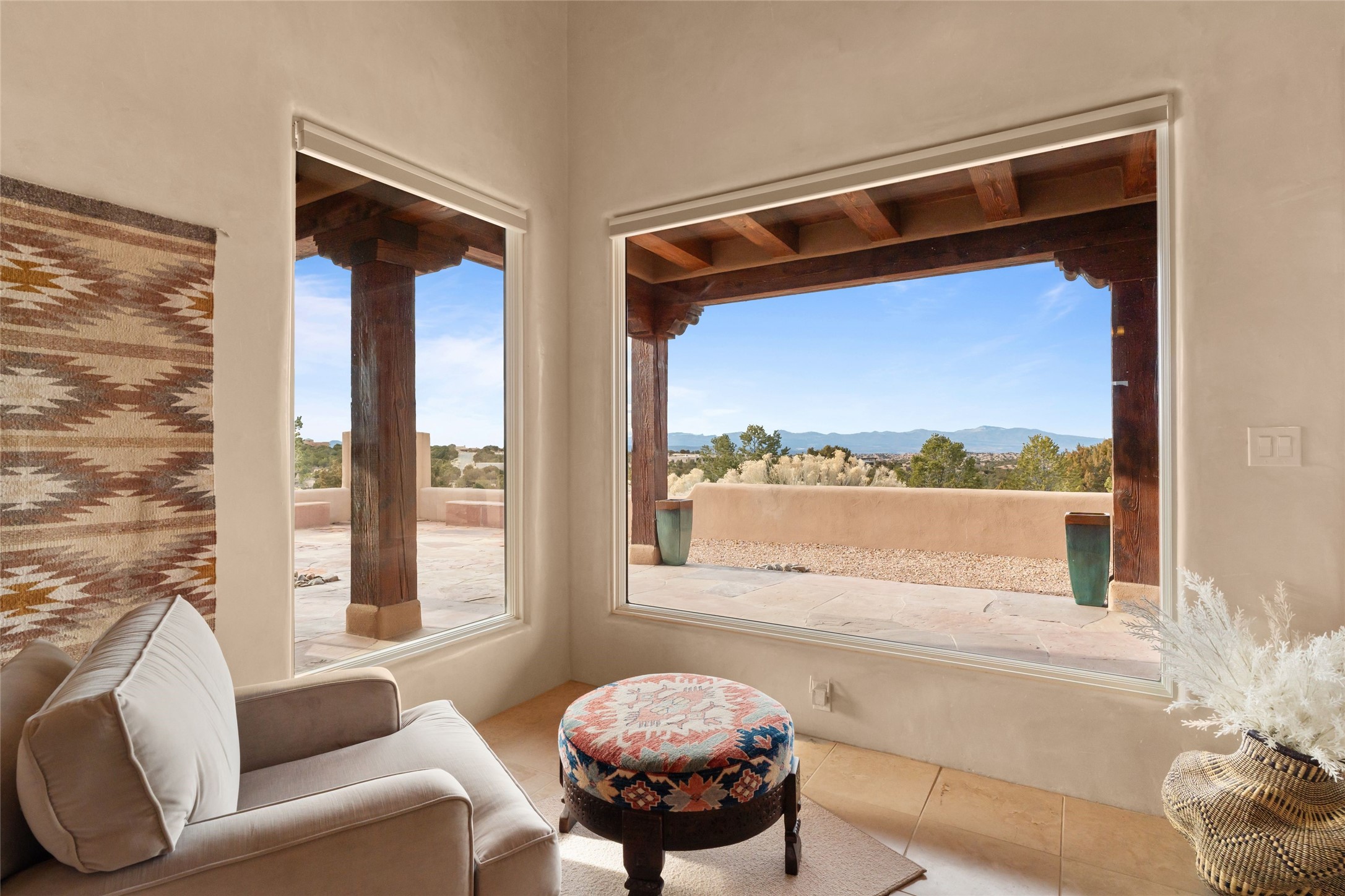 Striking home single-level 3-bedroom 3 bath home on 2.5+ acres with panoramic mountain views that create a breathtaking backdrop for your everyday living. Upon entering, you're greeted by soaring raised ceilings embellished with beautiful wood beams. The diamond finish plaster walls and custom wood doors enhance the sophisticated aesthetic, while the travertine floors provide a seamless blend of elegance and practicality. The living area serves as an inviting space with an elegant kiva fireplace as its centerpiece, perfect for cozy gatherings and relaxation. Culinary enthusiasts will appreciate the chef's kitchen, which is equipped with two Bosch ovens, a Bosch cooktop, and a commercial-grade Kitchen Aid fridge. The spacious island, complete with a wet bar, offers ample room for meal preparation and entertaining. The primary bedroom spotlights its own fireplace and direct access to an outdoor patio, creating a personal retreat. The ensuite bath is designed for relaxation, featuring a large soaking tub and a walk-in shower. Step outside to discover a deep portal with a fireplace and a Baron King grill, making it an ideal setting for outdoor dining and entertaining. The expansive covered deck, complete with an outdoor kiva fireplace, invites you to enjoy the beauty of New Mexico's landscapes in comfort and style. Water feature with a celebrated artist Doug Hyde life-size limestone sculpture conveys. Peaceful setting minutes from downtown Santa Fe with its vibrant art and culinary scene and year-round festivals.