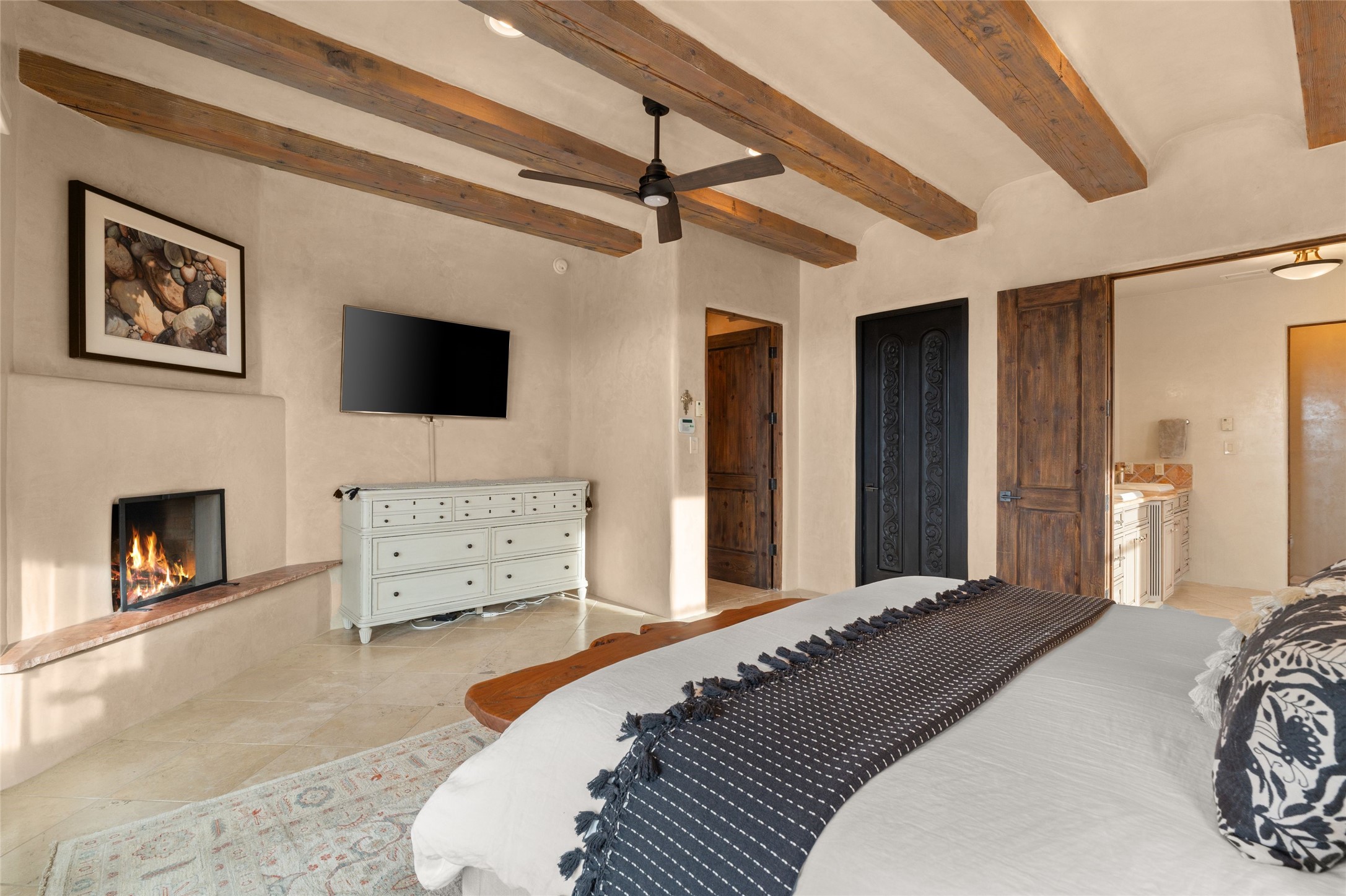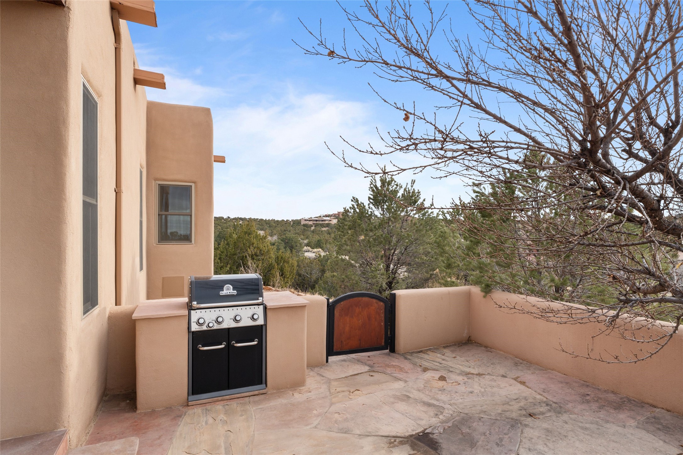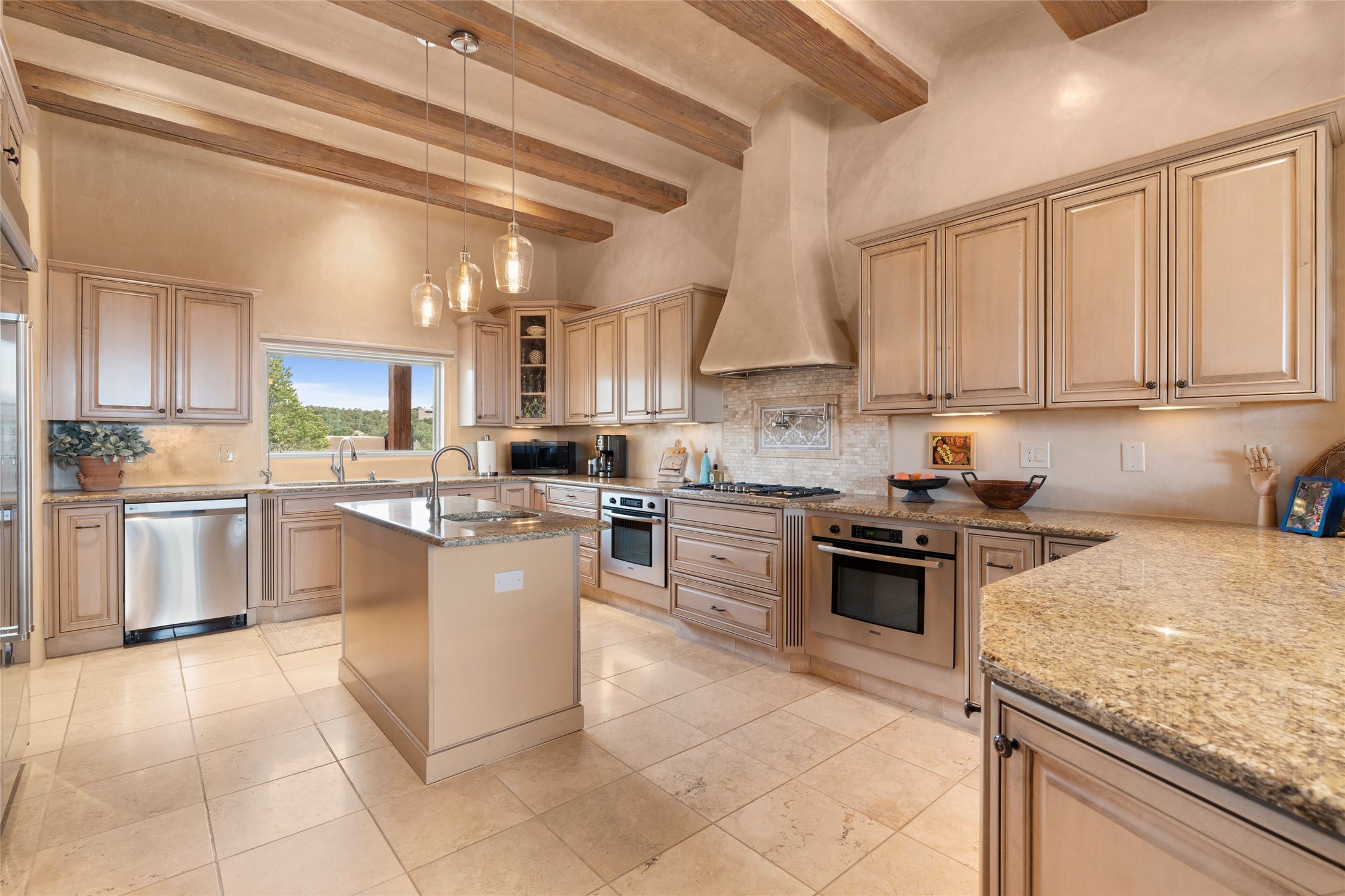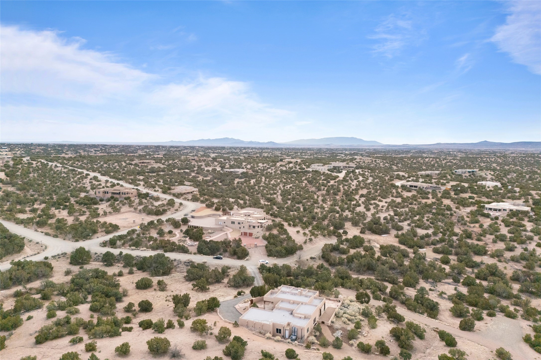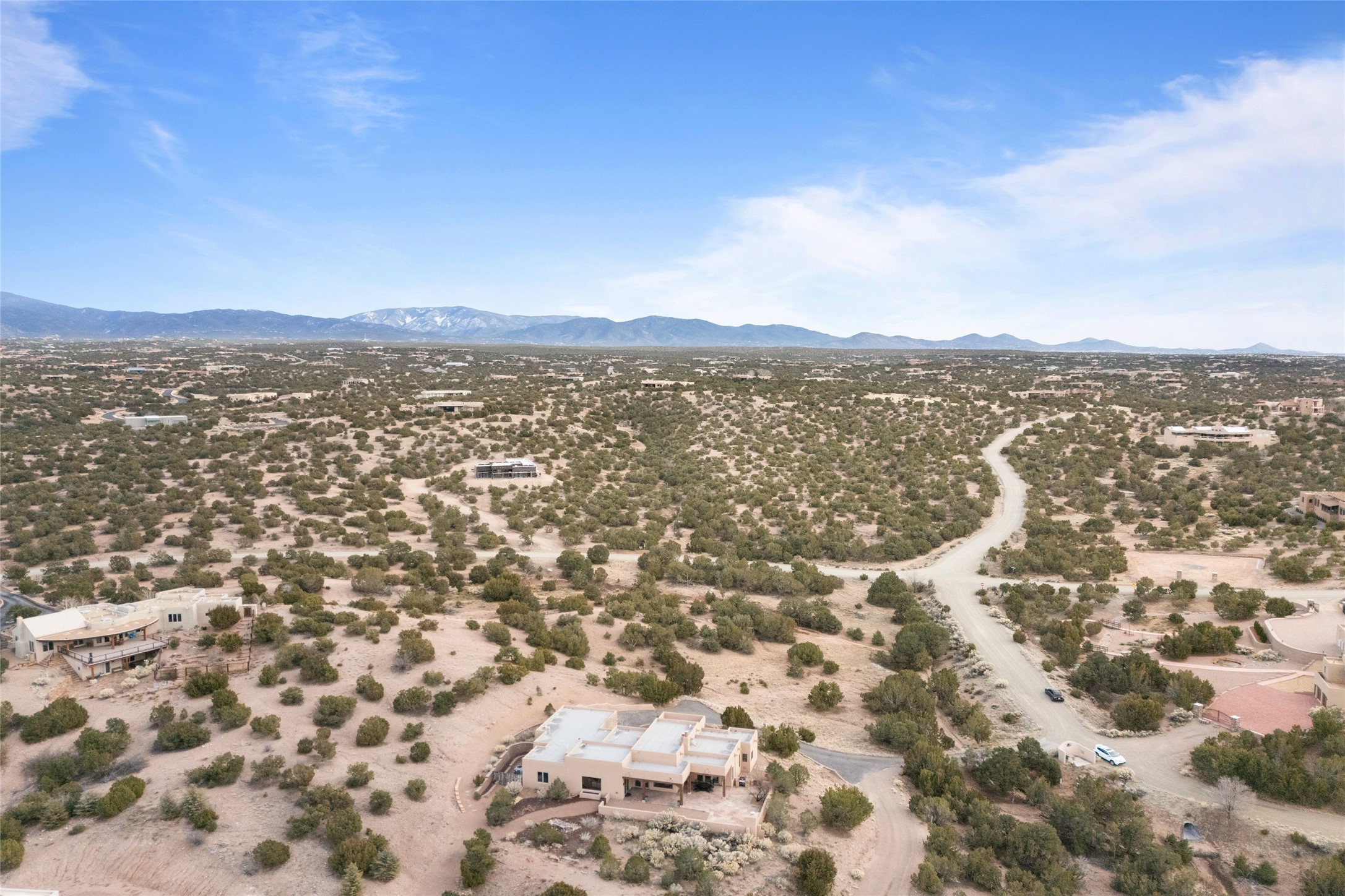 Striking home single-level 3-bedroom 3 bath home on 2.5+ acres with panoramic mountain views that create a breathtaking backdrop for your everyday living. Upon entering, you're greeted by soaring raised ceilings embellished with beautiful wood beams. The diamond finish plaster walls and custom wood doors enhance the sophisticated aesthetic, while the travertine floors provide a seamless blend of elegance and practicality. The living area serves as an inviting space with an elegant kiva fireplace as its centerpiece, perfect for cozy gatherings and relaxation. Culinary enthusiasts will appreciate the chef's kitchen, which is equipped with two Bosch ovens, a Bosch cooktop, and a commercial-grade Kitchen Aid fridge. The spacious island, complete with a wet bar, offers ample room for meal preparation and entertaining. The primary bedroom spotlights its own fireplace and direct access to an outdoor patio, creating a personal retreat. The ensuite bath is designed for relaxation, featuring a large soaking tub and a walk-in shower. Step outside to discover a deep portal with a fireplace and a Baron King grill, making it an ideal setting for outdoor dining and entertaining. The expansive covered deck, complete with an outdoor kiva fireplace, invites you to enjoy the beauty of New Mexico's landscapes in comfort and style. Water feature with a celebrated artist Doug Hyde life-size limestone sculpture conveys. Peaceful setting minutes from downtown Santa Fe with its vibrant art and culinary scene and year-round festivals.