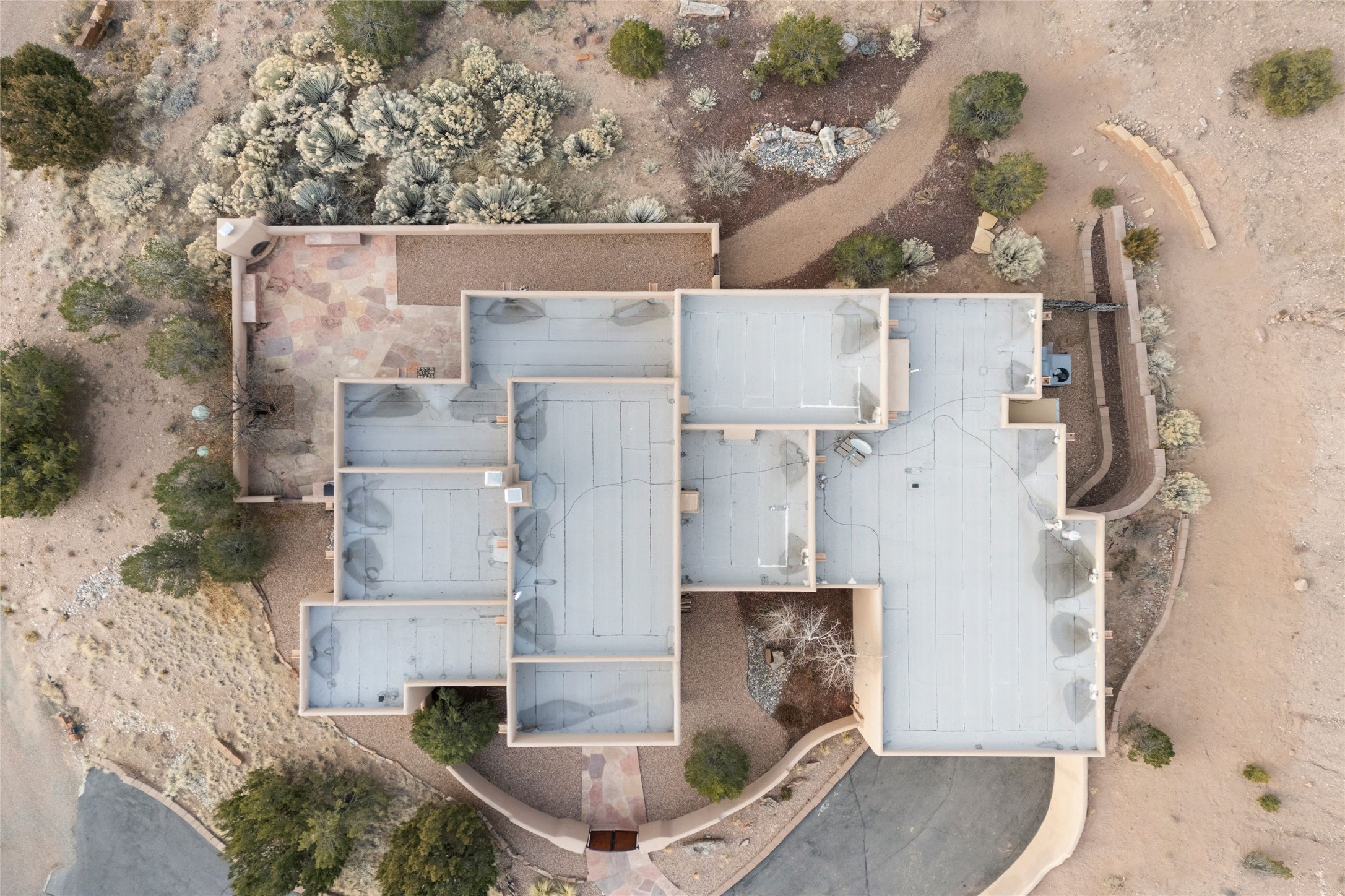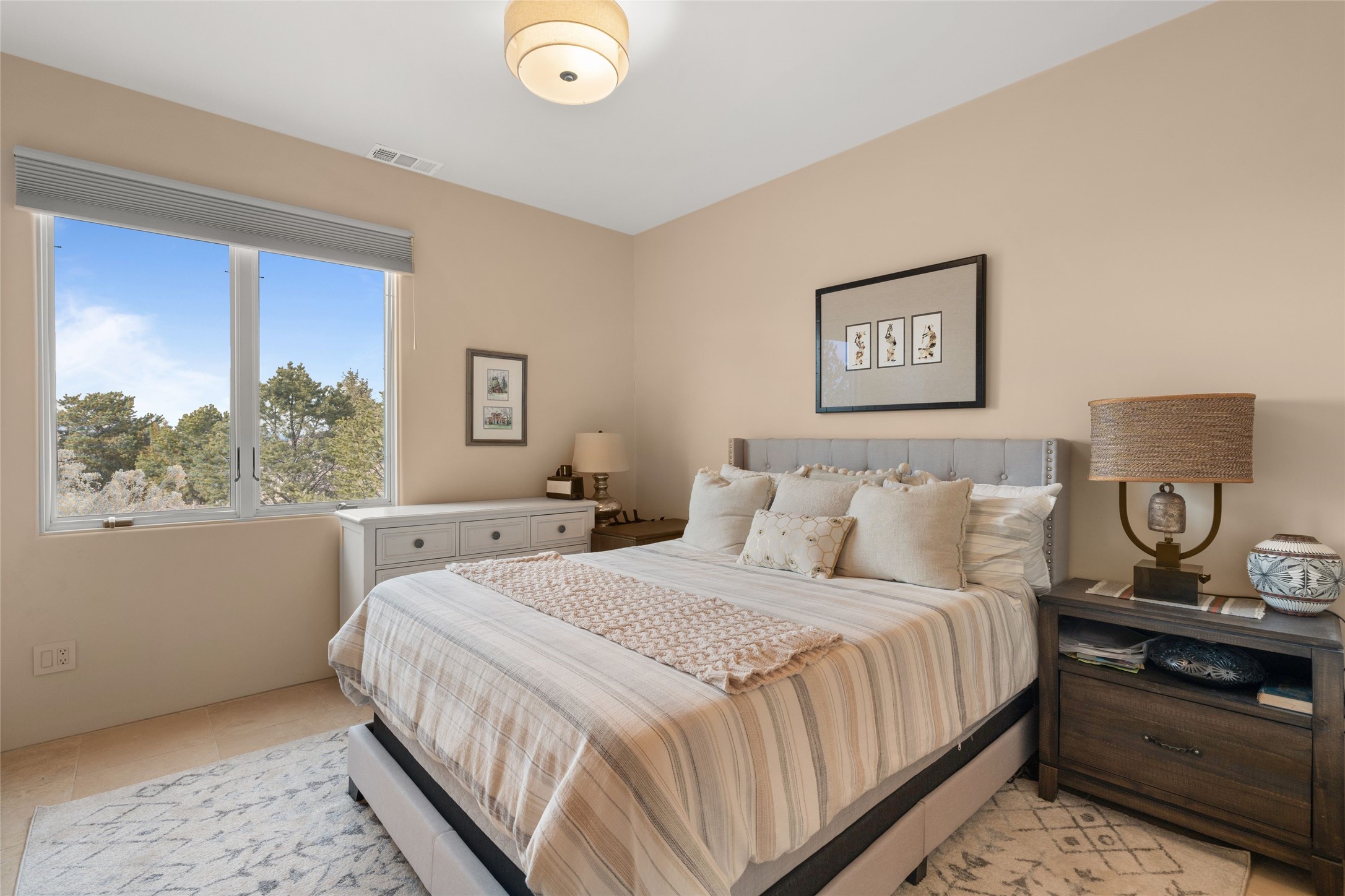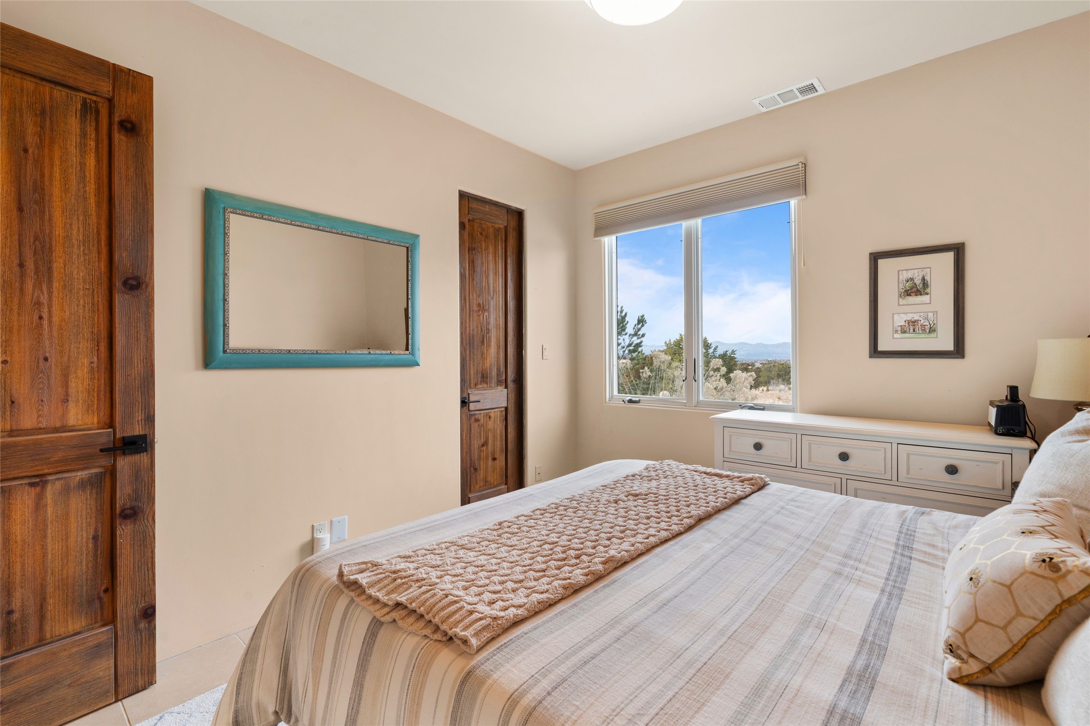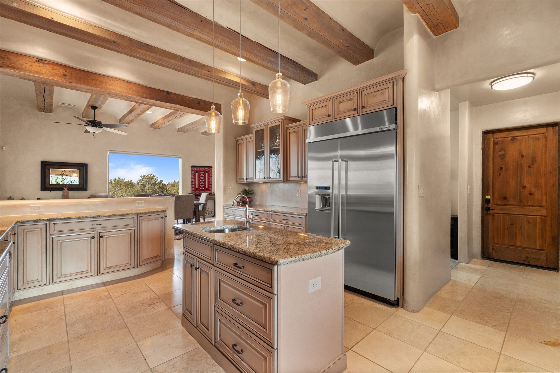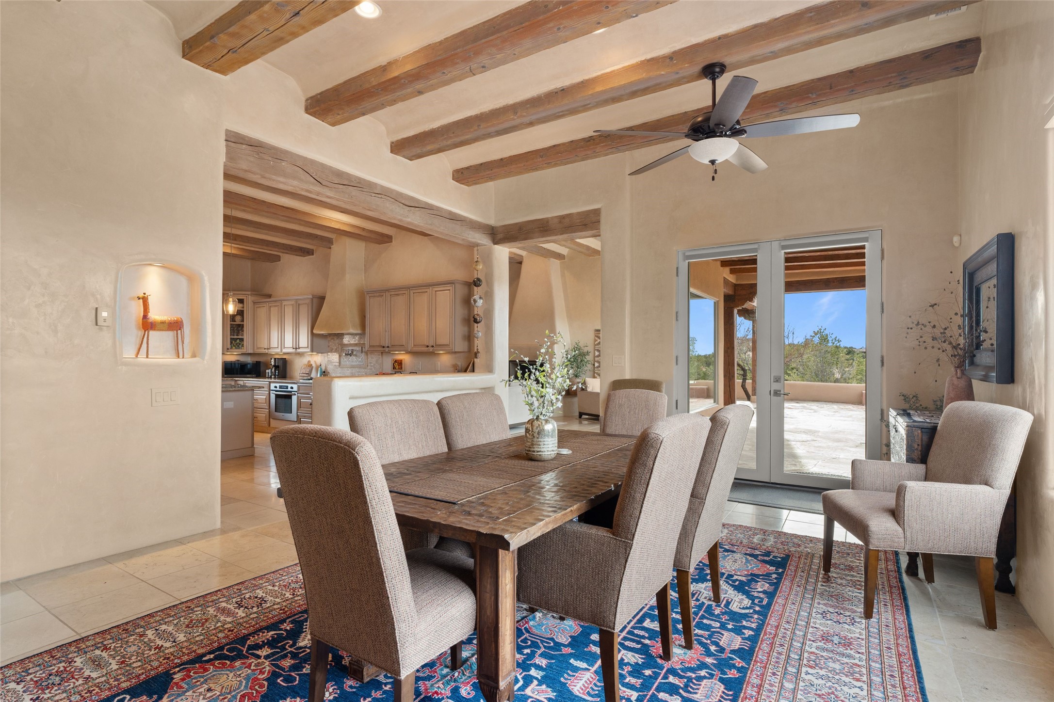 Striking home single-level 3-bedroom 3 bath home on 2.5+ acres with panoramic mountain views that create a breathtaking backdrop for your everyday living. Upon entering, you're greeted by soaring raised ceilings embellished with beautiful wood beams. The diamond finish plaster walls and custom wood doors enhance the sophisticated aesthetic, while the travertine floors provide a seamless blend of elegance and practicality. The living area serves as an inviting space with an elegant kiva fireplace as its centerpiece, perfect for cozy gatherings and relaxation. Culinary enthusiasts will appreciate the chef's kitchen, which is equipped with two Bosch ovens, a Bosch cooktop, and a commercial-grade Kitchen Aid fridge. The spacious island, complete with a wet bar, offers ample room for meal preparation and entertaining. The primary bedroom spotlights its own fireplace and direct access to an outdoor patio, creating a personal retreat. The ensuite bath is designed for relaxation, featuring a large soaking tub and a walk-in shower. Step outside to discover a deep portal with a fireplace and a Baron King grill, making it an ideal setting for outdoor dining and entertaining. The expansive covered deck, complete with an outdoor kiva fireplace, invites you to enjoy the beauty of New Mexico's landscapes in comfort and style. Water feature with a celebrated artist Doug Hyde life-size limestone sculpture conveys. Peaceful setting minutes from downtown Santa Fe with its vibrant art and culinary scene and year-round festivals.