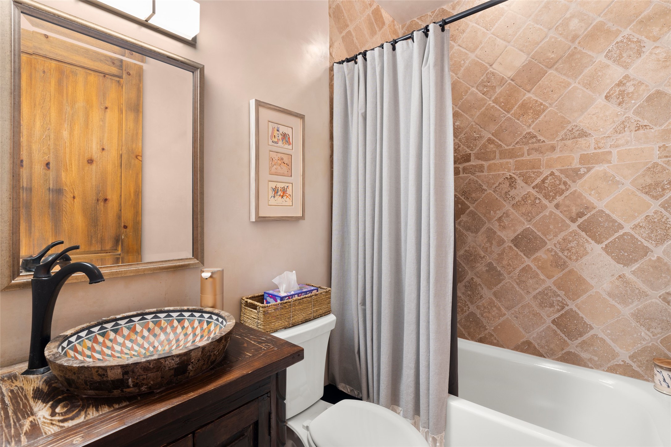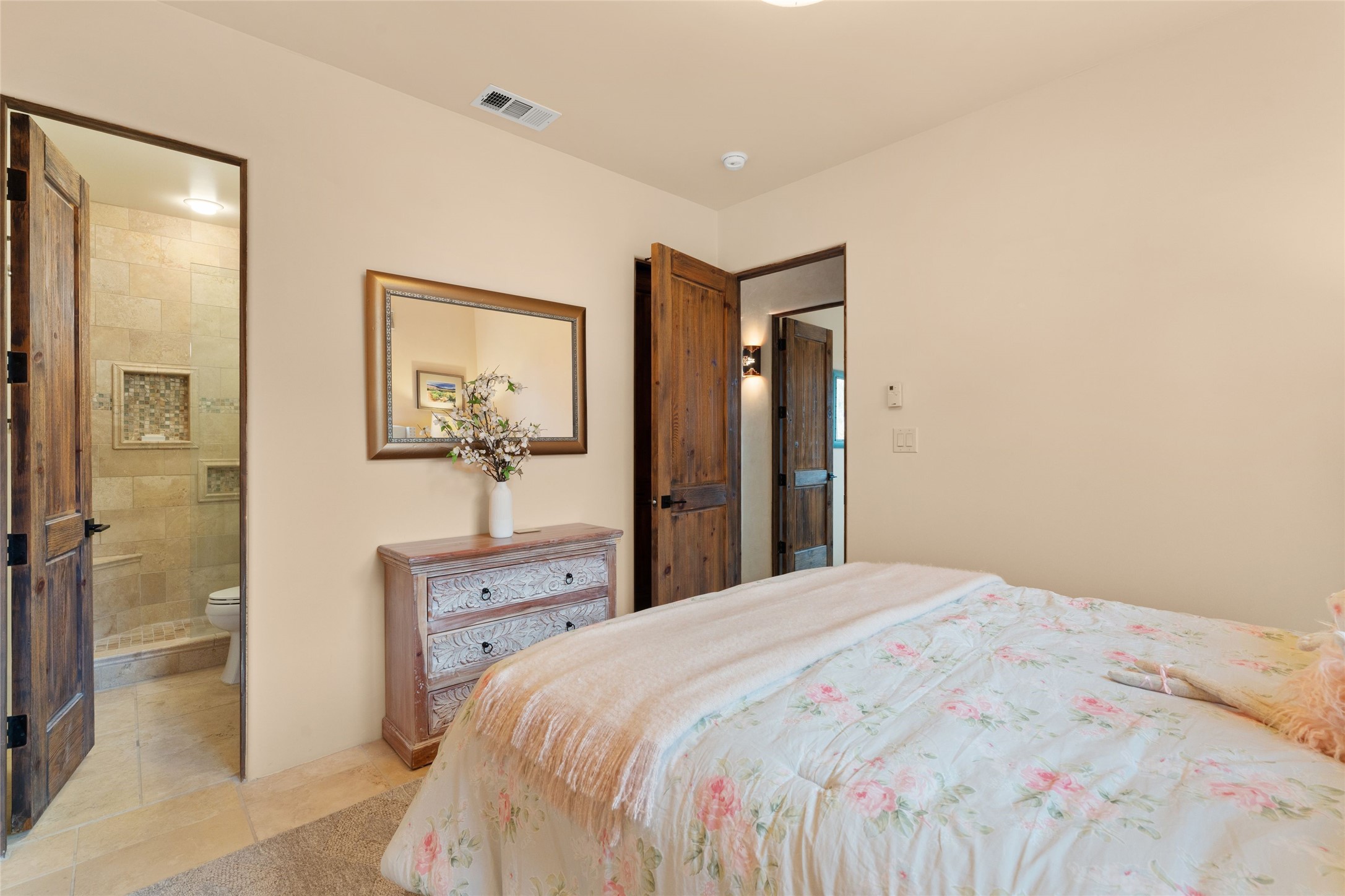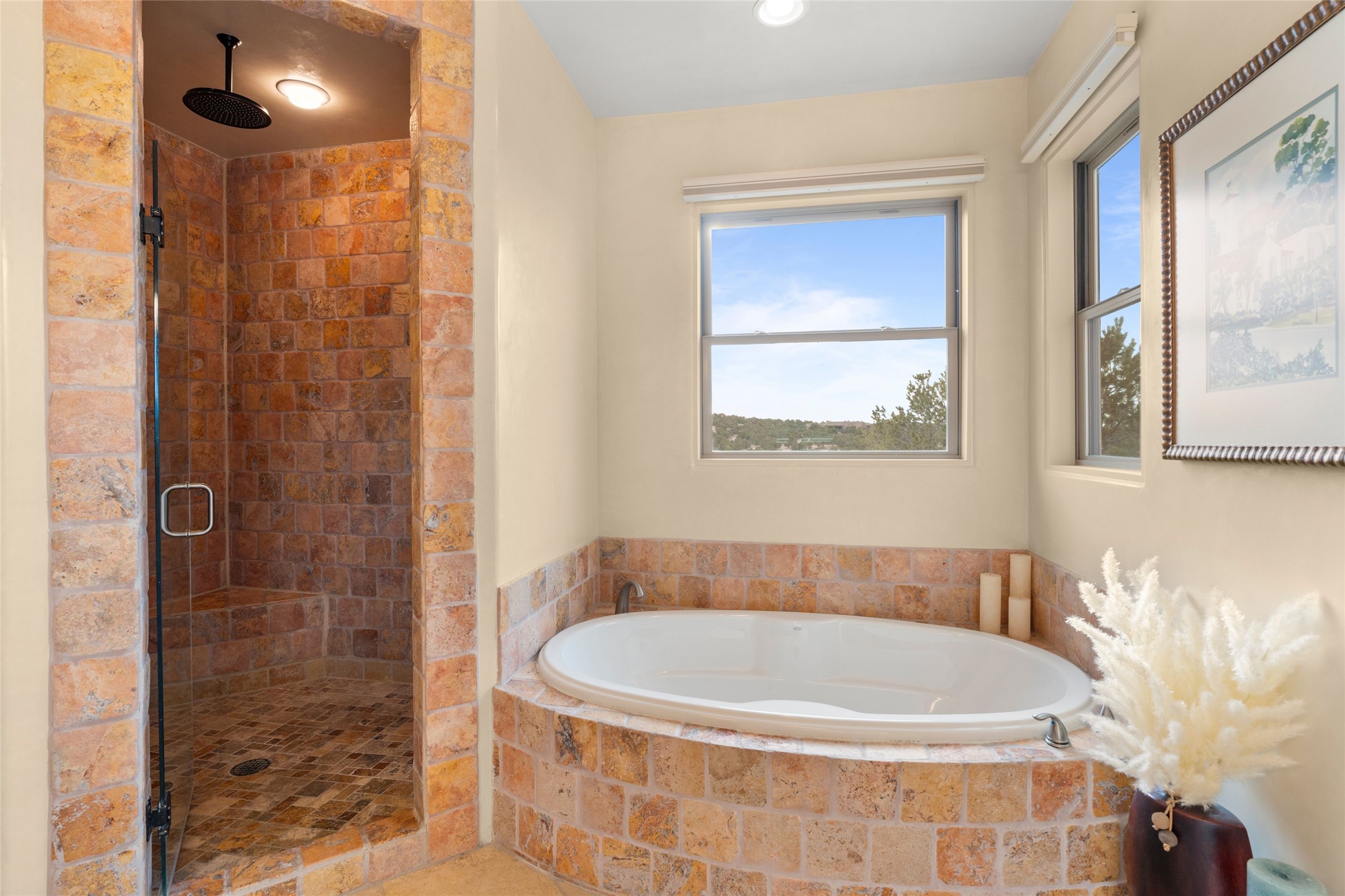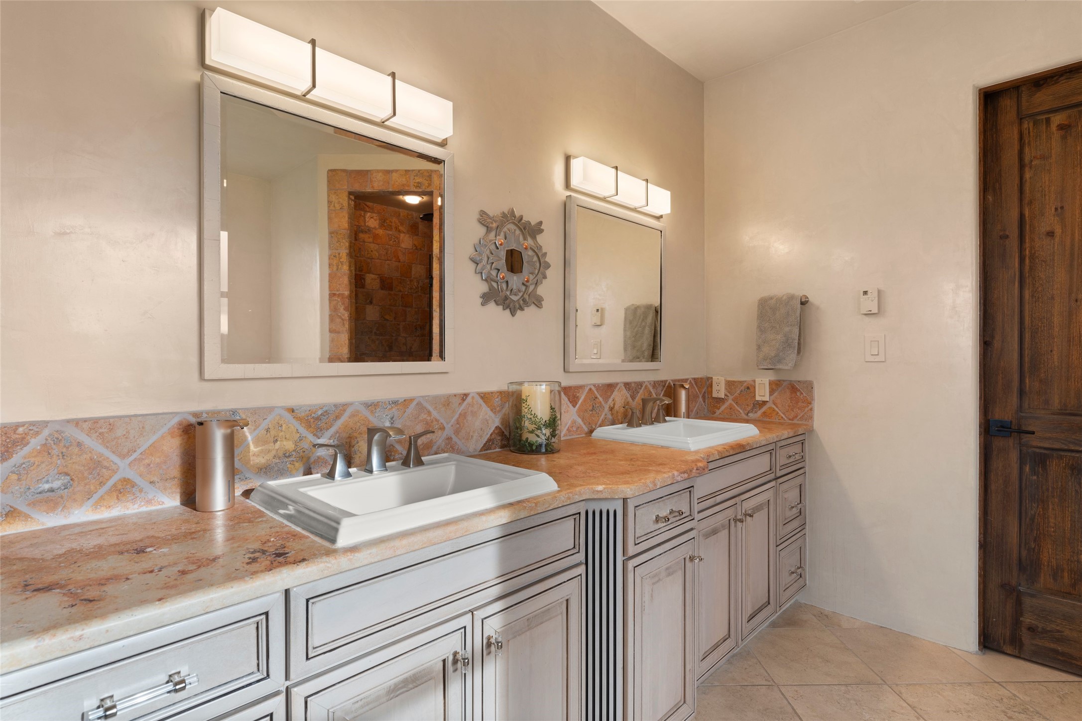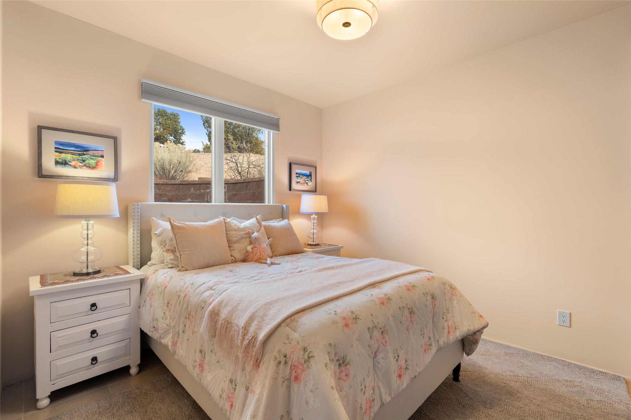 Striking home single-level 3-bedroom 3 bath home on 2.5+ acres with panoramic mountain views that create a breathtaking backdrop for your everyday living. Upon entering, you're greeted by soaring raised ceilings embellished with beautiful wood beams. The diamond finish plaster walls and custom wood doors enhance the sophisticated aesthetic, while the travertine floors provide a seamless blend of elegance and practicality. The living area serves as an inviting space with an elegant kiva fireplace as its centerpiece, perfect for cozy gatherings and relaxation. Culinary enthusiasts will appreciate the chef's kitchen, which is equipped with two Bosch ovens, a Bosch cooktop, and a commercial-grade Kitchen Aid fridge. The spacious island, complete with a wet bar, offers ample room for meal preparation and entertaining. The primary bedroom spotlights its own fireplace and direct access to an outdoor patio, creating a personal retreat. The ensuite bath is designed for relaxation, featuring a large soaking tub and a walk-in shower. Step outside to discover a deep portal with a fireplace and a Baron King grill, making it an ideal setting for outdoor dining and entertaining. The expansive covered deck, complete with an outdoor kiva fireplace, invites you to enjoy the beauty of New Mexico's landscapes in comfort and style. Water feature with a celebrated artist Doug Hyde life-size limestone sculpture conveys. Peaceful setting minutes from downtown Santa Fe with its vibrant art and culinary scene and year-round festivals.