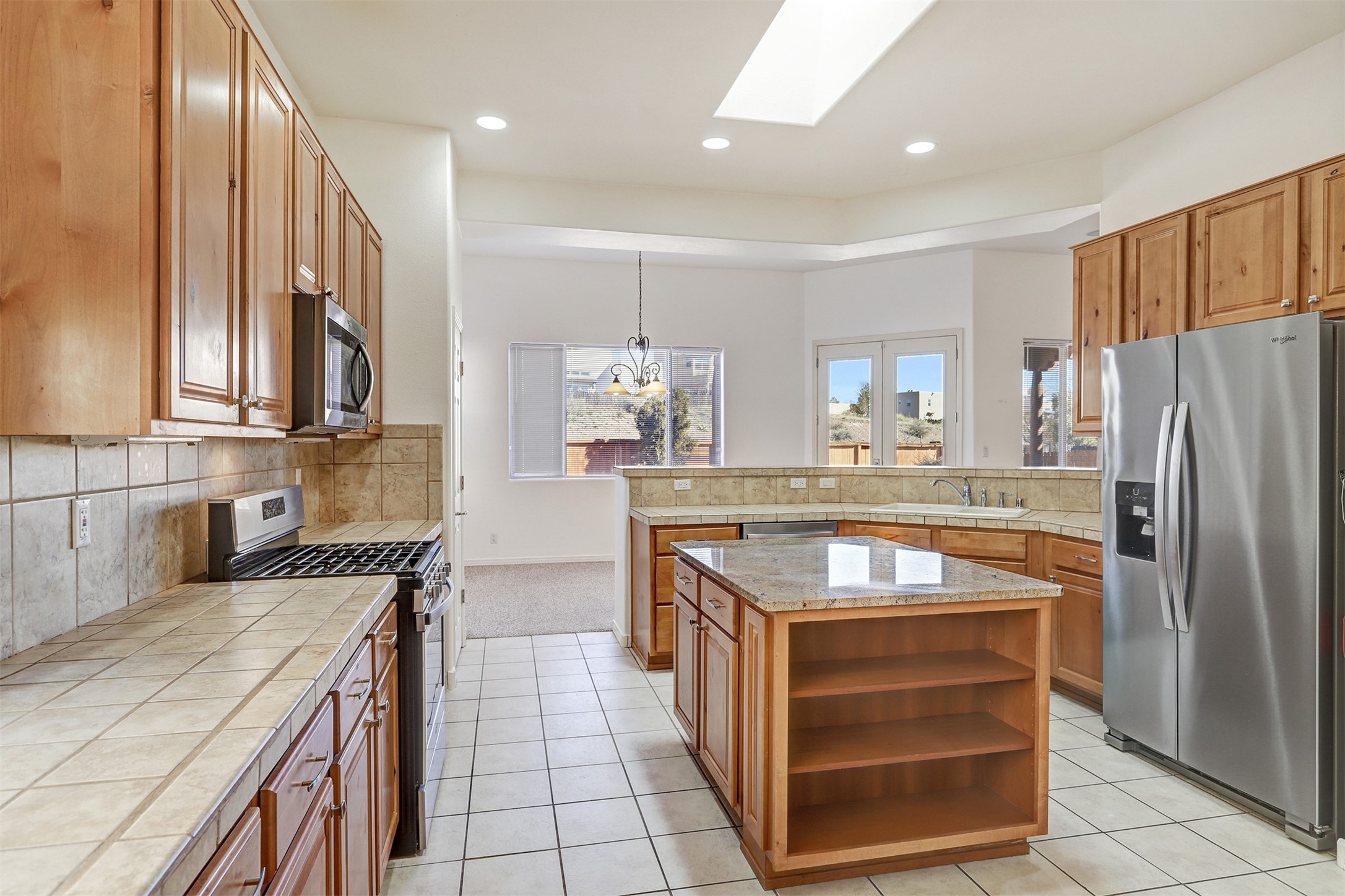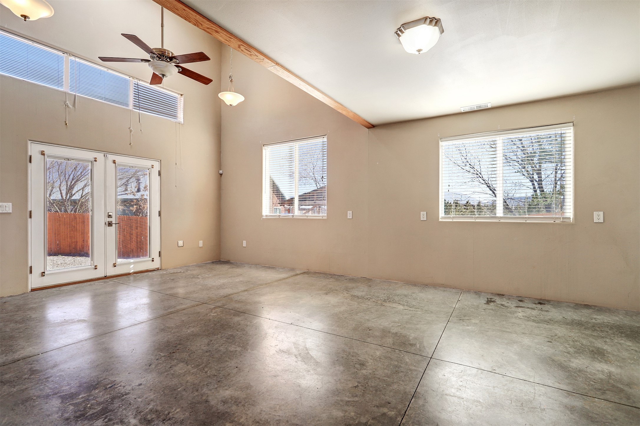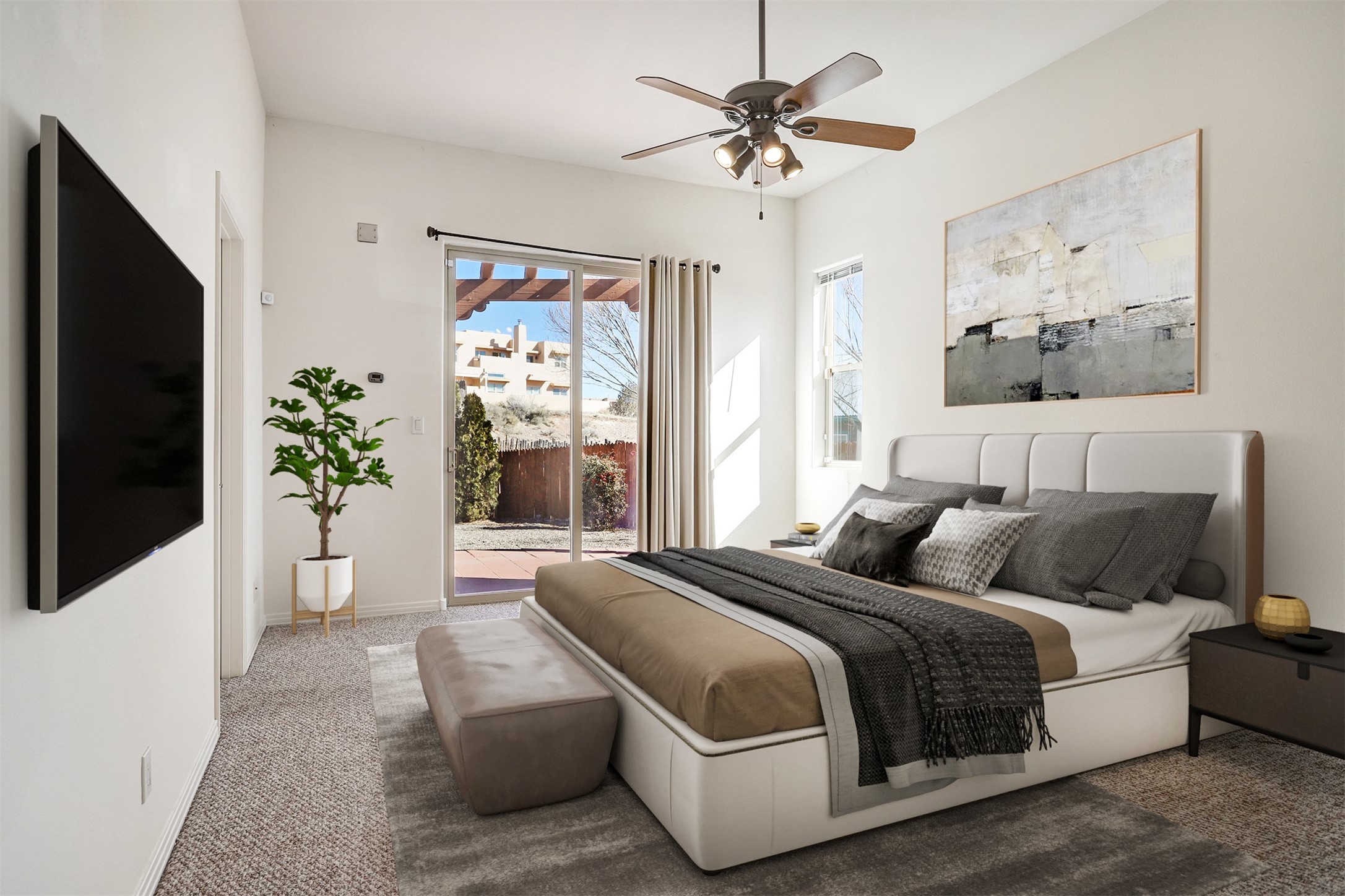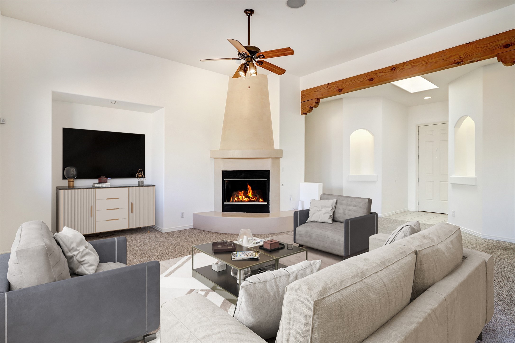 Welcome to this spacious and very well maintained 2,959 sq. ft. Pueblo-style home, offering four bedrooms, two bathrooms, and a 600 sq. ft. attached studio with a private entrance. Originally designed as an artist's space, the studio offers endless possibilities, making it ideal for a creative retreat, home office, or small business.This light-filled, single-level home features an open-concept design with a welcoming entryway, two illuminated Nichos, and a skylight that enhances its inviting ambiance. The living room boasts high ceilings, a gas Kiva fireplace, and a built-in speaker system, seamlessly flowing into the formal dining room. Patio doors open onto a covered portal, creating the perfect space for outdoor entertaining. The large, fully fenced backyard is landscaped with mature trees and a drip irrigation system, ensuring easy maintenance.The spacious kitchen is a culinary enthusiast's dream, featuring rich Alder cabinets, ample counter space, newer stainless steel appliances, and a center island with an eat-in area. A large pantry provides abundant storage, making this kitchen both functional and stylish.The generous primary suite offers two walk-in closets and direct access to the patio and outdoor entertaining spaces. The en-suite bathroom is designed for relaxation, complete with a soaking tub, a large shower, double sinks, and a skylight that fills the space with natural light. Additional bedrooms are located down the hallway, brightened by skylights and large windows with custom wood window treatments, and offer easy access to a full bathroom and the additional flex space.A finished and insulated two-car garage provides extra convenience, along with an advanced home security system for peace of mind. Freshly painted walls give the home a bright and refreshed feel, making it truly move-in ready. Conveniently located near community hiking trails, shopping centers, and schools, this home also offers easy freeway access for a smooth commute to Los Alamos and Albuquerque. Best of all, there are no HOA fees.