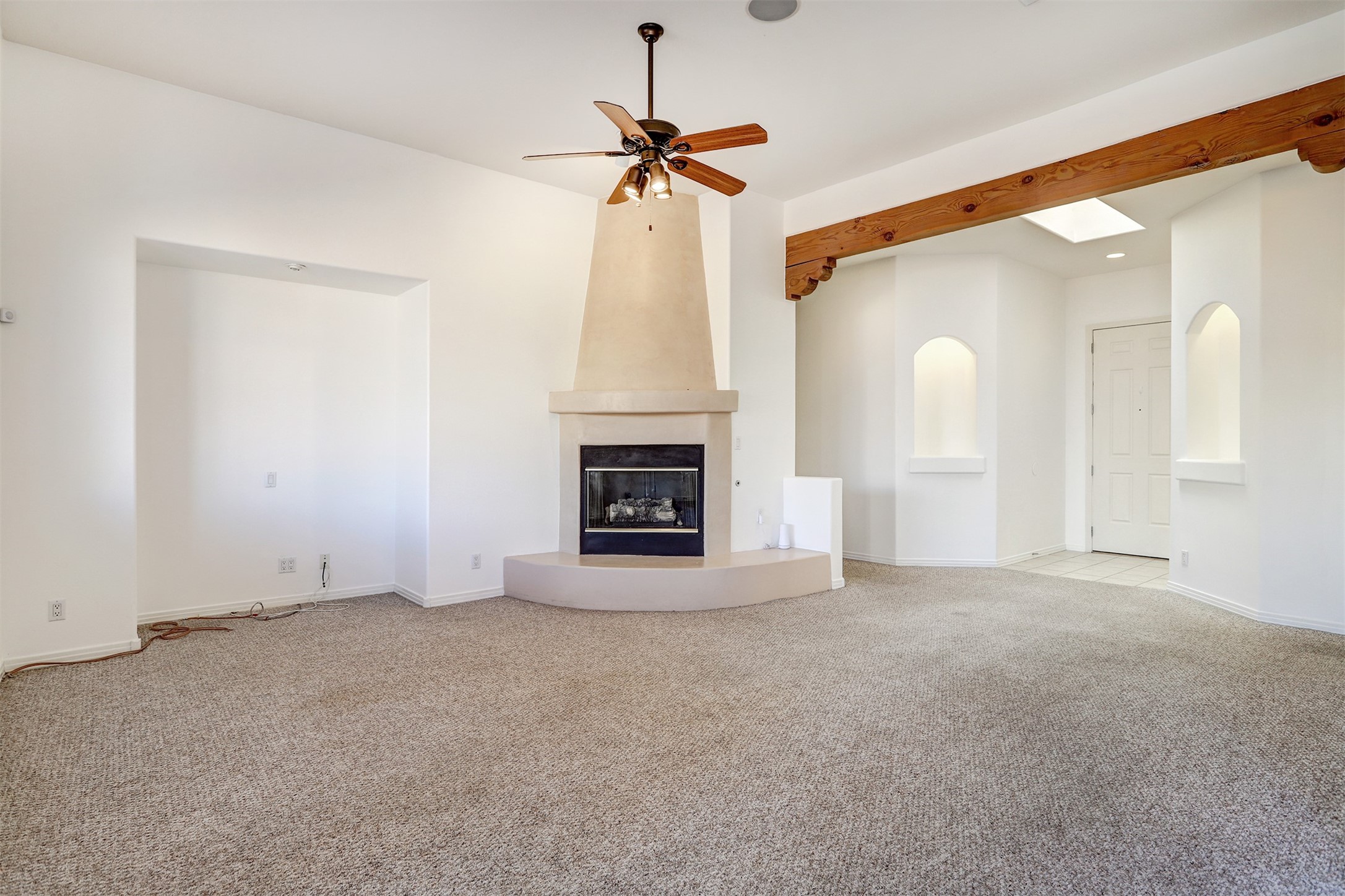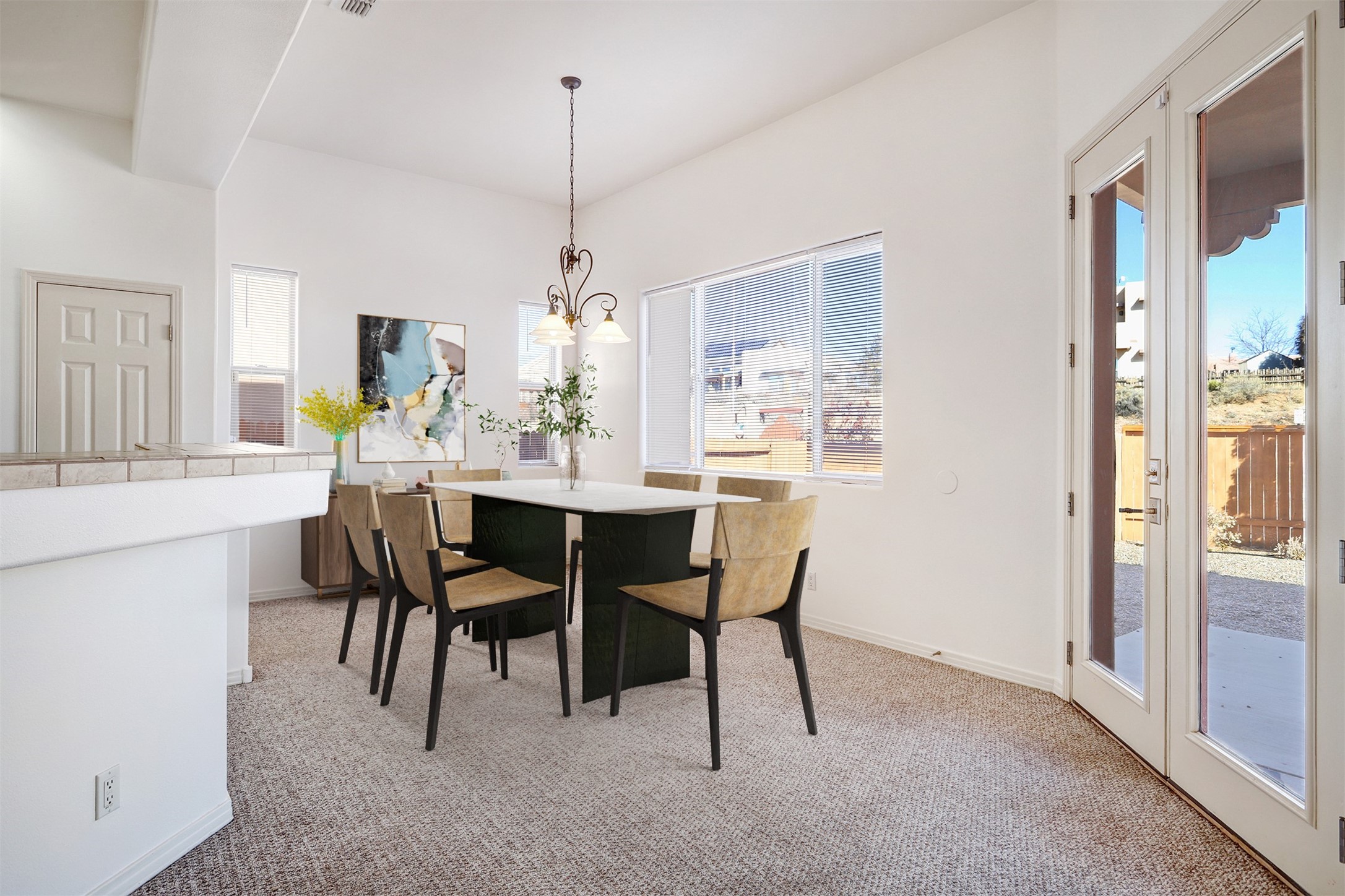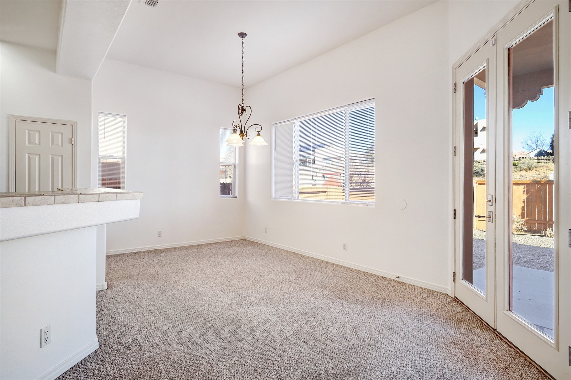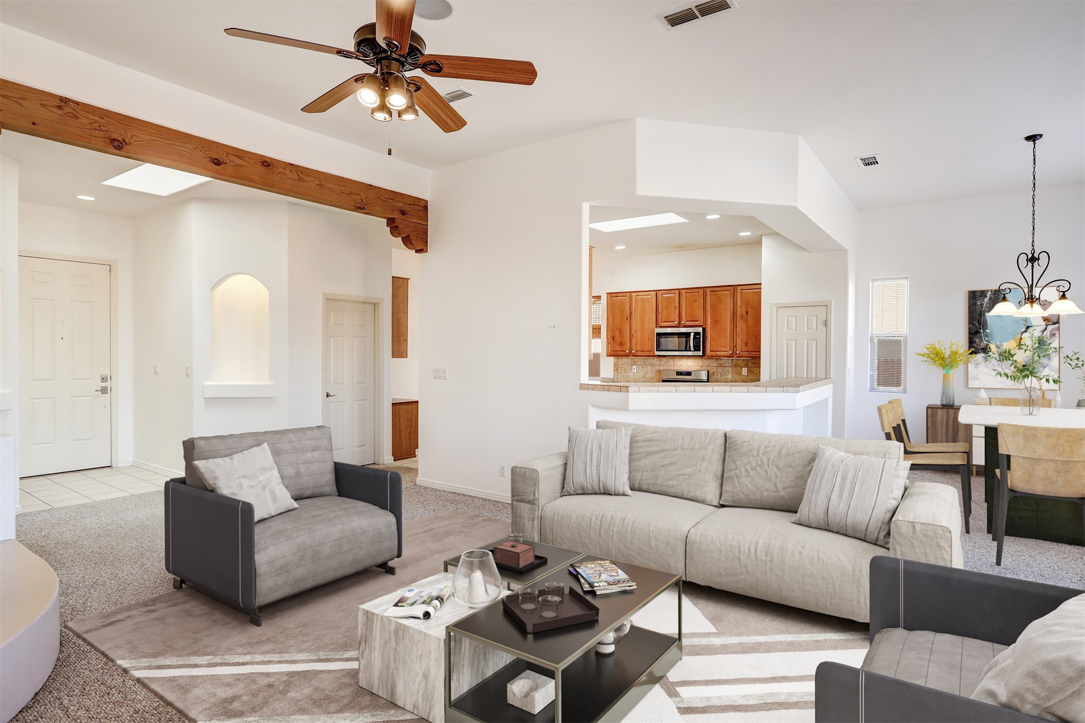 Welcome to this spacious and very well maintained 2,959 sq. ft. Pueblo-style home, offering four bedrooms, two bathrooms, and a 600 sq. ft. attached studio with a private entrance. Originally designed as an artist's space, the studio offers endless possibilities, making it ideal for a creative retreat, home office, or small business.This light-filled, single-level home features an open-concept design with a welcoming entryway, two illuminated Nichos, and a skylight that enhances its inviting ambiance. The living room boasts high ceilings, a gas Kiva fireplace, and a built-in speaker system, seamlessly flowing into the formal dining room. Patio doors open onto a covered portal, creating the perfect space for outdoor entertaining. The large, fully fenced backyard is landscaped with mature trees and a drip irrigation system, ensuring easy maintenance.The spacious kitchen is a culinary enthusiast's dream, featuring rich Alder cabinets, ample counter space, newer stainless steel appliances, and a center island with an eat-in area. A large pantry provides abundant storage, making this kitchen both functional and stylish.The generous primary suite offers two walk-in closets and direct access to the patio and outdoor entertaining spaces. The en-suite bathroom is designed for relaxation, complete with a soaking tub, a large shower, double sinks, and a skylight that fills the space with natural light. Additional bedrooms are located down the hallway, brightened by skylights and large windows with custom wood window treatments, and offer easy access to a full bathroom and the additional flex space.A finished and insulated two-car garage provides extra convenience, along with an advanced home security system for peace of mind. Freshly painted walls give the home a bright and refreshed feel, making it truly move-in ready. Conveniently located near community hiking trails, shopping centers, and schools, this home also offers easy freeway access for a smooth commute to Los Alamos and Albuquerque. Best of all, there are no HOA fees.