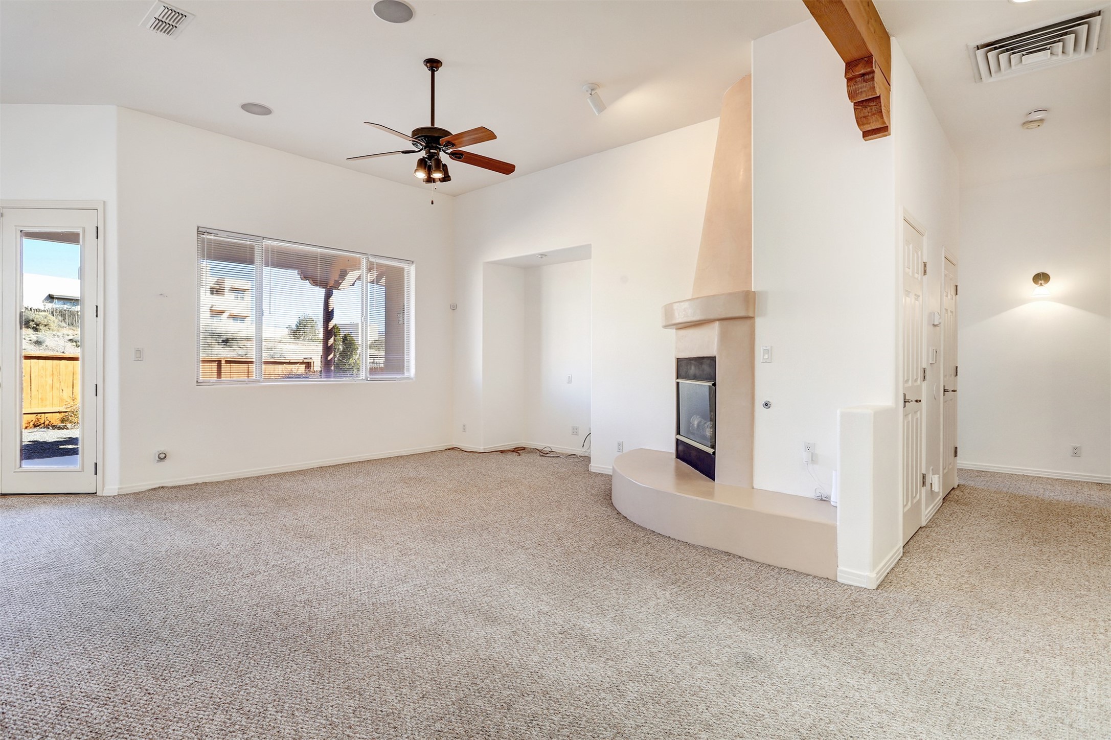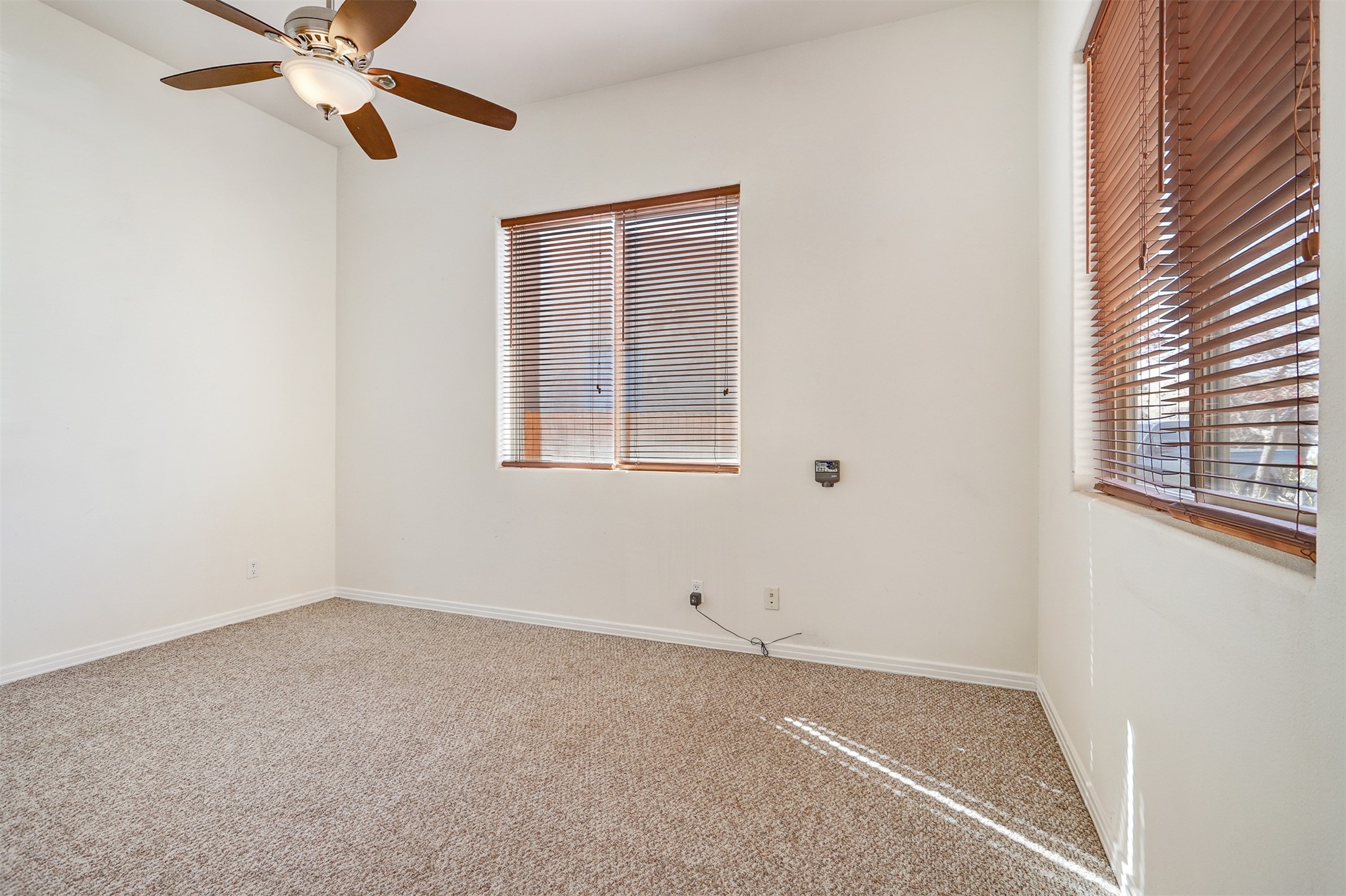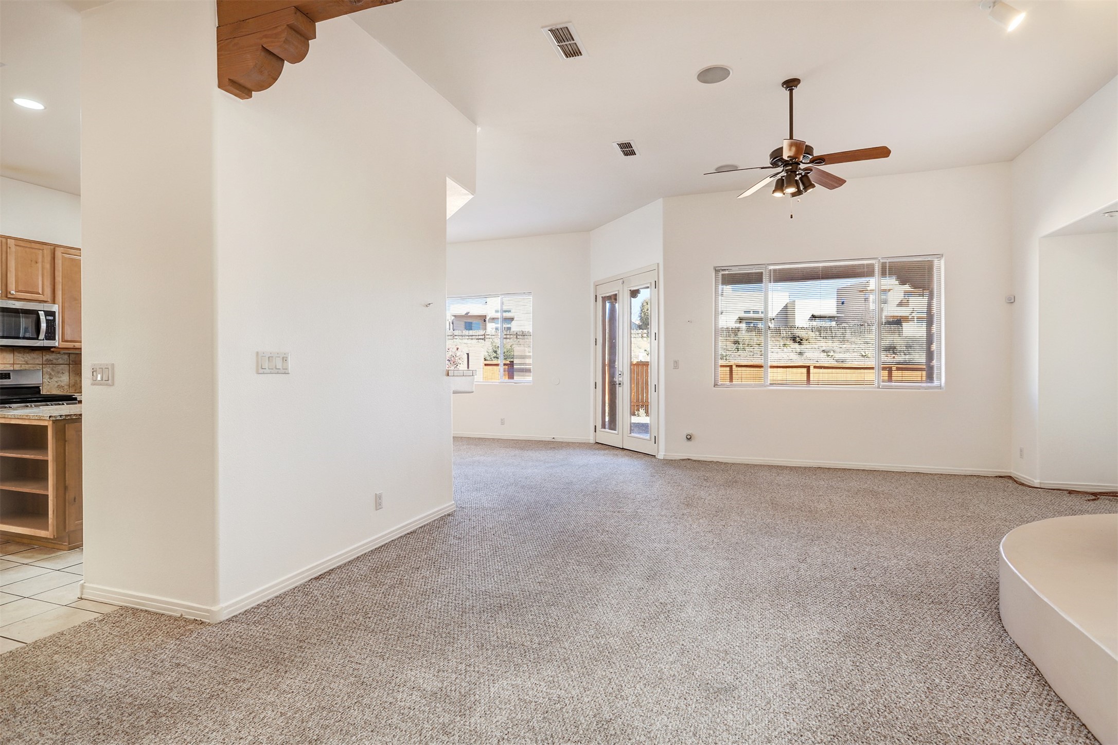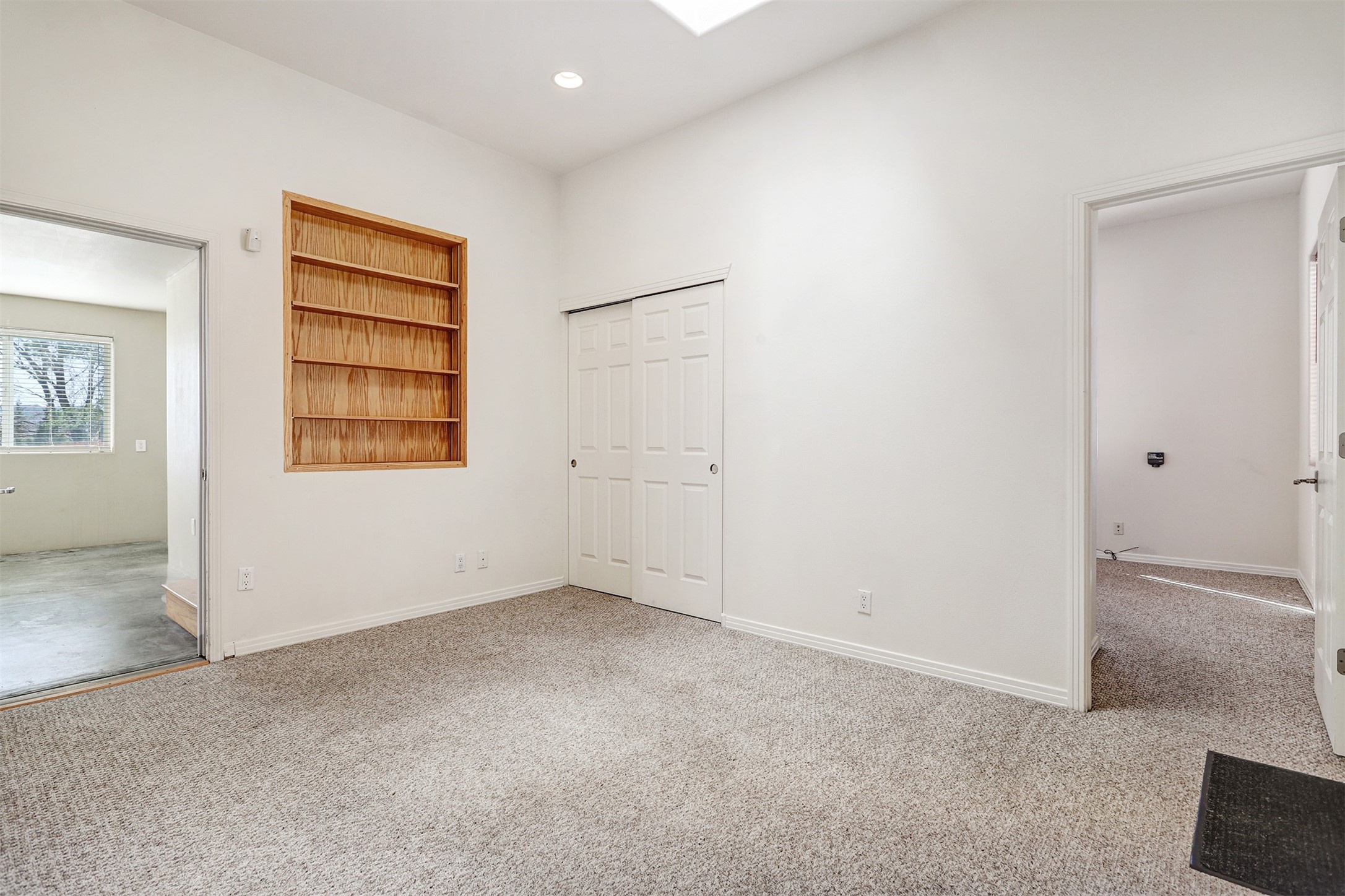 Welcome to this spacious and very well maintained 2,959 sq. ft. Pueblo-style home, offering four bedrooms, two bathrooms, and a 600 sq. ft. attached studio with a private entrance. Originally designed as an artist's space, the studio offers endless possibilities, making it ideal for a creative retreat, home office, or small business.This light-filled, single-level home features an open-concept design with a welcoming entryway, two illuminated Nichos, and a skylight that enhances its inviting ambiance. The living room boasts high ceilings, a gas Kiva fireplace, and a built-in speaker system, seamlessly flowing into the formal dining room. Patio doors open onto a covered portal, creating the perfect space for outdoor entertaining. The large, fully fenced backyard is landscaped with mature trees and a drip irrigation system, ensuring easy maintenance.The spacious kitchen is a culinary enthusiast's dream, featuring rich Alder cabinets, ample counter space, newer stainless steel appliances, and a center island with an eat-in area. A large pantry provides abundant storage, making this kitchen both functional and stylish.The generous primary suite offers two walk-in closets and direct access to the patio and outdoor entertaining spaces. The en-suite bathroom is designed for relaxation, complete with a soaking tub, a large shower, double sinks, and a skylight that fills the space with natural light. Additional bedrooms are located down the hallway, brightened by skylights and large windows with custom wood window treatments, and offer easy access to a full bathroom and the additional flex space.A finished and insulated two-car garage provides extra convenience, along with an advanced home security system for peace of mind. Freshly painted walls give the home a bright and refreshed feel, making it truly move-in ready. Conveniently located near community hiking trails, shopping centers, and schools, this home also offers easy freeway access for a smooth commute to Los Alamos and Albuquerque. Best of all, there are no HOA fees.