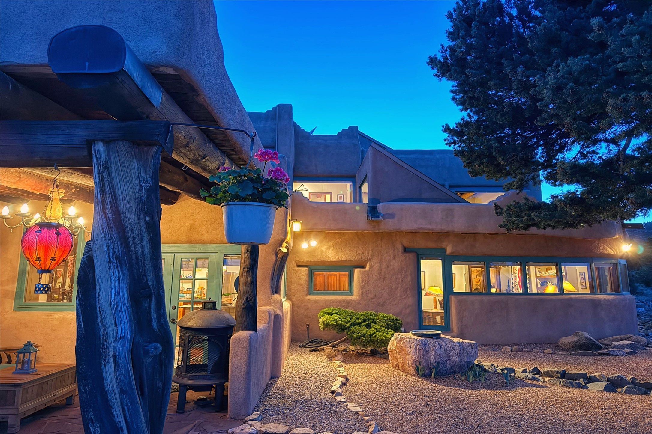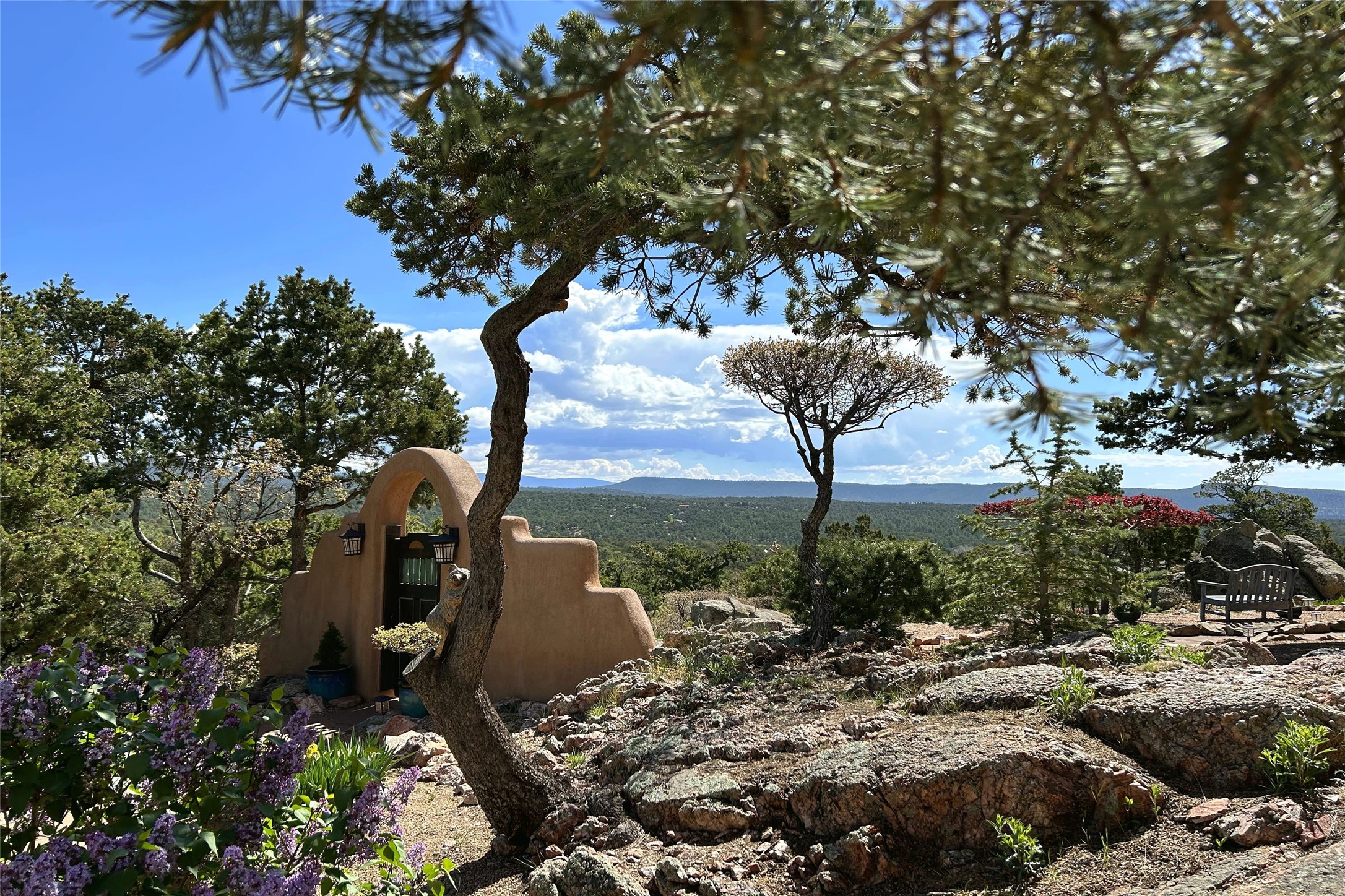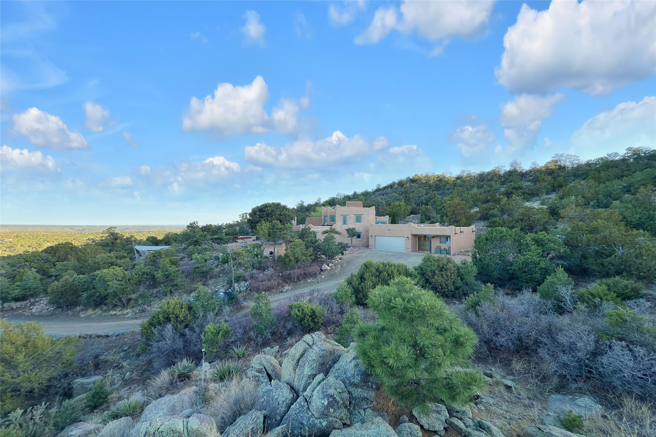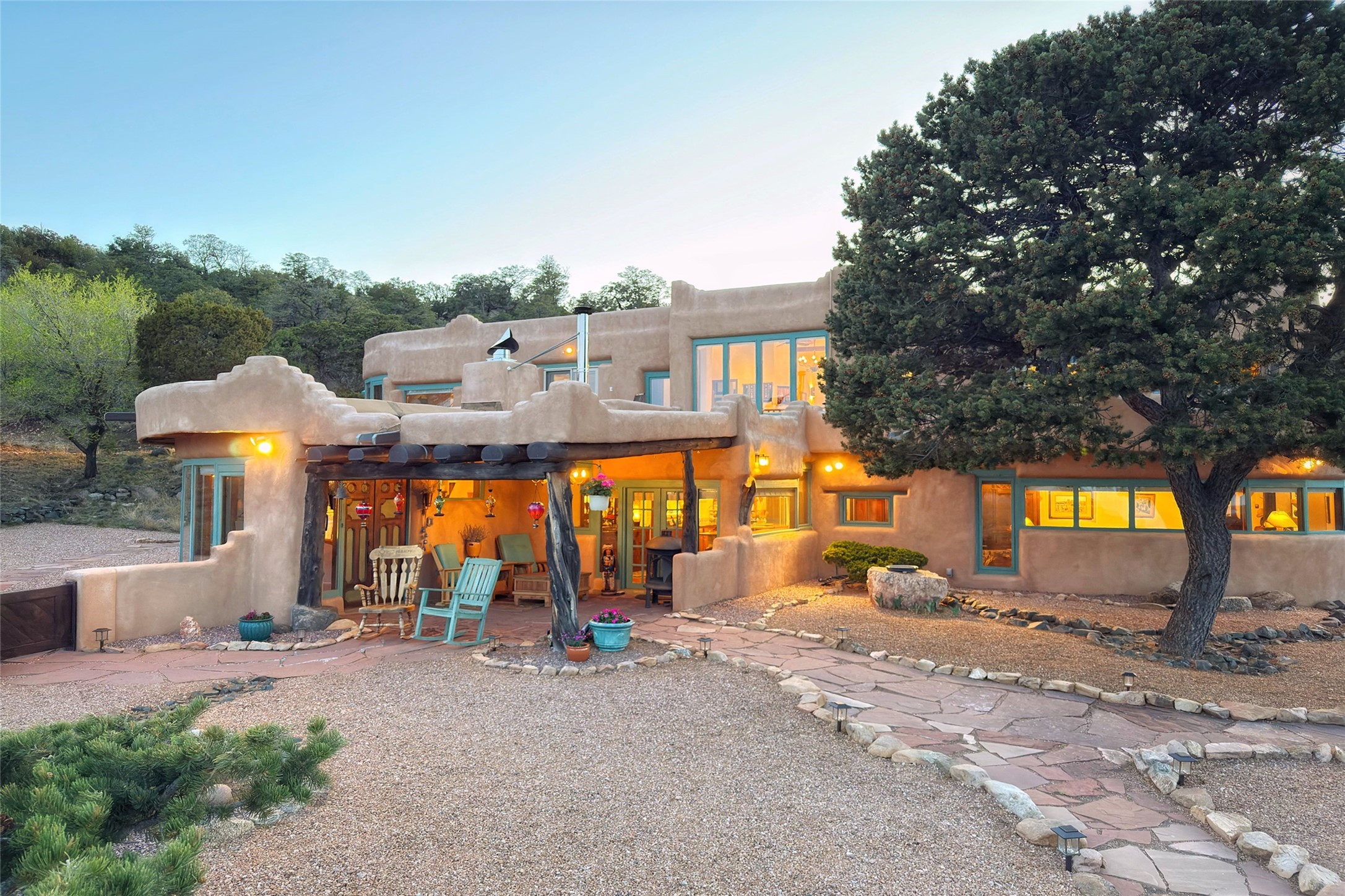 Discover a rare one-of-a-kind Hacienda w/ Studio on 6+ acres boasting dramatic rock outcroppings, sweeping views of Apache Ridge, Rowe Mesa and the Sangre de Cristos in a private pristine setting, just 20 minutes from the Santa Fe Plaza. Perched on a hillside to capture the breathtaking surroundings, this custom-built adobe Pueblo-style gem offers incredible craftsmanship, rounded architecture and unparalleled custom artisan touches. Soaring ceilings w/massive wood vigas throughout, exquisite Saltillo tile, cherry, hardwood and brick floors, rounded art walls curved arches, heavy antique carved doors, a walnut staircase, built-in bancos, recessed nichos, multiple portals and skylights abound. The current owners have thoughtfully renovated the house to add a sense of grand luxury. An added 2-car garage w/custom cabinetry includes an attached studio w/private entry. Follow the path to a small hobbit house-like hideaway to enjoy the exhilarating mountain air and views. Another path leads to a 2-3 stall barn/workshop.The floorplan moves effortlessly between indoor and outdoor living to showcase the arresting views and superb landscaping. The primary suite boasts a private deck, adjoiningsitting room w/curved window walls, custom closets, one cedar lined, a spa-like bath w/giant jetted soaking tub and private courtyard. The kitchen highlights rich cherryvcabinetry, wood-burning stove and opens to a spacious dining room w/patio. Rounded architecture flows seamlessly into the living room w/panoramic bays of passive-solar windows, bancos, a large Kiva wood-burning fireplace, and main portal access.Other spaces include an office, spacious media/family room, two additional bedrooms, one w/private entry and patio, a mudroom, plus a versatile flex room, ideal for an overflowbedroom. This home is truly an architectural wonder to experience. With its incredible craftsmanship, artisan details and never-ending vistas, 8 Hampton Road marries luxury w/privacy and historic charm.