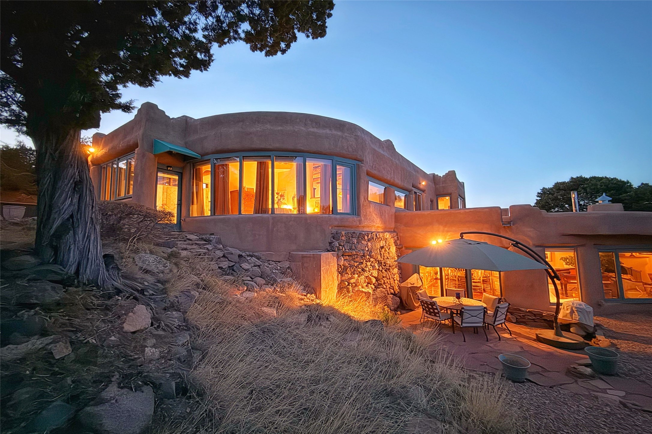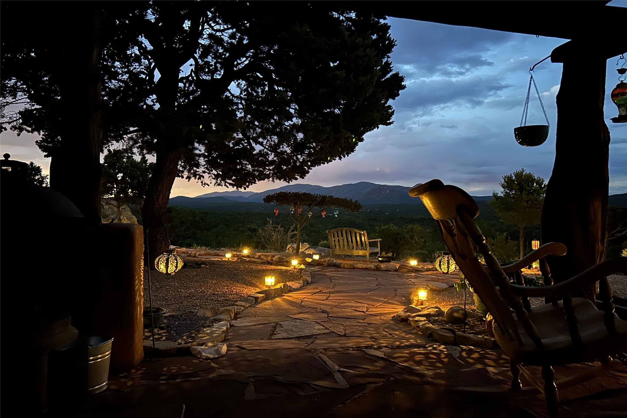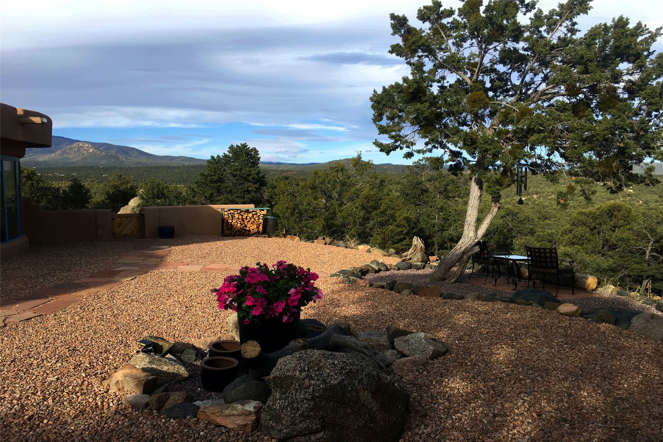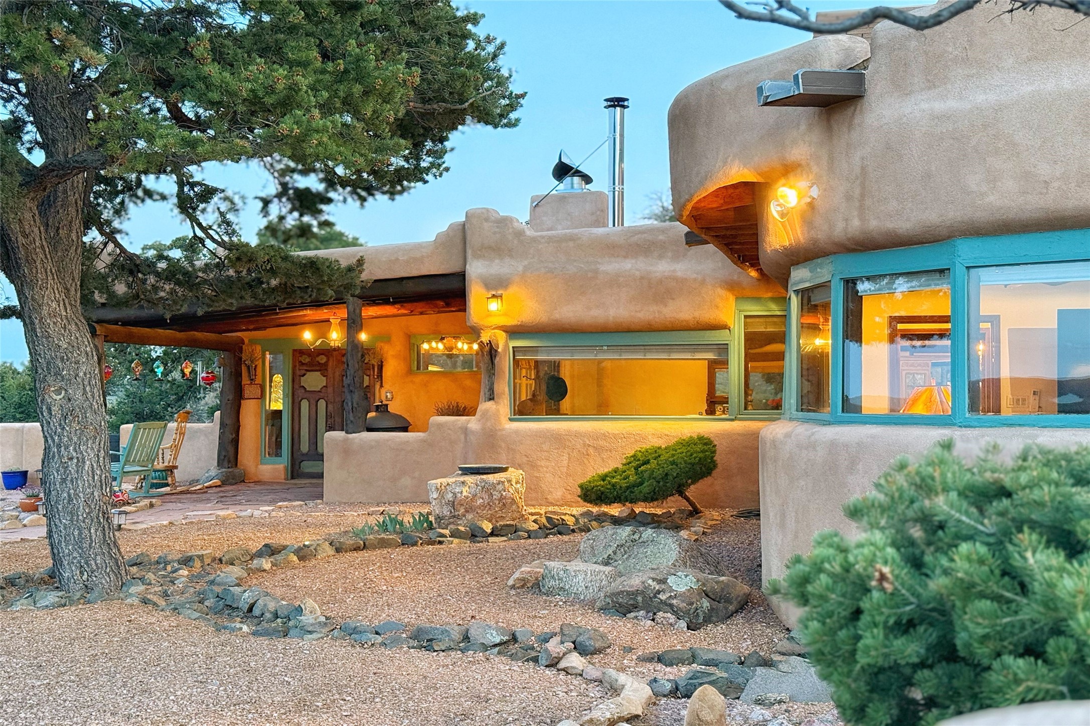 Discover a rare one-of-a-kind Hacienda w/ Studio on 6+ acres boasting dramatic rock outcroppings, sweeping views of Apache Ridge, Rowe Mesa and the Sangre de Cristos in a private pristine setting, just 20 minutes from the Santa Fe Plaza. Perched on a hillside to capture the breathtaking surroundings, this custom-built adobe Pueblo-style gem offers incredible craftsmanship, rounded architecture and unparalleled custom artisan touches. Soaring ceilings w/massive wood vigas throughout, exquisite Saltillo tile, cherry, hardwood and brick floors, rounded art walls curved arches, heavy antique carved doors, a walnut staircase, built-in bancos, recessed nichos, multiple portals and skylights abound. The current owners have thoughtfully renovated the house to add a sense of grand luxury. An added 2-car garage w/custom cabinetry includes an attached studio w/private entry. Follow the path to a small hobbit house-like hideaway to enjoy the exhilarating mountain air and views. Another path leads to a 2-3 stall barn/workshop.The floorplan moves effortlessly between indoor and outdoor living to showcase the arresting views and superb landscaping. The primary suite boasts a private deck, adjoiningsitting room w/curved window walls, custom closets, one cedar lined, a spa-like bath w/giant jetted soaking tub and private courtyard. The kitchen highlights rich cherryvcabinetry, wood-burning stove and opens to a spacious dining room w/patio. Rounded architecture flows seamlessly into the living room w/panoramic bays of passive-solar windows, bancos, a large Kiva wood-burning fireplace, and main portal access.Other spaces include an office, spacious media/family room, two additional bedrooms, one w/private entry and patio, a mudroom, plus a versatile flex room, ideal for an overflowbedroom. This home is truly an architectural wonder to experience. With its incredible craftsmanship, artisan details and never-ending vistas, 8 Hampton Road marries luxury w/privacy and historic charm.