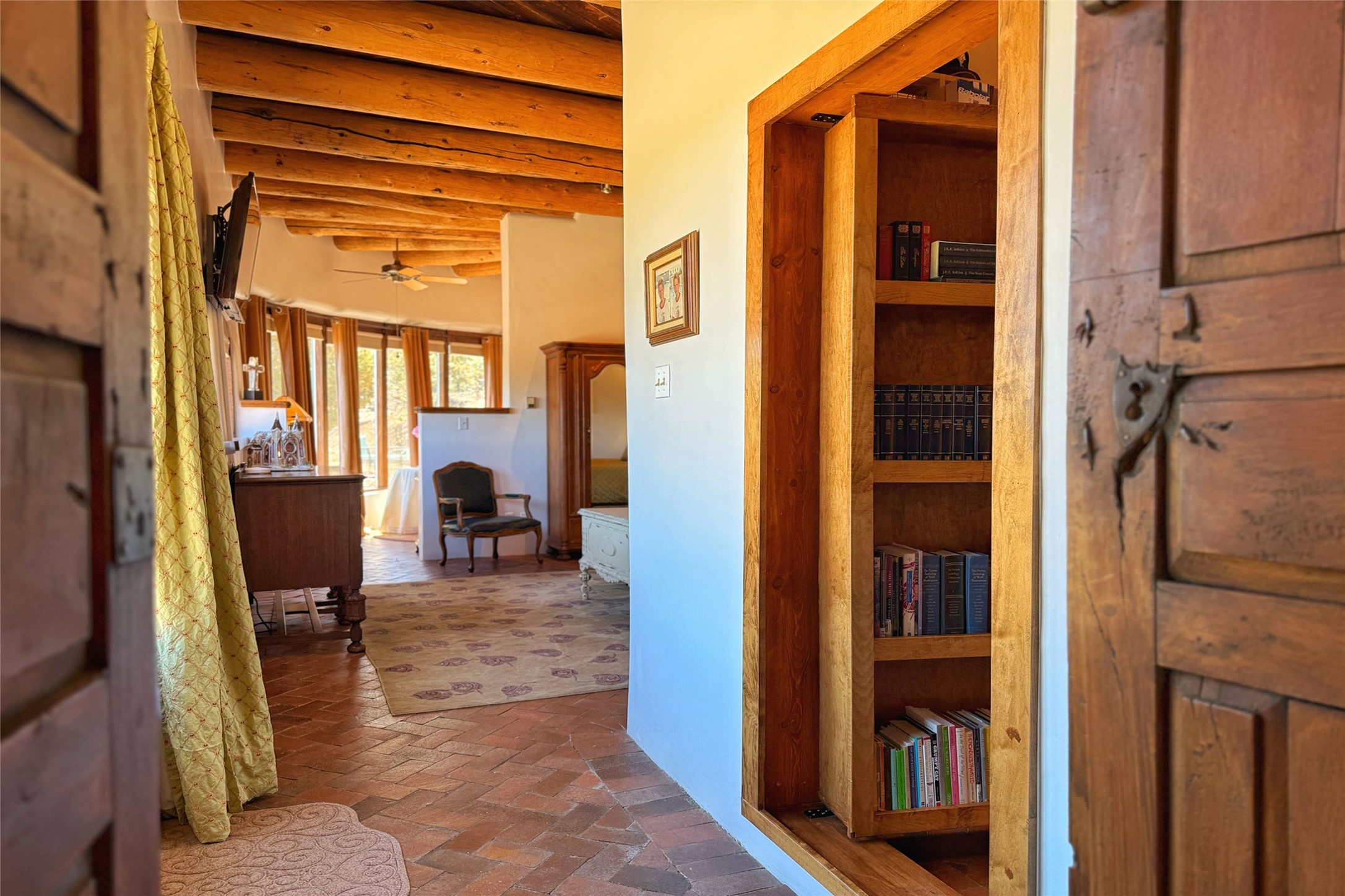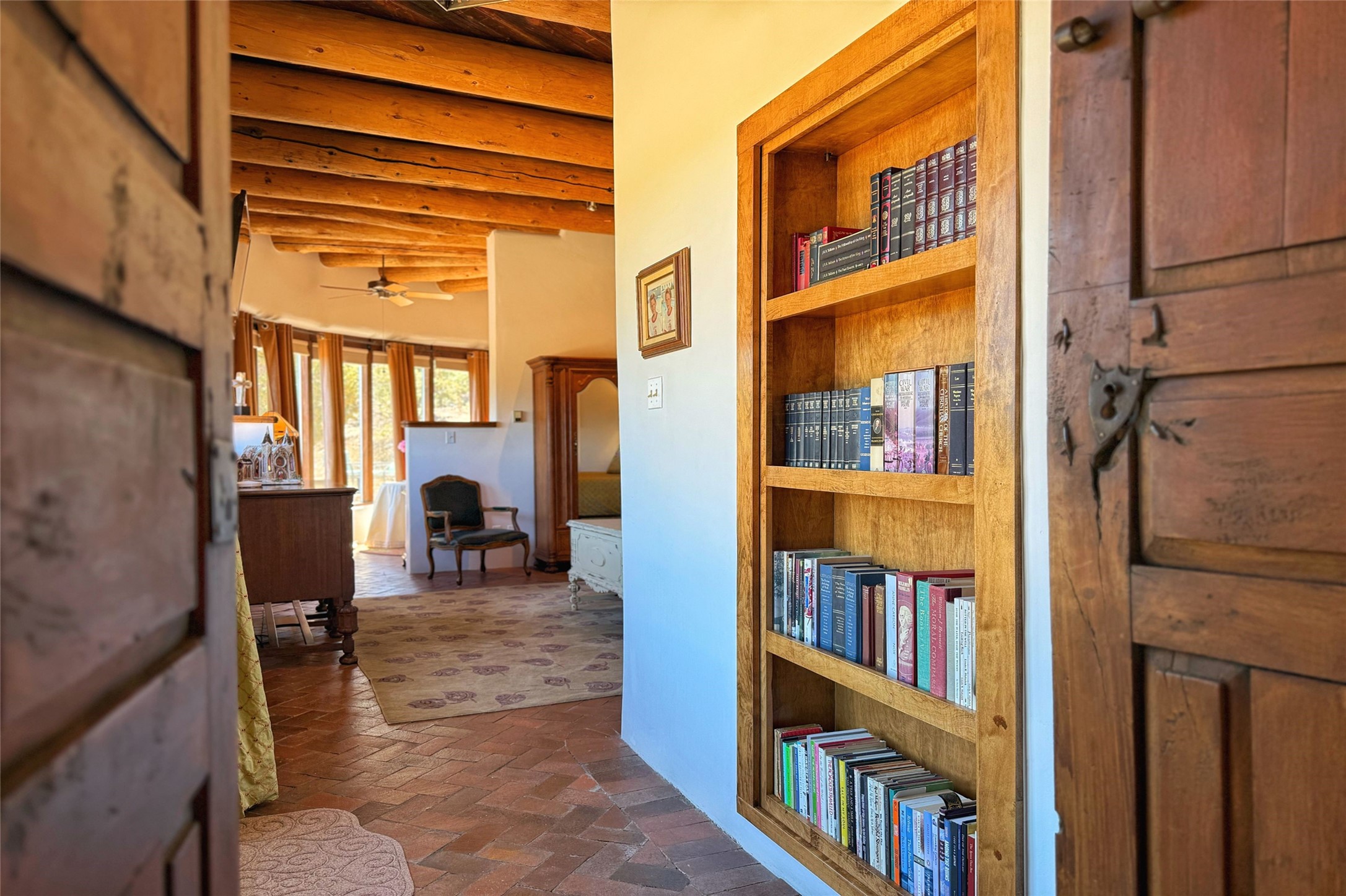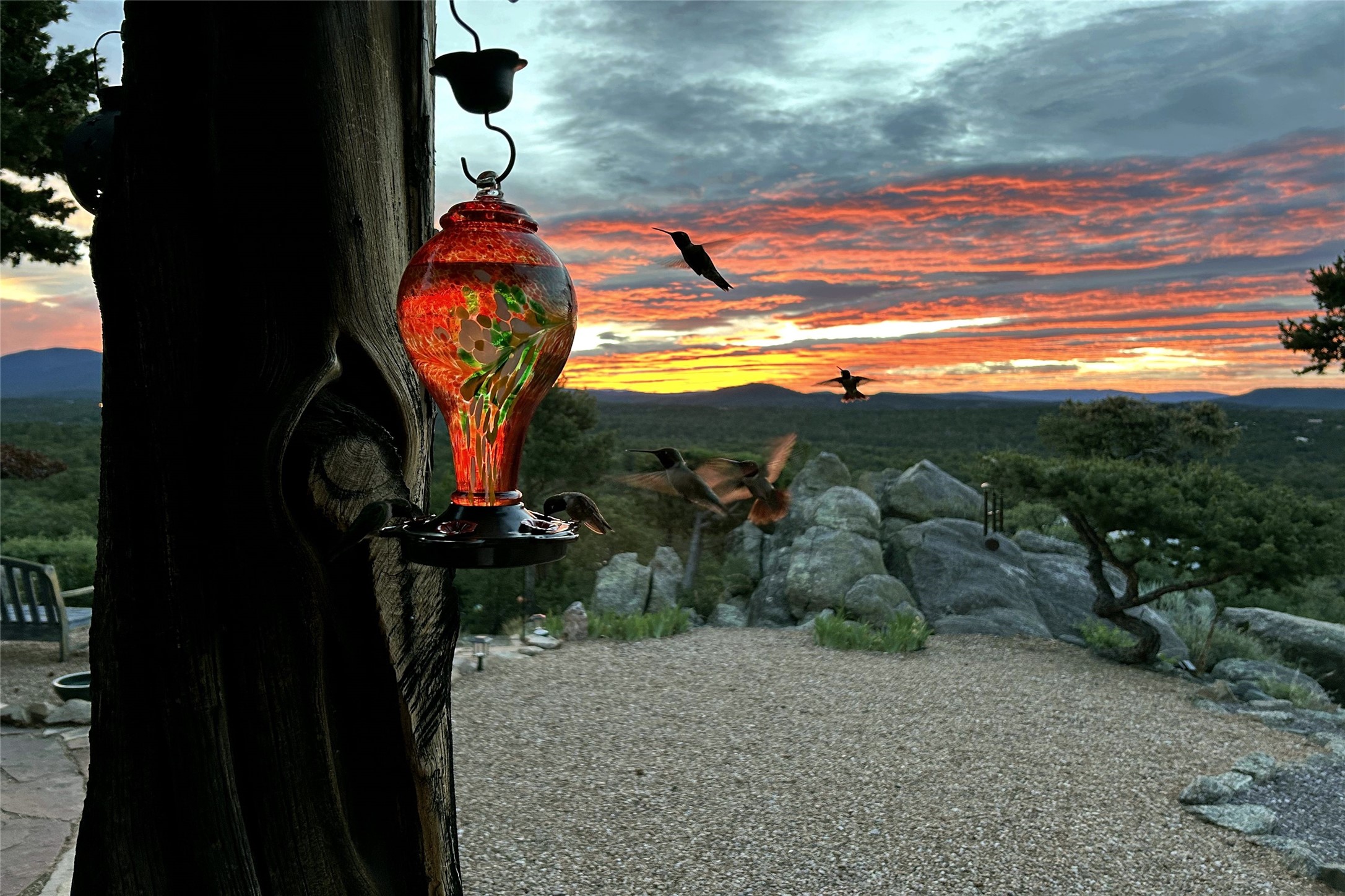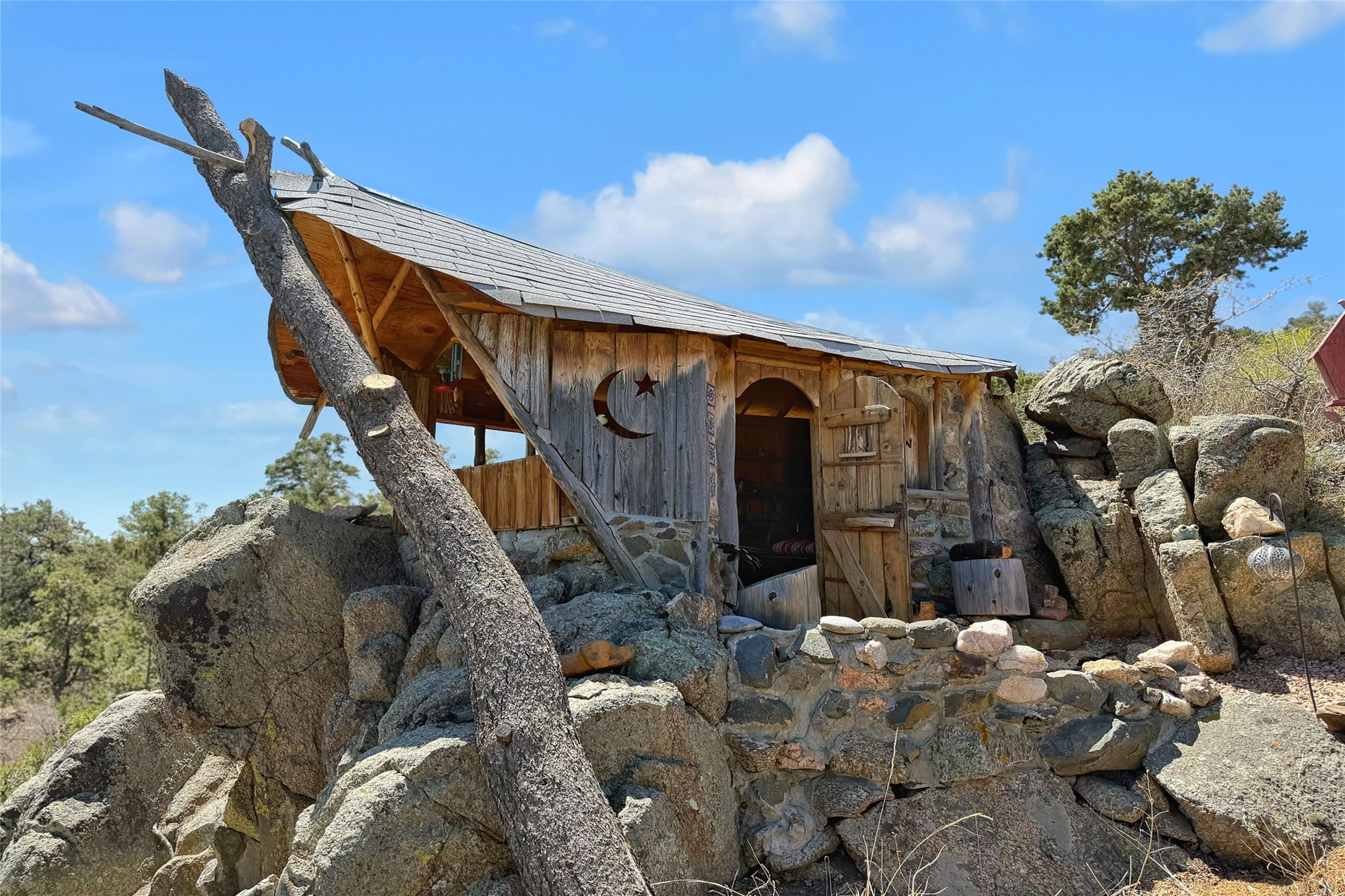 Discover a rare one-of-a-kind Hacienda w/ Studio on 6+ acres boasting dramatic rock outcroppings, sweeping views of Apache Ridge, Rowe Mesa and the Sangre de Cristos in a private pristine setting, just 20 minutes from the Santa Fe Plaza. Perched on a hillside to capture the breathtaking surroundings, this custom-built adobe Pueblo-style gem offers incredible craftsmanship, rounded architecture and unparalleled custom artisan touches. Soaring ceilings w/massive wood vigas throughout, exquisite Saltillo tile, cherry, hardwood and brick floors, rounded art walls curved arches, heavy antique carved doors, a walnut staircase, built-in bancos, recessed nichos, multiple portals and skylights abound. The current owners have thoughtfully renovated the house to add a sense of grand luxury. An added 2-car garage w/custom cabinetry includes an attached studio w/private entry. Follow the path to a small hobbit house-like hideaway to enjoy the exhilarating mountain air and views. Another path leads to a 2-3 stall barn/workshop.The floorplan moves effortlessly between indoor and outdoor living to showcase the arresting views and superb landscaping. The primary suite boasts a private deck, adjoiningsitting room w/curved window walls, custom closets, one cedar lined, a spa-like bath w/giant jetted soaking tub and private courtyard. The kitchen highlights rich cherryvcabinetry, wood-burning stove and opens to a spacious dining room w/patio. Rounded architecture flows seamlessly into the living room w/panoramic bays of passive-solar windows, bancos, a large Kiva wood-burning fireplace, and main portal access.Other spaces include an office, spacious media/family room, two additional bedrooms, one w/private entry and patio, a mudroom, plus a versatile flex room, ideal for an overflowbedroom. This home is truly an architectural wonder to experience. With its incredible craftsmanship, artisan details and never-ending vistas, 8 Hampton Road marries luxury w/privacy and historic charm.