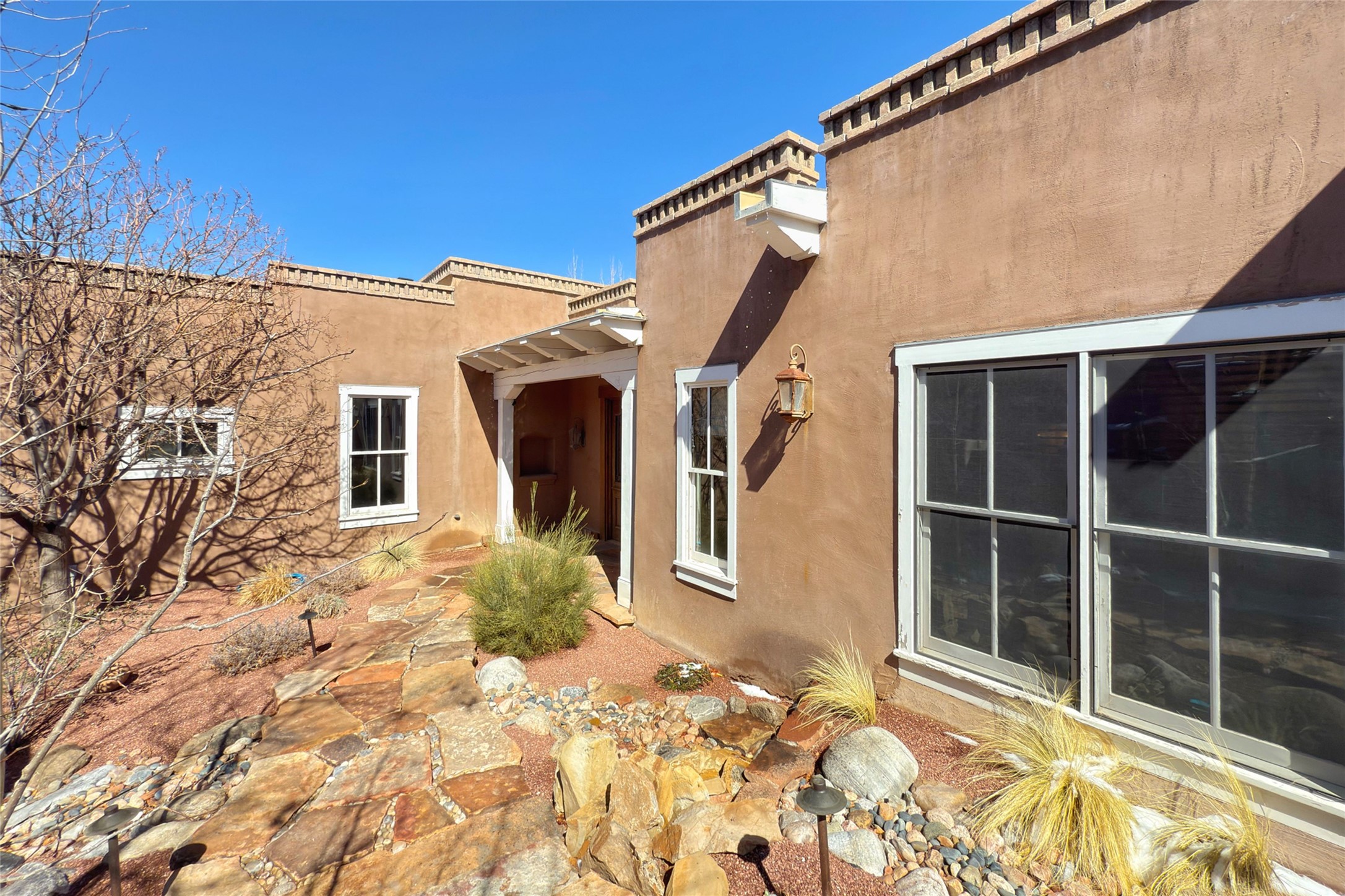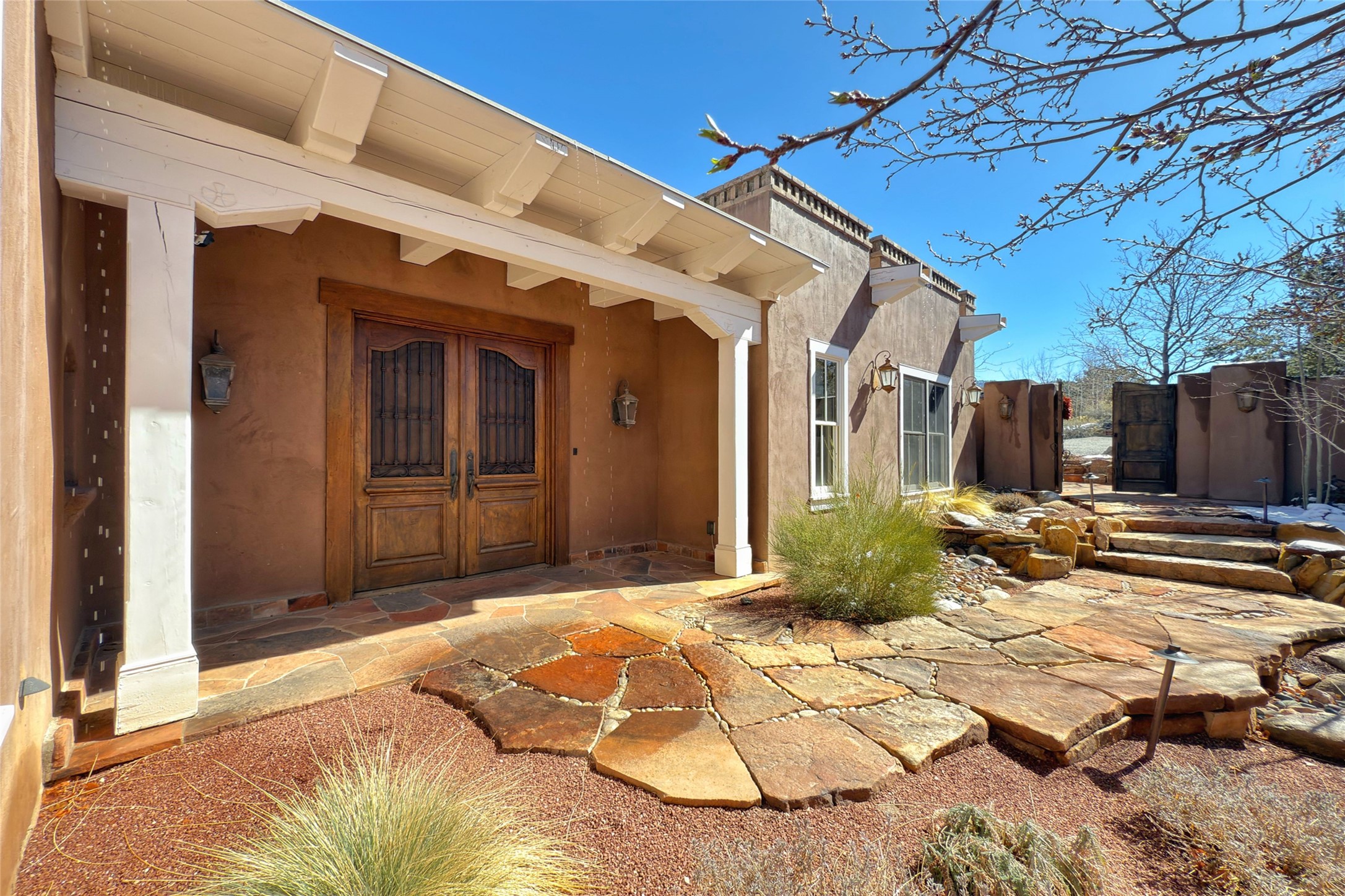 This is a rare opportunity to own a custom-built home in the heart of Santa Fe's cherished Historic Eastside. This elegant territorial-style residence offers sweeping views of the Jemez Mountains' breathtaking sunsets and is perfectly positioned just a short stroll from the famed Canyon Road. Built in 2008, this home features high-insulation pumice-crete construction that beautifully replicates the look and feel of traditional stacked adobe. Every element of the home reflects an unwavering commitment to quality and meticulous attention to detail. The home's three bedrooms, each with its own ensuite bath, provide a harmonious balance of privacy and comfort. In addition, there is an office with a private entrance. The main living areas are conveniently located on one floor, while the lower level is dedicated to guest quarters and a media room. Distressed floors offer a rich, inviting foundation, while handcrafted reclaimed wood doors and intricately carved posts, beams, and corbels evoke the timeless beauty of the territorial style. At the heart of the home lies a gourmet kitchen outfitted with Wolf and Sub-Zero appliances, a butler's pantry, and a wet bar. A private courtyard provides a serene entry, while the expansive wrap-around rear portal framed by a wall of windows, offers an unparalleled vantage point for taking in the majestic mountain vistas with a landscaped garden and fire pit with seating.