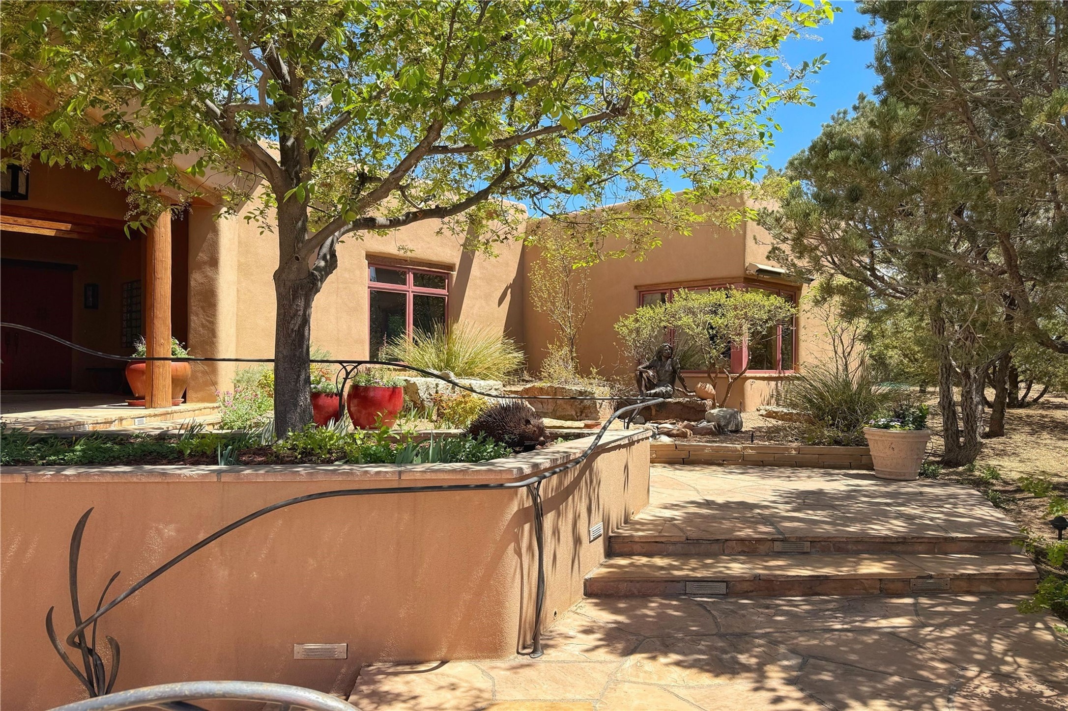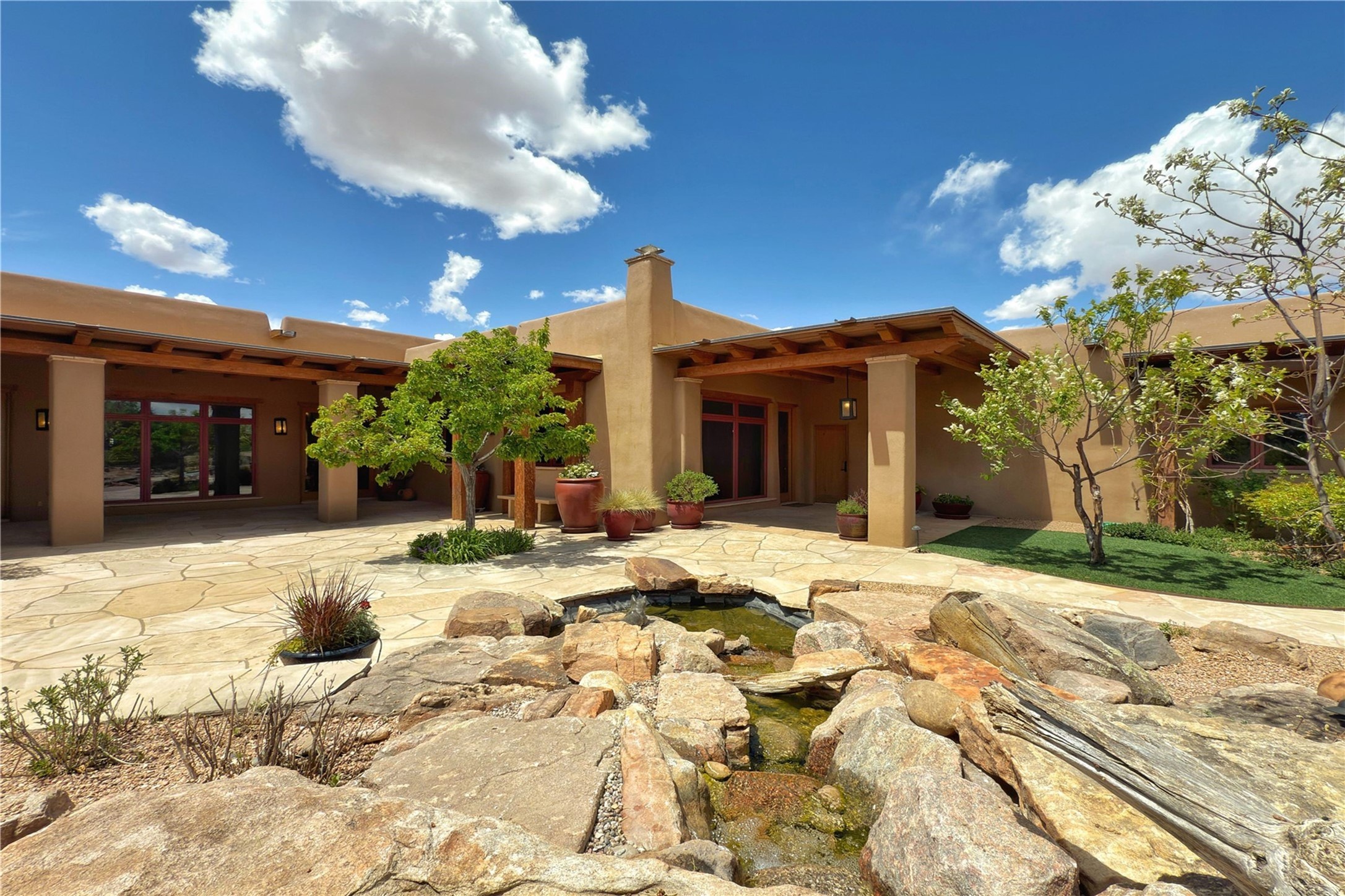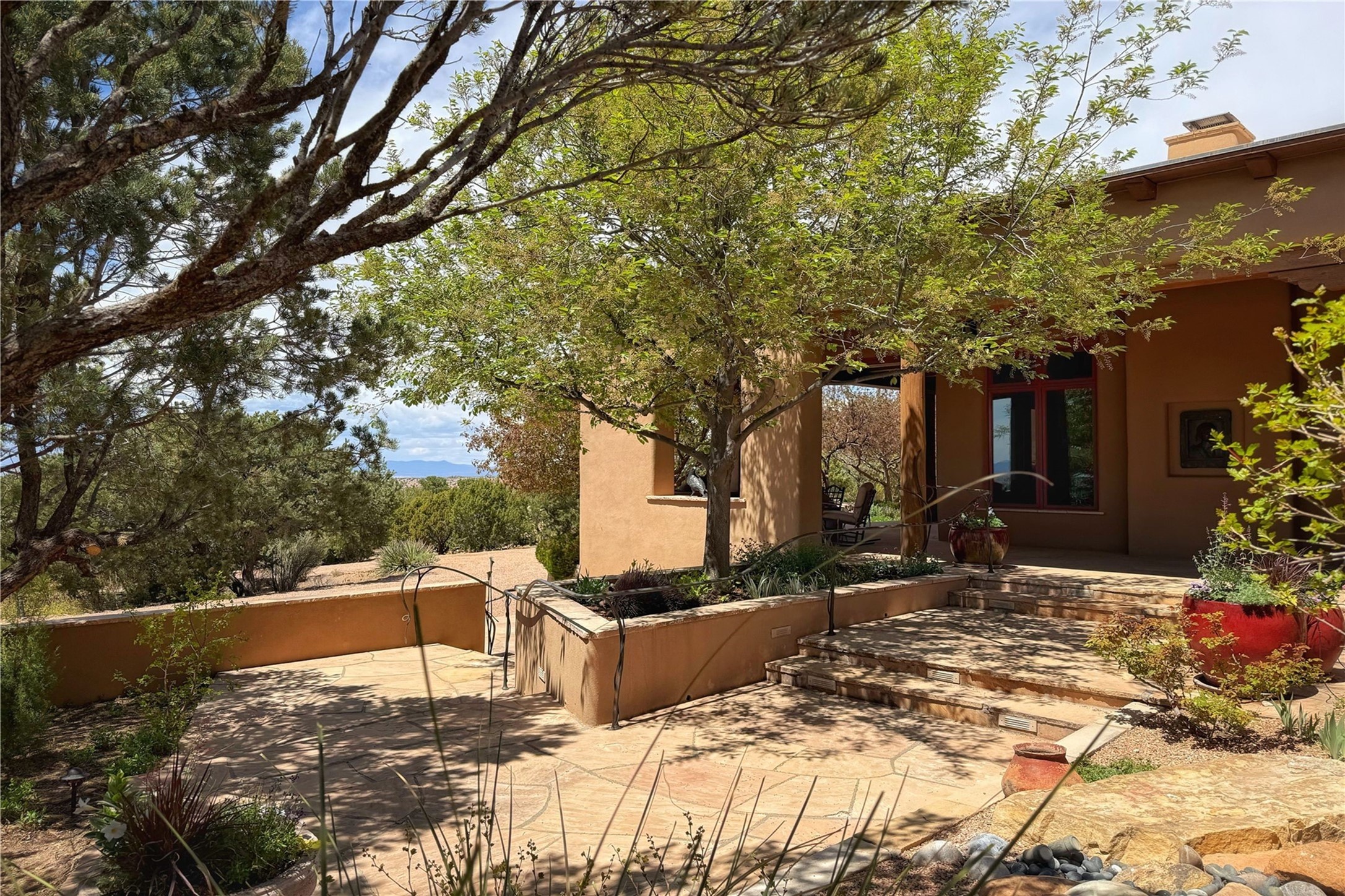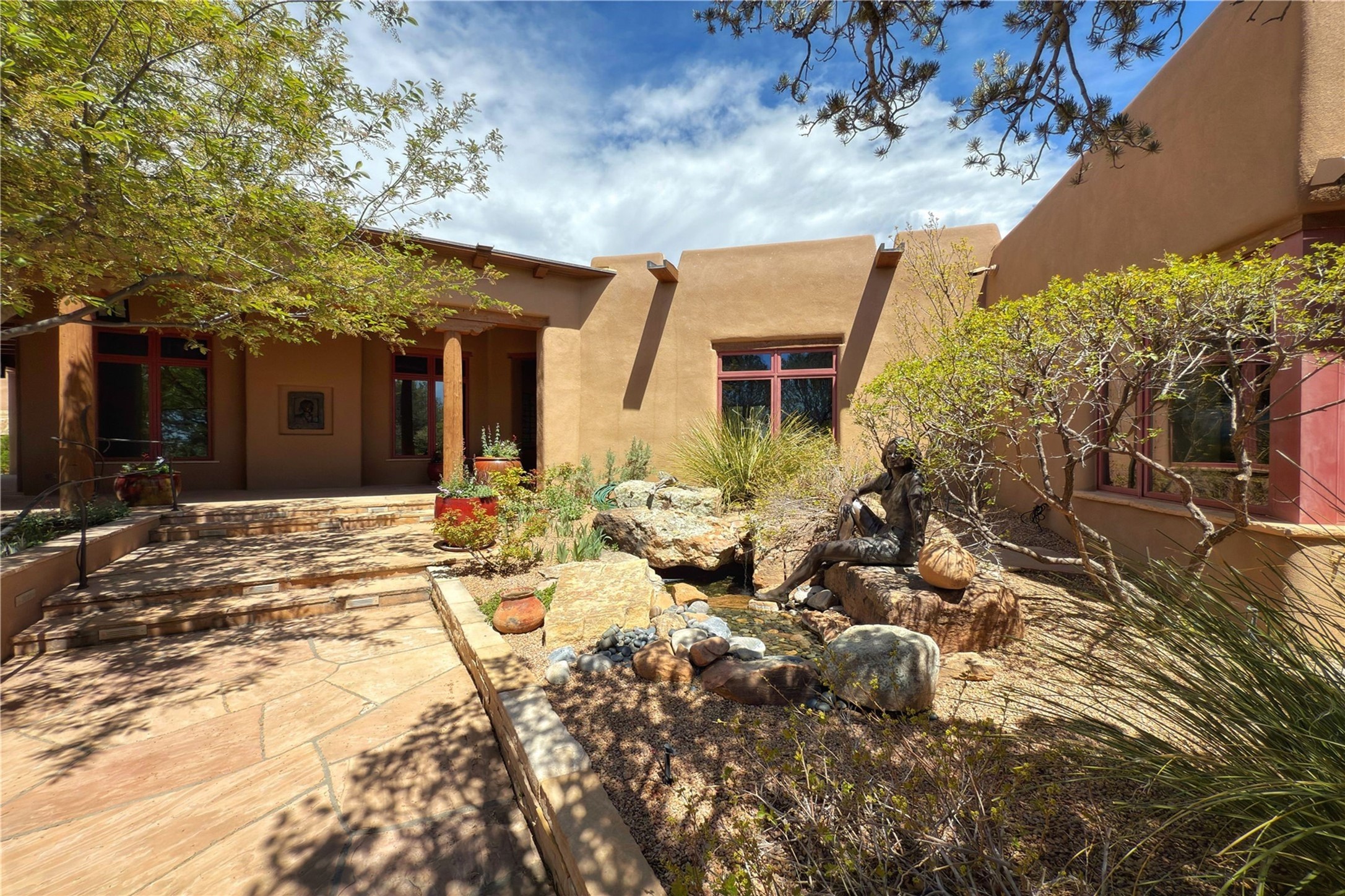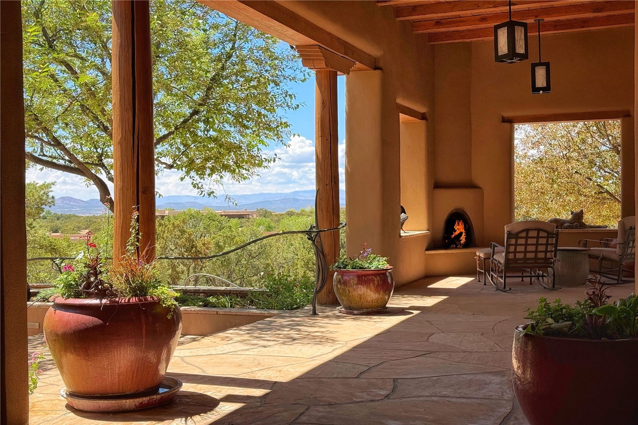 Welcome to a stunning Southwest-style home offering the perfect blend of elegance, warmth, and artistic expression. Built on an elevated lot to capture breathtaking Jemez Mountain views, this property is ideal for showcasing your art collection and entertaining in Santa Fe style.Warm earth tones complement the vigas and stone floors, creating a soft contemporary Southwest ambiance with timeless charm. A pond welcomes you and leads you to the wrap-around portal, complete with wood-burning fireplace, perfect for large gatherings. Enter through double Spanish doors that create a dramatic entry, setting the tone for the home. The foyer offers direct views to the back garden. Flow easily into the grand living room, featuring mountain views, wood-burning kiva fireplace, and cozy Banco seating. Made for entertaining, this home includes an elegant dining room with built-in cabinetry and portal access. The massive kitchen has an equally massive island, sitting room, and gas fireplace. The built in storage is impressive. The kitchen leads into the back garden with waterfall feature. 45 Violet Circle features an office, large media room and separate family room, for extra work, entertainment and relaxation spaces. A gas fireplace and large windows in the spacious primary suite highlight the back garden. The primary bath has his/hers showers and toilets. The primary closet is home to a walk in safe. Adjacent to the suite is a bonus/rec room with access to an underground space, perfect to turn into a dedicated wine cellar. The separate casita boasts high ceilings, decorative tiles, and a gas fireplace. Exquisite landscaping showcases 3 water features, adding elegance and peacefulness. This residence is designed around multiple outdoor spaces for true indoor/outdoor living.With the water feature sounds, art displays spaces, and large rooms, this home is peaceful, impressive and substantial.Please note, fires in fireplaces may be digitally added