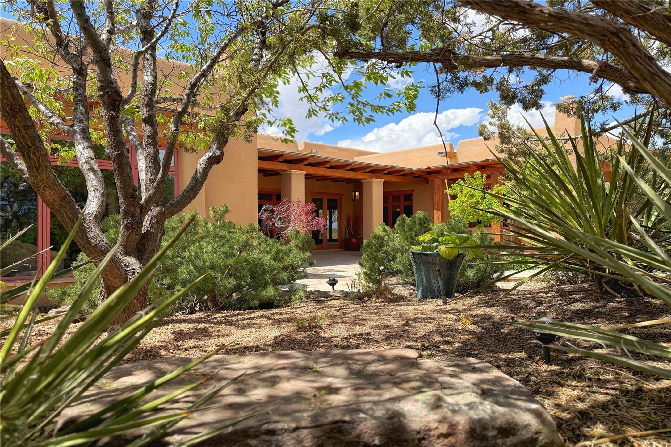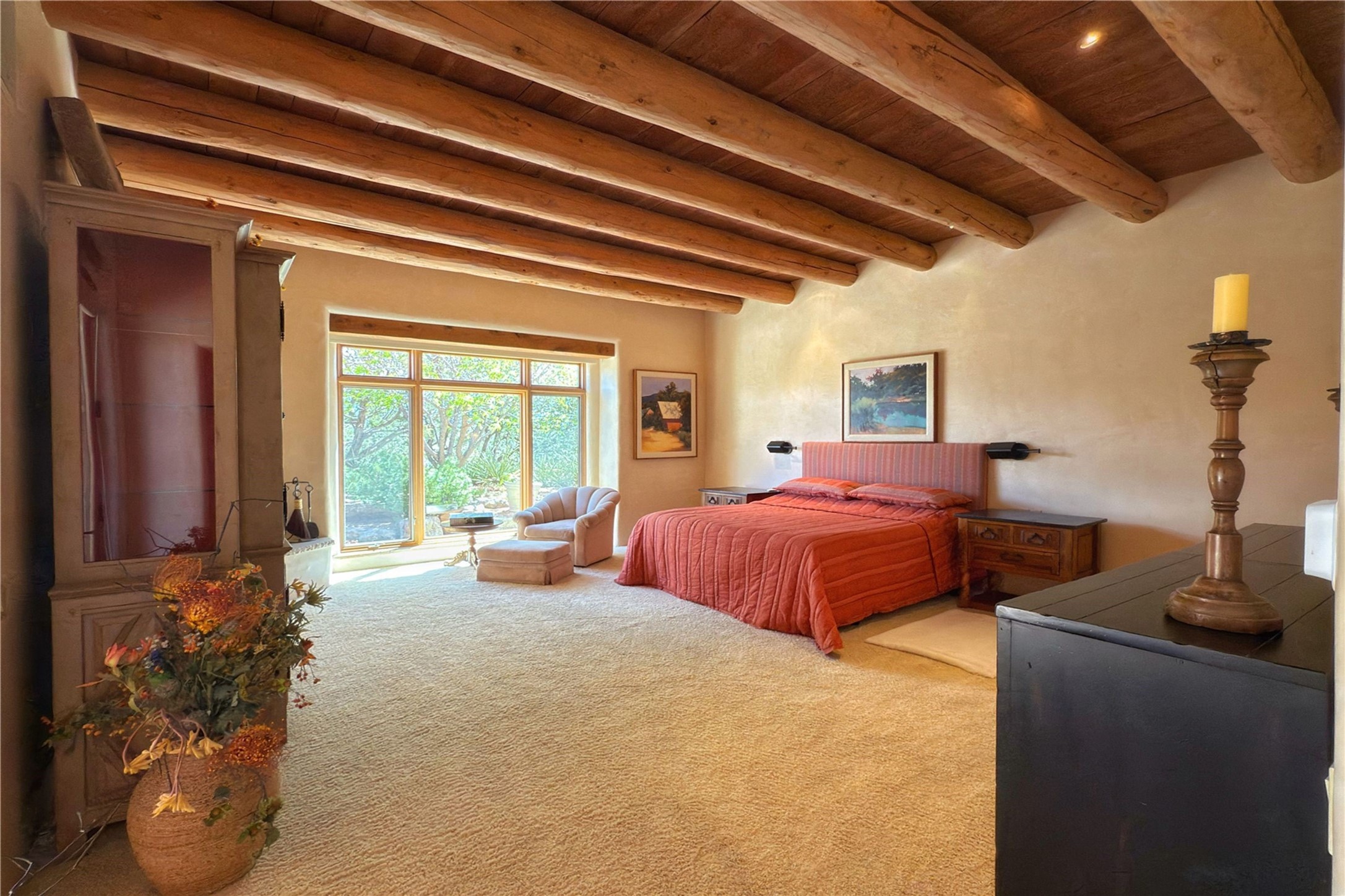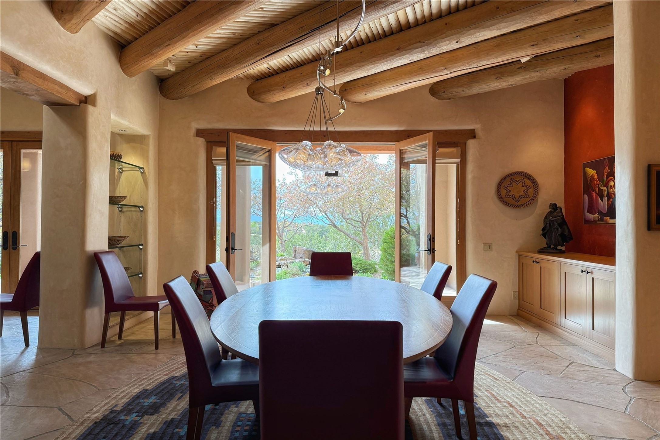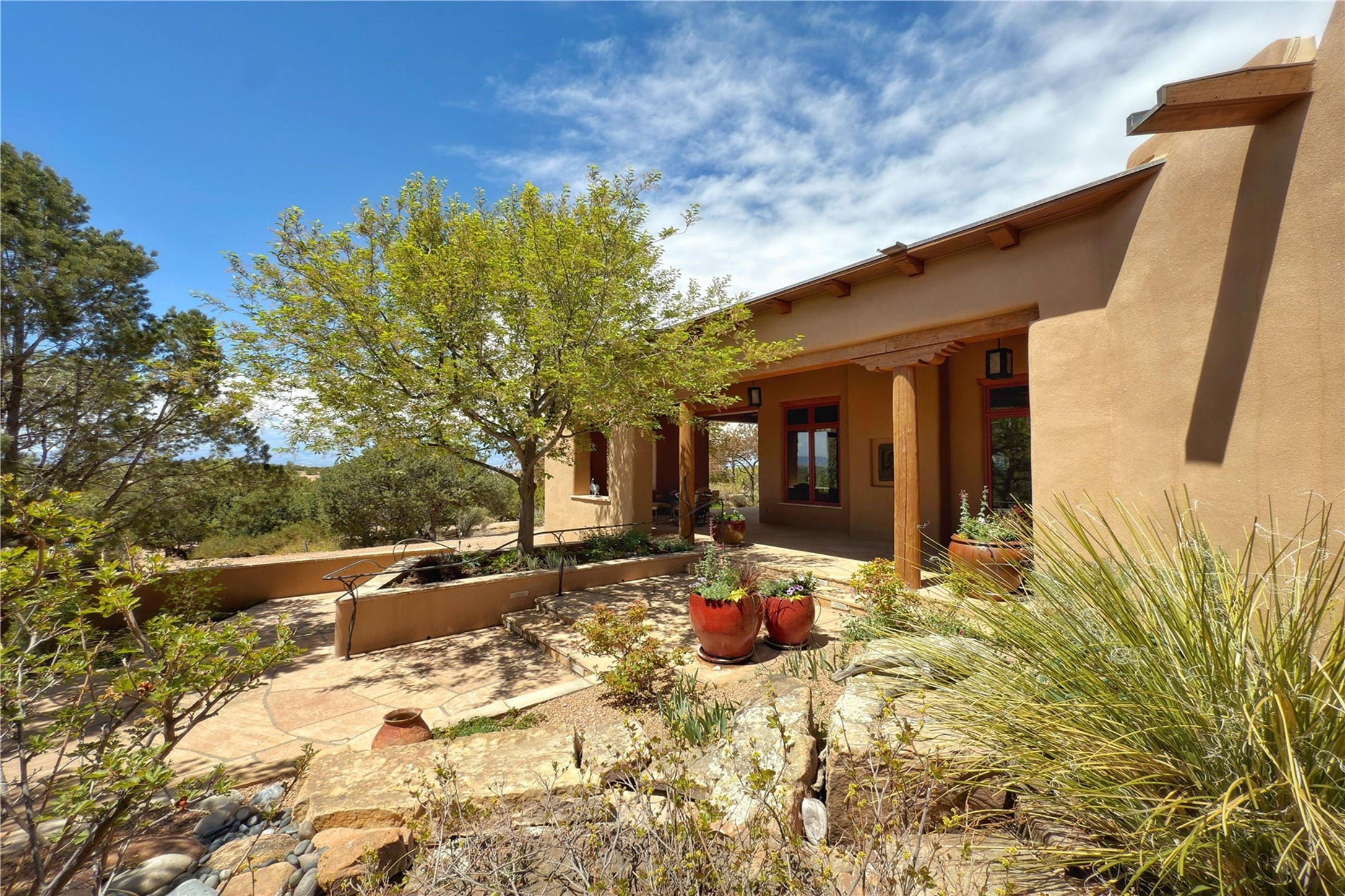 Welcome to a stunning Southwest-style home offering the perfect blend of elegance, warmth, and artistic expression. Built on an elevated lot to capture breathtaking Jemez Mountain views, this property is ideal for showcasing your art collection and entertaining in Santa Fe style.Warm earth tones complement the vigas and stone floors, creating a soft contemporary Southwest ambiance with timeless charm. A pond welcomes you and leads you to the wrap-around portal, complete with wood-burning fireplace, perfect for large gatherings. Enter through double Spanish doors that create a dramatic entry, setting the tone for the home. The foyer offers direct views to the back garden. Flow easily into the grand living room, featuring mountain views, wood-burning kiva fireplace, and cozy Banco seating. Made for entertaining, this home includes an elegant dining room with built-in cabinetry and portal access. The massive kitchen has an equally massive island, sitting room, and gas fireplace. The built in storage is impressive. The kitchen leads into the back garden with waterfall feature. 45 Violet Circle features an office, large media room and separate family room, for extra work, entertainment and relaxation spaces. A gas fireplace and large windows in the spacious primary suite highlight the back garden. The primary bath has his/hers showers and toilets. The primary closet is home to a walk in safe. Adjacent to the suite is a bonus/rec room with access to an underground space, perfect to turn into a dedicated wine cellar. The separate casita boasts high ceilings, decorative tiles, and a gas fireplace. Exquisite landscaping showcases 3 water features, adding elegance and peacefulness. This residence is designed around multiple outdoor spaces for true indoor/outdoor living.With the water feature sounds, art displays spaces, and large rooms, this home is peaceful, impressive and substantial.Please note, fires in fireplaces may be digitally added