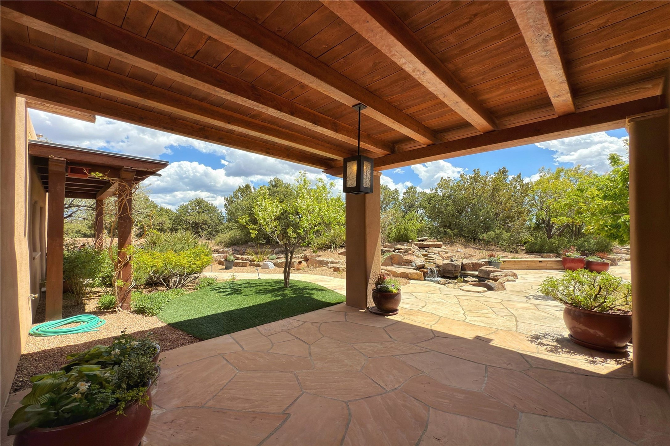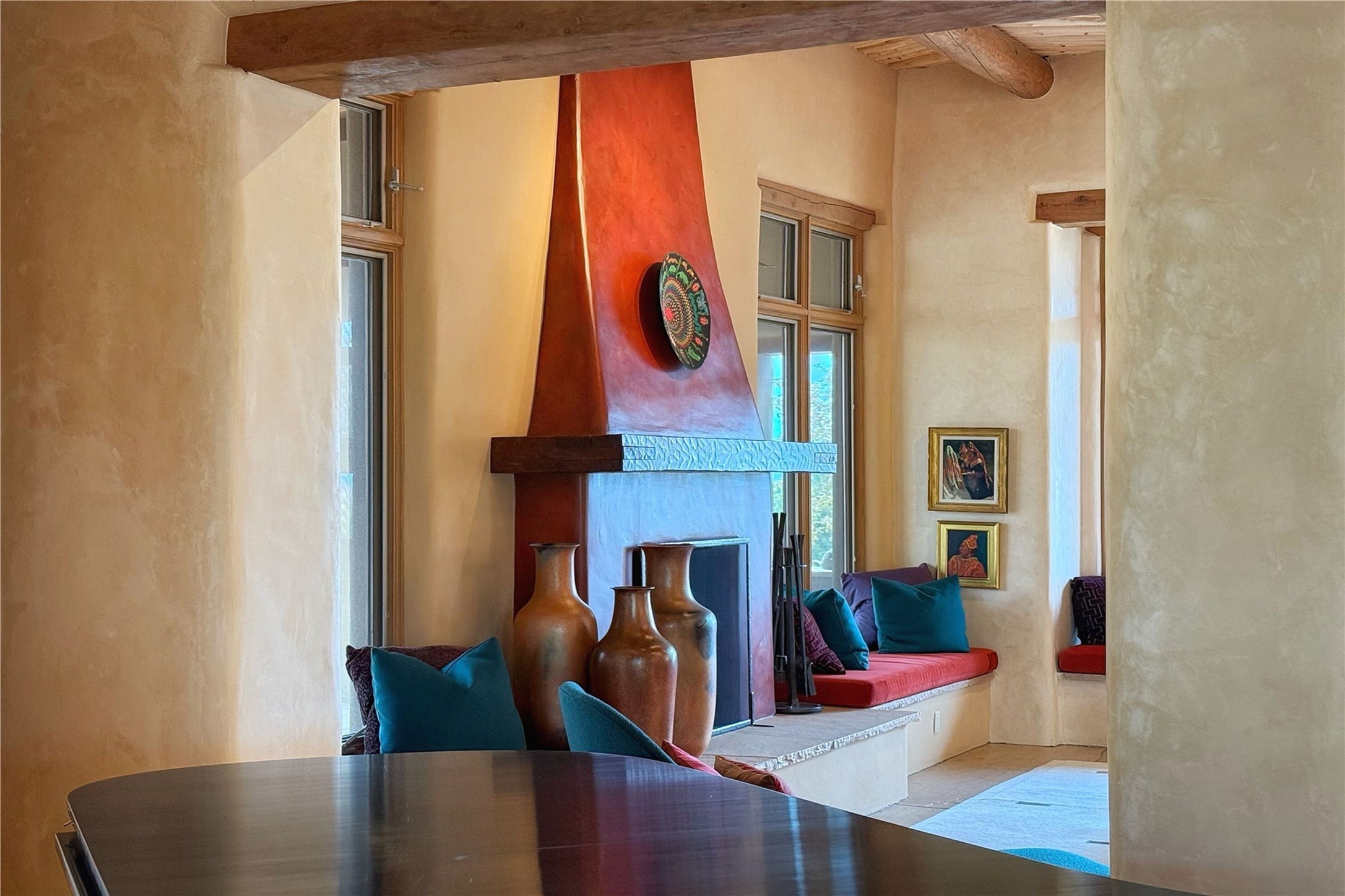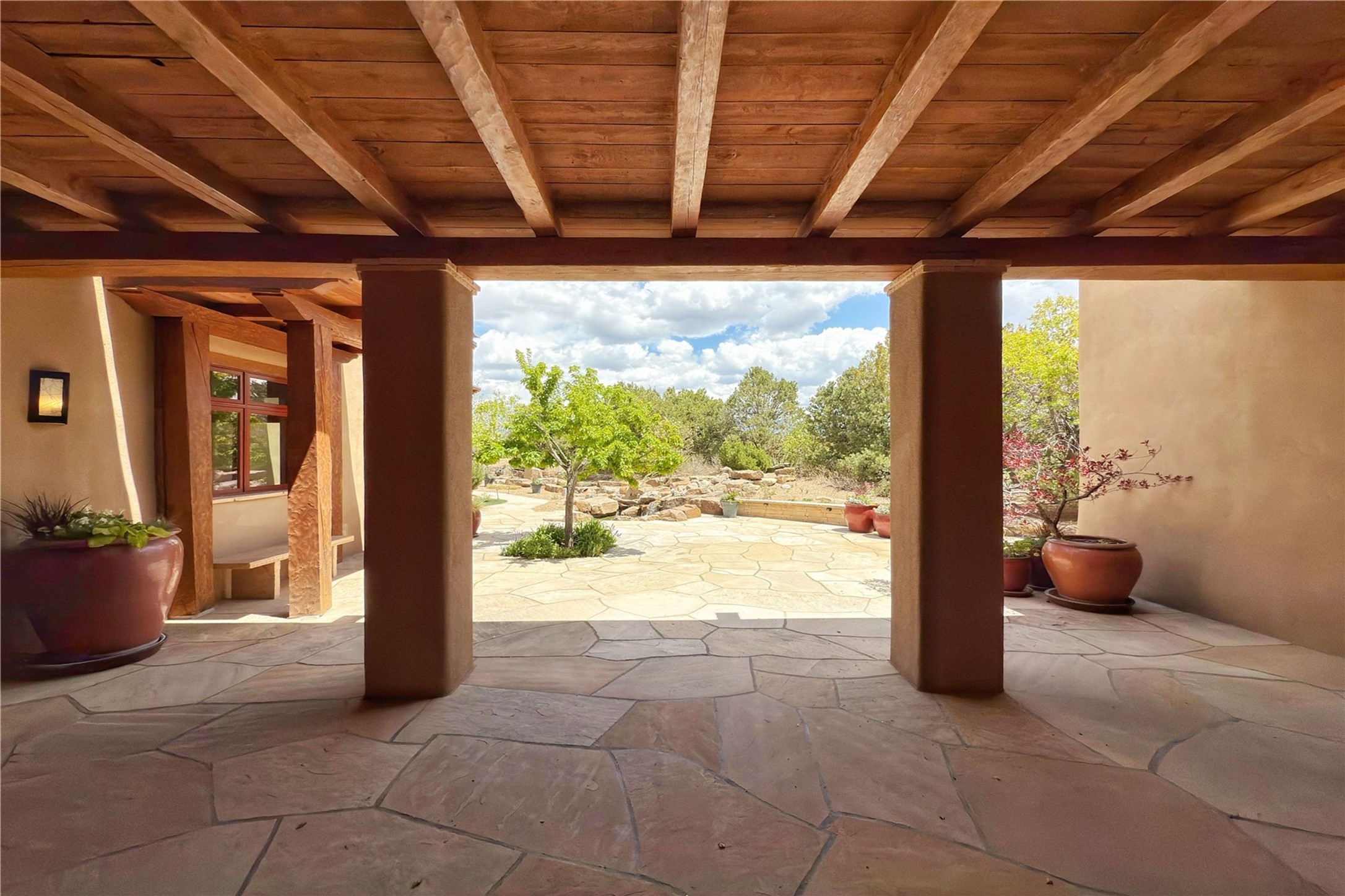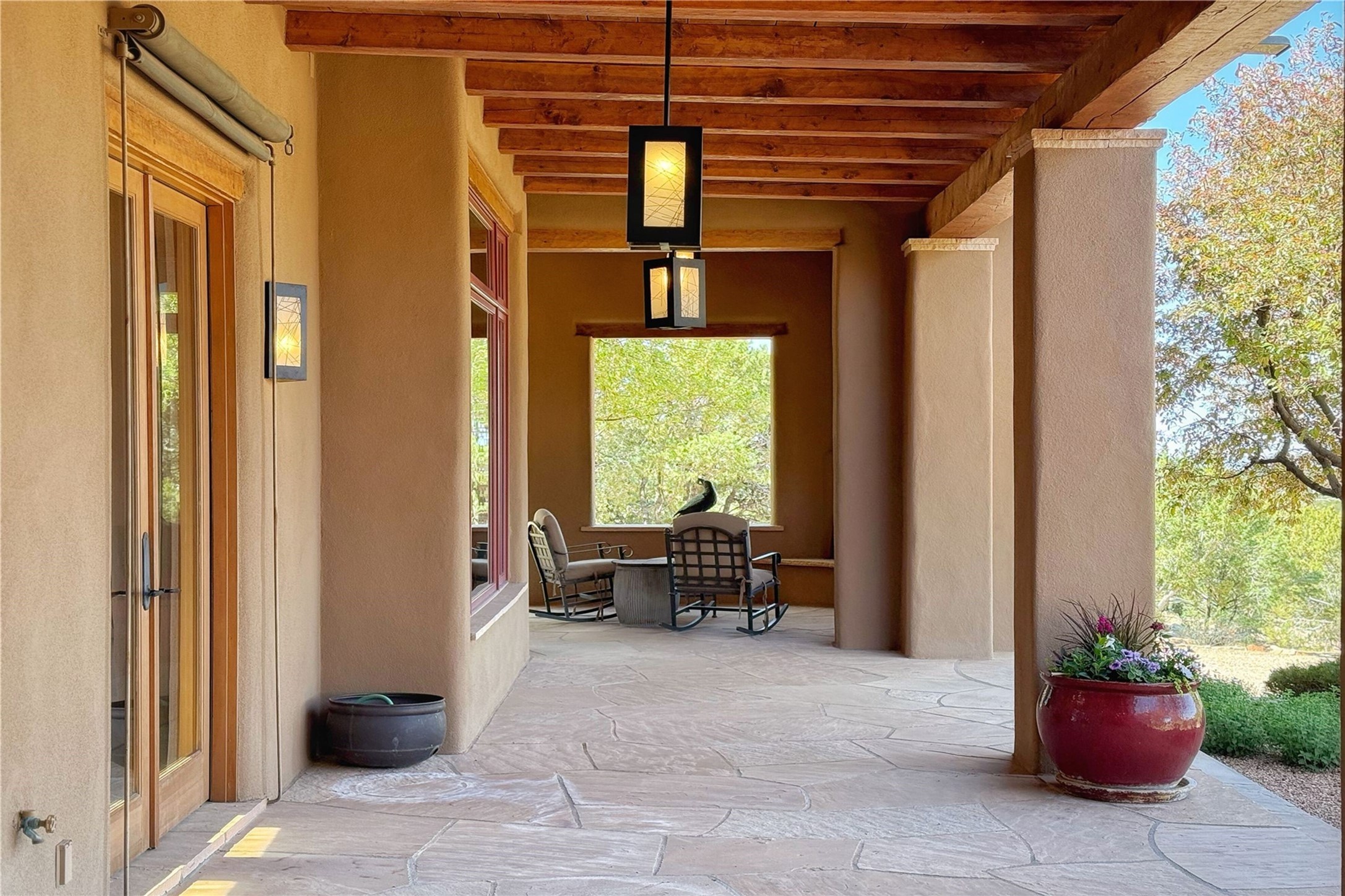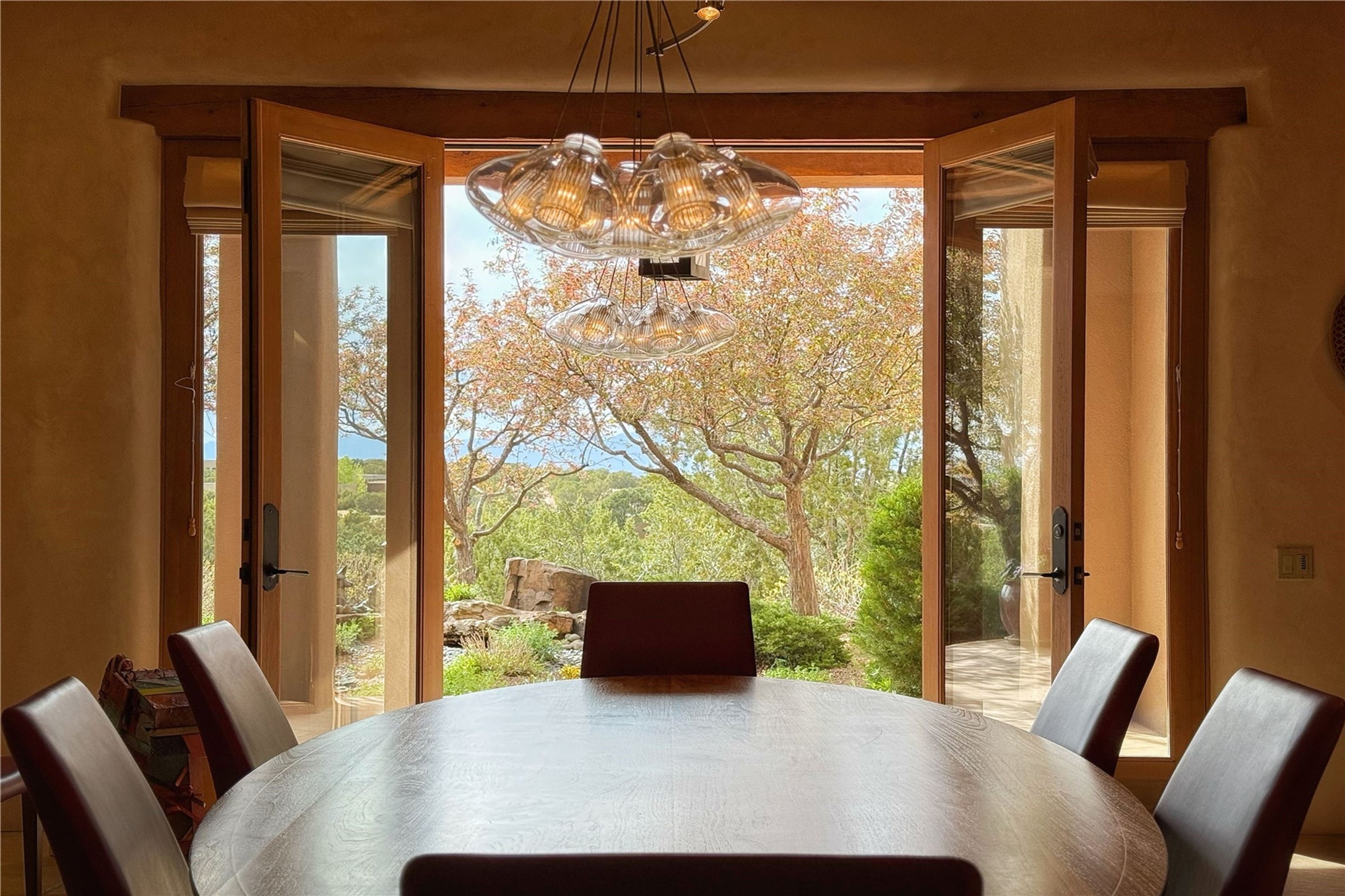 Welcome to a stunning Southwest-style home offering the perfect blend of elegance, warmth, and artistic expression. Built on an elevated lot to capture breathtaking Jemez Mountain views, this property is ideal for showcasing your art collection and entertaining in Santa Fe style.Warm earth tones complement the vigas and stone floors, creating a soft contemporary Southwest ambiance with timeless charm. A pond welcomes you and leads you to the wrap-around portal, complete with wood-burning fireplace, perfect for large gatherings. Enter through double Spanish doors that create a dramatic entry, setting the tone for the home. The foyer offers direct views to the back garden. Flow easily into the grand living room, featuring mountain views, wood-burning kiva fireplace, and cozy Banco seating. Made for entertaining, this home includes an elegant dining room with built-in cabinetry and portal access. The massive kitchen has an equally massive island, sitting room, and gas fireplace. The built in storage is impressive. The kitchen leads into the back garden with waterfall feature. 45 Violet Circle features an office, large media room and separate family room, for extra work, entertainment and relaxation spaces. A gas fireplace and large windows in the spacious primary suite highlight the back garden. The primary bath has his/hers showers and toilets. The primary closet is home to a walk in safe. Adjacent to the suite is a bonus/rec room with access to an underground space, perfect to turn into a dedicated wine cellar. The separate casita boasts high ceilings, decorative tiles, and a gas fireplace. Exquisite landscaping showcases 3 water features, adding elegance and peacefulness. This residence is designed around multiple outdoor spaces for true indoor/outdoor living.With the water feature sounds, art displays spaces, and large rooms, this home is peaceful, impressive and substantial.Please note, fires in fireplaces may be digitally added