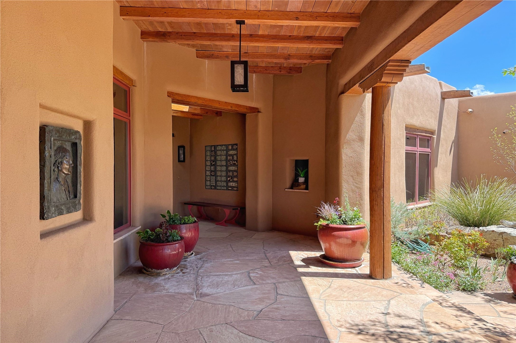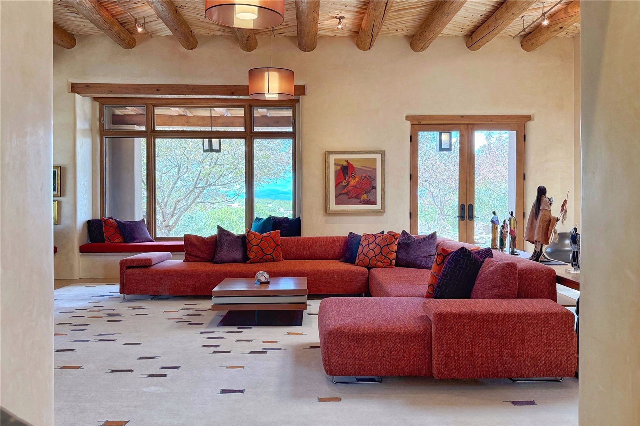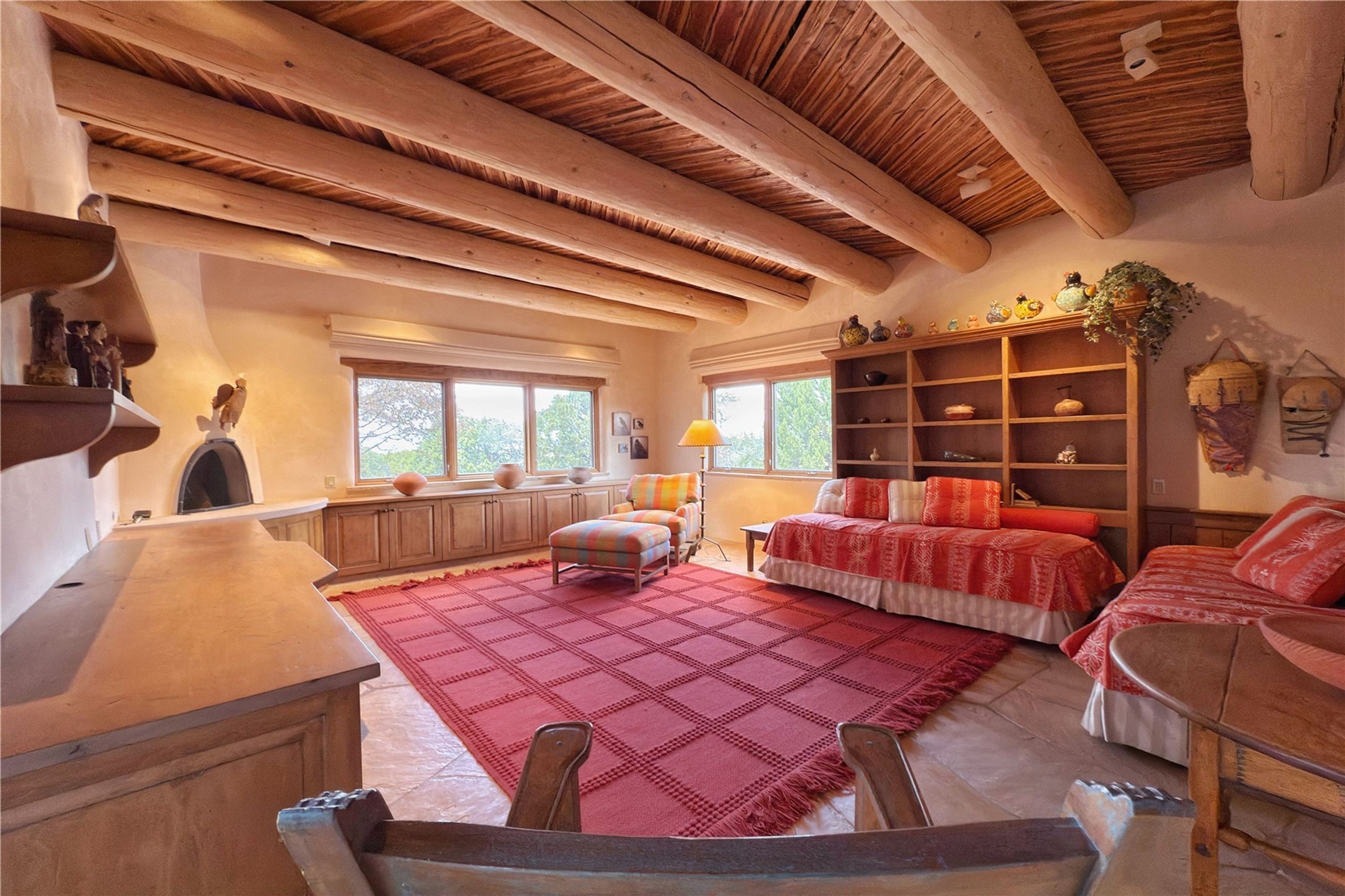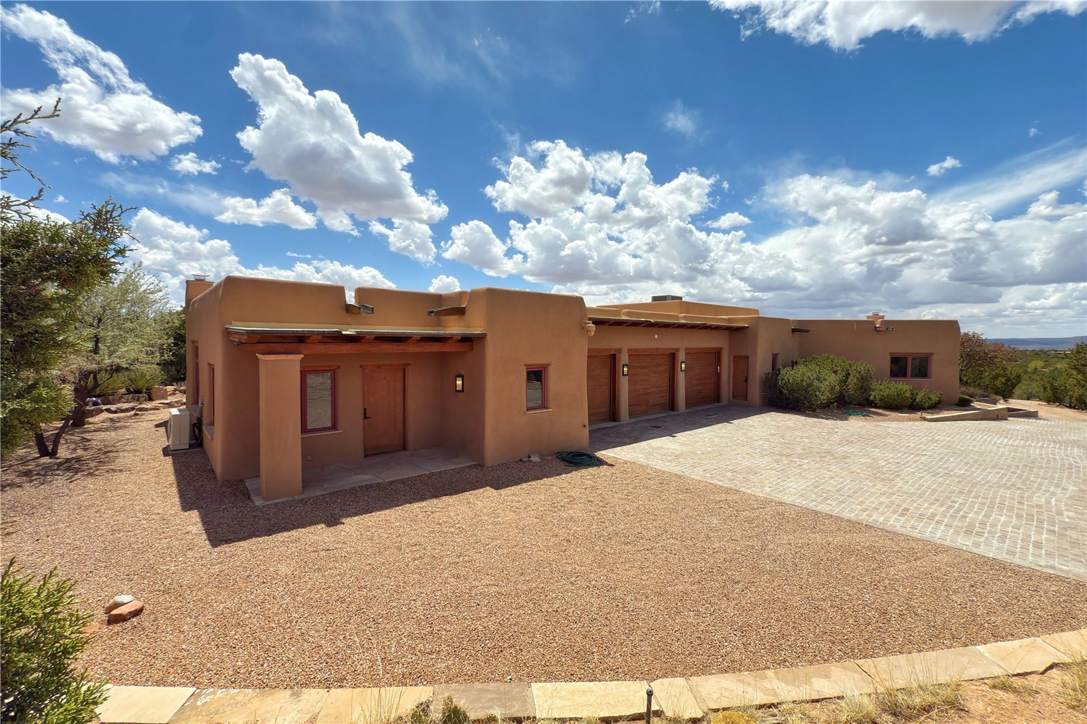 Welcome to a stunning Southwest-style home offering the perfect blend of elegance, warmth, and artistic expression. Built on an elevated lot to capture breathtaking Jemez Mountain views, this property is ideal for showcasing your art collection and entertaining in Santa Fe style.Warm earth tones complement the vigas and stone floors, creating a soft contemporary Southwest ambiance with timeless charm. A pond welcomes you and leads you to the wrap-around portal, complete with wood-burning fireplace, perfect for large gatherings. Enter through double Spanish doors that create a dramatic entry, setting the tone for the home. The foyer offers direct views to the back garden. Flow easily into the grand living room, featuring mountain views, wood-burning kiva fireplace, and cozy Banco seating. Made for entertaining, this home includes an elegant dining room with built-in cabinetry and portal access. The massive kitchen has an equally massive island, sitting room, and gas fireplace. The built in storage is impressive. The kitchen leads into the back garden with waterfall feature. 45 Violet Circle features an office, large media room and separate family room, for extra work, entertainment and relaxation spaces. A gas fireplace and large windows in the spacious primary suite highlight the back garden. The primary bath has his/hers showers and toilets. The primary closet is home to a walk in safe. Adjacent to the suite is a bonus/rec room with access to an underground space, perfect to turn into a dedicated wine cellar. The separate casita boasts high ceilings, decorative tiles, and a gas fireplace. Exquisite landscaping showcases 3 water features, adding elegance and peacefulness. This residence is designed around multiple outdoor spaces for true indoor/outdoor living.With the water feature sounds, art displays spaces, and large rooms, this home is peaceful, impressive and substantial.Please note, fires in fireplaces may be digitally added