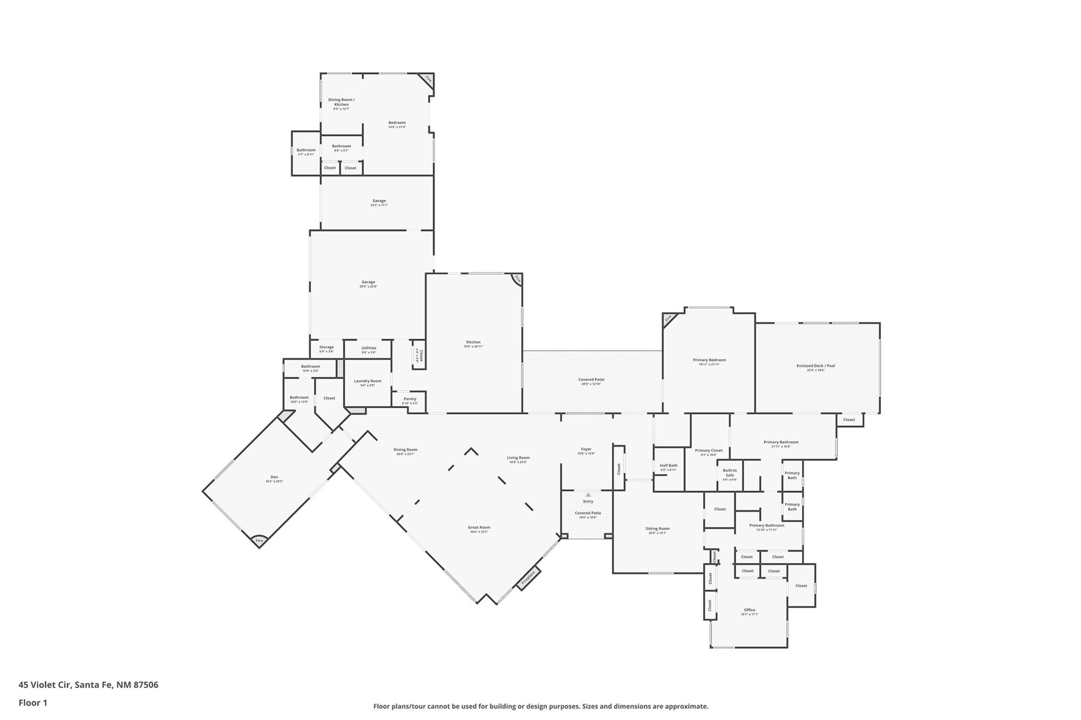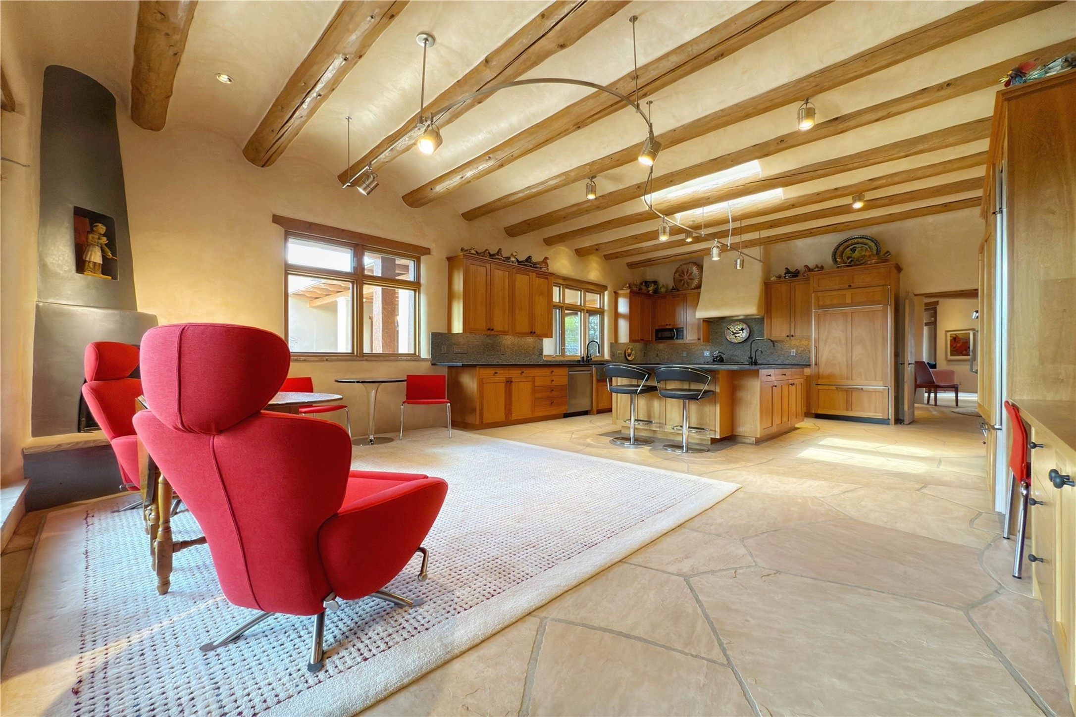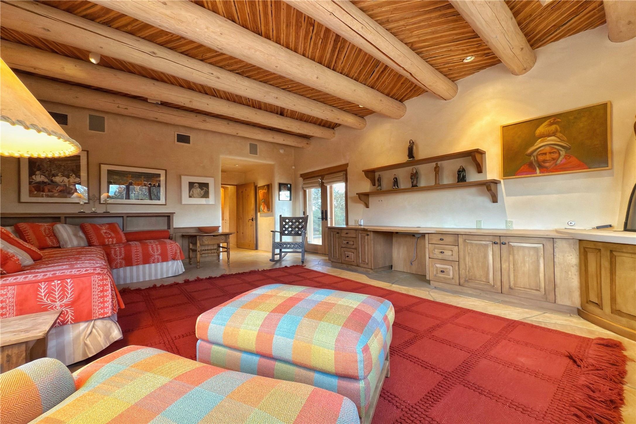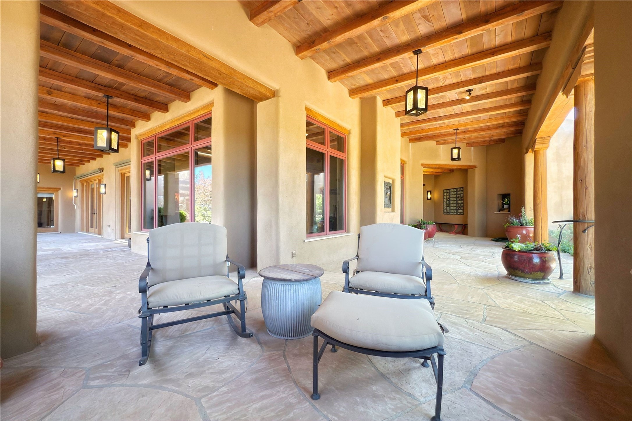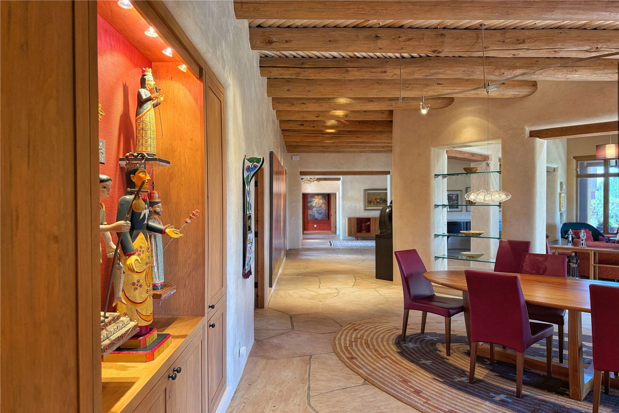 Welcome to a stunning Southwest-style home offering the perfect blend of elegance, warmth, and artistic expression. Built on an elevated lot to capture breathtaking Jemez Mountain views, this property is ideal for showcasing your art collection and entertaining in Santa Fe style.Warm earth tones complement the vigas and stone floors, creating a soft contemporary Southwest ambiance with timeless charm. A pond welcomes you and leads you to the wrap-around portal, complete with wood-burning fireplace, perfect for large gatherings. Enter through double Spanish doors that create a dramatic entry, setting the tone for the home. The foyer offers direct views to the back garden. Flow easily into the grand living room, featuring mountain views, wood-burning kiva fireplace, and cozy Banco seating. Made for entertaining, this home includes an elegant dining room with built-in cabinetry and portal access. The massive kitchen has an equally massive island, sitting room, and gas fireplace. The built in storage is impressive. The kitchen leads into the back garden with waterfall feature. 45 Violet Circle features an office, large media room and separate family room, for extra work, entertainment and relaxation spaces. A gas fireplace and large windows in the spacious primary suite highlight the back garden. The primary bath has his/hers showers and toilets. The primary closet is home to a walk in safe. Adjacent to the suite is a bonus/rec room with access to an underground space, perfect to turn into a dedicated wine cellar. The separate casita boasts high ceilings, decorative tiles, and a gas fireplace. Exquisite landscaping showcases 3 water features, adding elegance and peacefulness. This residence is designed around multiple outdoor spaces for true indoor/outdoor living.With the water feature sounds, art displays spaces, and large rooms, this home is peaceful, impressive and substantial.Please note, fires in fireplaces may be digitally added