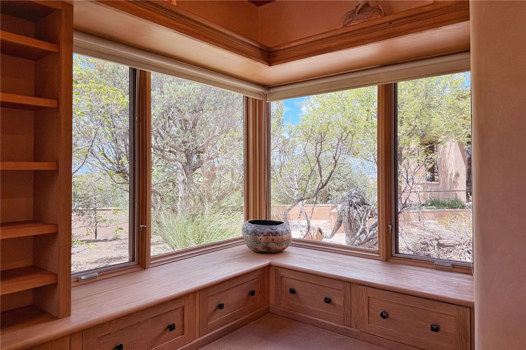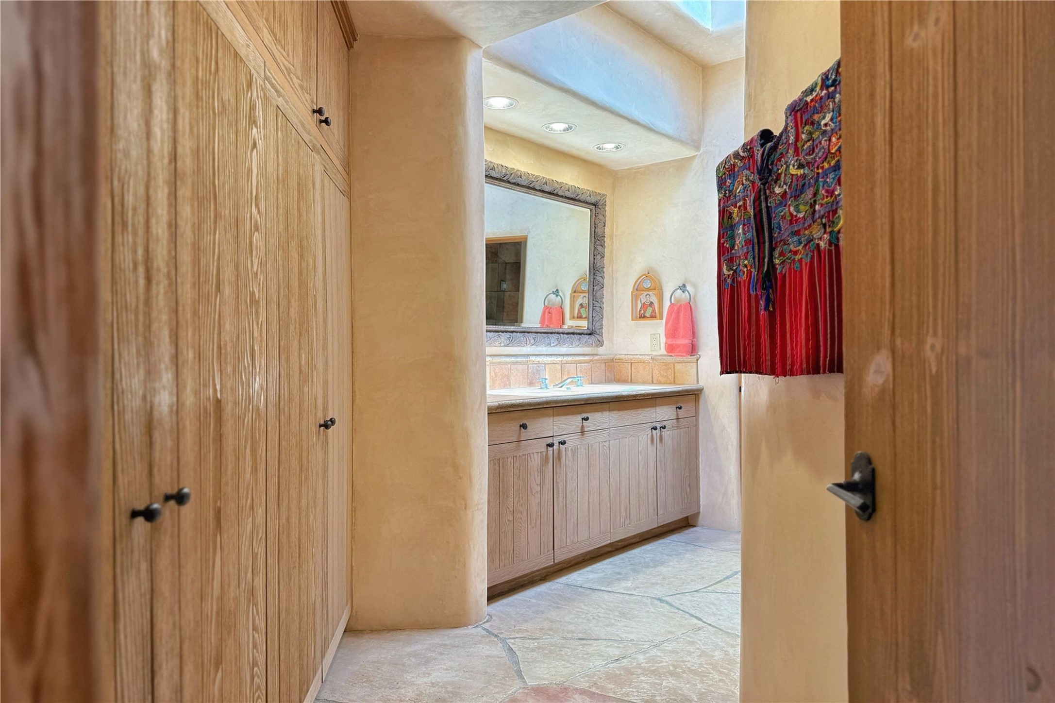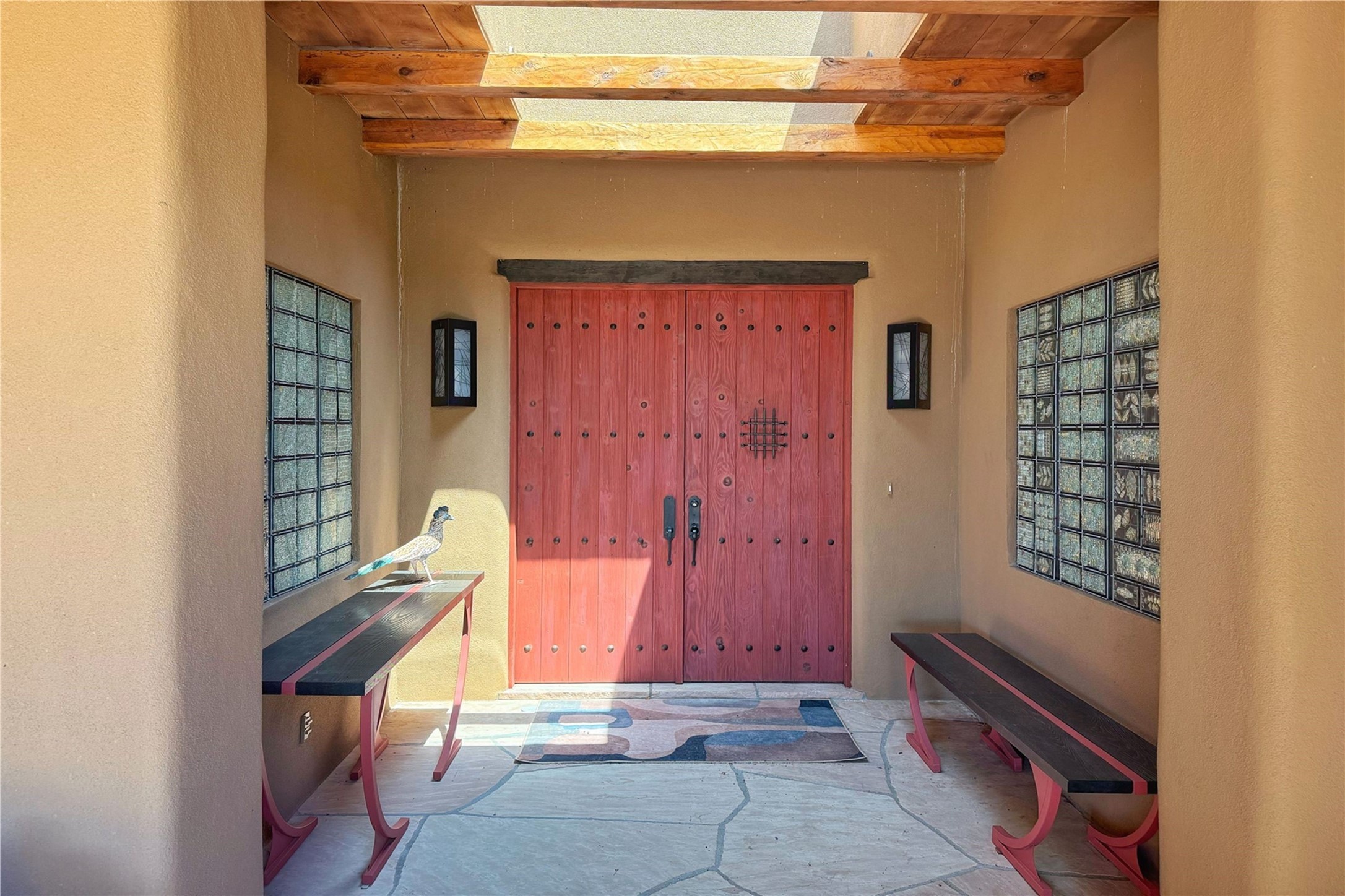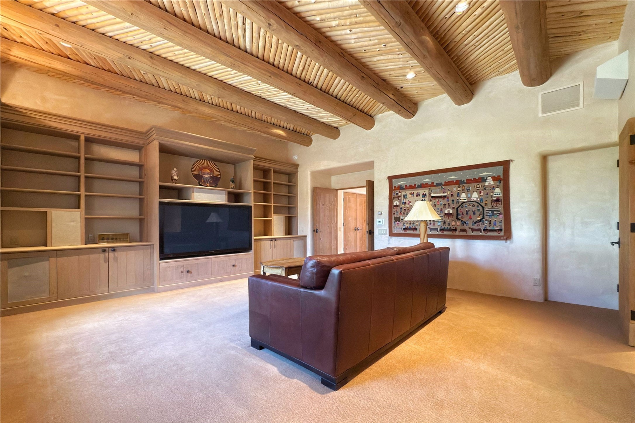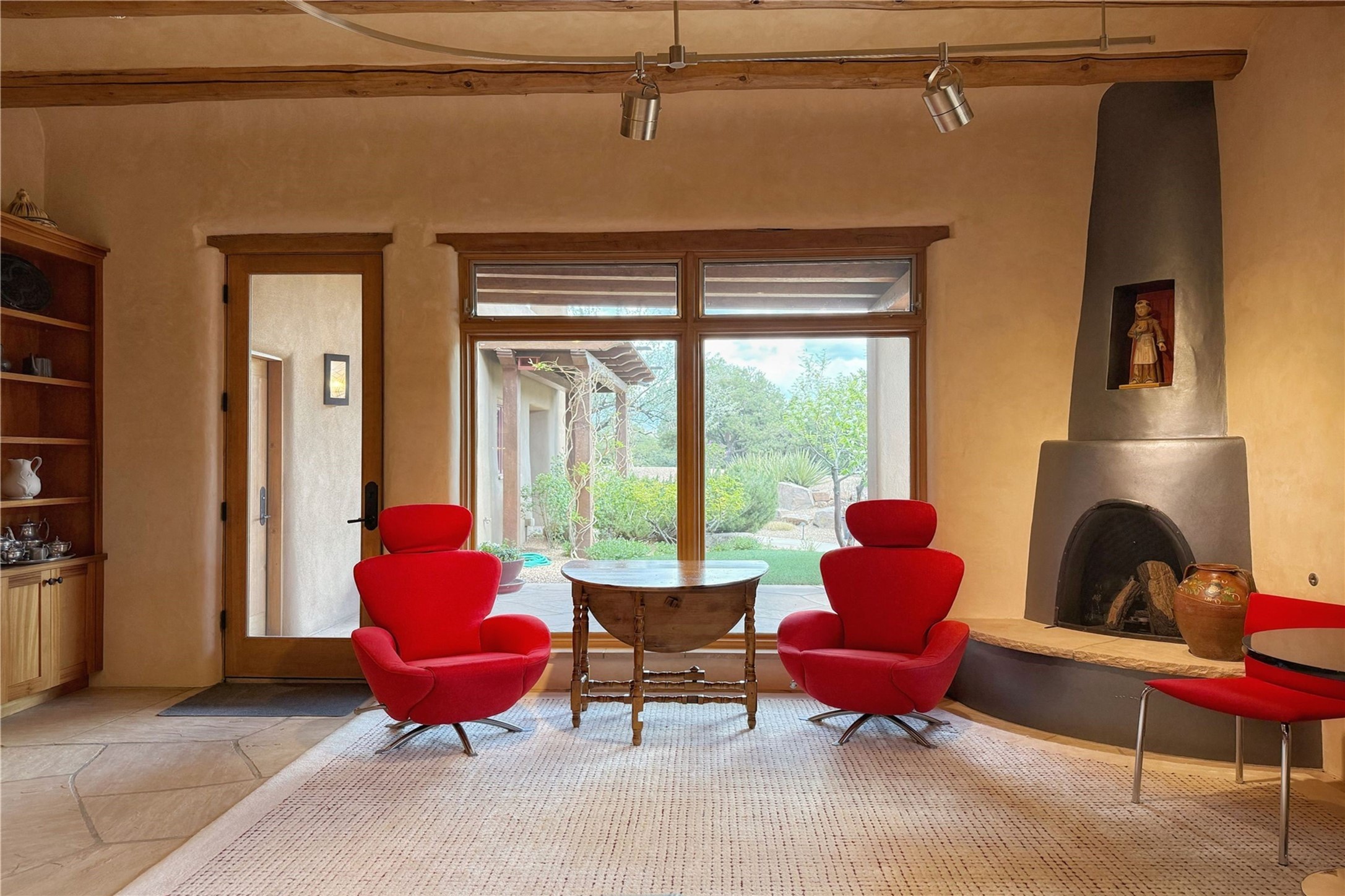 Welcome to a stunning Southwest-style home offering the perfect blend of elegance, warmth, and artistic expression. Built on an elevated lot to capture breathtaking Jemez Mountain views, this property is ideal for showcasing your art collection and entertaining in Santa Fe style.Warm earth tones complement the vigas and stone floors, creating a soft contemporary Southwest ambiance with timeless charm. A pond welcomes you and leads you to the wrap-around portal, complete with wood-burning fireplace, perfect for large gatherings. Enter through double Spanish doors that create a dramatic entry, setting the tone for the home. The foyer offers direct views to the back garden. Flow easily into the grand living room, featuring mountain views, wood-burning kiva fireplace, and cozy Banco seating. Made for entertaining, this home includes an elegant dining room with built-in cabinetry and portal access. The massive kitchen has an equally massive island, sitting room, and gas fireplace. The built in storage is impressive. The kitchen leads into the back garden with waterfall feature. 45 Violet Circle features an office, large media room and separate family room, for extra work, entertainment and relaxation spaces. A gas fireplace and large windows in the spacious primary suite highlight the back garden. The primary bath has his/hers showers and toilets. The primary closet is home to a walk in safe. Adjacent to the suite is a bonus/rec room with access to an underground space, perfect to turn into a dedicated wine cellar. The separate casita boasts high ceilings, decorative tiles, and a gas fireplace. Exquisite landscaping showcases 3 water features, adding elegance and peacefulness. This residence is designed around multiple outdoor spaces for true indoor/outdoor living.With the water feature sounds, art displays spaces, and large rooms, this home is peaceful, impressive and substantial.Please note, fires in fireplaces may be digitally added