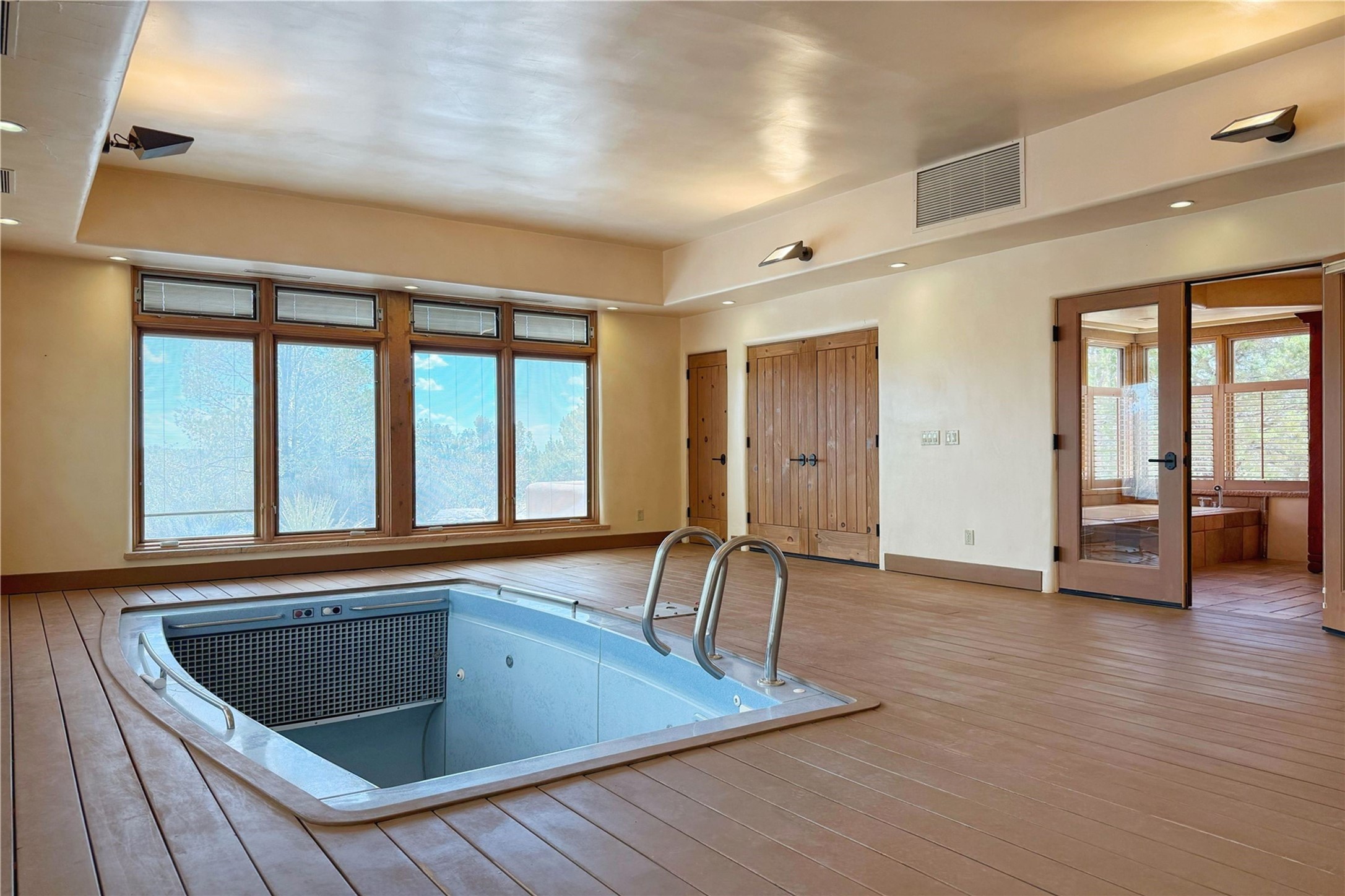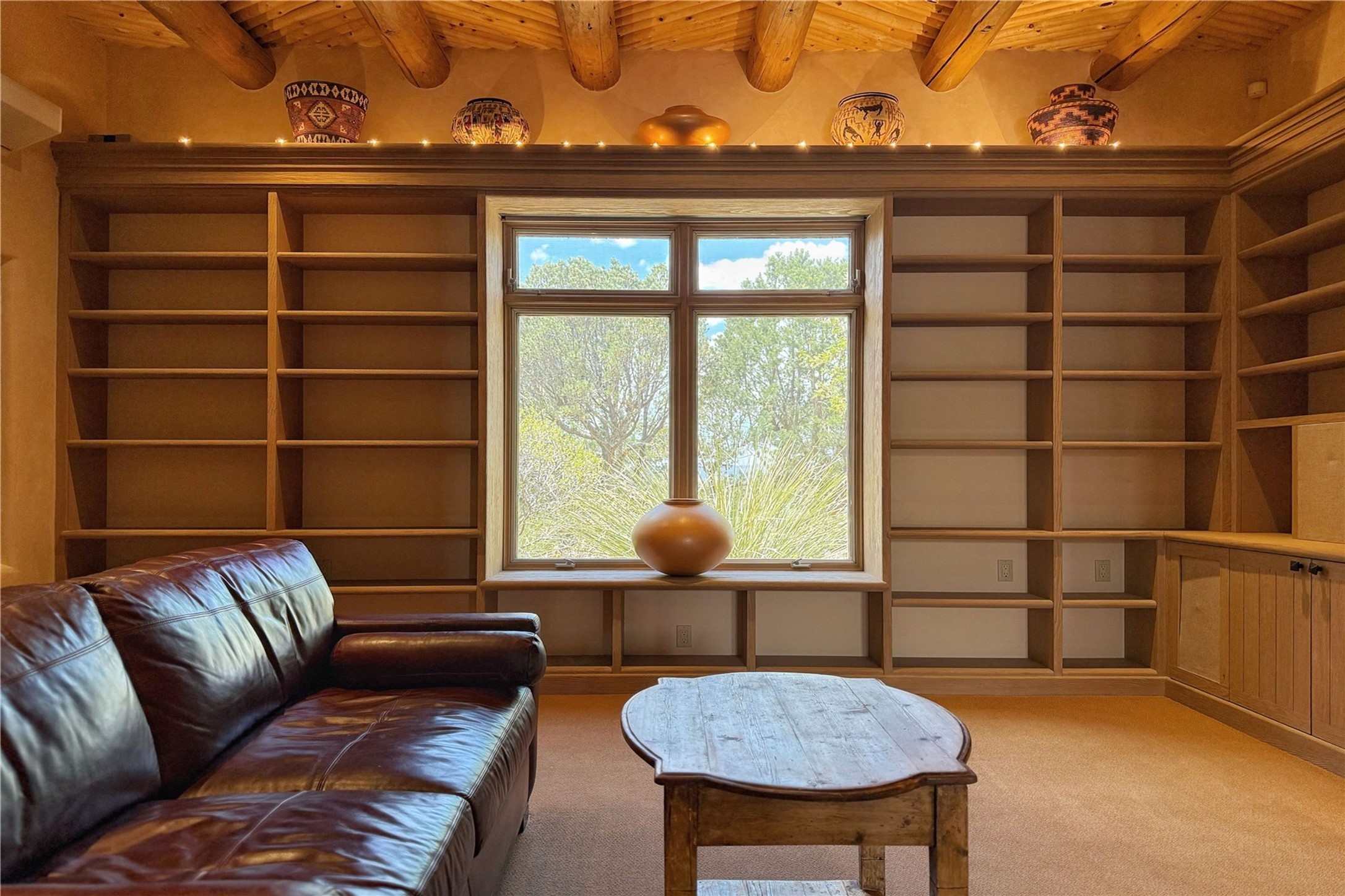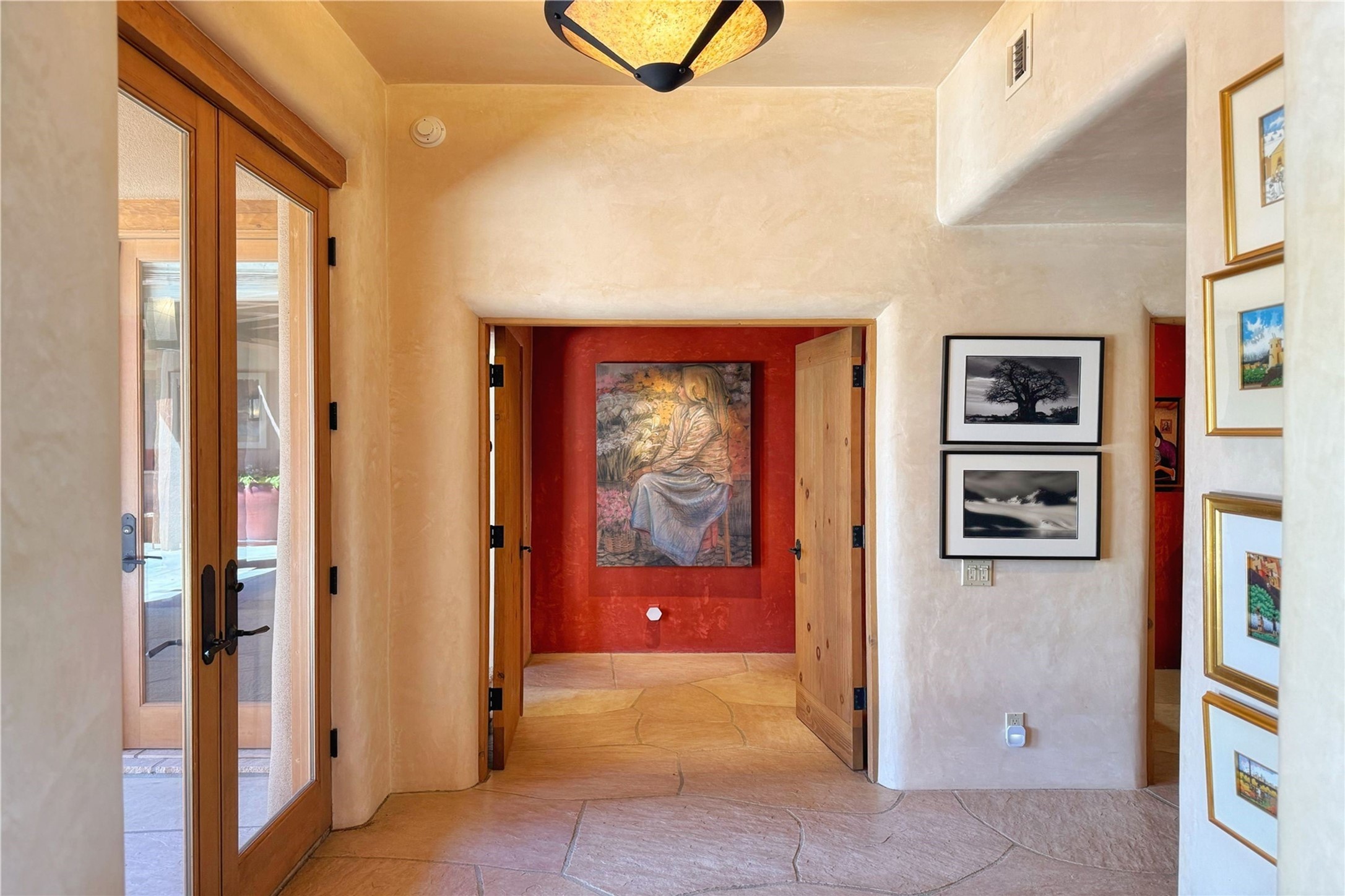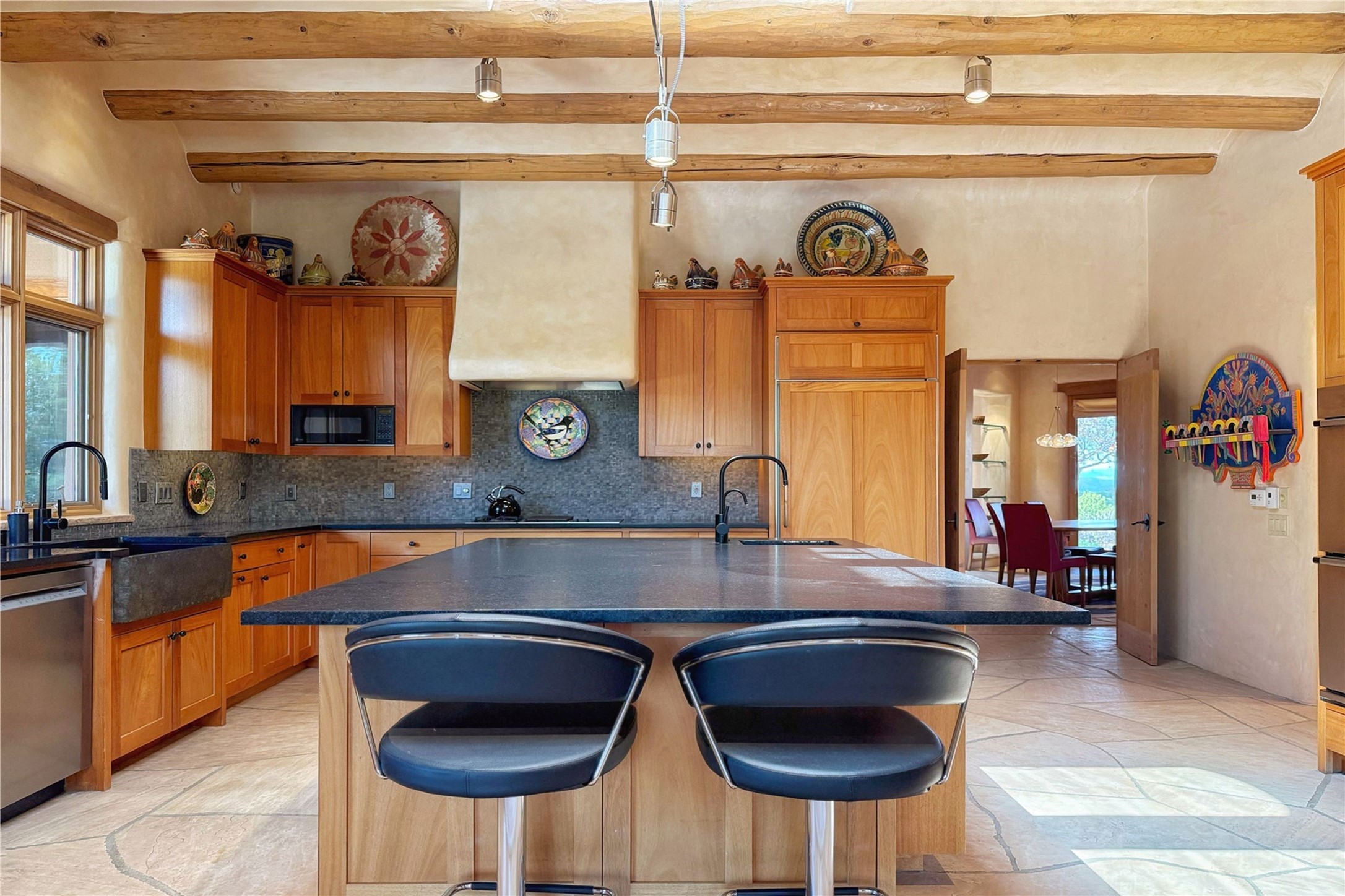 Welcome to a stunning Southwest-style home offering the perfect blend of elegance, warmth, and artistic expression. Built on an elevated lot to capture breathtaking Jemez Mountain views, this property is ideal for showcasing your art collection and entertaining in Santa Fe style.Warm earth tones complement the vigas and stone floors, creating a soft contemporary Southwest ambiance with timeless charm. A pond welcomes you and leads you to the wrap-around portal, complete with wood-burning fireplace, perfect for large gatherings. Enter through double Spanish doors that create a dramatic entry, setting the tone for the home. The foyer offers direct views to the back garden. Flow easily into the grand living room, featuring mountain views, wood-burning kiva fireplace, and cozy Banco seating. Made for entertaining, this home includes an elegant dining room with built-in cabinetry and portal access. The massive kitchen has an equally massive island, sitting room, and gas fireplace. The built in storage is impressive. The kitchen leads into the back garden with waterfall feature. 45 Violet Circle features an office, large media room and separate family room, for extra work, entertainment and relaxation spaces. A gas fireplace and large windows in the spacious primary suite highlight the back garden. The primary bath has his/hers showers and toilets. The primary closet is home to a walk in safe. Adjacent to the suite is a bonus/rec room with access to an underground space, perfect to turn into a dedicated wine cellar. The separate casita boasts high ceilings, decorative tiles, and a gas fireplace. Exquisite landscaping showcases 3 water features, adding elegance and peacefulness. This residence is designed around multiple outdoor spaces for true indoor/outdoor living.With the water feature sounds, art displays spaces, and large rooms, this home is peaceful, impressive and substantial.Please note, fires in fireplaces may be digitally added