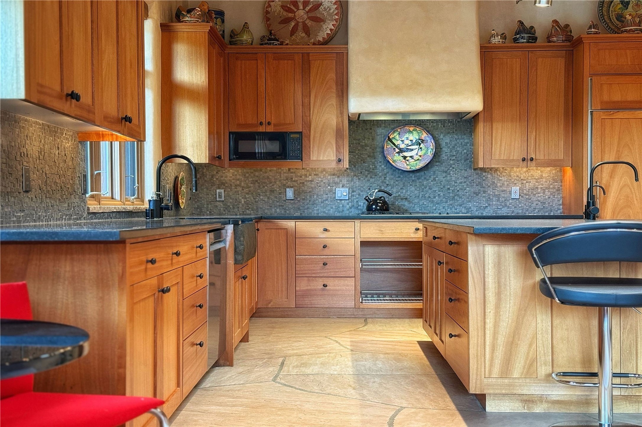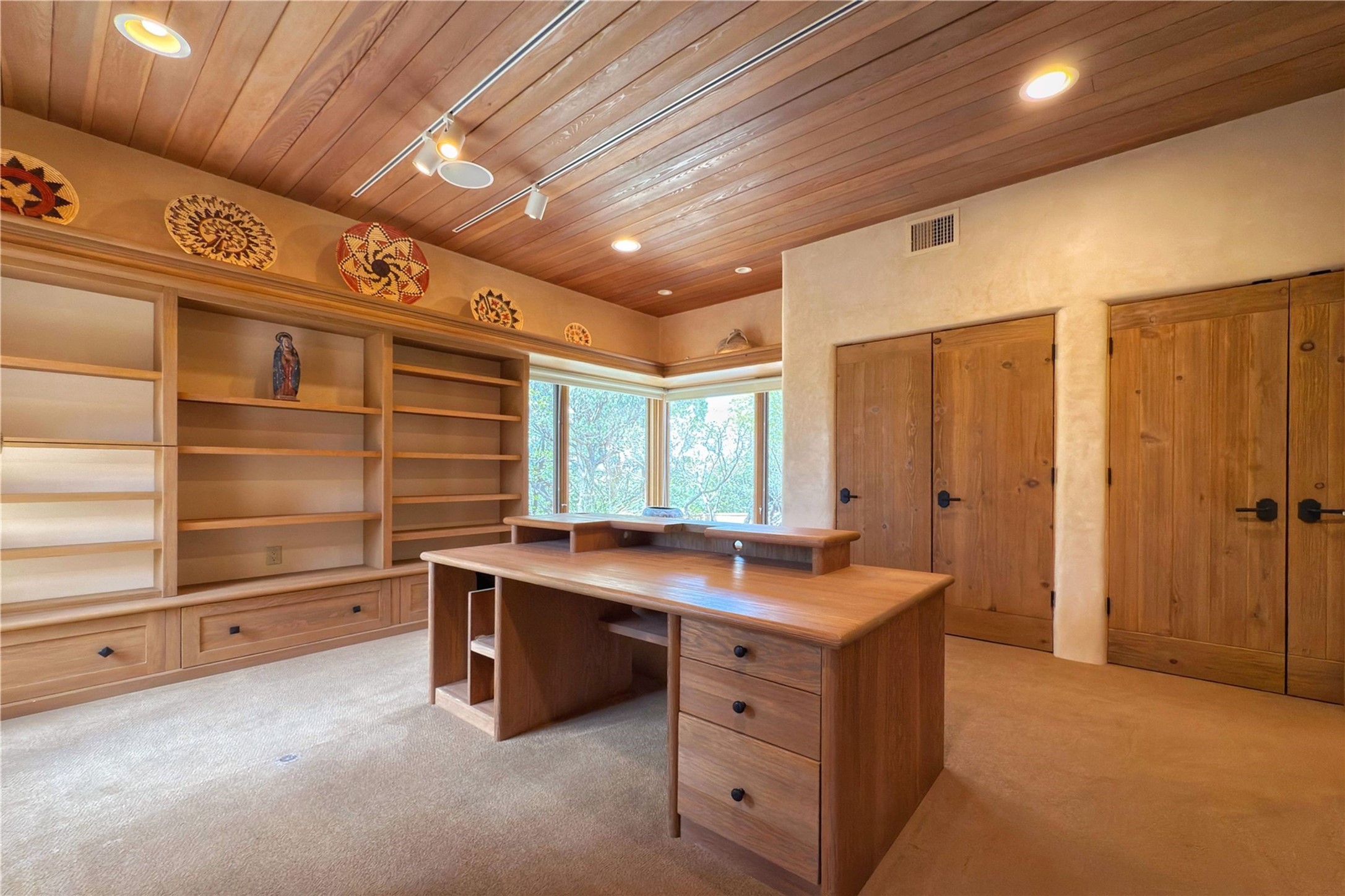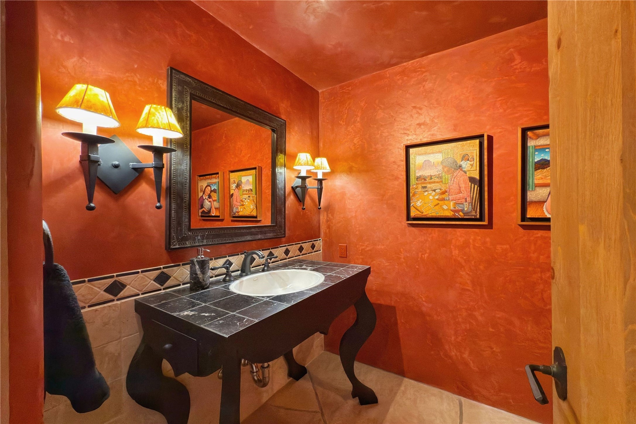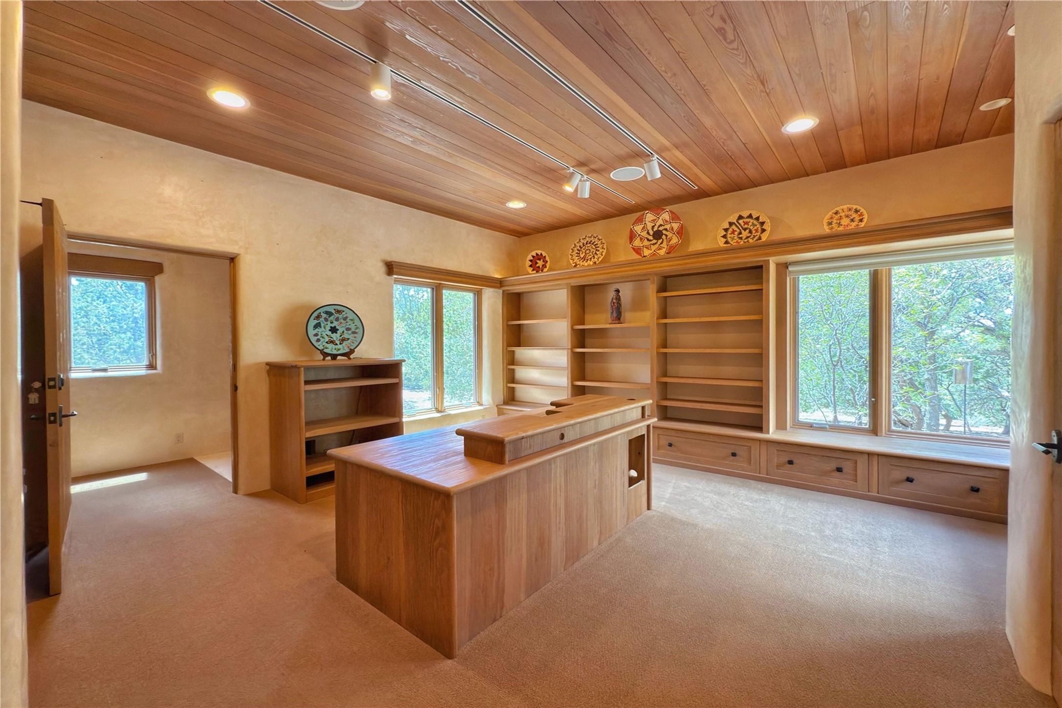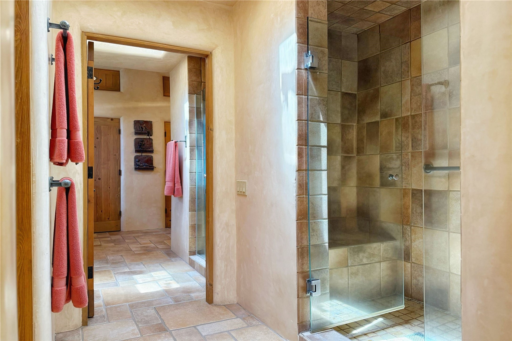 Welcome to a stunning Southwest-style home offering the perfect blend of elegance, warmth, and artistic expression. Built on an elevated lot to capture breathtaking Jemez Mountain views, this property is ideal for showcasing your art collection and entertaining in Santa Fe style.Warm earth tones complement the vigas and stone floors, creating a soft contemporary Southwest ambiance with timeless charm. A pond welcomes you and leads you to the wrap-around portal, complete with wood-burning fireplace, perfect for large gatherings. Enter through double Spanish doors that create a dramatic entry, setting the tone for the home. The foyer offers direct views to the back garden. Flow easily into the grand living room, featuring mountain views, wood-burning kiva fireplace, and cozy Banco seating. Made for entertaining, this home includes an elegant dining room with built-in cabinetry and portal access. The massive kitchen has an equally massive island, sitting room, and gas fireplace. The built in storage is impressive. The kitchen leads into the back garden with waterfall feature. 45 Violet Circle features an office, large media room and separate family room, for extra work, entertainment and relaxation spaces. A gas fireplace and large windows in the spacious primary suite highlight the back garden. The primary bath has his/hers showers and toilets. The primary closet is home to a walk in safe. Adjacent to the suite is a bonus/rec room with access to an underground space, perfect to turn into a dedicated wine cellar. The separate casita boasts high ceilings, decorative tiles, and a gas fireplace. Exquisite landscaping showcases 3 water features, adding elegance and peacefulness. This residence is designed around multiple outdoor spaces for true indoor/outdoor living.With the water feature sounds, art displays spaces, and large rooms, this home is peaceful, impressive and substantial.Please note, fires in fireplaces may be digitally added