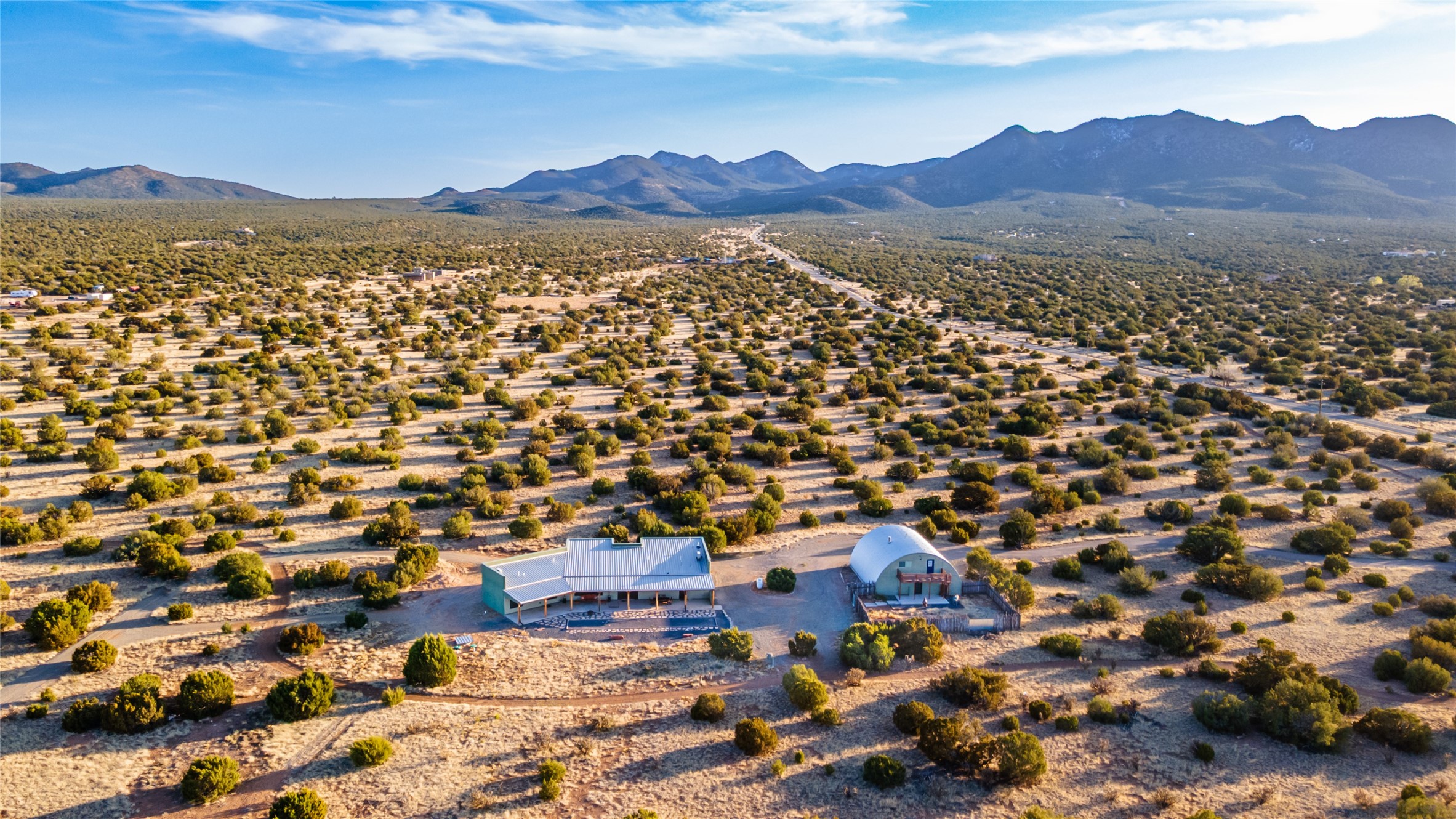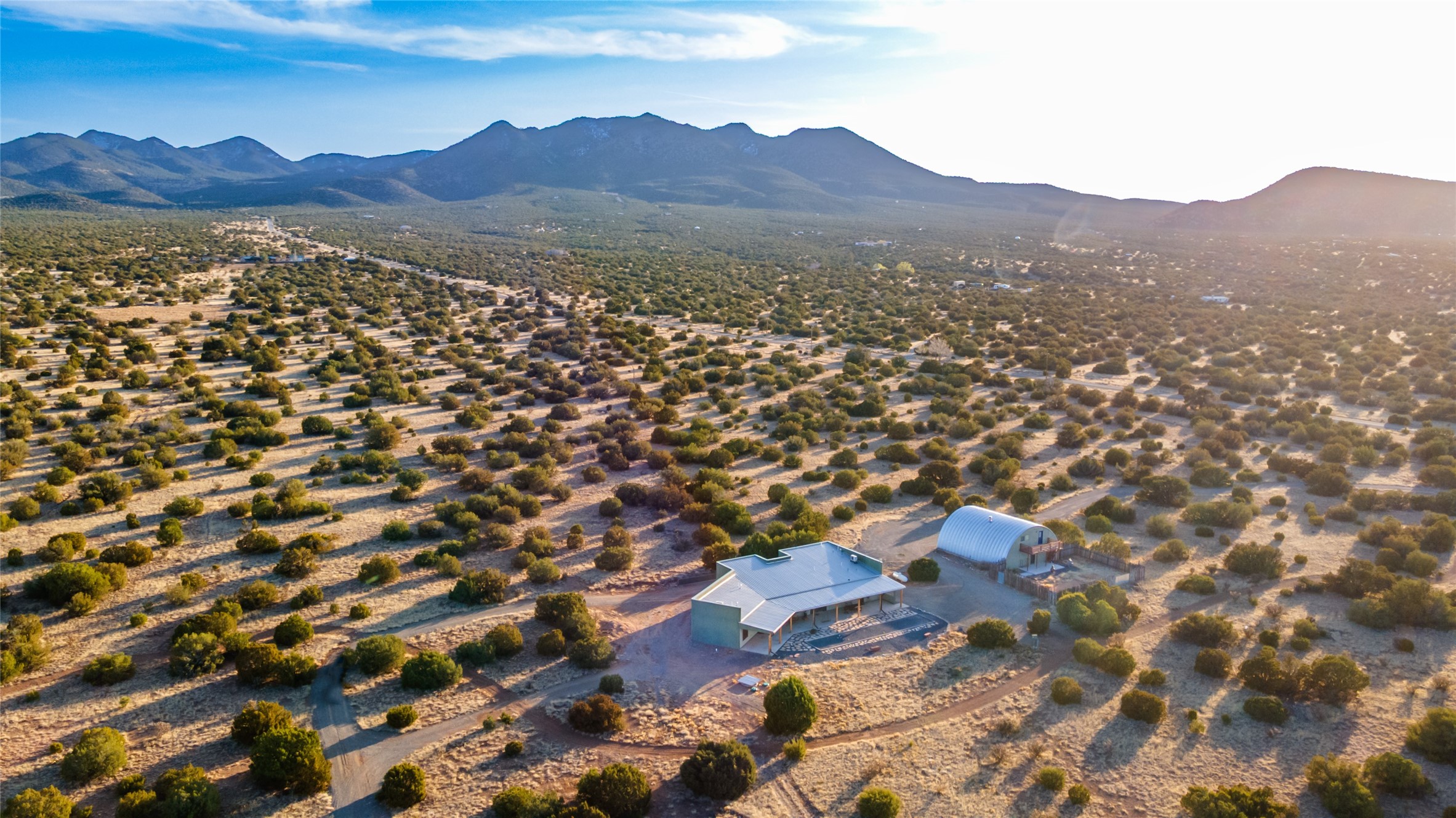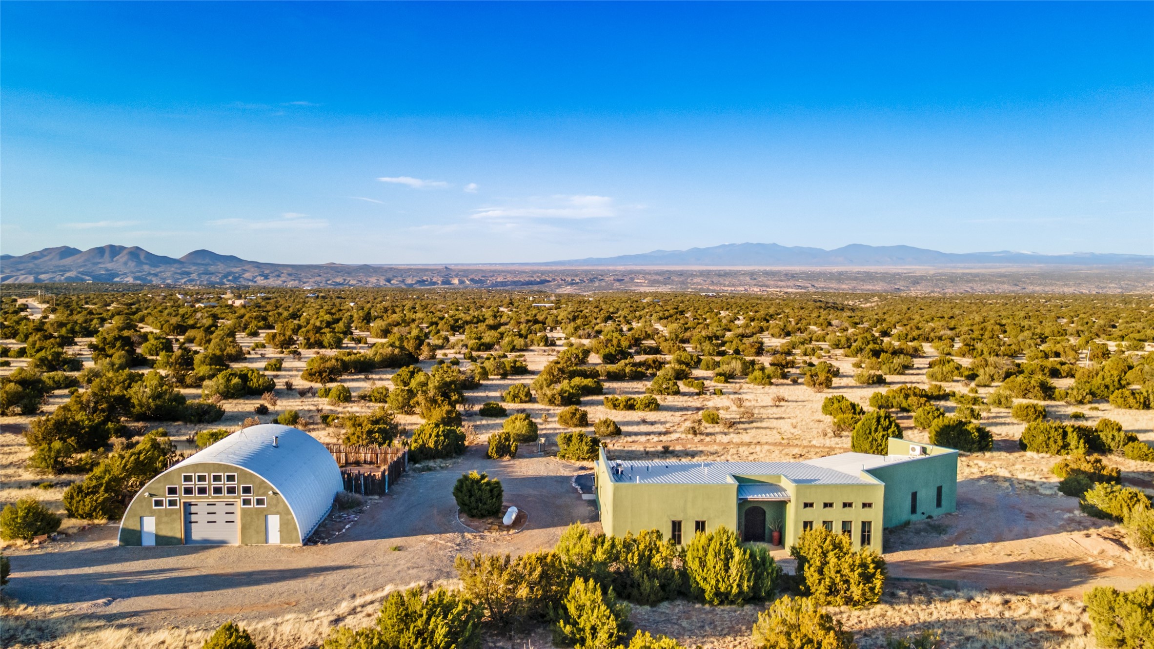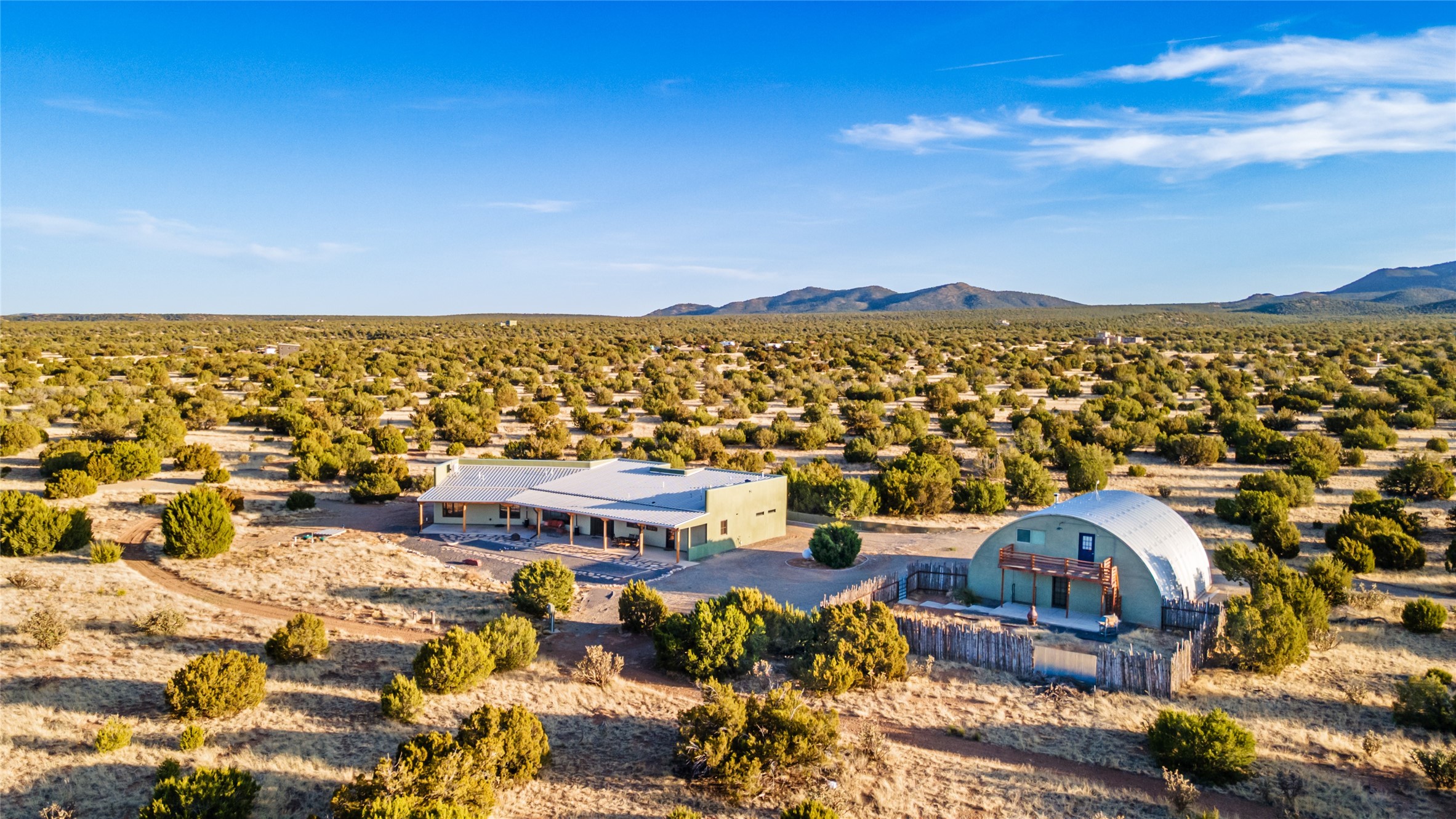 This stunning 3 bedroom, 4 bath sanctuary boasts 42 serene acres situated at the foot of the rugged Ortiz mountains with drop dead gorgeous views of the Sangre de Cristos. High ceilings and an open concept kitchen/living area accented with beam ceilings and Saltillo tiles provide the main dwelling with a cozy, yet spacious rustic elegance. High ceilings in the living and dining area flow beautifully to the expansive portal, making this an ideal home for entertaining.The tranquil primary bedroom boasts a large walk-in closet and an ensuite bathroom that features separate shower and tub. The split floor plan places the second and third bedrooms at the far end of the house creating nice separation between living areas.The quonset hut serves as two buildings in one. One portion is a guest suite, complete with bathroom, baseboard heating, wood burning stove, kitchenette, and a loft area great for rest or play (current owners found it ideal for rocking out on the drums and also hosting visitors). The other half is a massive garage, with high ceilings ideal for use as a shop or storage.Other features include a large laundry room, RV hookup, bocce court, and a mile-long walking loop around the grounds great for a leisurely stroll or an exciting dirt bike track!Your sanctuary awaits!! This stunning 3 bedroom, 4 bath property boasts 42 serene acres situated at the foot of the rugged Ortiz mountains with drop dead gorgeous views of the Sangre de Cristos. High ceilings and an open concept kitchen/living area accented with beam ceilings and Saltillo tiles provide the main dwelling with a cozy, yet spacious rustic elegance. High ceilings in the living and dining area flow beautifully to the expansive portal, making this an ideal home for entertaining.The tranquil primary bedroom boasts a large walk-in closet and an ensuite bathroom that features separate shower and tub. The split floor plan places the second and third bedrooms at the far end of the house creating nice separation between living areas.The quonset hut serves as two buildings in one. One portion is a guest suite, complete with bathroom, baseboard heating, wood burning stove, kitchenette, and a loft area great for rest or play (current owners found it ideal for rocking out on the drums and also hosting visitors). The other half is a massive garage, with high ceilings ideal for use as a shop or storage.Other features include a large laundry room, RV hookup, bocce court, and a mile-long walking loop around the grounds great for a leisurely stroll or an exciting dirt bike track!There is no well at the property. Property is priced to accommodate buyer installing a well if buyer desires.