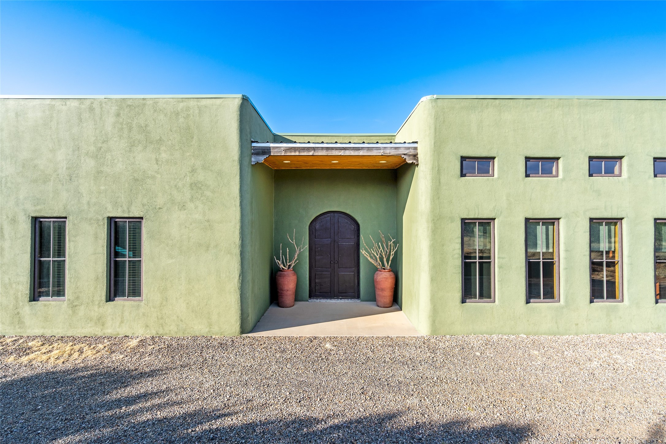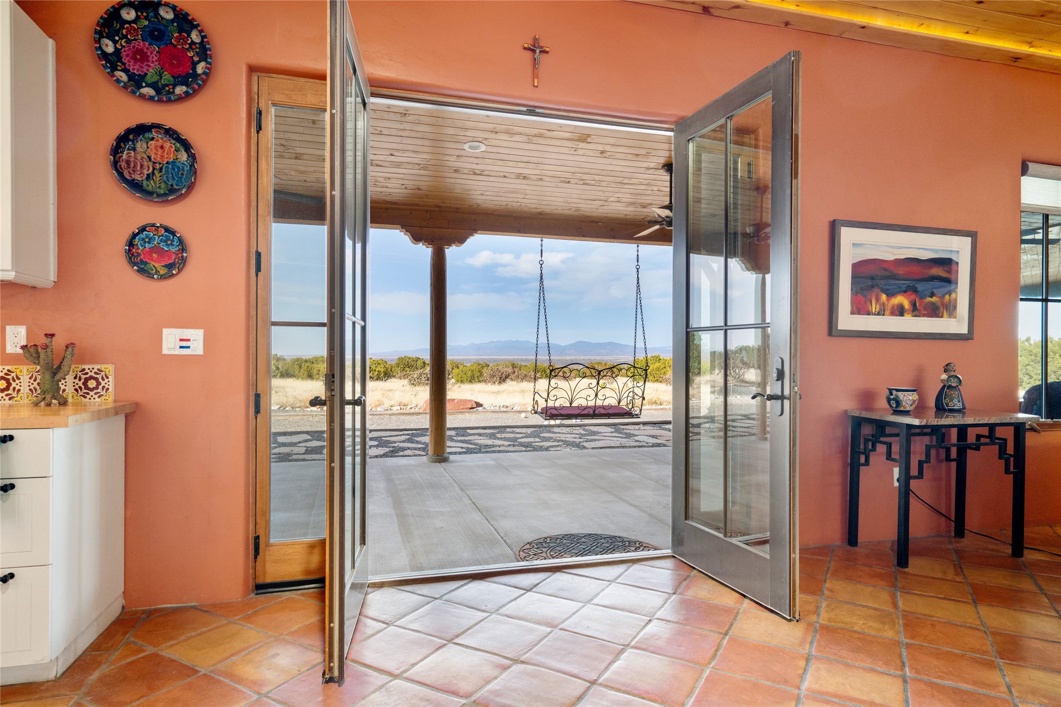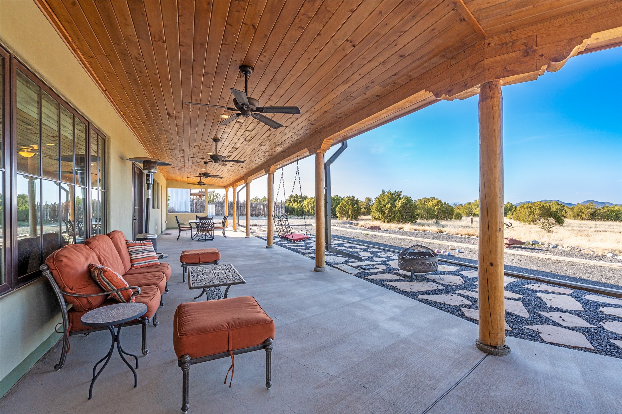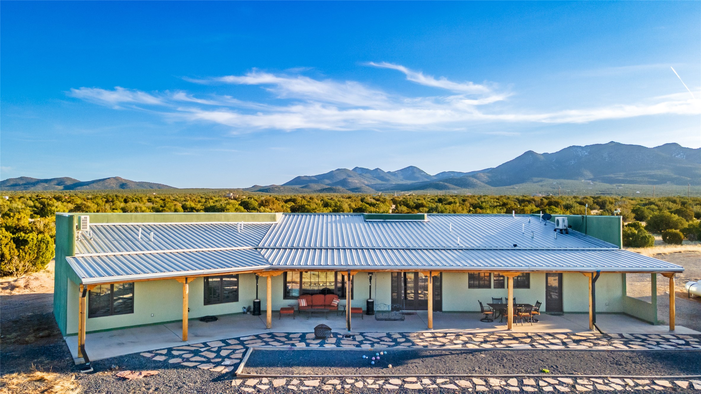 This stunning 3 bedroom, 4 bath sanctuary boasts 42 serene acres situated at the foot of the rugged Ortiz mountains with drop dead gorgeous views of the Sangre de Cristos. High ceilings and an open concept kitchen/living area accented with beam ceilings and Saltillo tiles provide the main dwelling with a cozy, yet spacious rustic elegance. High ceilings in the living and dining area flow beautifully to the expansive portal, making this an ideal home for entertaining.The tranquil primary bedroom boasts a large walk-in closet and an ensuite bathroom that features separate shower and tub. The split floor plan places the second and third bedrooms at the far end of the house creating nice separation between living areas.The quonset hut serves as two buildings in one. One portion is a guest suite, complete with bathroom, baseboard heating, wood burning stove, kitchenette, and a loft area great for rest or play (current owners found it ideal for rocking out on the drums and also hosting visitors). The other half is a massive garage, with high ceilings ideal for use as a shop or storage.Other features include a large laundry room, RV hookup, bocce court, and a mile-long walking loop around the grounds great for a leisurely stroll or an exciting dirt bike track!Your sanctuary awaits!! This stunning 3 bedroom, 4 bath property boasts 42 serene acres situated at the foot of the rugged Ortiz mountains with drop dead gorgeous views of the Sangre de Cristos. High ceilings and an open concept kitchen/living area accented with beam ceilings and Saltillo tiles provide the main dwelling with a cozy, yet spacious rustic elegance. High ceilings in the living and dining area flow beautifully to the expansive portal, making this an ideal home for entertaining.The tranquil primary bedroom boasts a large walk-in closet and an ensuite bathroom that features separate shower and tub. The split floor plan places the second and third bedrooms at the far end of the house creating nice separation between living areas.The quonset hut serves as two buildings in one. One portion is a guest suite, complete with bathroom, baseboard heating, wood burning stove, kitchenette, and a loft area great for rest or play (current owners found it ideal for rocking out on the drums and also hosting visitors). The other half is a massive garage, with high ceilings ideal for use as a shop or storage.Other features include a large laundry room, RV hookup, bocce court, and a mile-long walking loop around the grounds great for a leisurely stroll or an exciting dirt bike track!There is no well at the property. Property is priced to accommodate buyer installing a well if buyer desires.