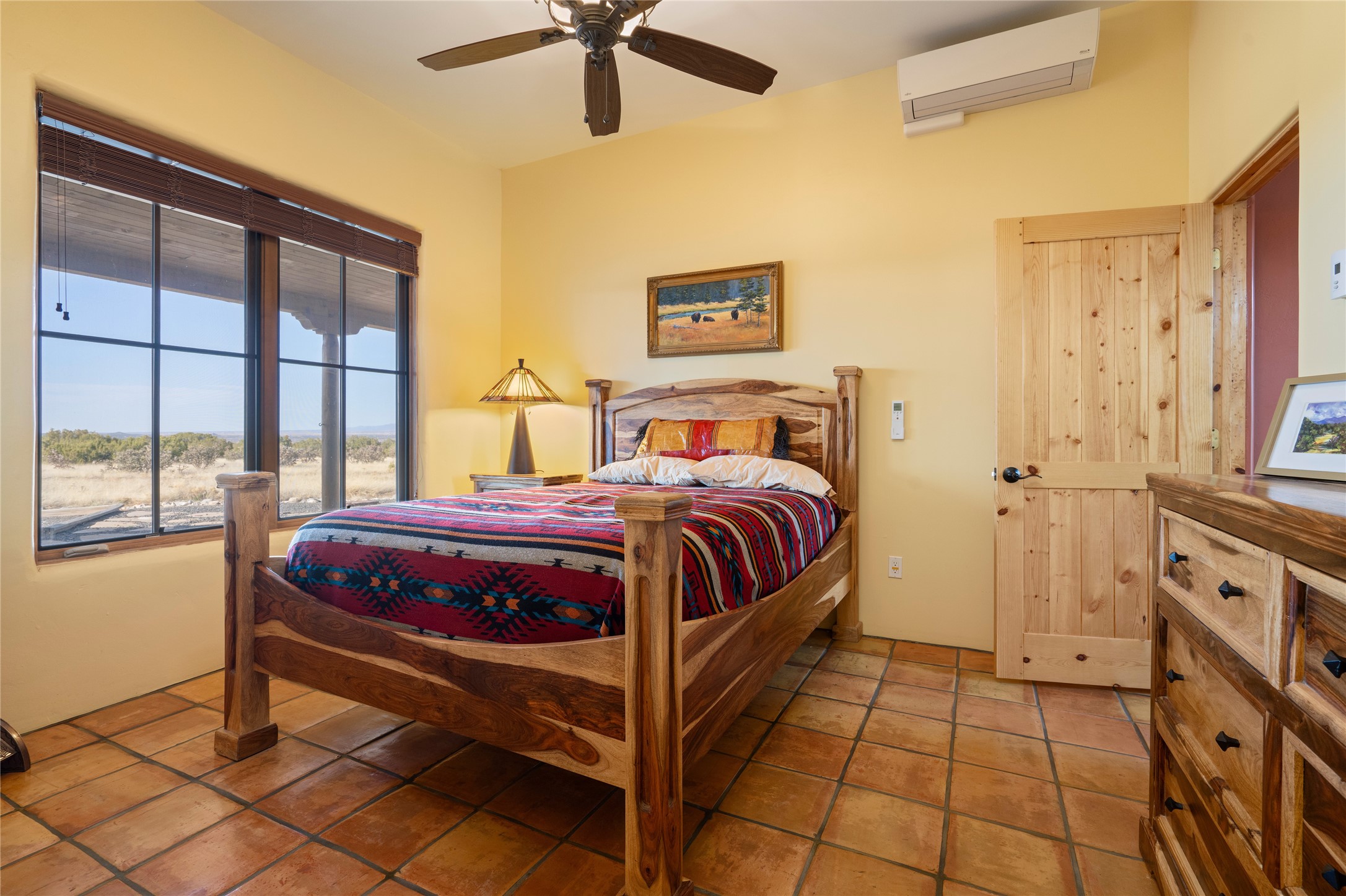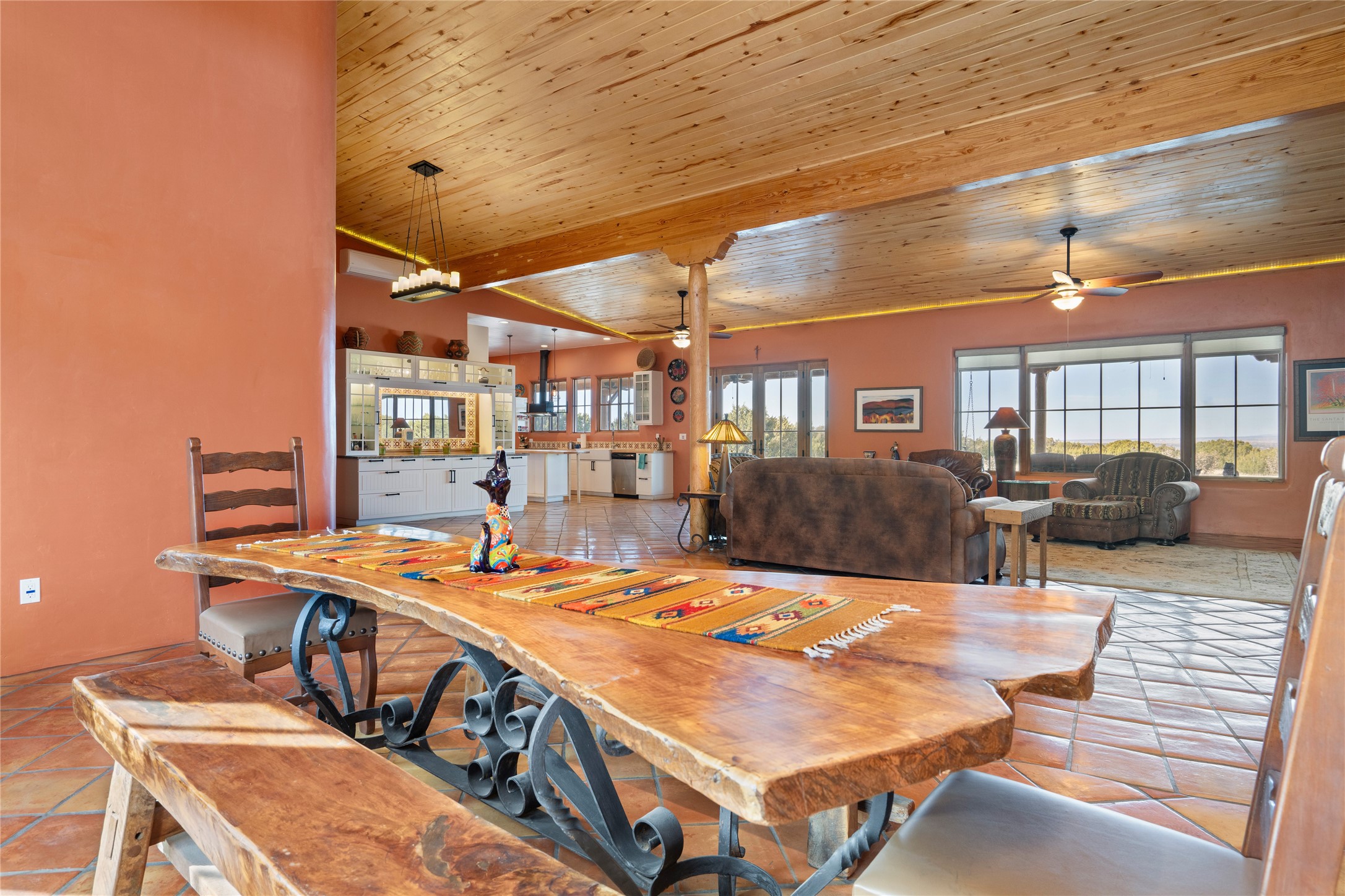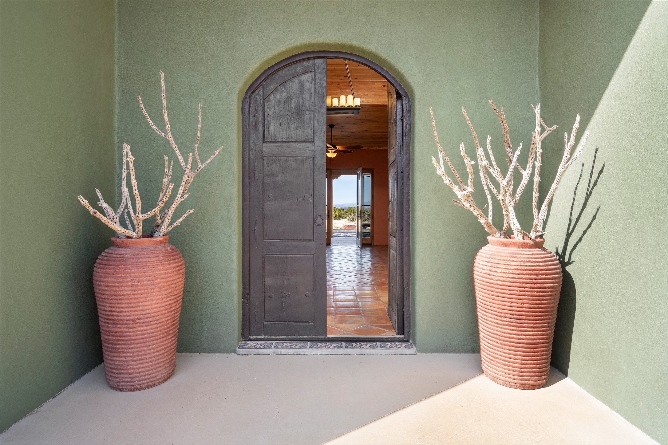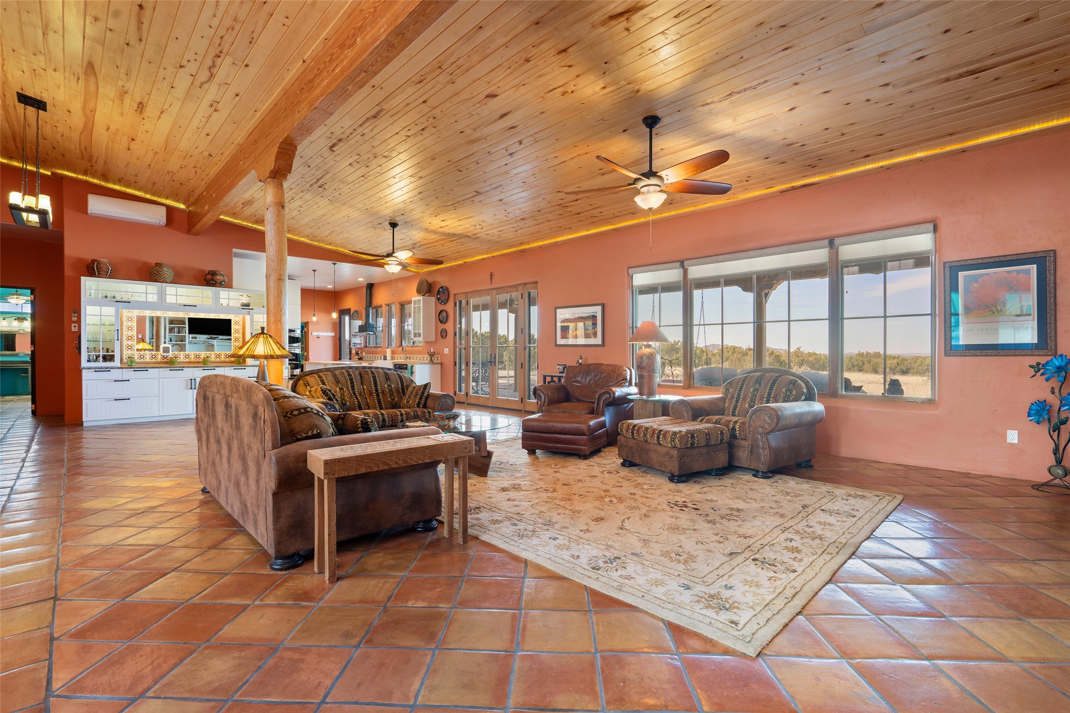 This stunning 3 bedroom, 4 bath sanctuary boasts 42 serene acres situated at the foot of the rugged Ortiz mountains with drop dead gorgeous views of the Sangre de Cristos. High ceilings and an open concept kitchen/living area accented with beam ceilings and Saltillo tiles provide the main dwelling with a cozy, yet spacious rustic elegance. High ceilings in the living and dining area flow beautifully to the expansive portal, making this an ideal home for entertaining.The tranquil primary bedroom boasts a large walk-in closet and an ensuite bathroom that features separate shower and tub. The split floor plan places the second and third bedrooms at the far end of the house creating nice separation between living areas.The quonset hut serves as two buildings in one. One portion is a guest suite, complete with bathroom, baseboard heating, wood burning stove, kitchenette, and a loft area great for rest or play (current owners found it ideal for rocking out on the drums and also hosting visitors). The other half is a massive garage, with high ceilings ideal for use as a shop or storage.Other features include a large laundry room, RV hookup, bocce court, and a mile-long walking loop around the grounds great for a leisurely stroll or an exciting dirt bike track!Your sanctuary awaits!! This stunning 3 bedroom, 4 bath property boasts 42 serene acres situated at the foot of the rugged Ortiz mountains with drop dead gorgeous views of the Sangre de Cristos. High ceilings and an open concept kitchen/living area accented with beam ceilings and Saltillo tiles provide the main dwelling with a cozy, yet spacious rustic elegance. High ceilings in the living and dining area flow beautifully to the expansive portal, making this an ideal home for entertaining.The tranquil primary bedroom boasts a large walk-in closet and an ensuite bathroom that features separate shower and tub. The split floor plan places the second and third bedrooms at the far end of the house creating nice separation between living areas.The quonset hut serves as two buildings in one. One portion is a guest suite, complete with bathroom, baseboard heating, wood burning stove, kitchenette, and a loft area great for rest or play (current owners found it ideal for rocking out on the drums and also hosting visitors). The other half is a massive garage, with high ceilings ideal for use as a shop or storage.Other features include a large laundry room, RV hookup, bocce court, and a mile-long walking loop around the grounds great for a leisurely stroll or an exciting dirt bike track!There is no well at the property. Property is priced to accommodate buyer installing a well if buyer desires.
