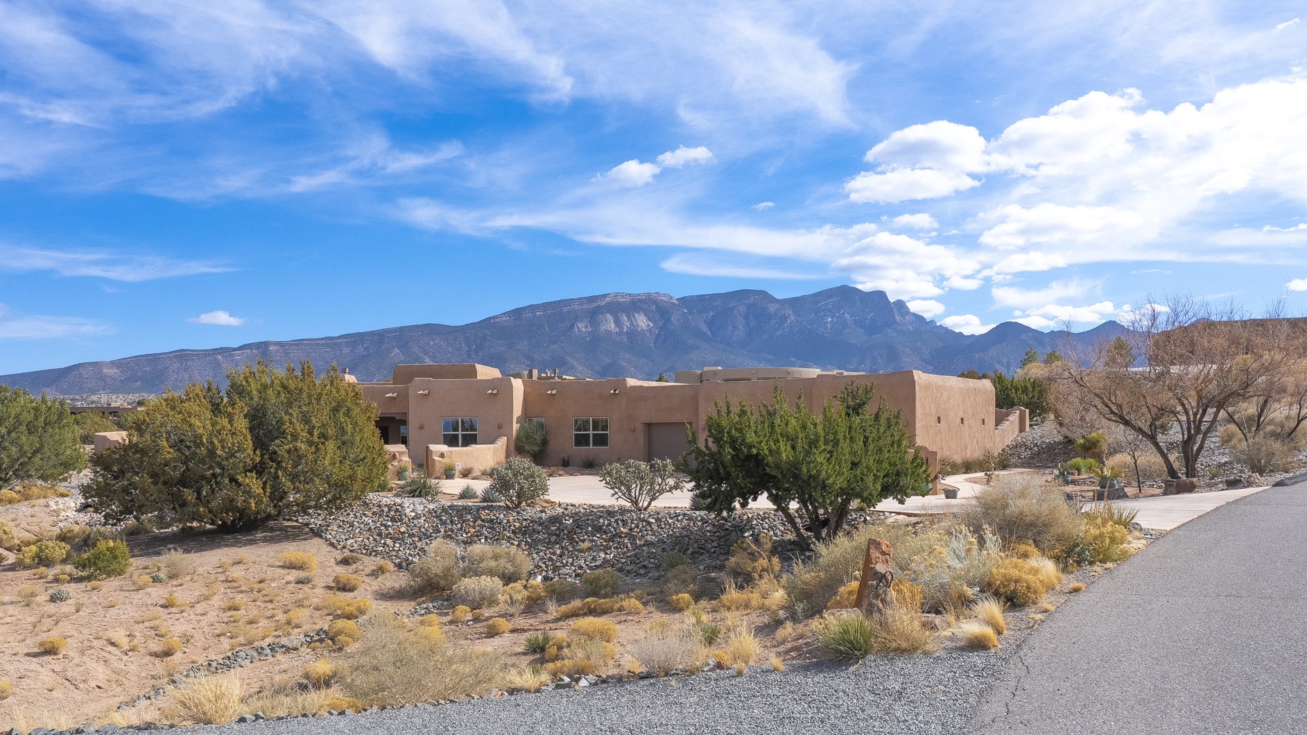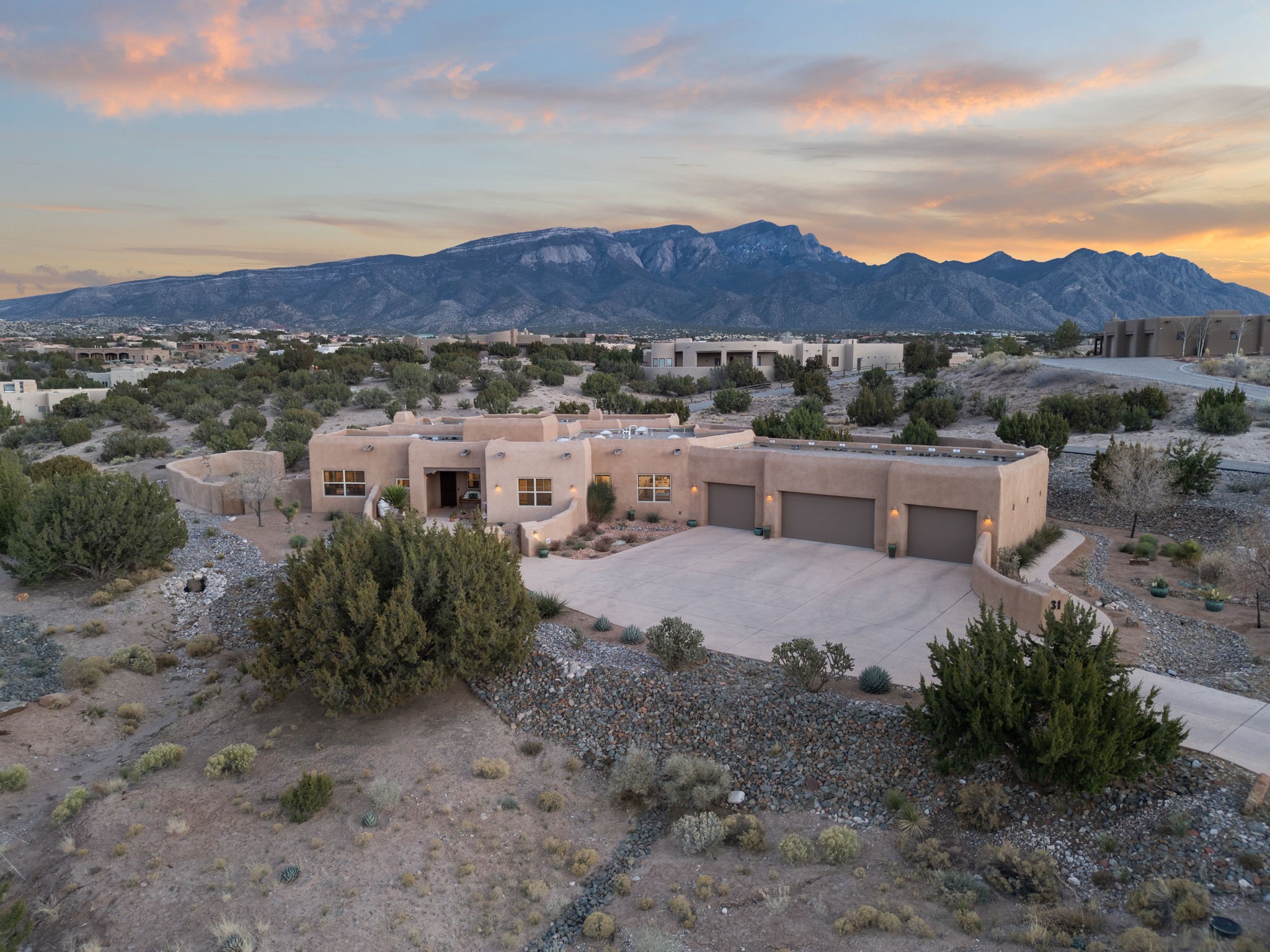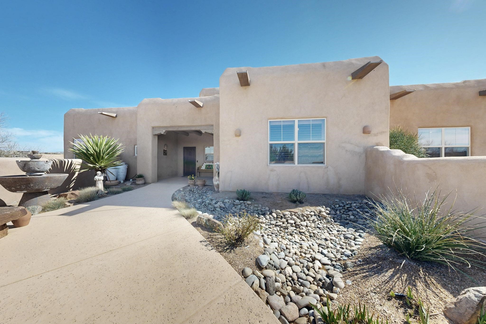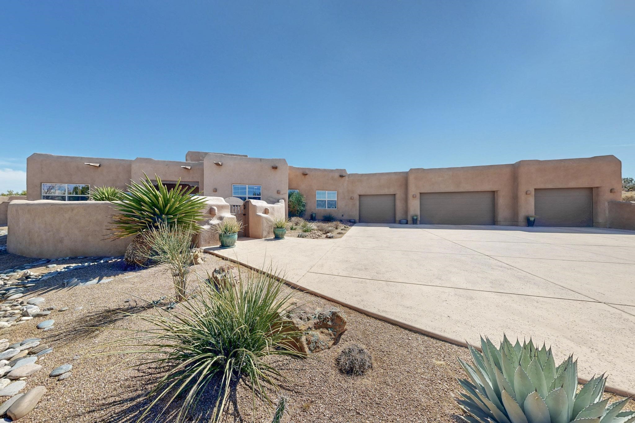 Discover this unique custom-built home in picturesque Placitas, offering stunning views of the Sandia Mountains from an elevated .95-acre cul-de-sac lot, just 1.4 miles from I-25. Enjoy the tranquility of this serene retreat without sacrificing convenience. This traditional New Mexico-style single-level home spans 2,964 square feet, featuring natural stone tiled floors, raised wood beamed and plank ceilings, and a blend of Southwest charm and contemporary elegance. The main living area includes natural gas fireplaces, while the chef's kitchen boasts granite counters, custom cabinetry, and premium appliances. A versatile 17 x 22 flex room offers space for various activities. Retreat to the primary suite with a spacious walk-in closet and spa-like bathroom boasting dual vanities and a fully tiled walk-in shower. Two additional bedrooms, a full bath, and a powder room provide comfort for family or guests. The oversized 1,351 square foot 4-car garage features a porcelain tile floor, mini-split heating and cooling, and ample storage--ideal for car enthusiasts or hobbyists. Outside, the fully landscaped lot features an extensive irrigation system, a charming front courtyard with a fountain, and a southeast-facing backyard with walkways and an outdoor kitchen complete with a premium grill. Gather around the masonry fireplace to enjoy beautiful sunsets and starry nights. This exceptional property combines premium features with thoughtful details that must be seen to be appreciated. Don't miss the chance to make this extraordinary home your own in Placitas!