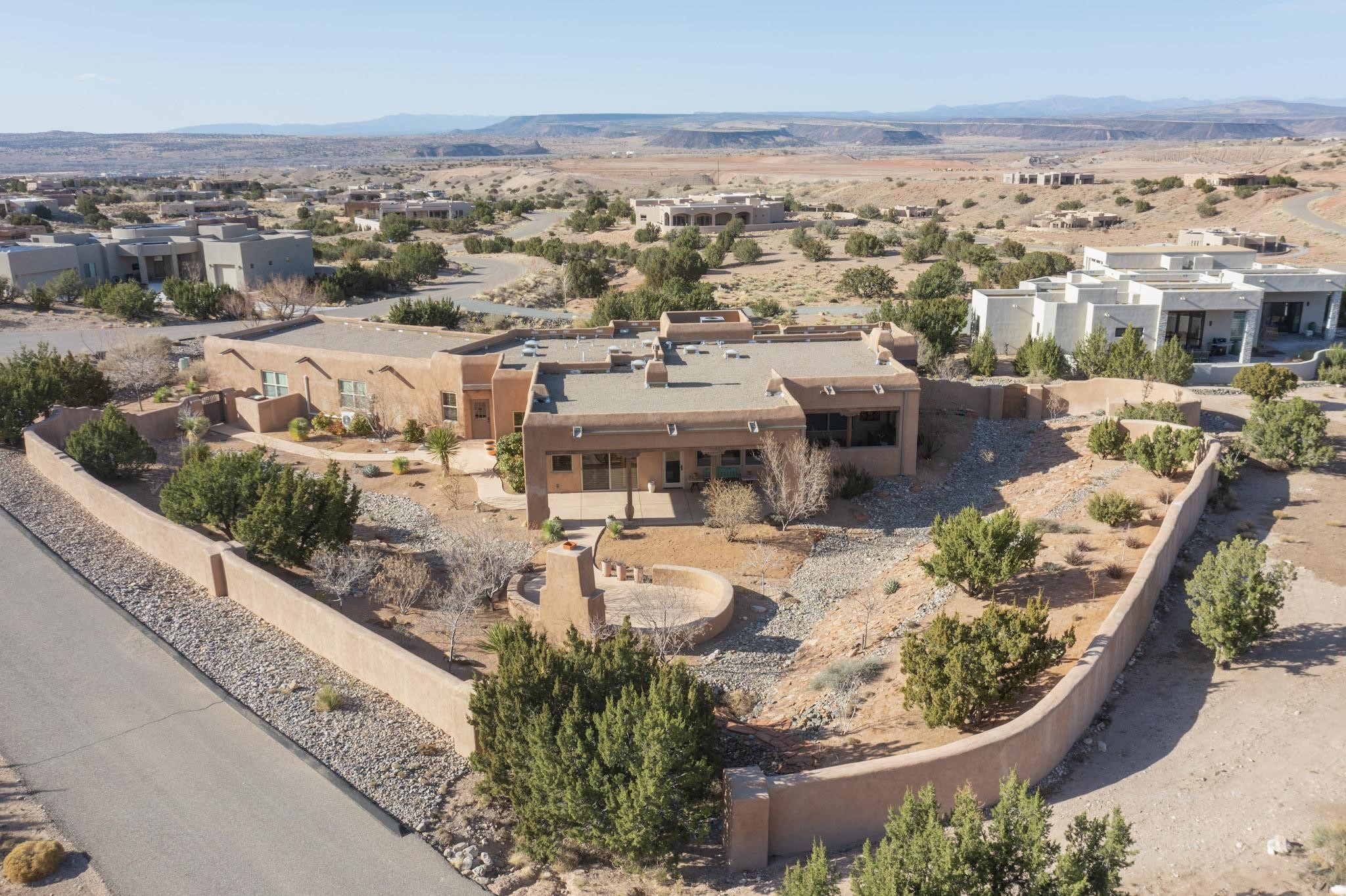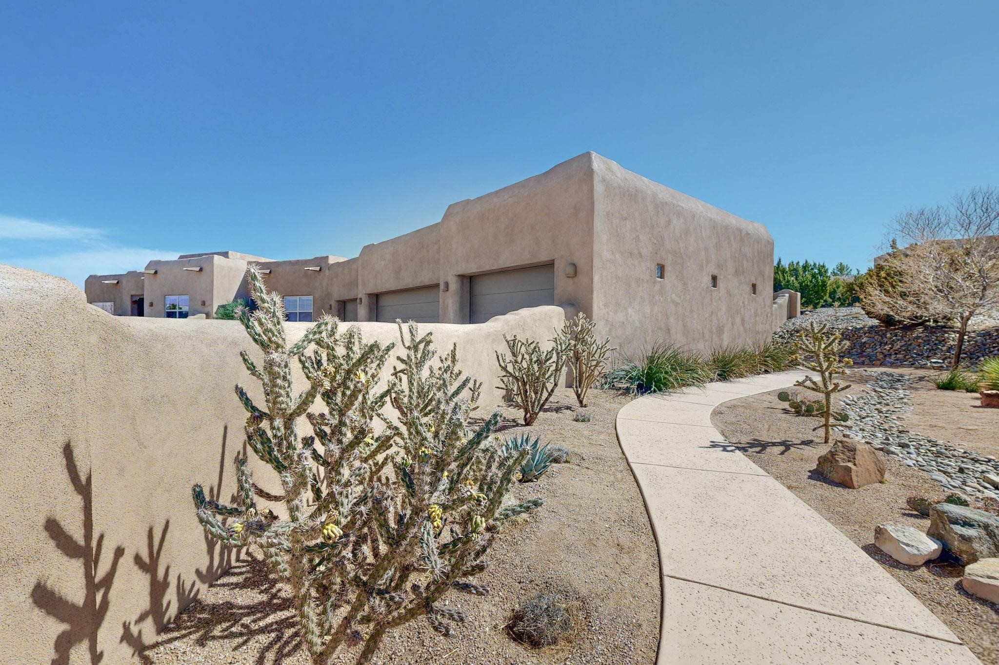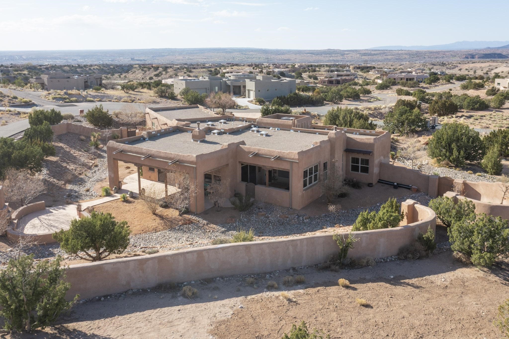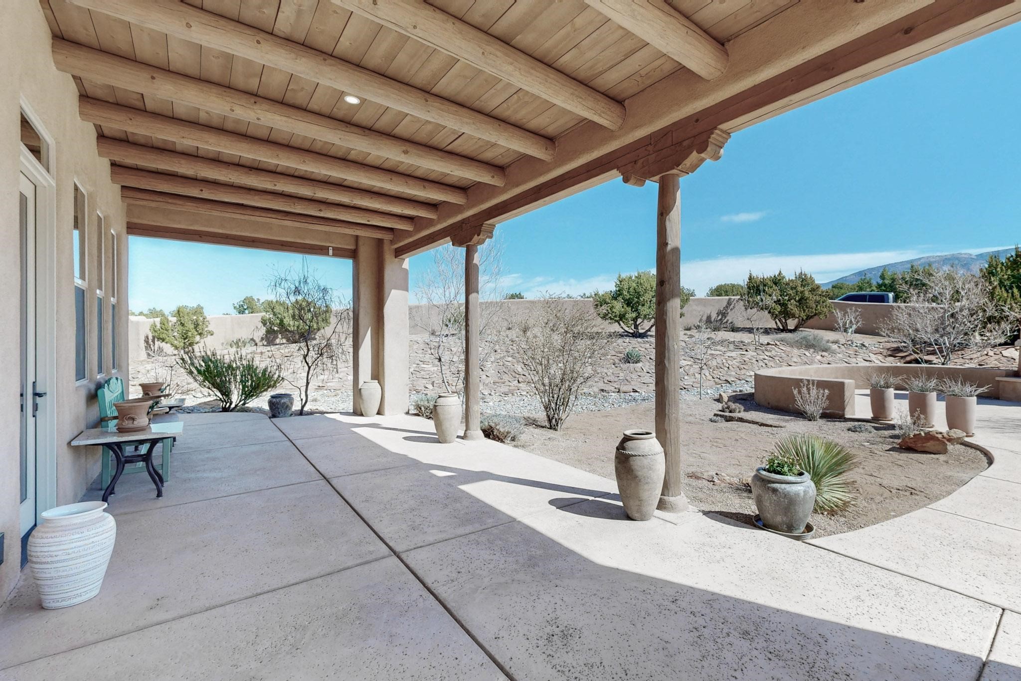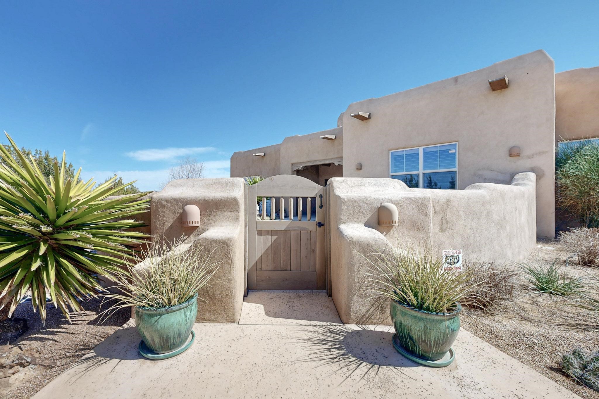 Discover this unique custom-built home in picturesque Placitas, offering stunning views of the Sandia Mountains from an elevated .95-acre cul-de-sac lot, just 1.4 miles from I-25. Enjoy the tranquility of this serene retreat without sacrificing convenience. This traditional New Mexico-style single-level home spans 2,964 square feet, featuring natural stone tiled floors, raised wood beamed and plank ceilings, and a blend of Southwest charm and contemporary elegance. The main living area includes natural gas fireplaces, while the chef's kitchen boasts granite counters, custom cabinetry, and premium appliances. A versatile 17 x 22 flex room offers space for various activities. Retreat to the primary suite with a spacious walk-in closet and spa-like bathroom boasting dual vanities and a fully tiled walk-in shower. Two additional bedrooms, a full bath, and a powder room provide comfort for family or guests. The oversized 1,351 square foot 4-car garage features a porcelain tile floor, mini-split heating and cooling, and ample storage--ideal for car enthusiasts or hobbyists. Outside, the fully landscaped lot features an extensive irrigation system, a charming front courtyard with a fountain, and a southeast-facing backyard with walkways and an outdoor kitchen complete with a premium grill. Gather around the masonry fireplace to enjoy beautiful sunsets and starry nights. This exceptional property combines premium features with thoughtful details that must be seen to be appreciated. Don't miss the chance to make this extraordinary home your own in Placitas!