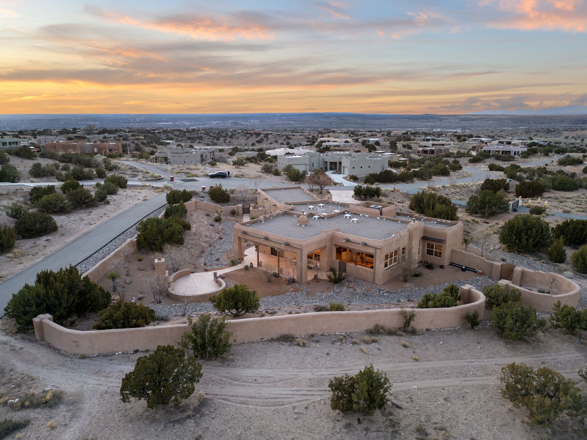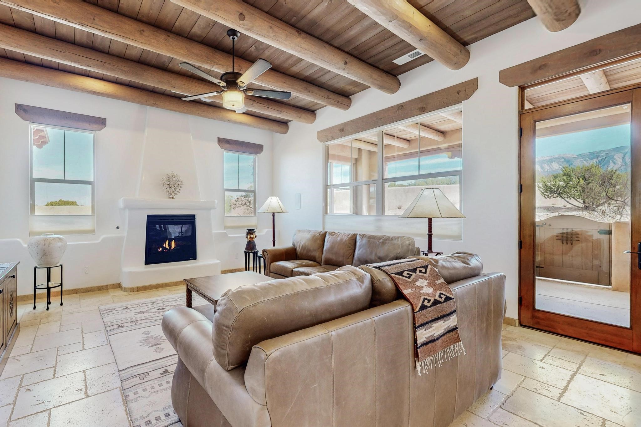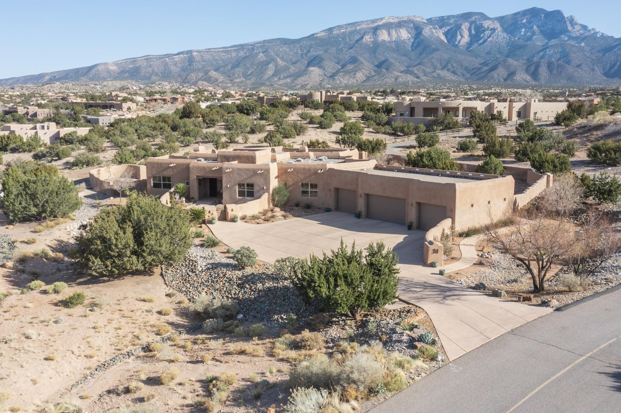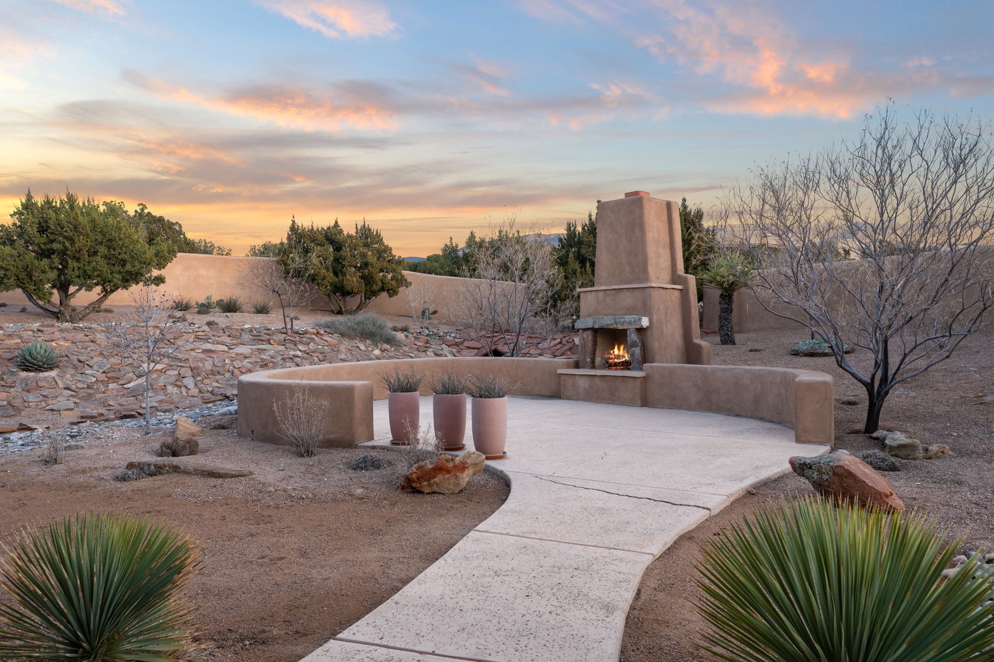 Discover this unique custom-built home in picturesque Placitas, offering stunning views of the Sandia Mountains from an elevated .95-acre cul-de-sac lot, just 1.4 miles from I-25. Enjoy the tranquility of this serene retreat without sacrificing convenience. This traditional New Mexico-style single-level home spans 2,964 square feet, featuring natural stone tiled floors, raised wood beamed and plank ceilings, and a blend of Southwest charm and contemporary elegance. The main living area includes natural gas fireplaces, while the chef's kitchen boasts granite counters, custom cabinetry, and premium appliances. A versatile 17 x 22 flex room offers space for various activities. Retreat to the primary suite with a spacious walk-in closet and spa-like bathroom boasting dual vanities and a fully tiled walk-in shower. Two additional bedrooms, a full bath, and a powder room provide comfort for family or guests. The oversized 1,351 square foot 4-car garage features a porcelain tile floor, mini-split heating and cooling, and ample storage--ideal for car enthusiasts or hobbyists. Outside, the fully landscaped lot features an extensive irrigation system, a charming front courtyard with a fountain, and a southeast-facing backyard with walkways and an outdoor kitchen complete with a premium grill. Gather around the masonry fireplace to enjoy beautiful sunsets and starry nights. This exceptional property combines premium features with thoughtful details that must be seen to be appreciated. Don't miss the chance to make this extraordinary home your own in Placitas!