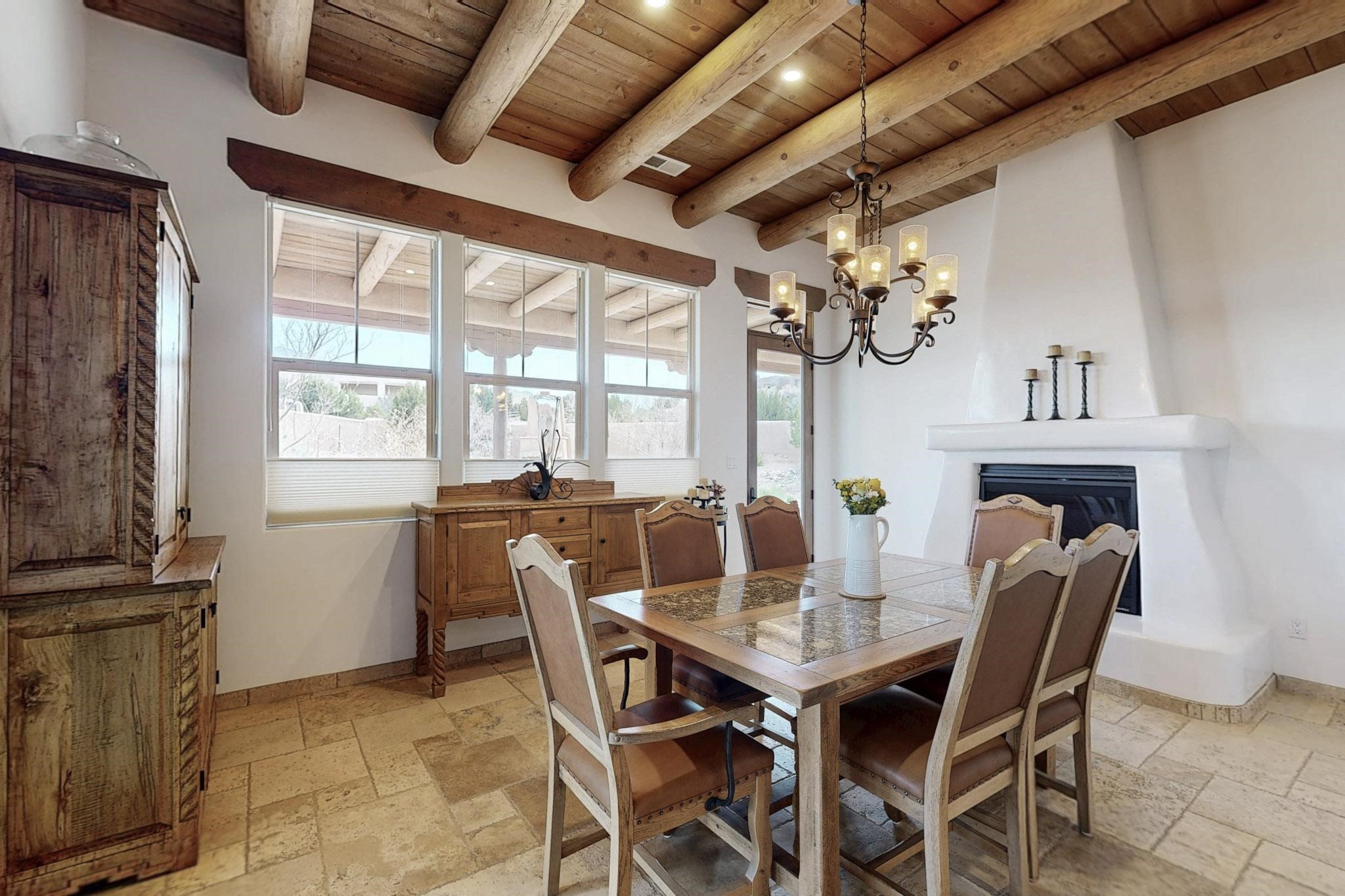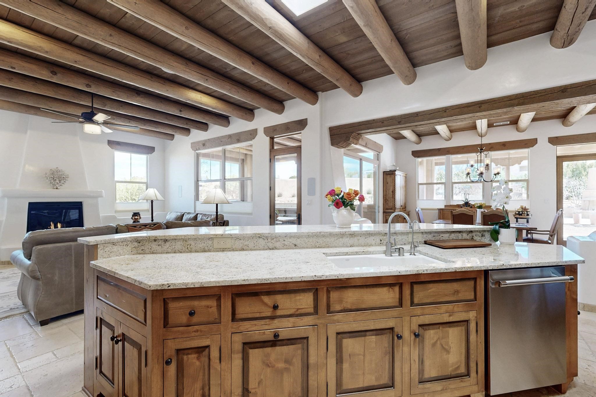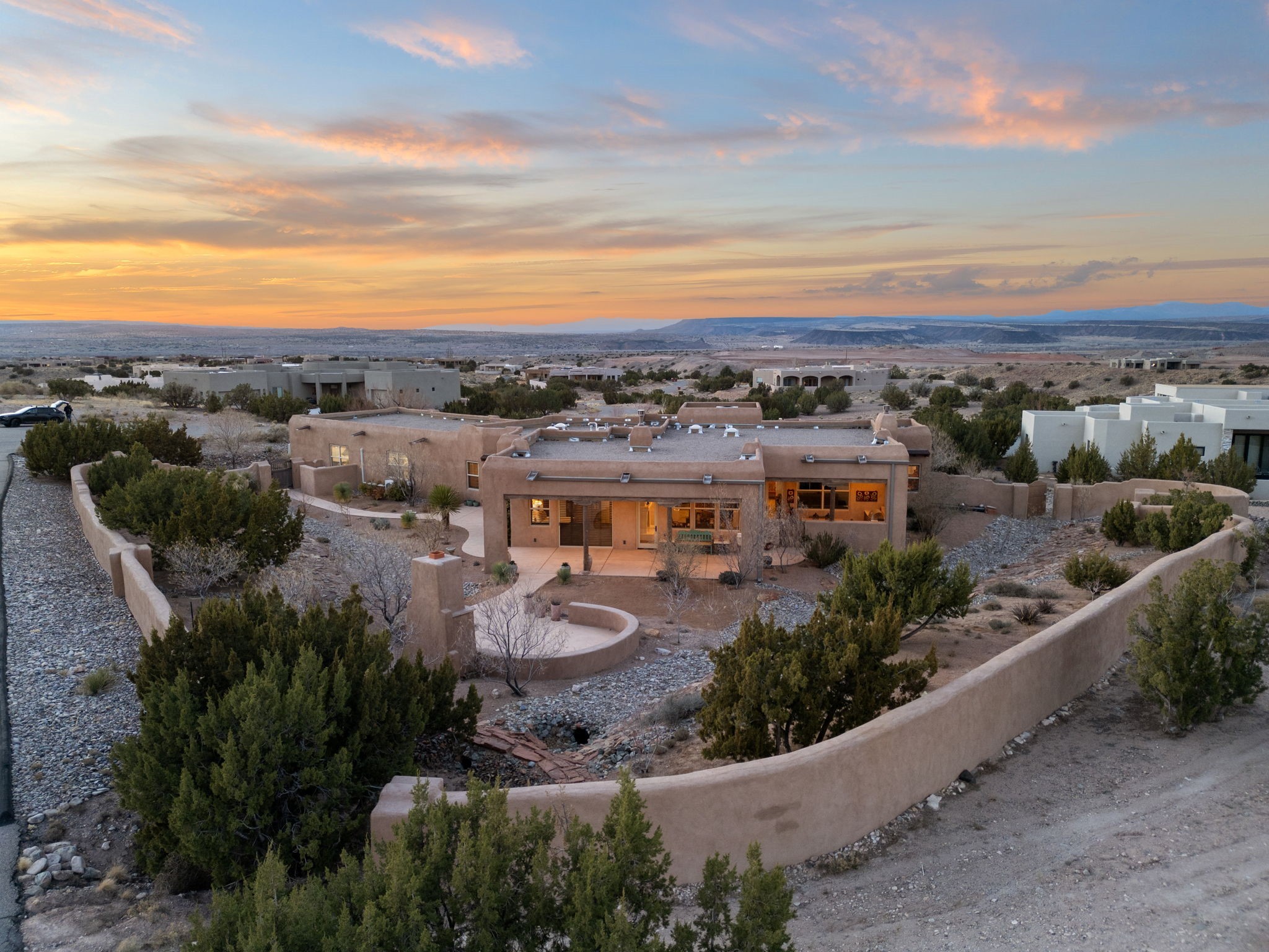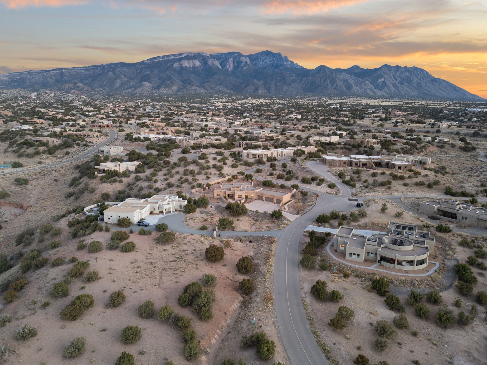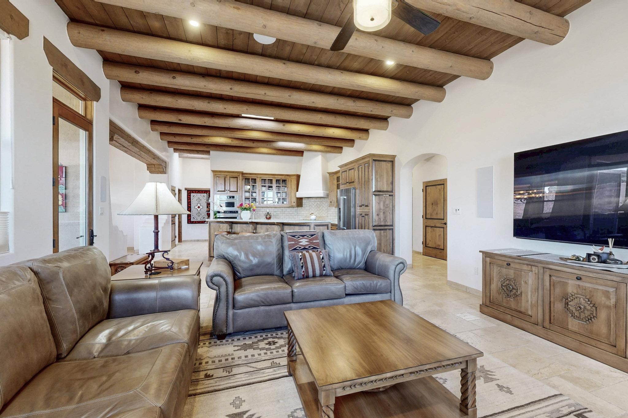 Discover this unique custom-built home in picturesque Placitas, offering stunning views of the Sandia Mountains from an elevated .95-acre cul-de-sac lot, just 1.4 miles from I-25. Enjoy the tranquility of this serene retreat without sacrificing convenience. This traditional New Mexico-style single-level home spans 2,964 square feet, featuring natural stone tiled floors, raised wood beamed and plank ceilings, and a blend of Southwest charm and contemporary elegance. The main living area includes natural gas fireplaces, while the chef's kitchen boasts granite counters, custom cabinetry, and premium appliances. A versatile 17 x 22 flex room offers space for various activities. Retreat to the primary suite with a spacious walk-in closet and spa-like bathroom boasting dual vanities and a fully tiled walk-in shower. Two additional bedrooms, a full bath, and a powder room provide comfort for family or guests. The oversized 1,351 square foot 4-car garage features a porcelain tile floor, mini-split heating and cooling, and ample storage--ideal for car enthusiasts or hobbyists. Outside, the fully landscaped lot features an extensive irrigation system, a charming front courtyard with a fountain, and a southeast-facing backyard with walkways and an outdoor kitchen complete with a premium grill. Gather around the masonry fireplace to enjoy beautiful sunsets and starry nights. This exceptional property combines premium features with thoughtful details that must be seen to be appreciated. Don't miss the chance to make this extraordinary home your own in Placitas!
