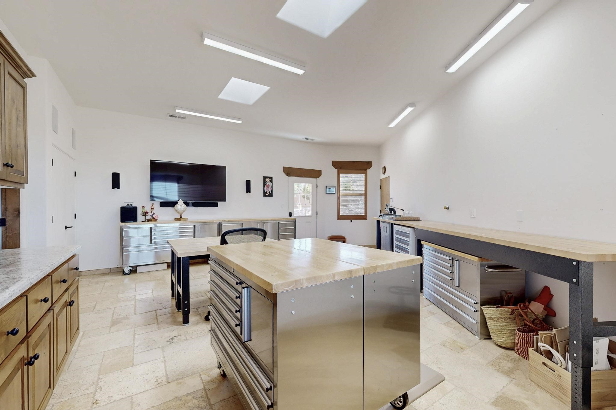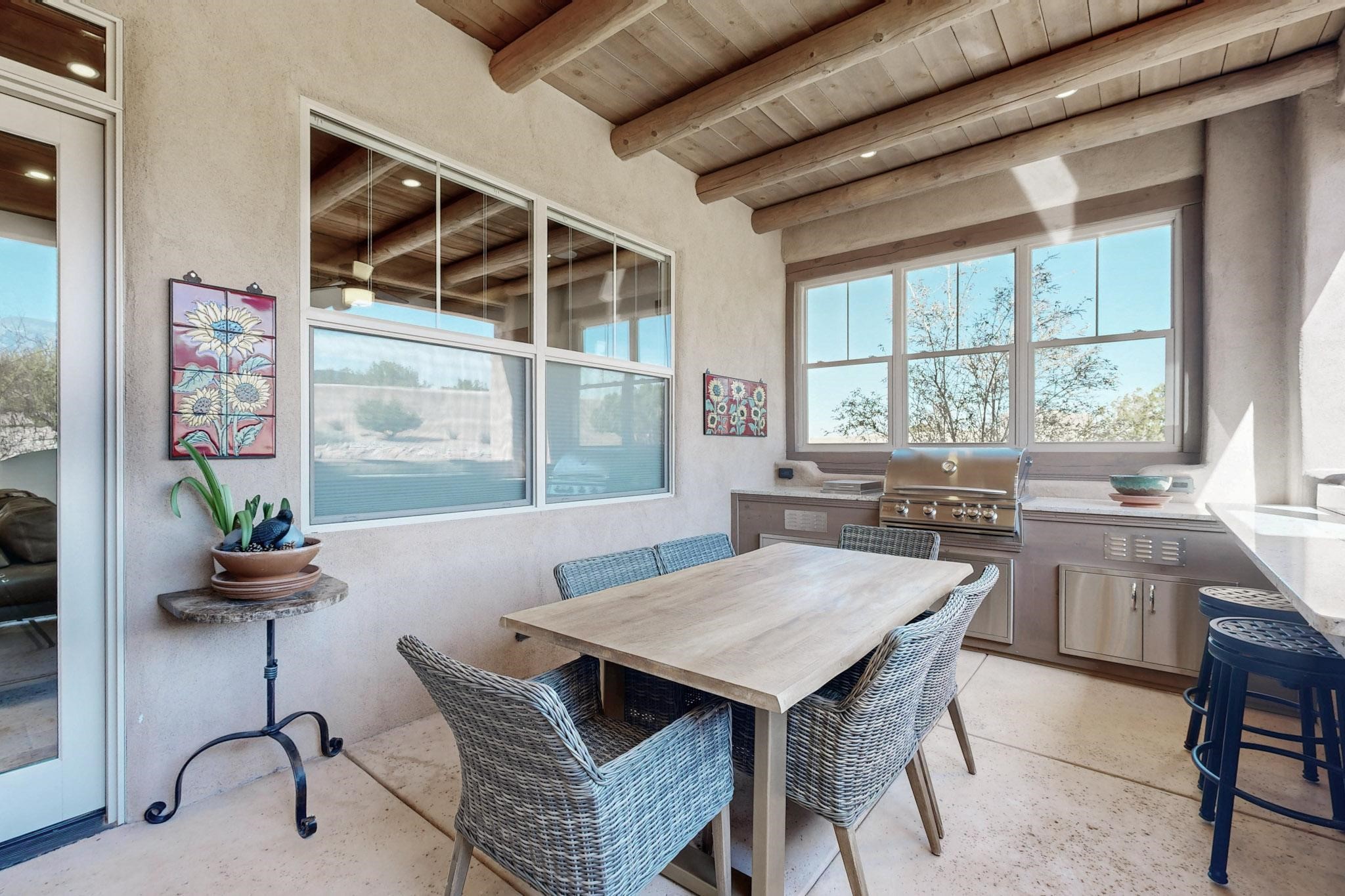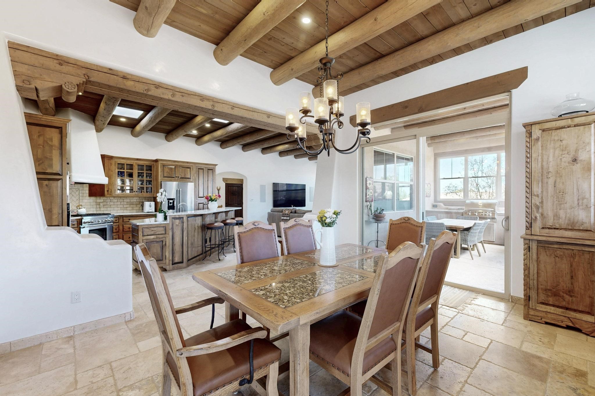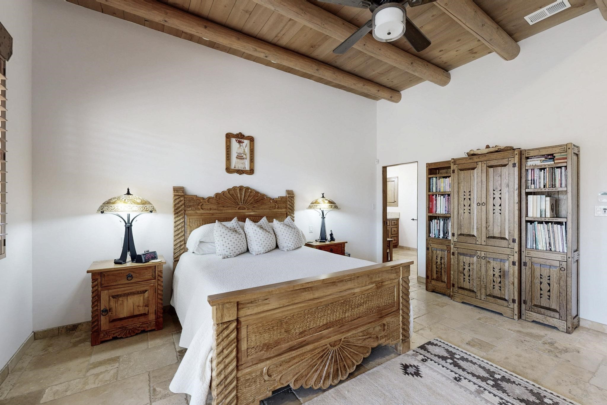 Discover this unique custom-built home in picturesque Placitas, offering stunning views of the Sandia Mountains from an elevated .95-acre cul-de-sac lot, just 1.4 miles from I-25. Enjoy the tranquility of this serene retreat without sacrificing convenience. This traditional New Mexico-style single-level home spans 2,964 square feet, featuring natural stone tiled floors, raised wood beamed and plank ceilings, and a blend of Southwest charm and contemporary elegance. The main living area includes natural gas fireplaces, while the chef's kitchen boasts granite counters, custom cabinetry, and premium appliances. A versatile 17 x 22 flex room offers space for various activities. Retreat to the primary suite with a spacious walk-in closet and spa-like bathroom boasting dual vanities and a fully tiled walk-in shower. Two additional bedrooms, a full bath, and a powder room provide comfort for family or guests. The oversized 1,351 square foot 4-car garage features a porcelain tile floor, mini-split heating and cooling, and ample storage--ideal for car enthusiasts or hobbyists. Outside, the fully landscaped lot features an extensive irrigation system, a charming front courtyard with a fountain, and a southeast-facing backyard with walkways and an outdoor kitchen complete with a premium grill. Gather around the masonry fireplace to enjoy beautiful sunsets and starry nights. This exceptional property combines premium features with thoughtful details that must be seen to be appreciated. Don't miss the chance to make this extraordinary home your own in Placitas!