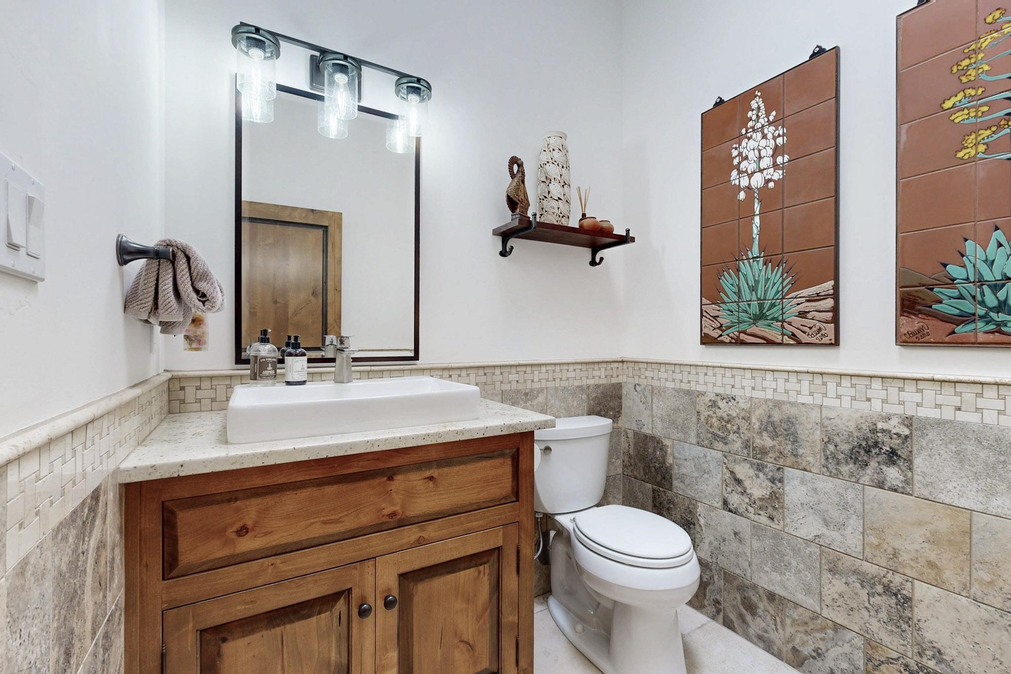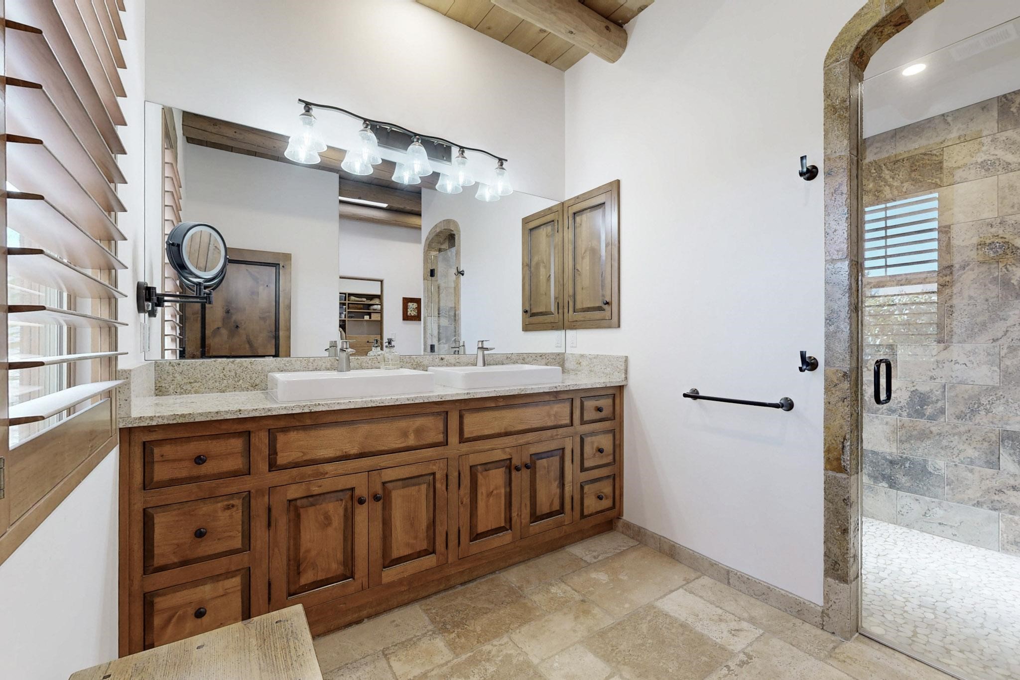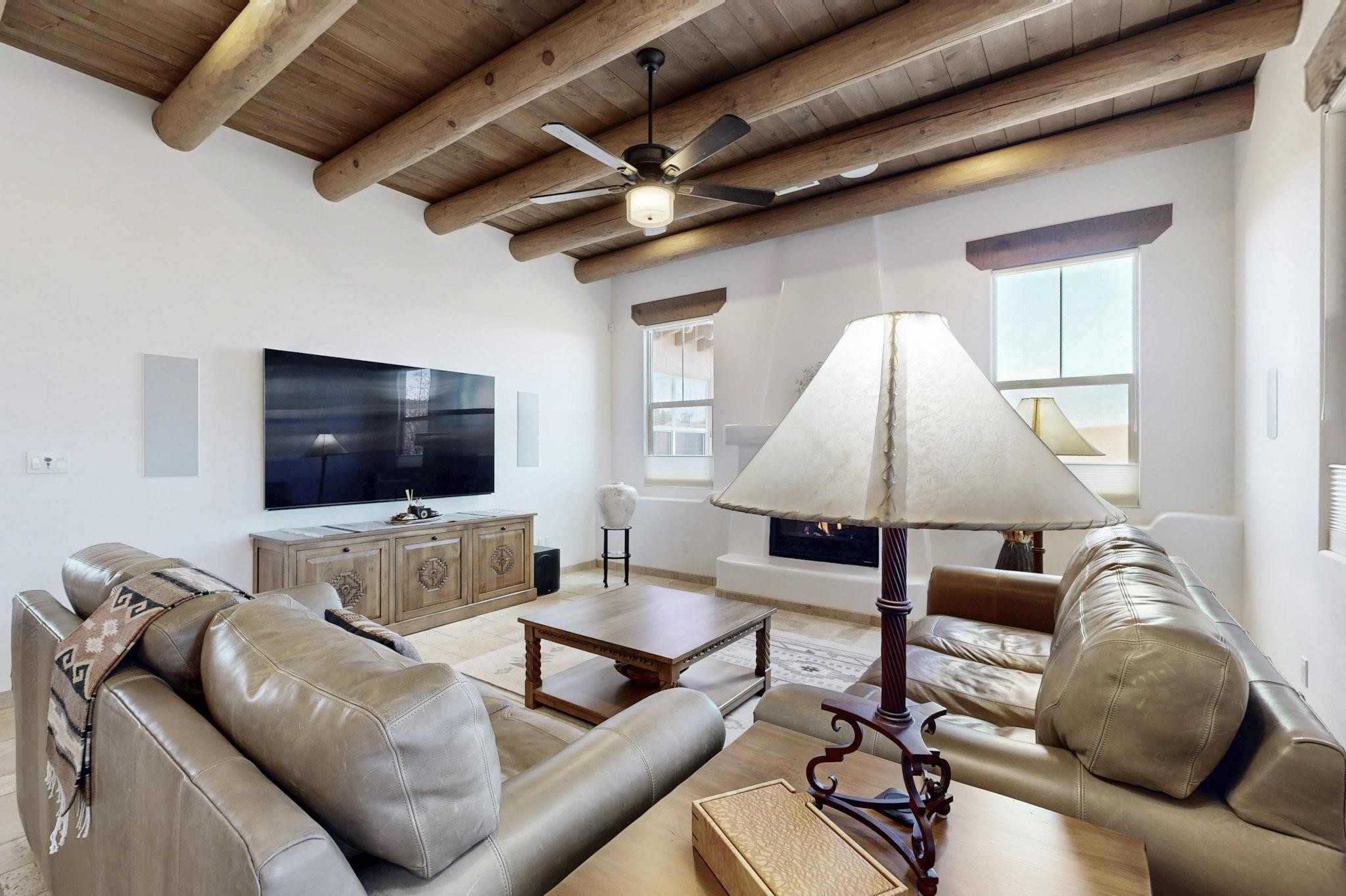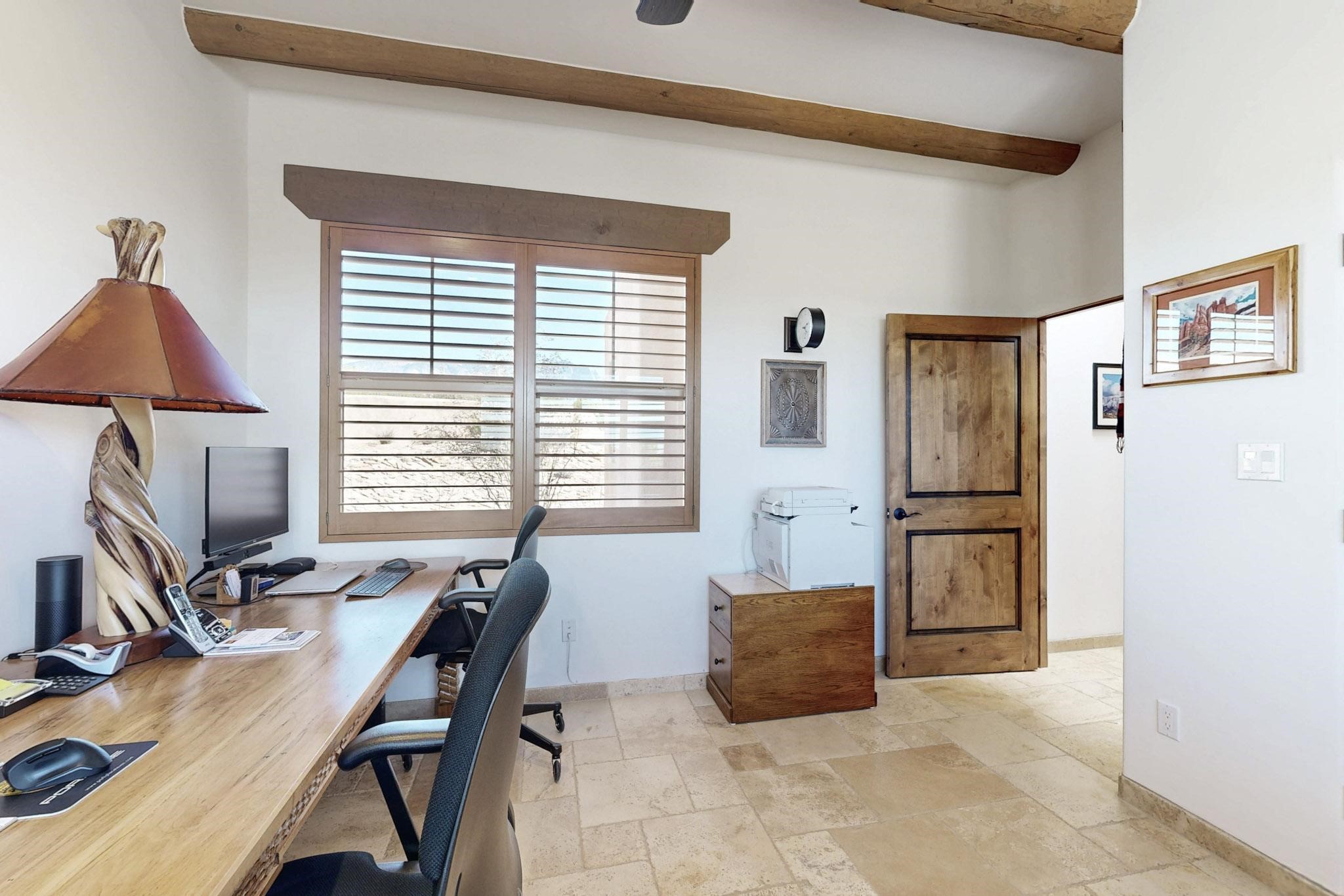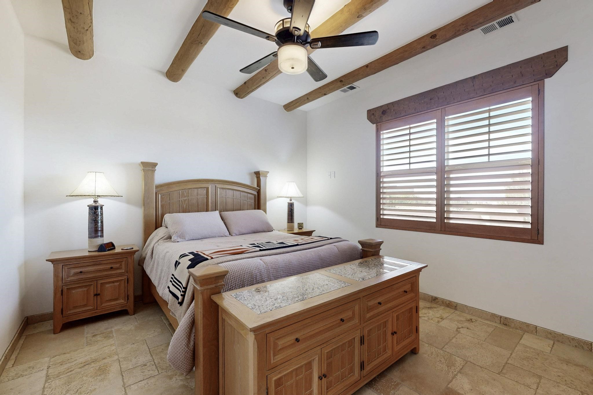 Discover this unique custom-built home in picturesque Placitas, offering stunning views of the Sandia Mountains from an elevated .95-acre cul-de-sac lot, just 1.4 miles from I-25. Enjoy the tranquility of this serene retreat without sacrificing convenience. This traditional New Mexico-style single-level home spans 2,964 square feet, featuring natural stone tiled floors, raised wood beamed and plank ceilings, and a blend of Southwest charm and contemporary elegance. The main living area includes natural gas fireplaces, while the chef's kitchen boasts granite counters, custom cabinetry, and premium appliances. A versatile 17 x 22 flex room offers space for various activities. Retreat to the primary suite with a spacious walk-in closet and spa-like bathroom boasting dual vanities and a fully tiled walk-in shower. Two additional bedrooms, a full bath, and a powder room provide comfort for family or guests. The oversized 1,351 square foot 4-car garage features a porcelain tile floor, mini-split heating and cooling, and ample storage--ideal for car enthusiasts or hobbyists. Outside, the fully landscaped lot features an extensive irrigation system, a charming front courtyard with a fountain, and a southeast-facing backyard with walkways and an outdoor kitchen complete with a premium grill. Gather around the masonry fireplace to enjoy beautiful sunsets and starry nights. This exceptional property combines premium features with thoughtful details that must be seen to be appreciated. Don't miss the chance to make this extraordinary home your own in Placitas!