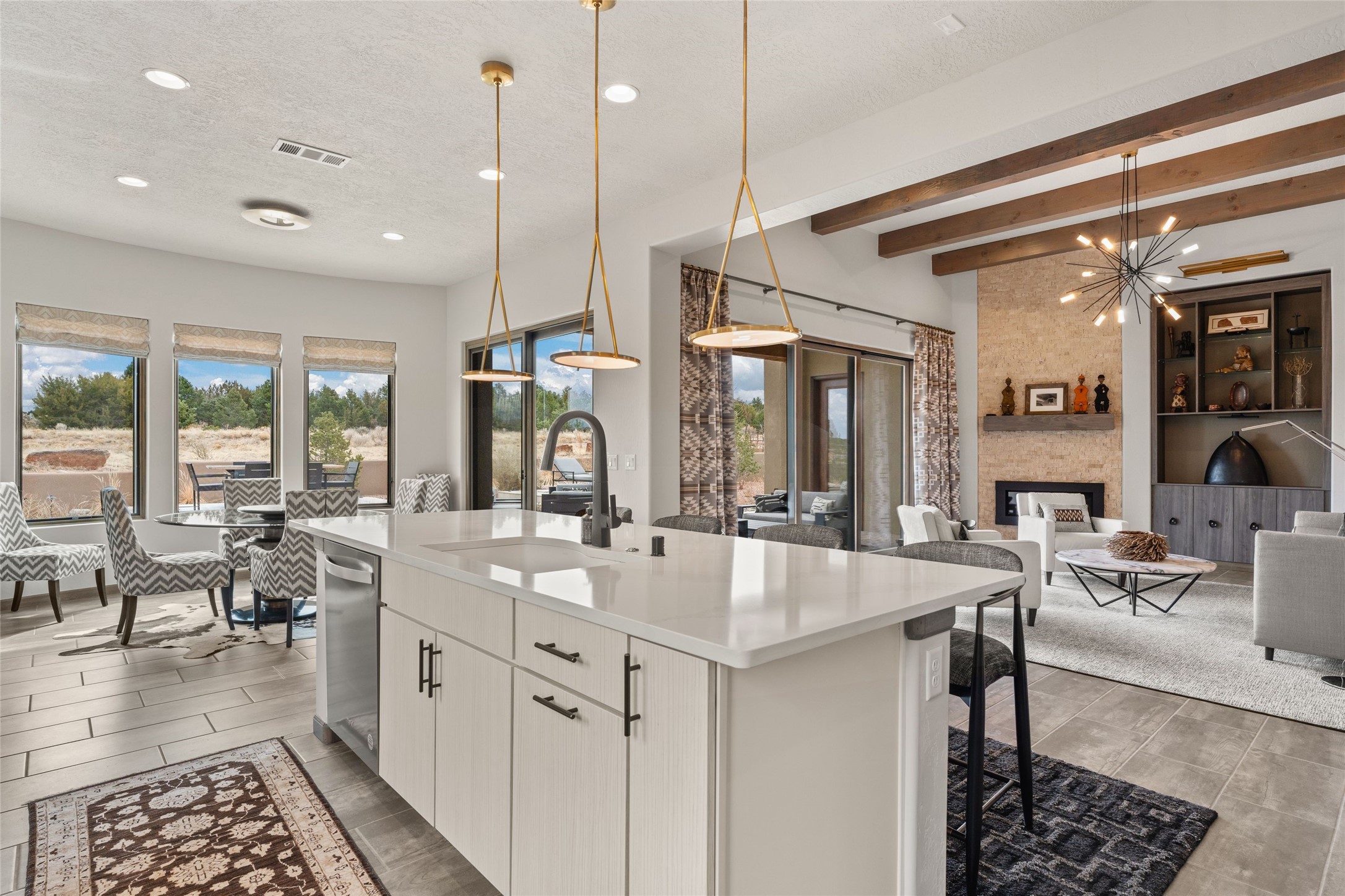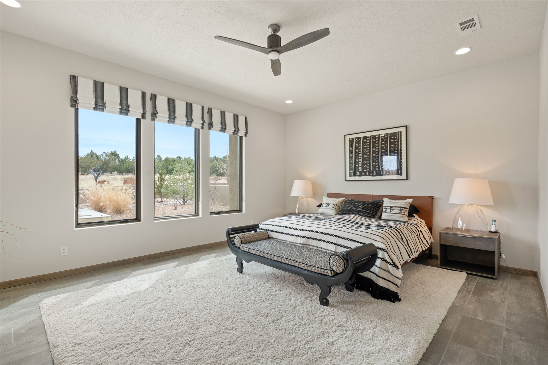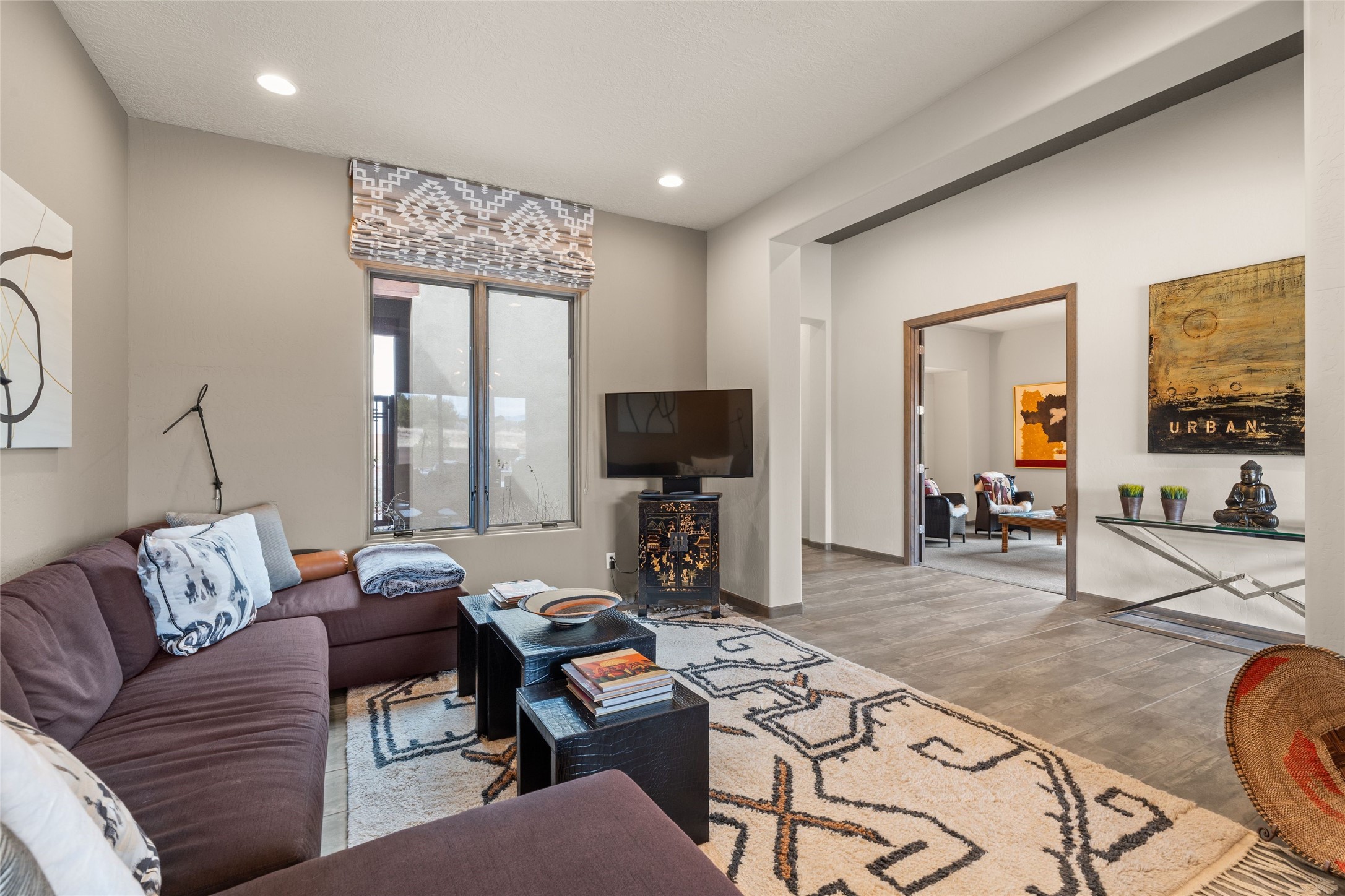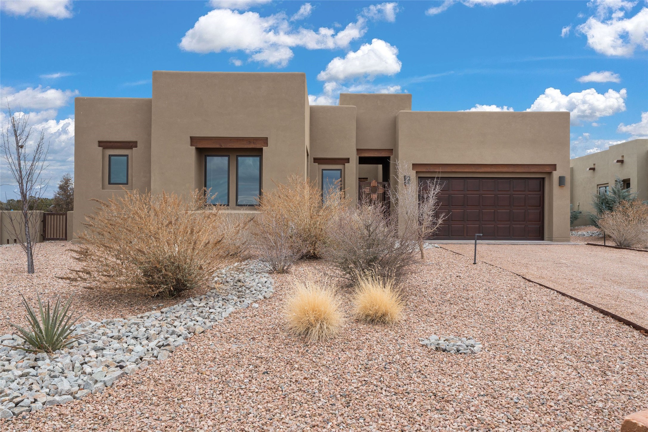 This immaculate home in Las Campanas offers a wonderful blend of privacy, space, and striking Sangre de Cristo Mountain views. Set on one of the most desirable lots in the neighborhood, the home's outdoor living spaces are a highlight. Thoughtfully designed, it balances traditional Santa Fe elements--vigas and beams--with a clean, contemporary finish. The open, light-filled interior features upgraded lighting, designer window treatments, and desirable finishes throughout. With three bedrooms and four bathrooms, including a guest suite with its own living area, the home offers both flexibility and function. A spacious additional room off the main living area provides options for a media room, library, office, or game room. The bright kitchen boasts white quartz countertops, light wood cabinetry, and a spacious pantry. The beautifully landscaped outdoor spaces with brick and stone lined dining and relaxation areas flow from the interior creating seamless indoor-outdoor living. Located just minutes from The Club at Las Campanas, the home offers convenient access to dining, golf, the Spa and Fitness Center, tennis, and pickleball, for the owner who chooses to join the Club. The current owner's Equity Golf membership is available for purchase by the new owner of the beautiful home.